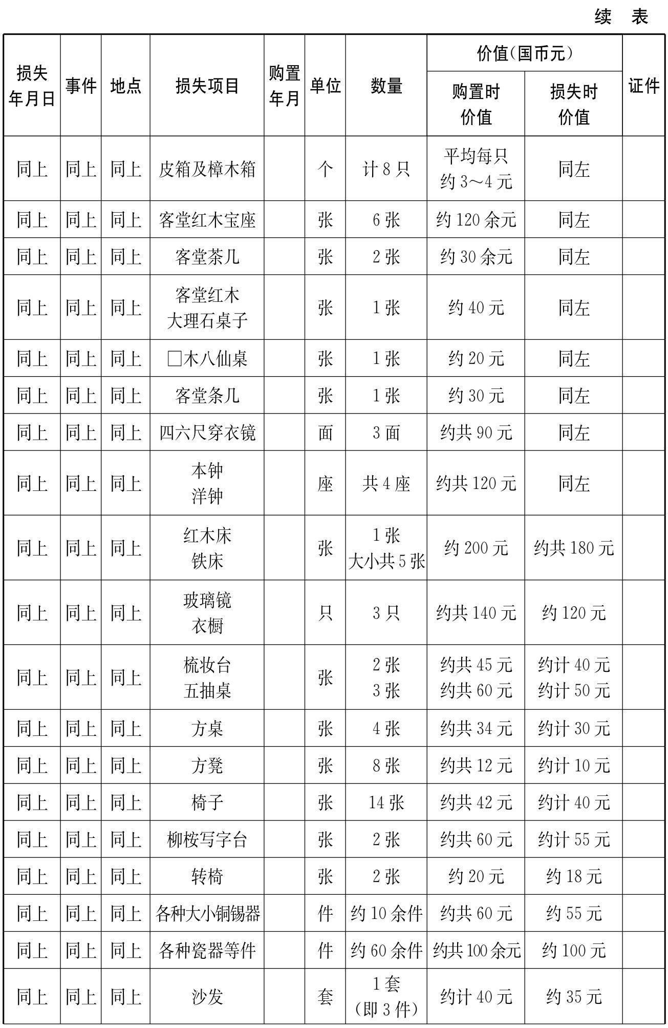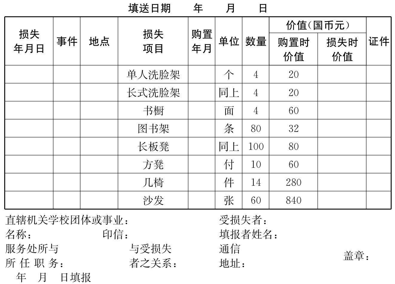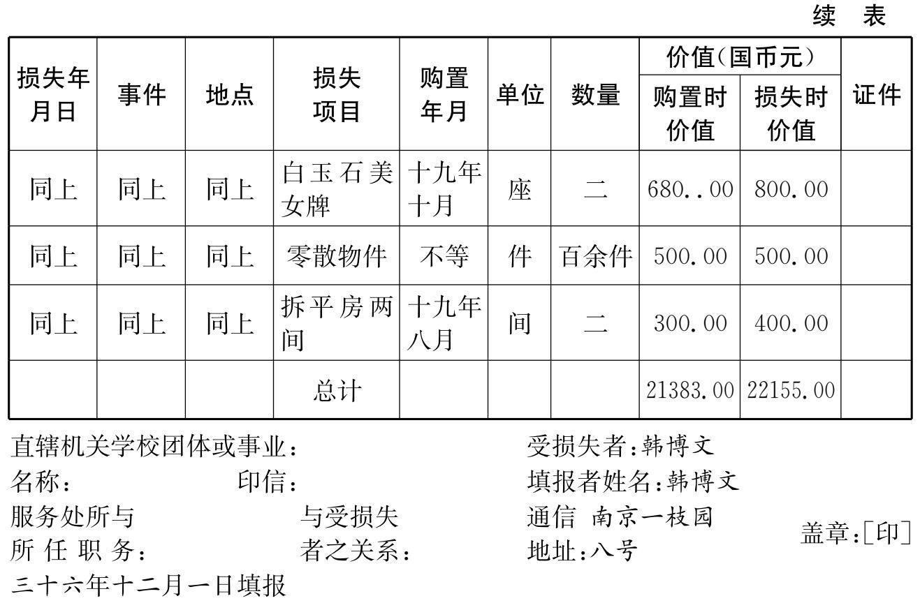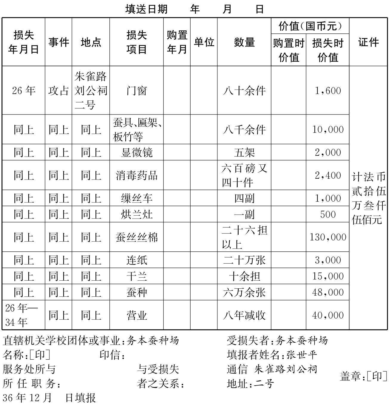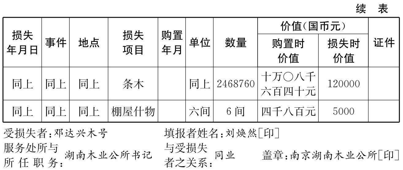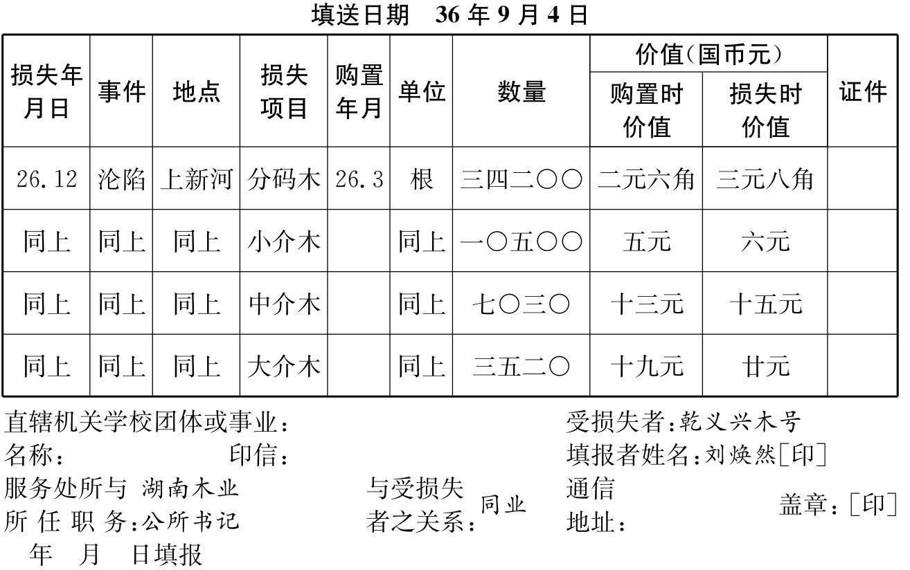 ② 本格及其上面几格填写位置可能有误,疑为“损失时价值”。原档如此。