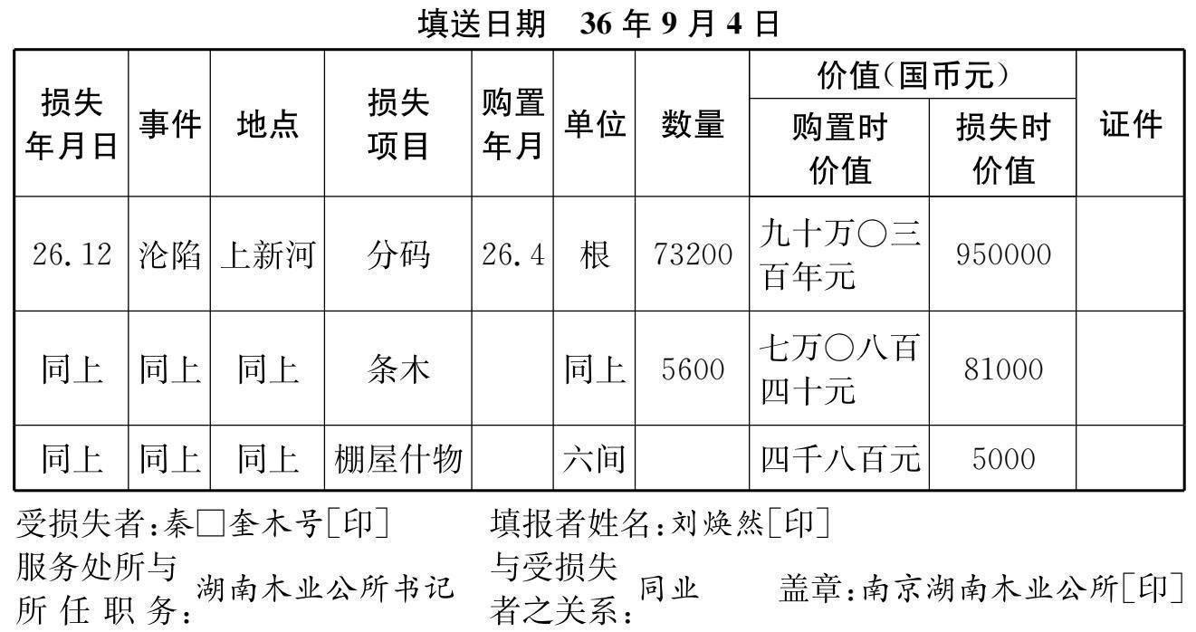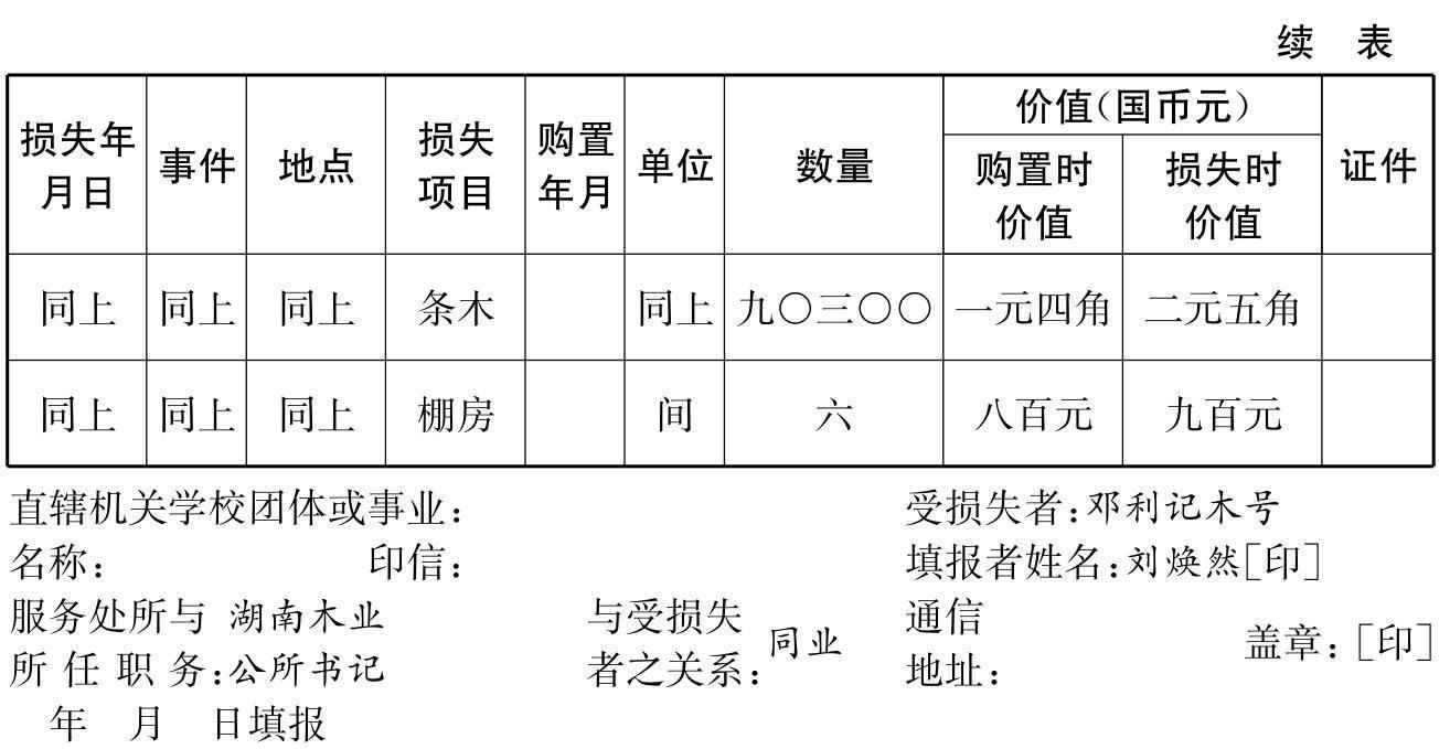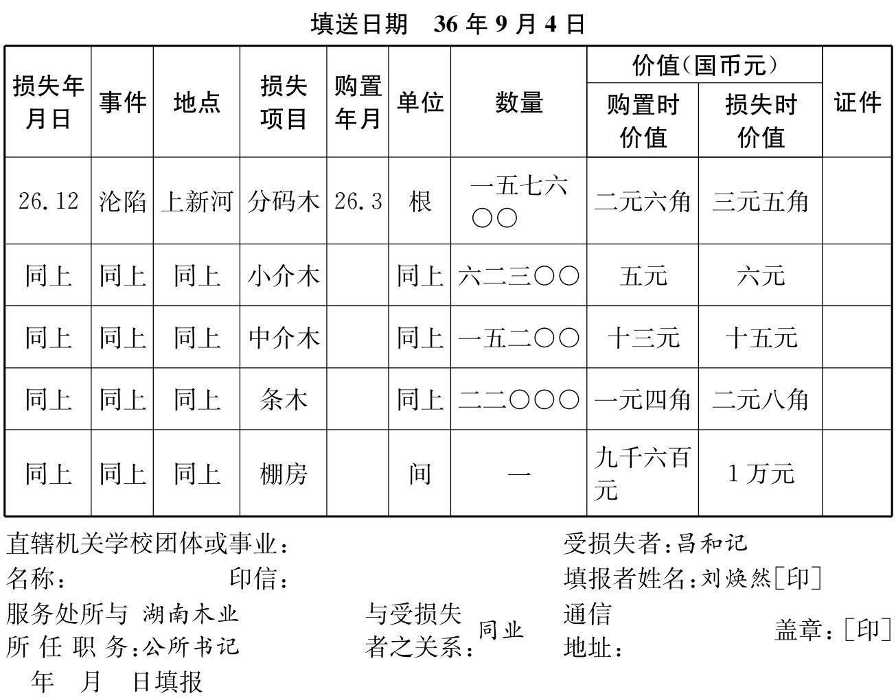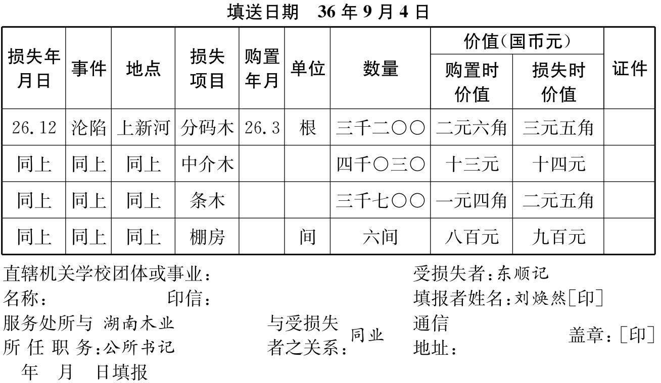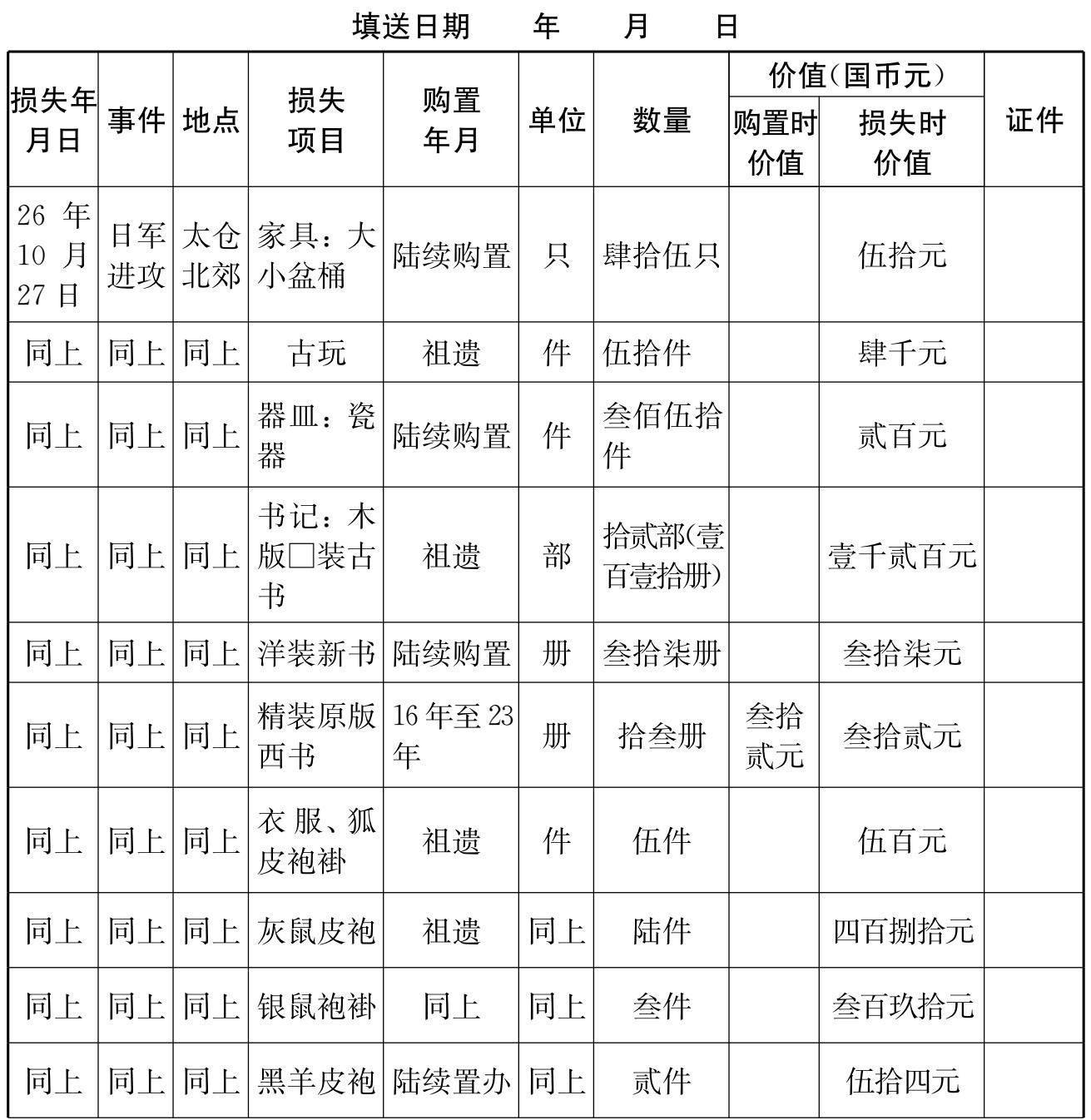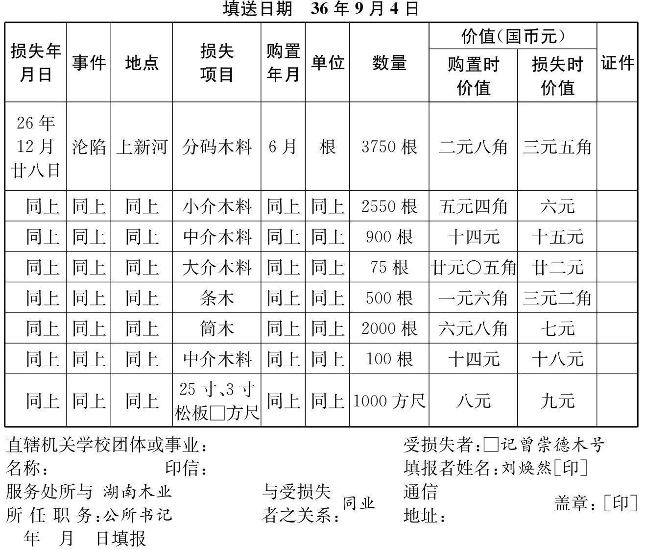 ② 本格及其上面几格填写位置可能有误,疑为“损失时价值”。原档如此。