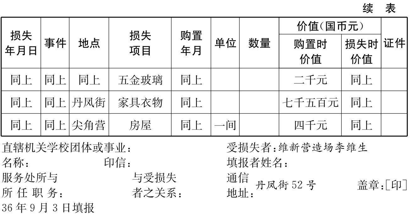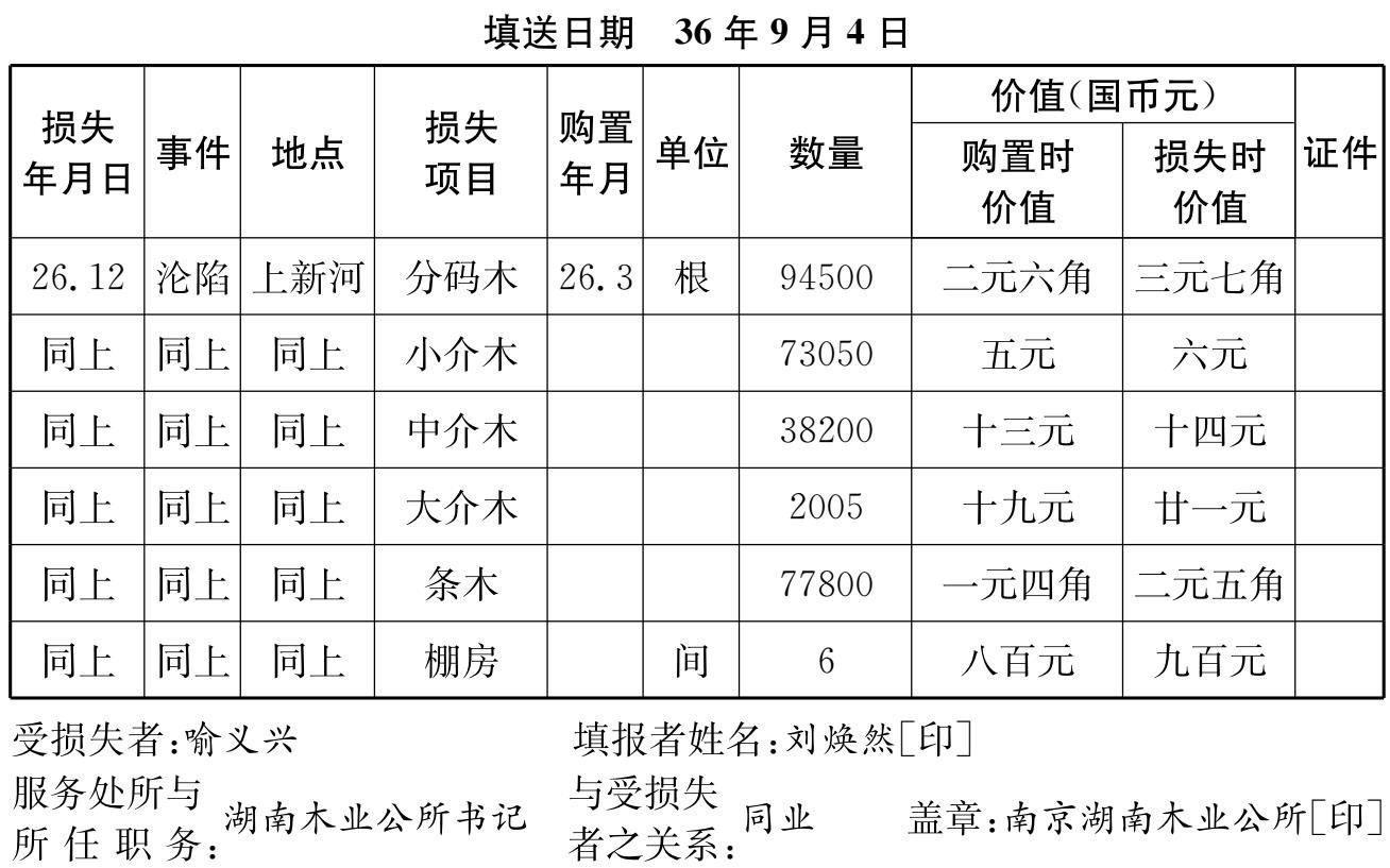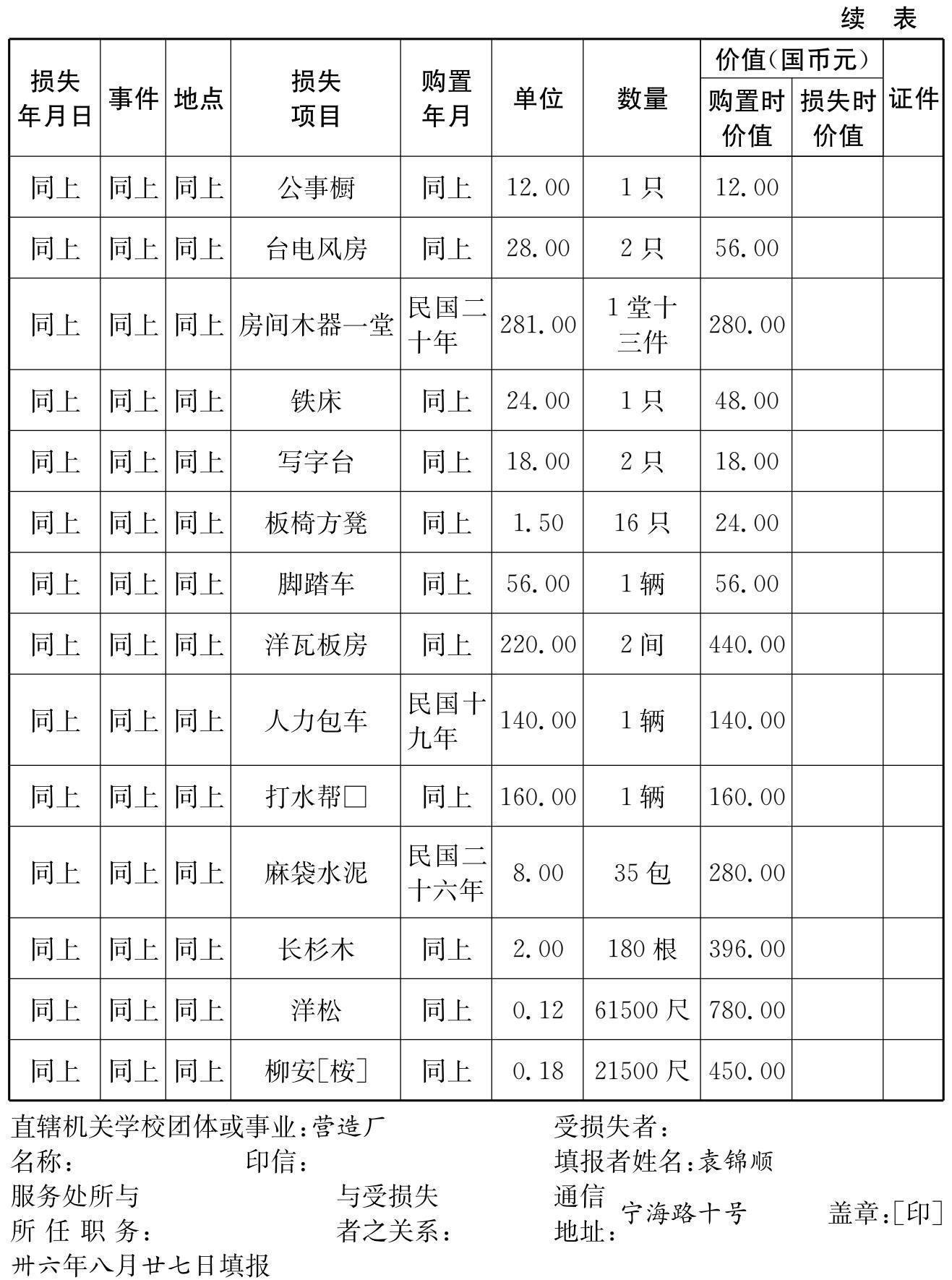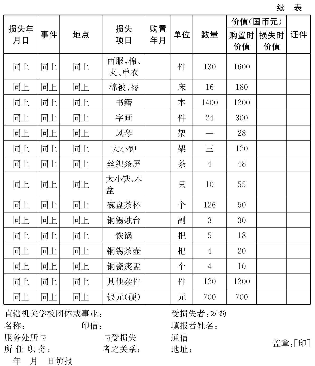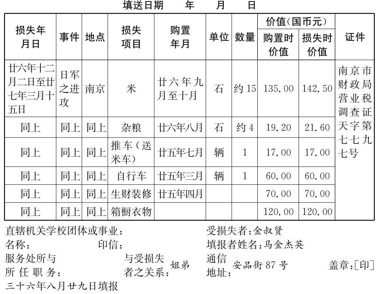 ② 本格及其上面几格填写位置可能有误,疑为“损失时价值”。原档如此。
