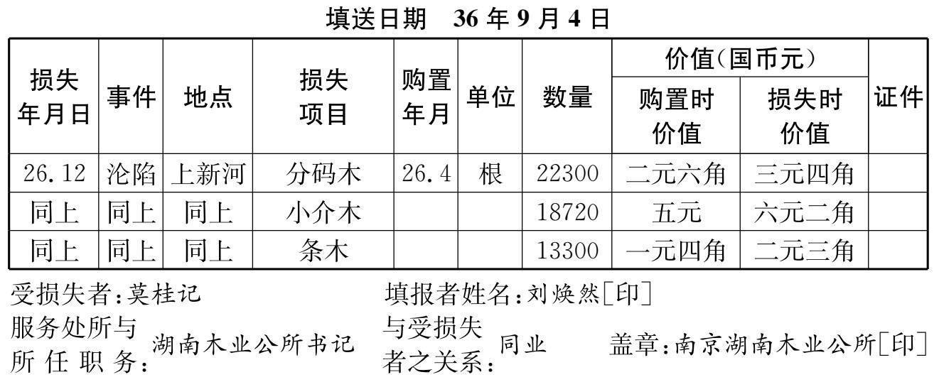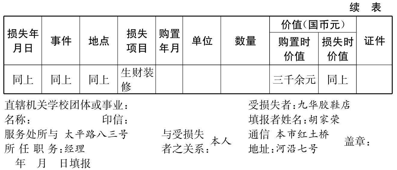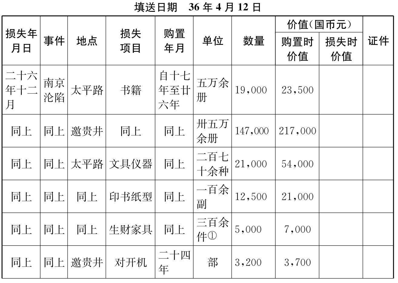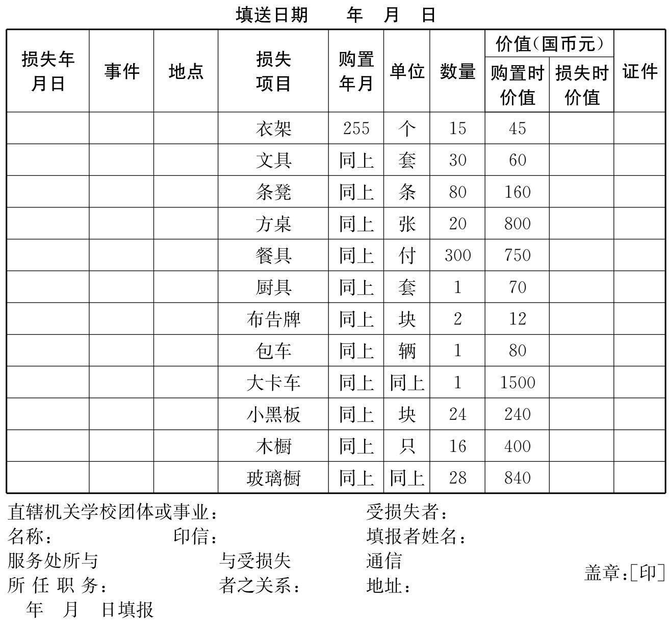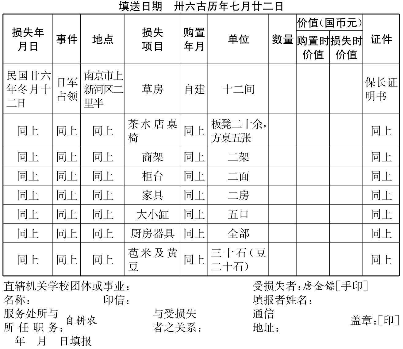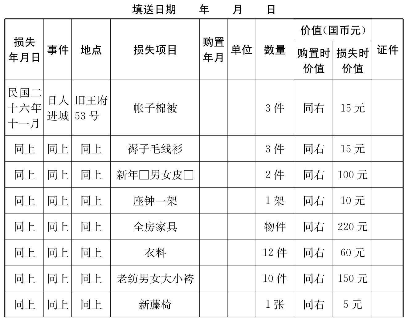 ② 本格及其上面几格填写位置可能有误,疑为“损失时价值”。原档如此。