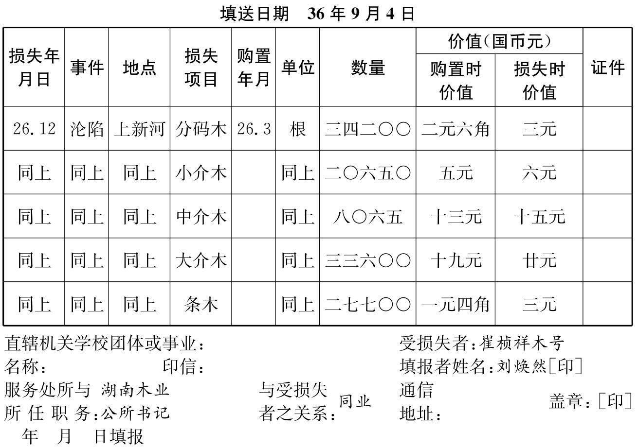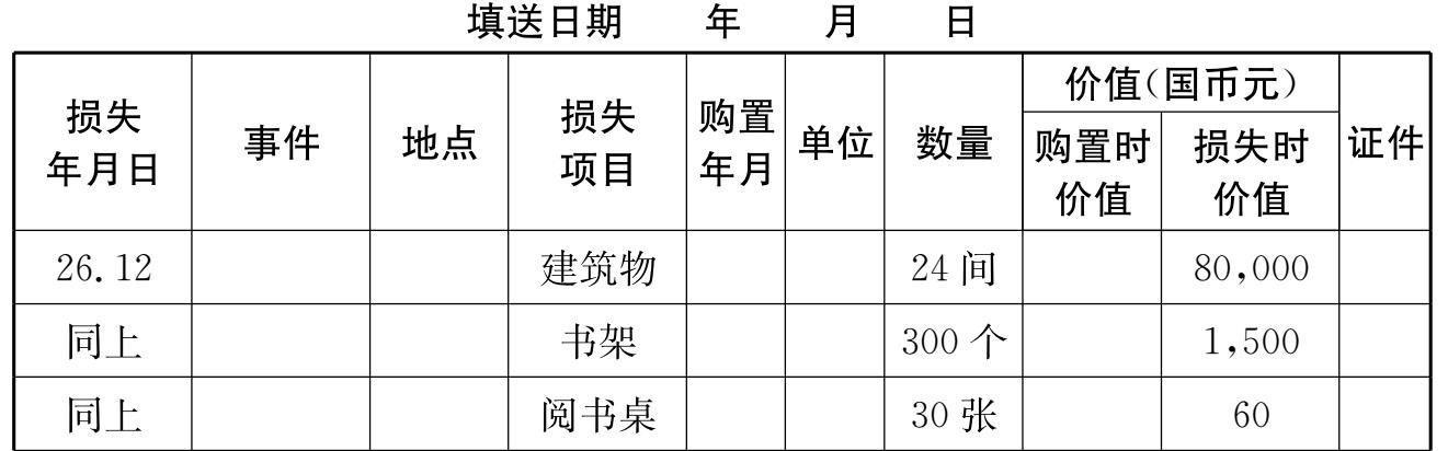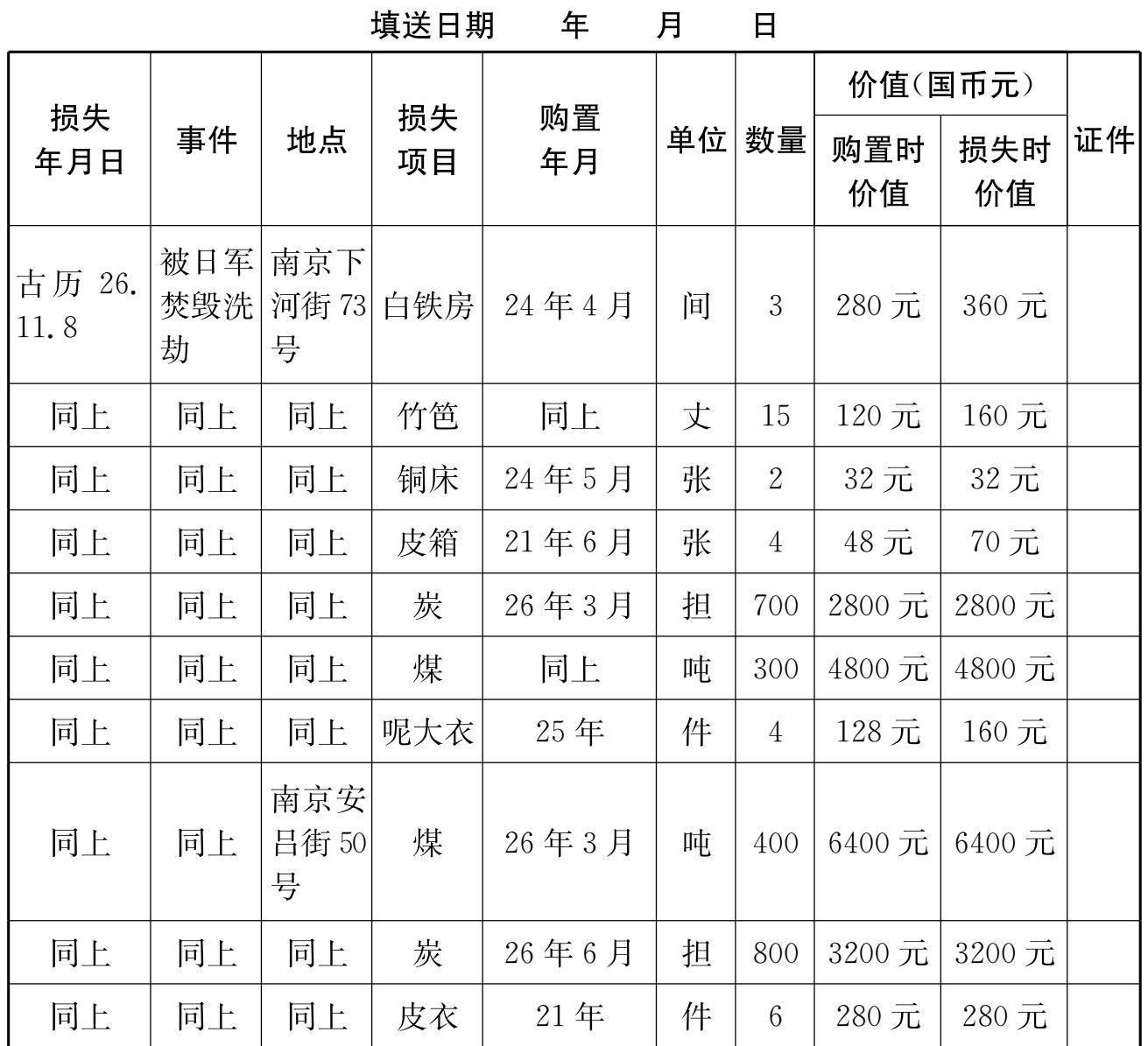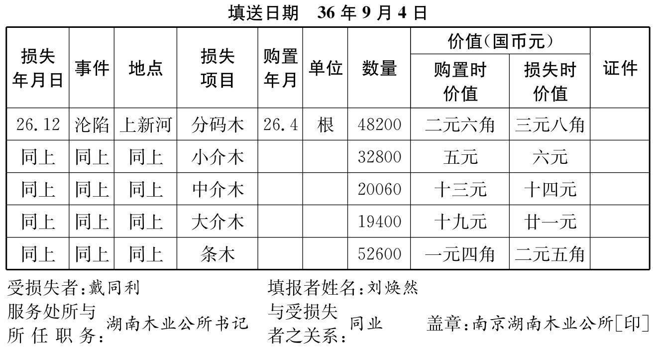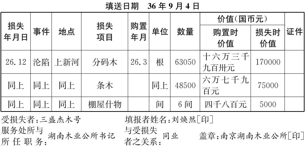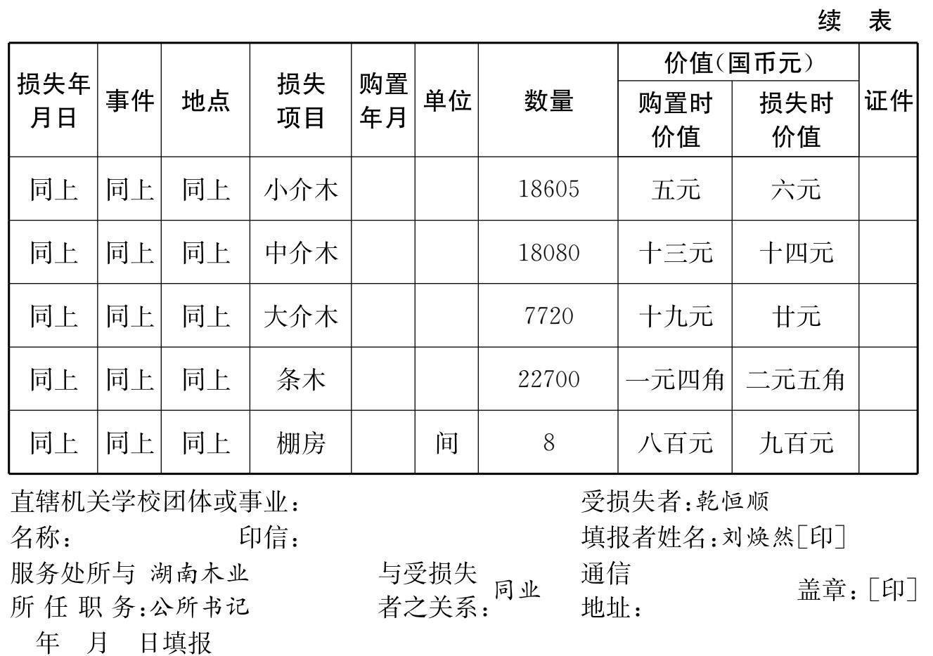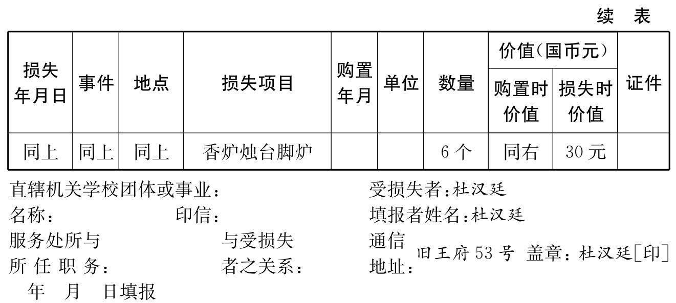 ② 本格及其上面几格填写位置可能有误,疑为“损失时价值”。原档如此。