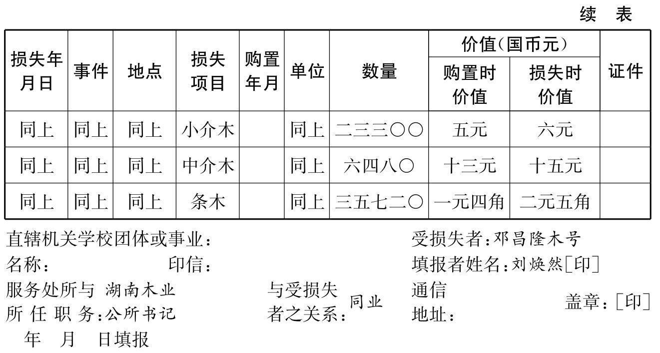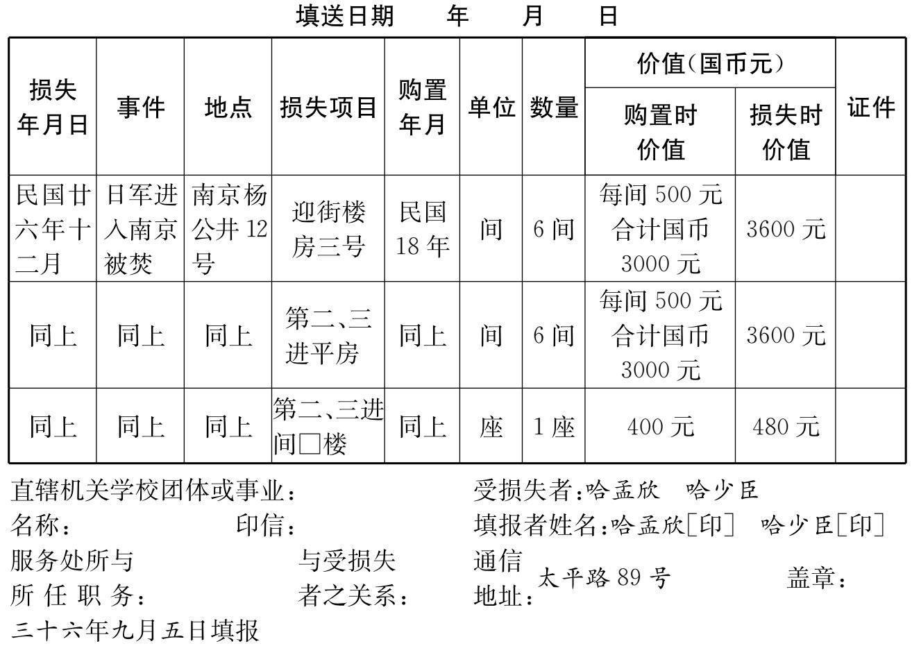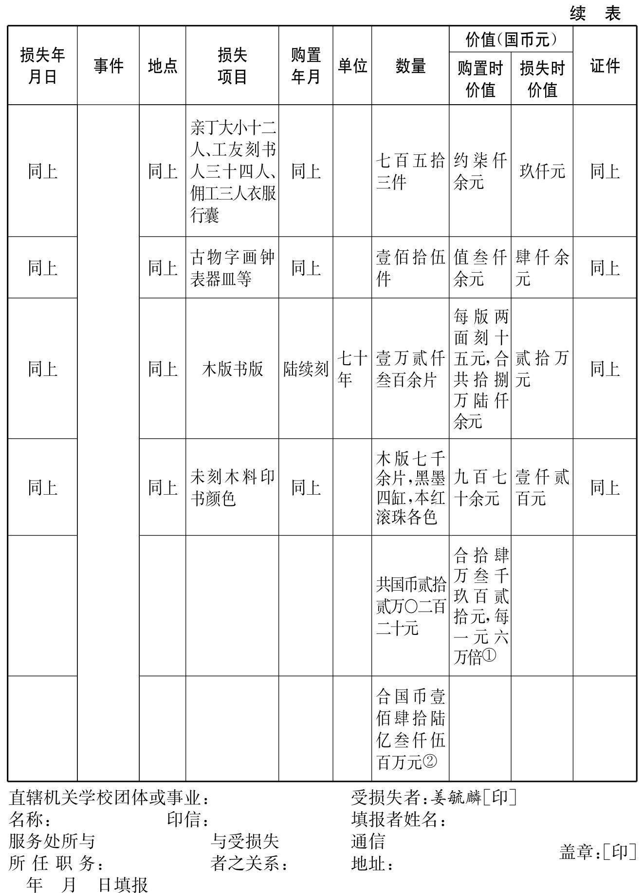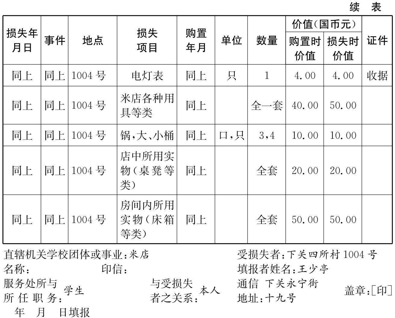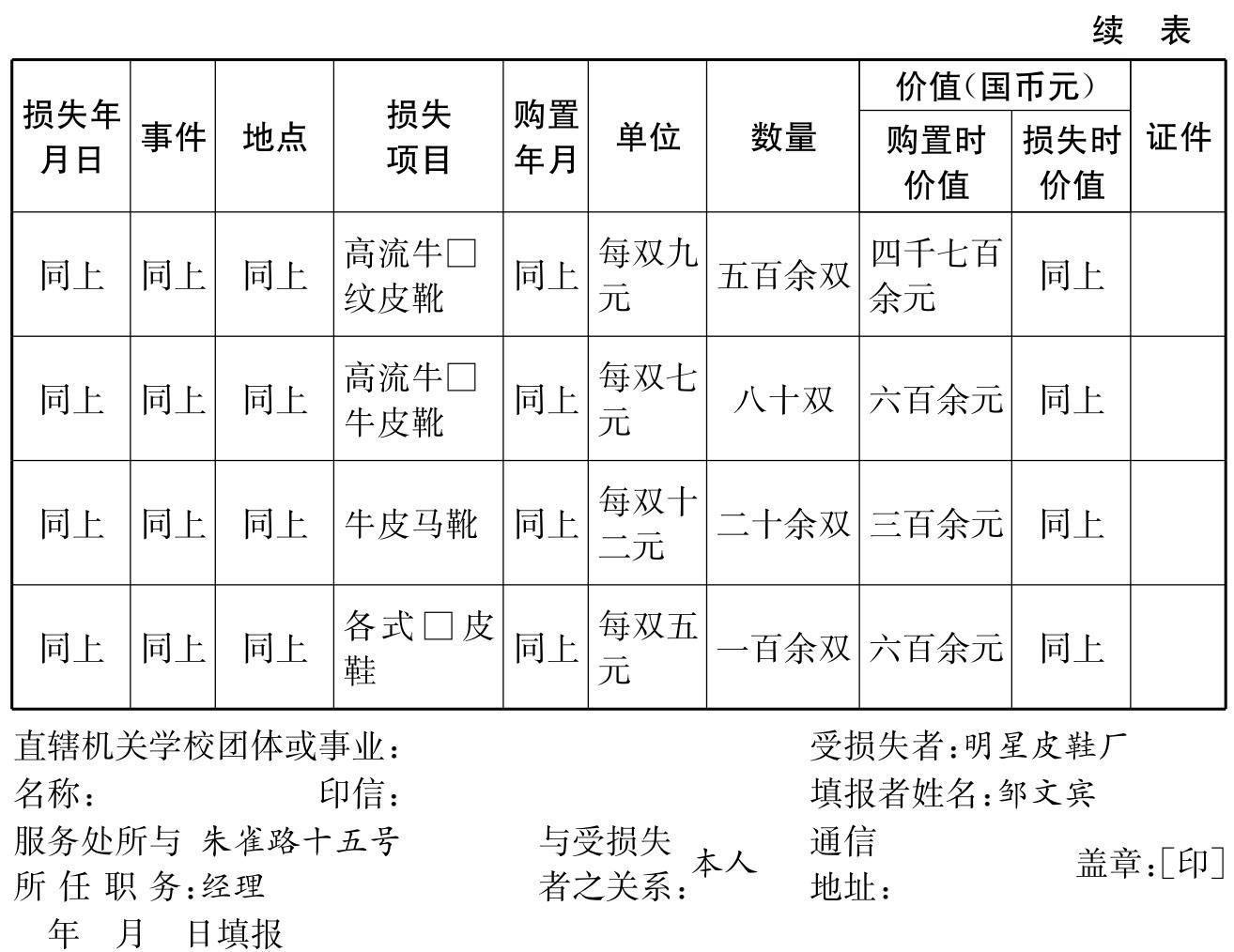 ② 本格及其上面几格填写位置可能有误,疑为“损失时价值”。原档如此。