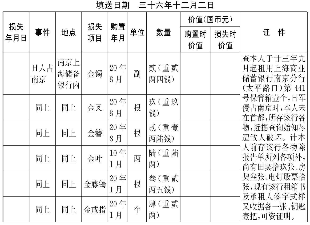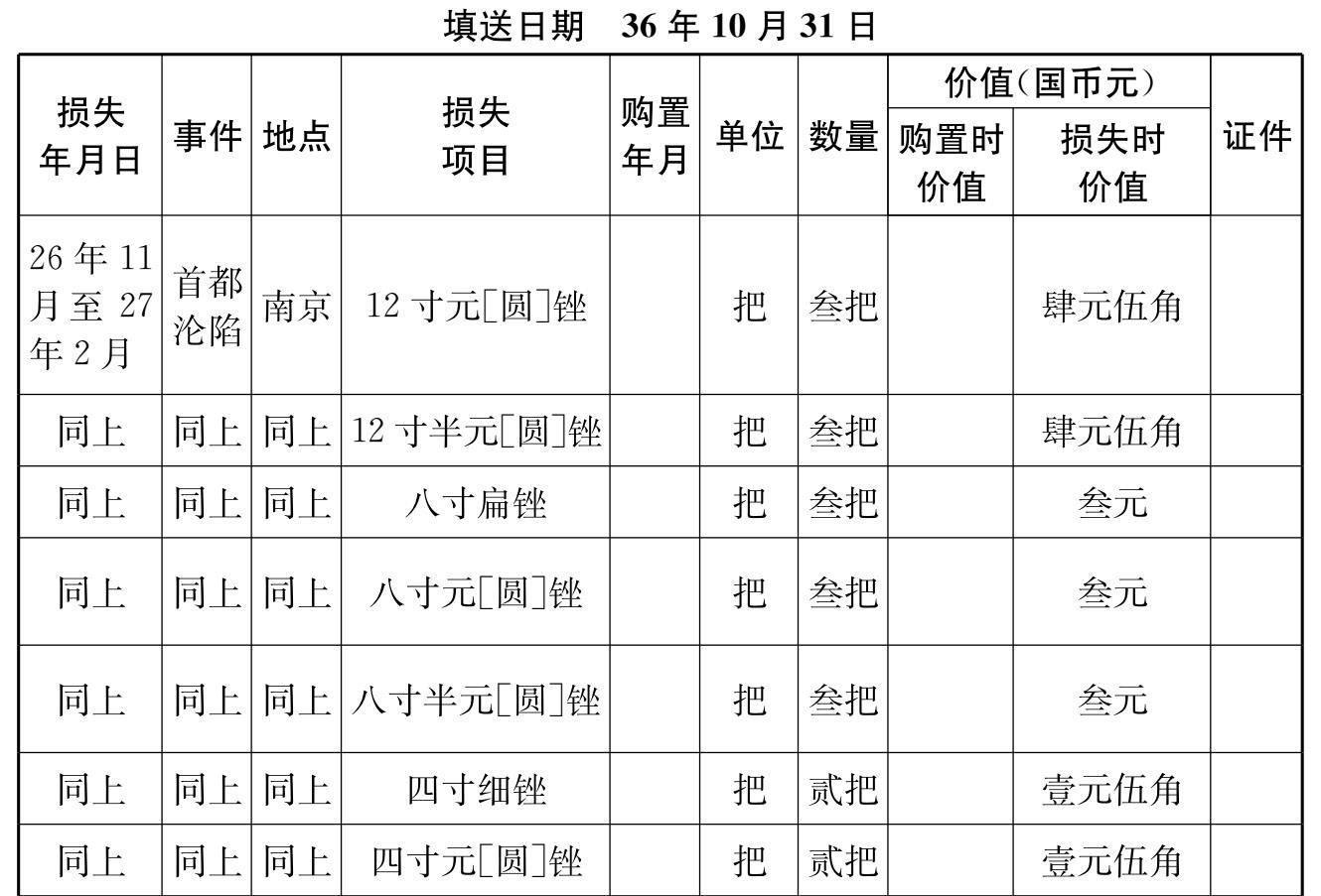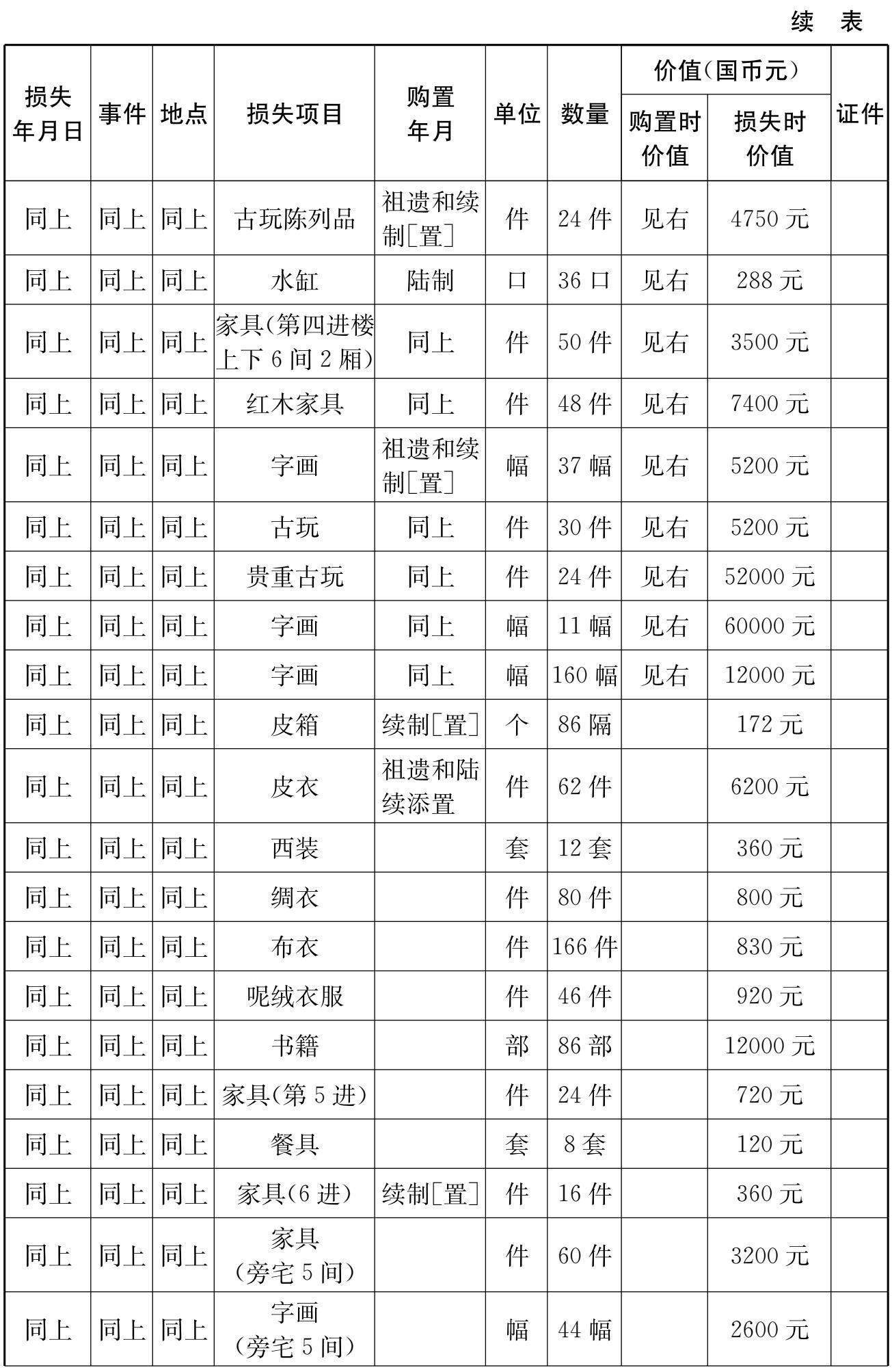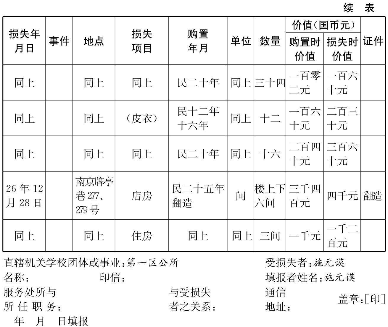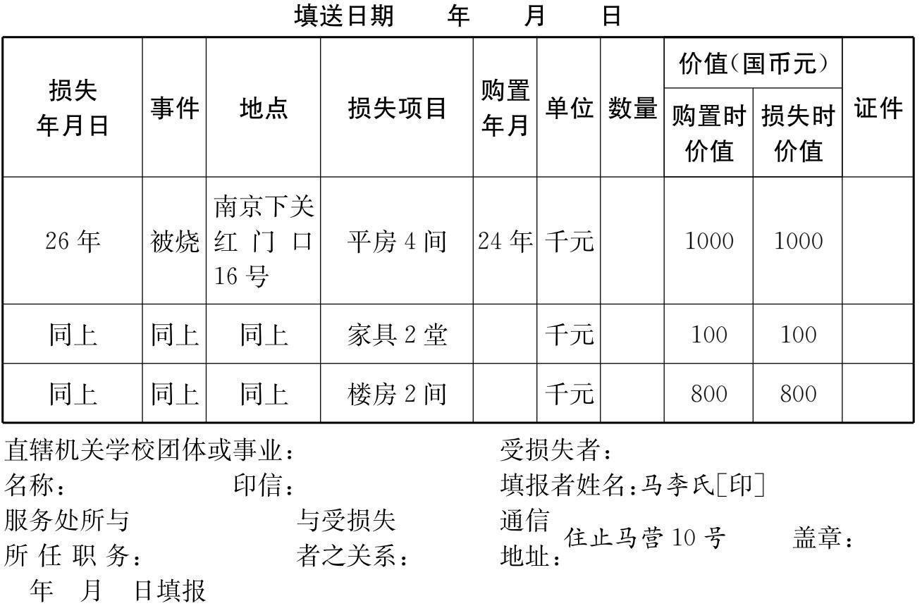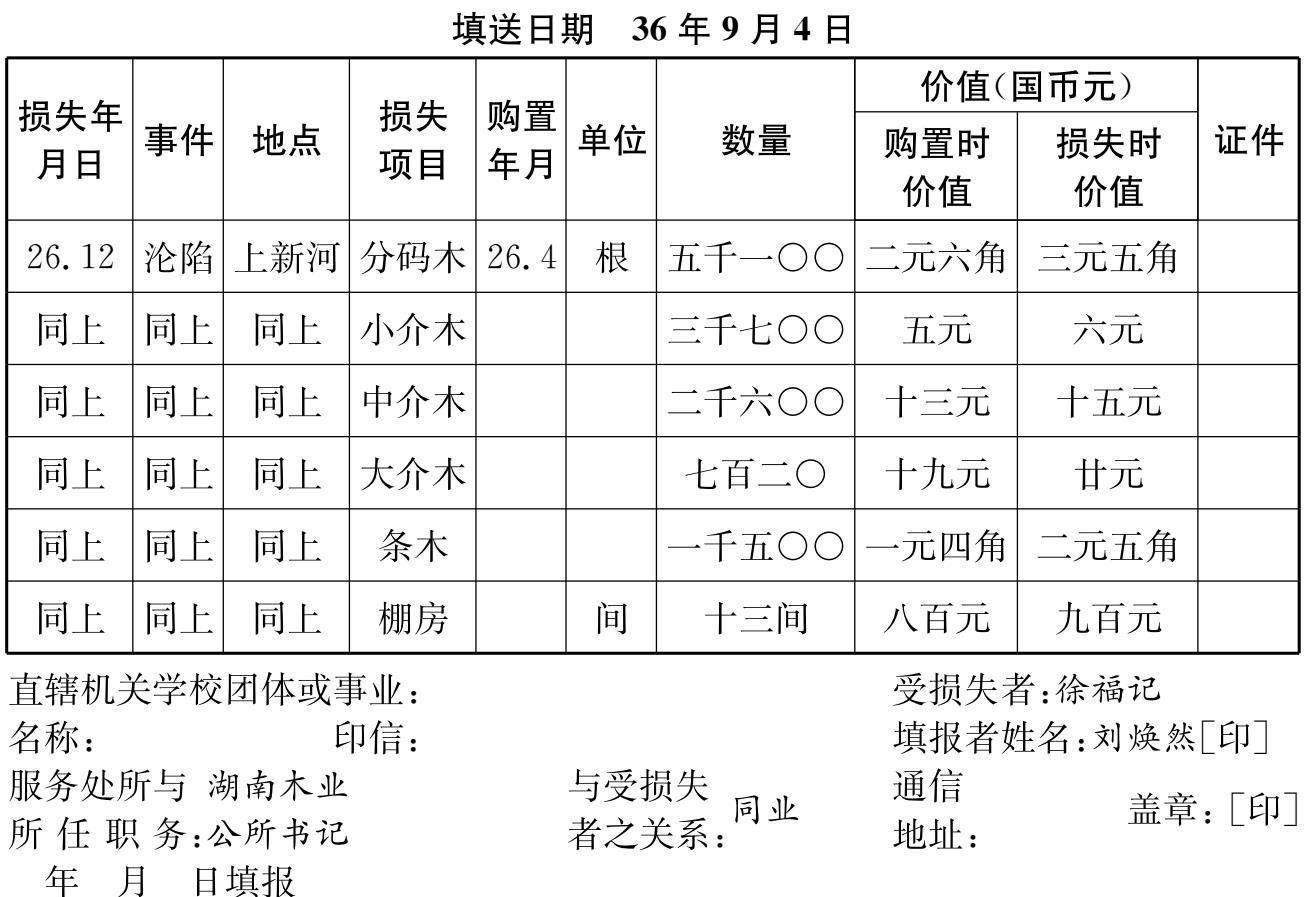 ② 本格及其上面几格填写位置可能有误,疑为“损失时价值”。原档如此。