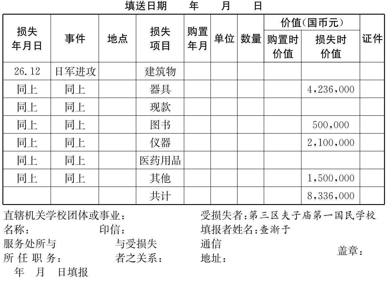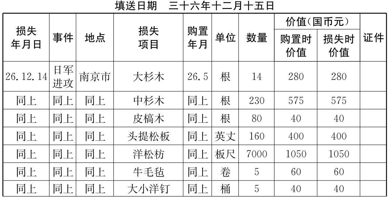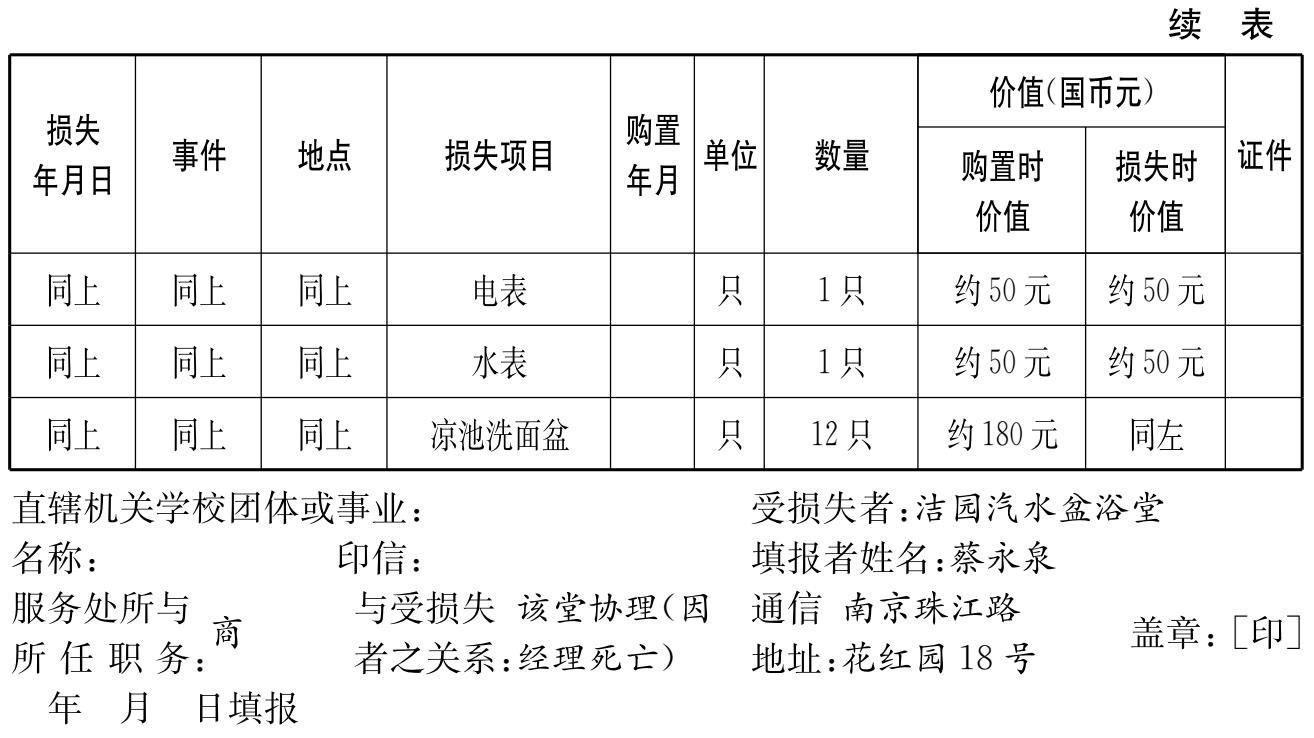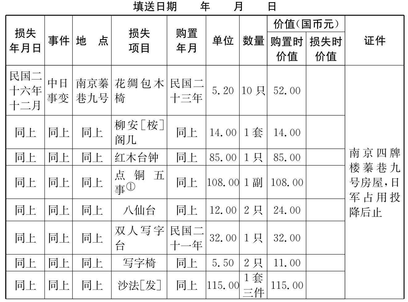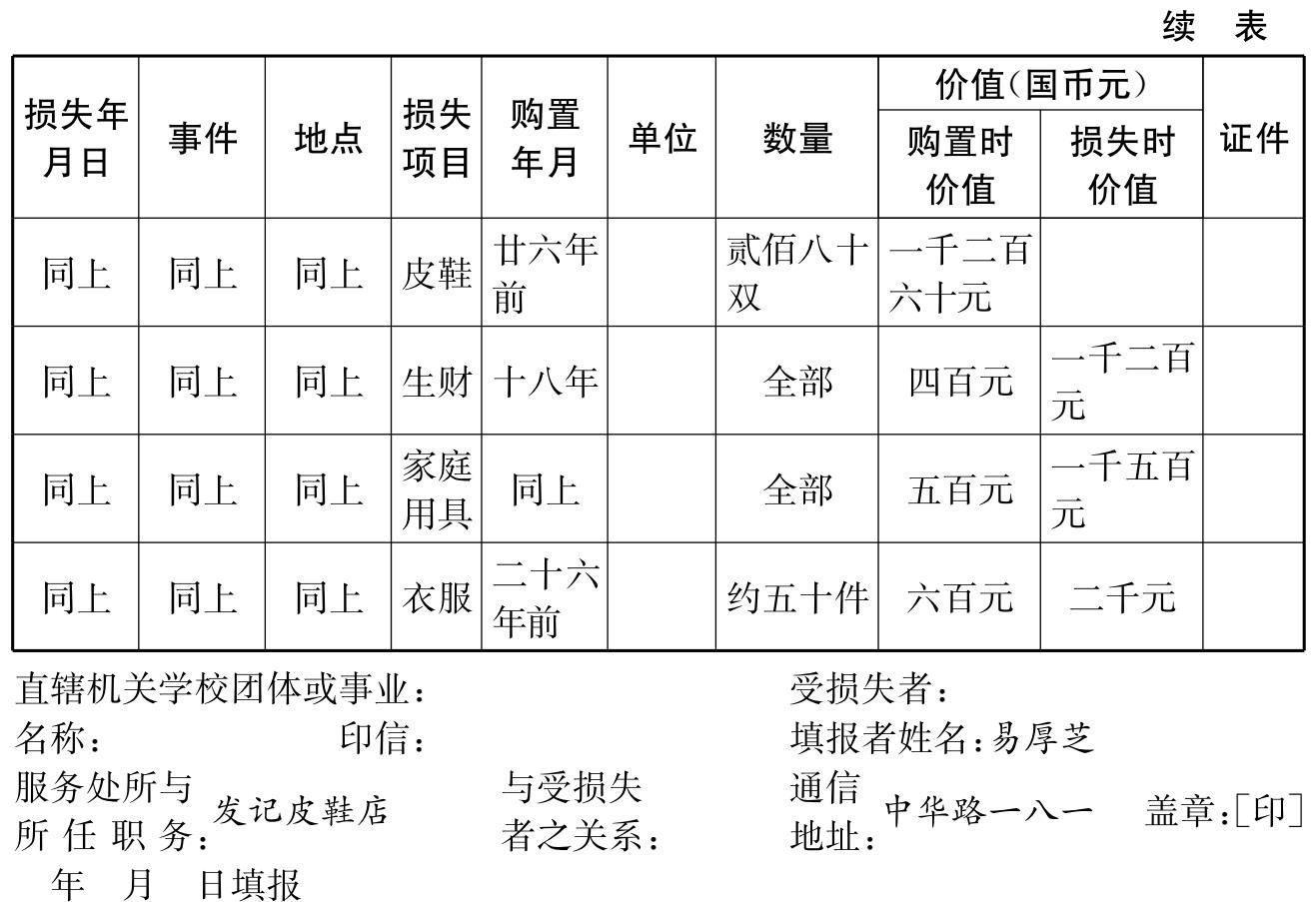 ② 本格及其上面几格填写位置可能有误,疑为“损失时价值”。原档如此。
