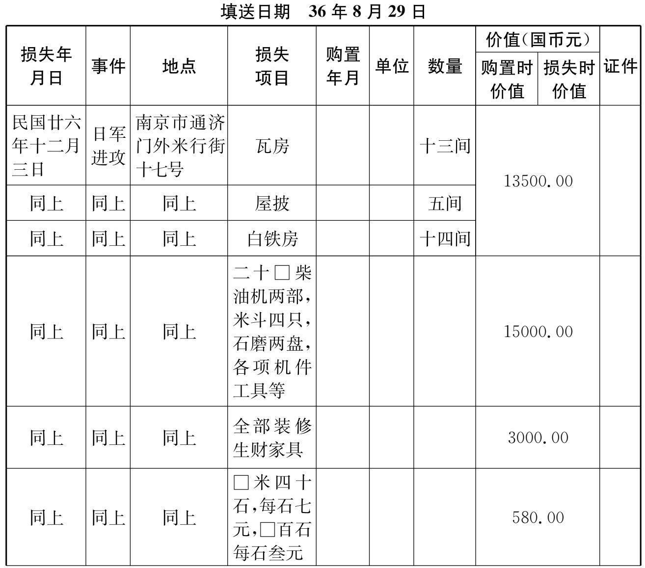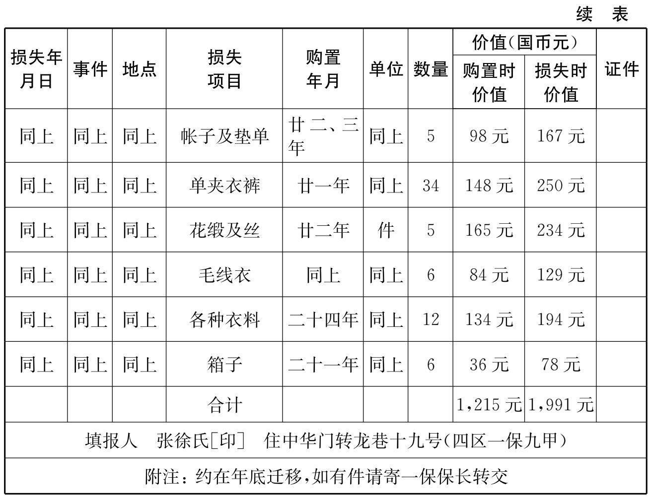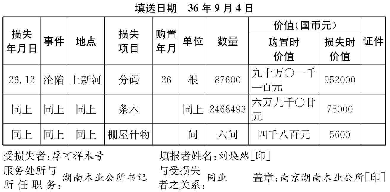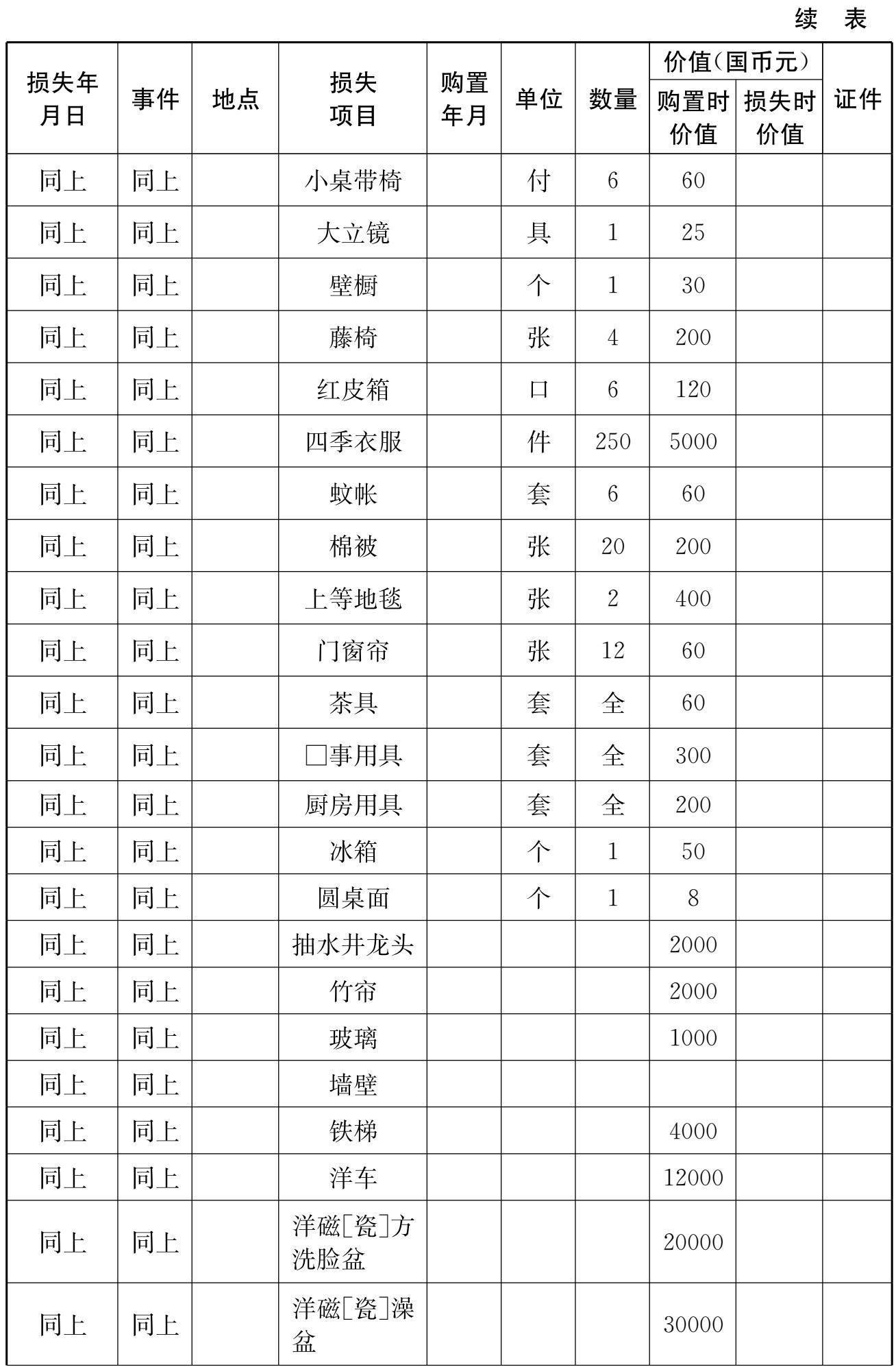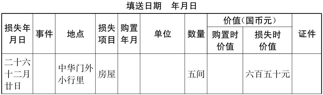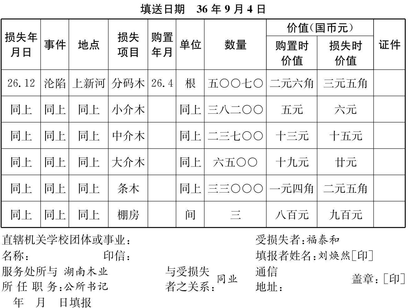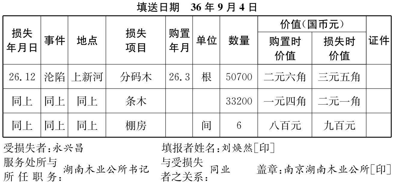 ② 本格及其上面几格填写位置可能有误,疑为“损失时价值”。原档如此。