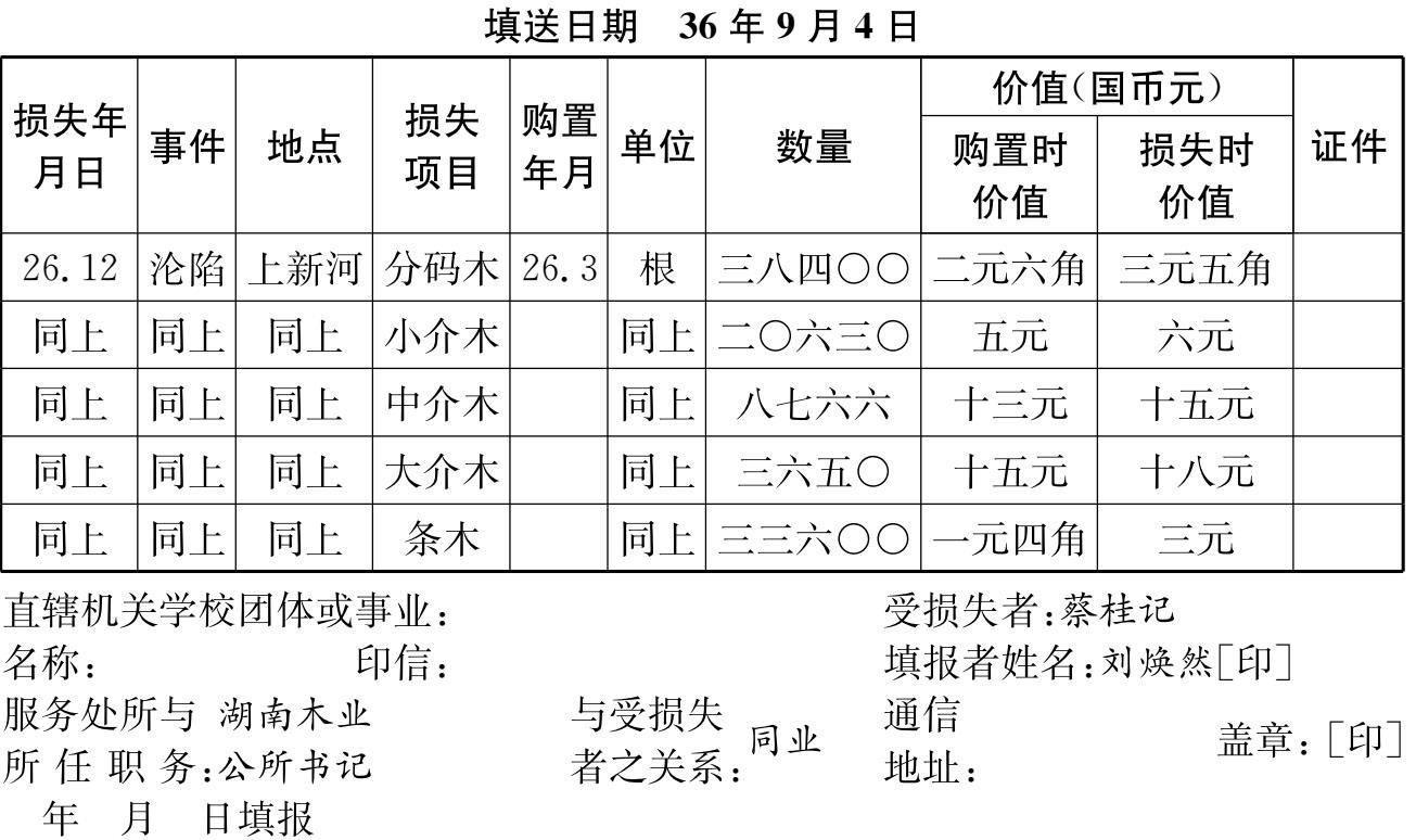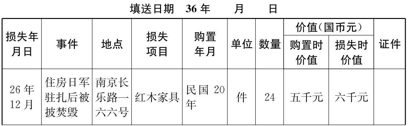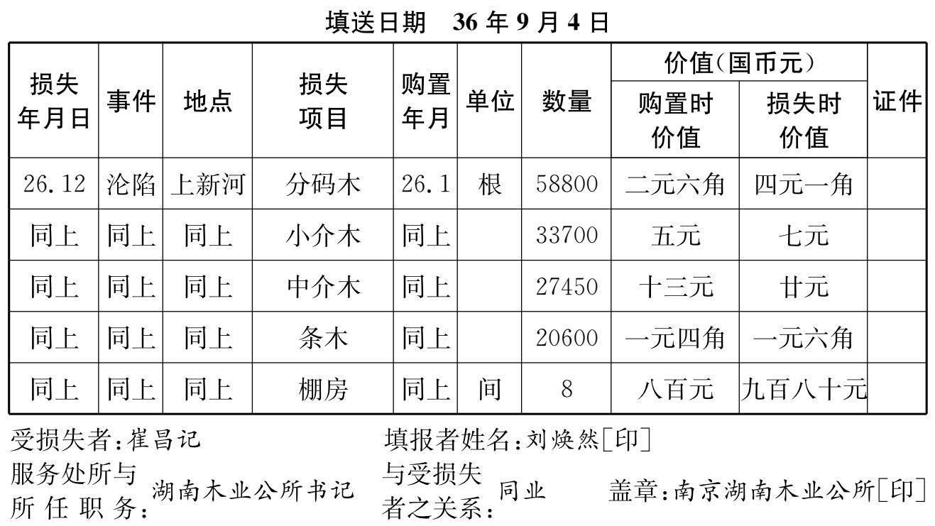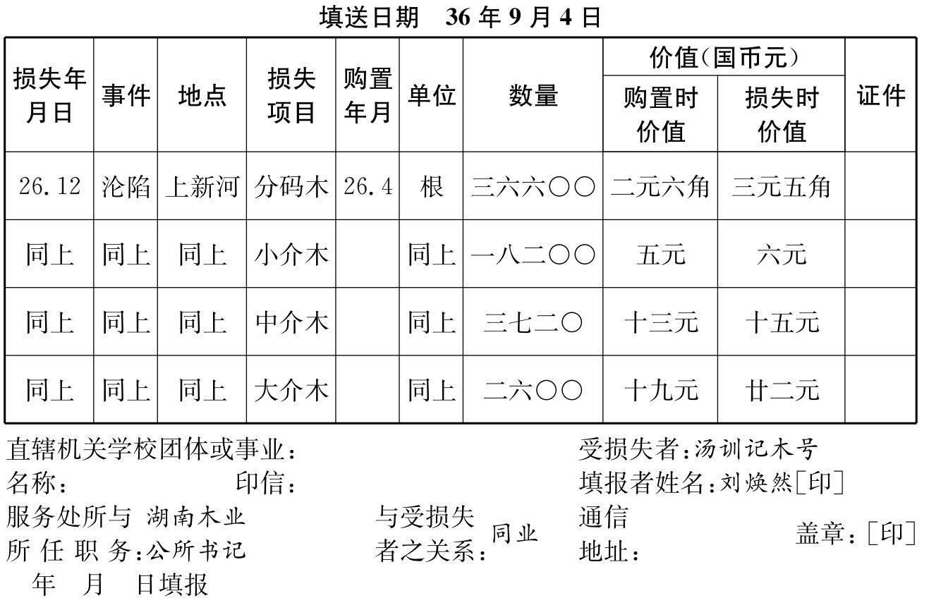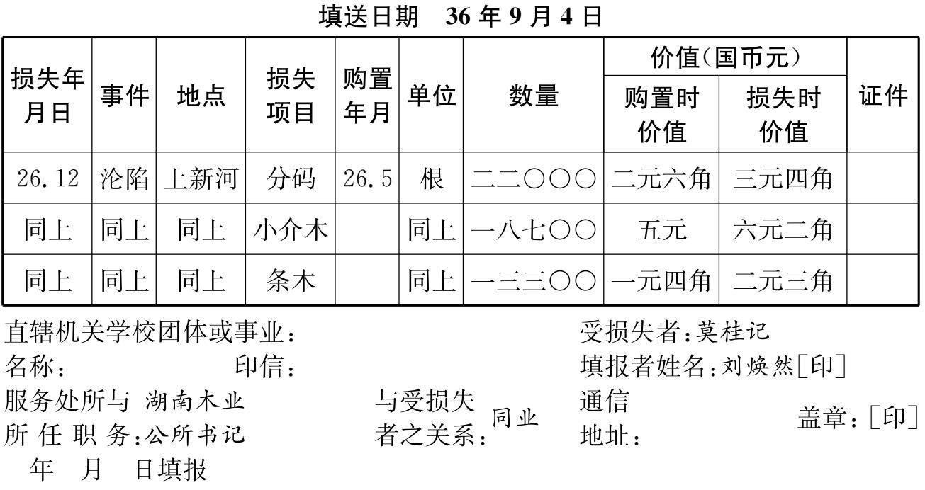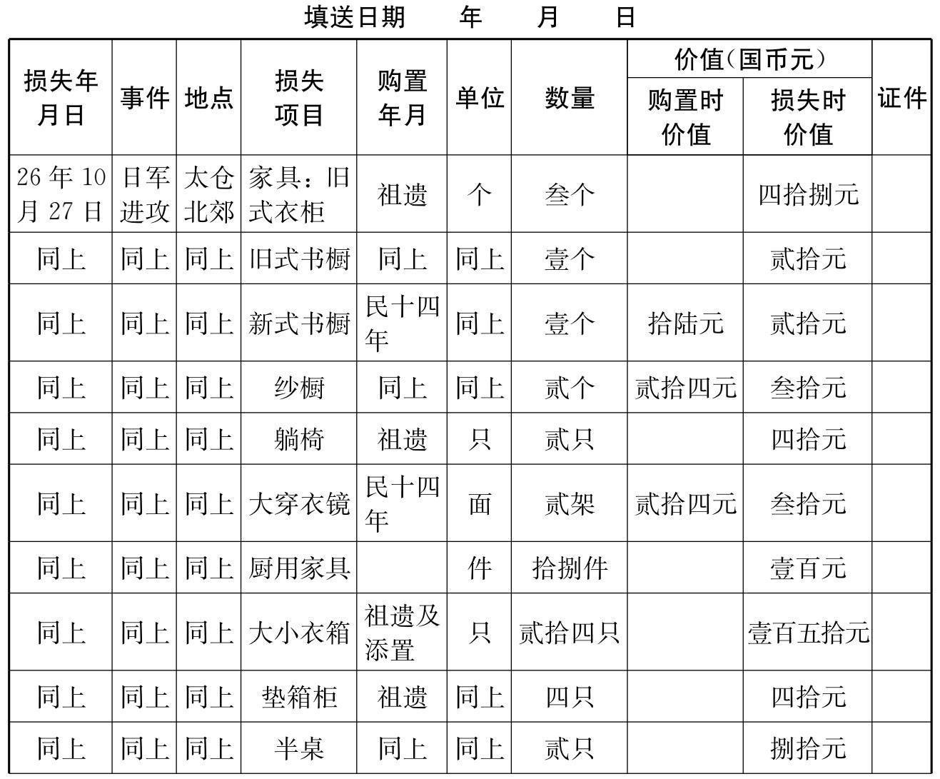② 本格及其上面几格填写位置可能有误,疑为“损失时价值”。原档如此。