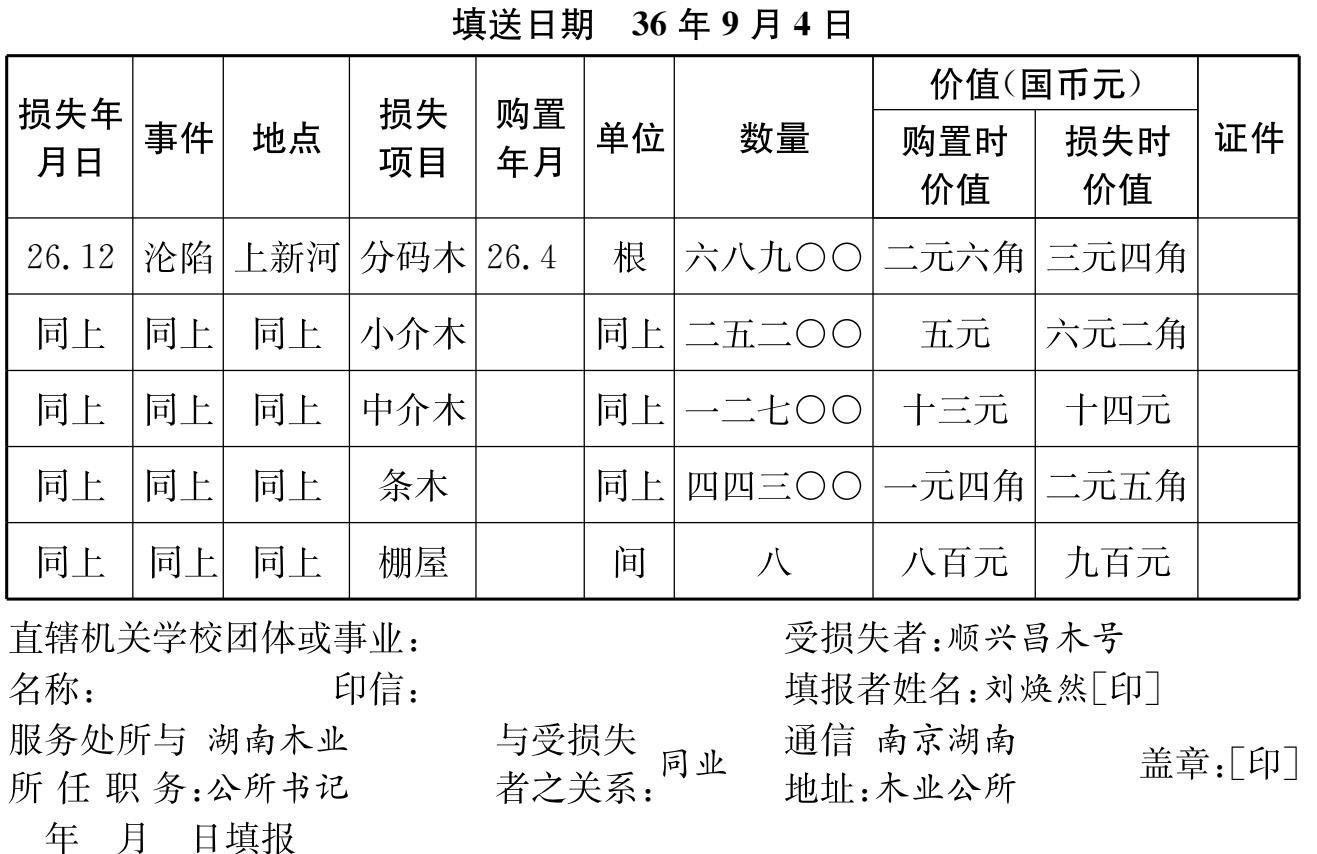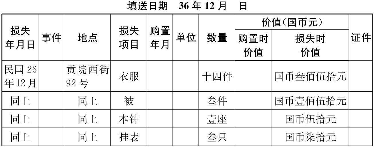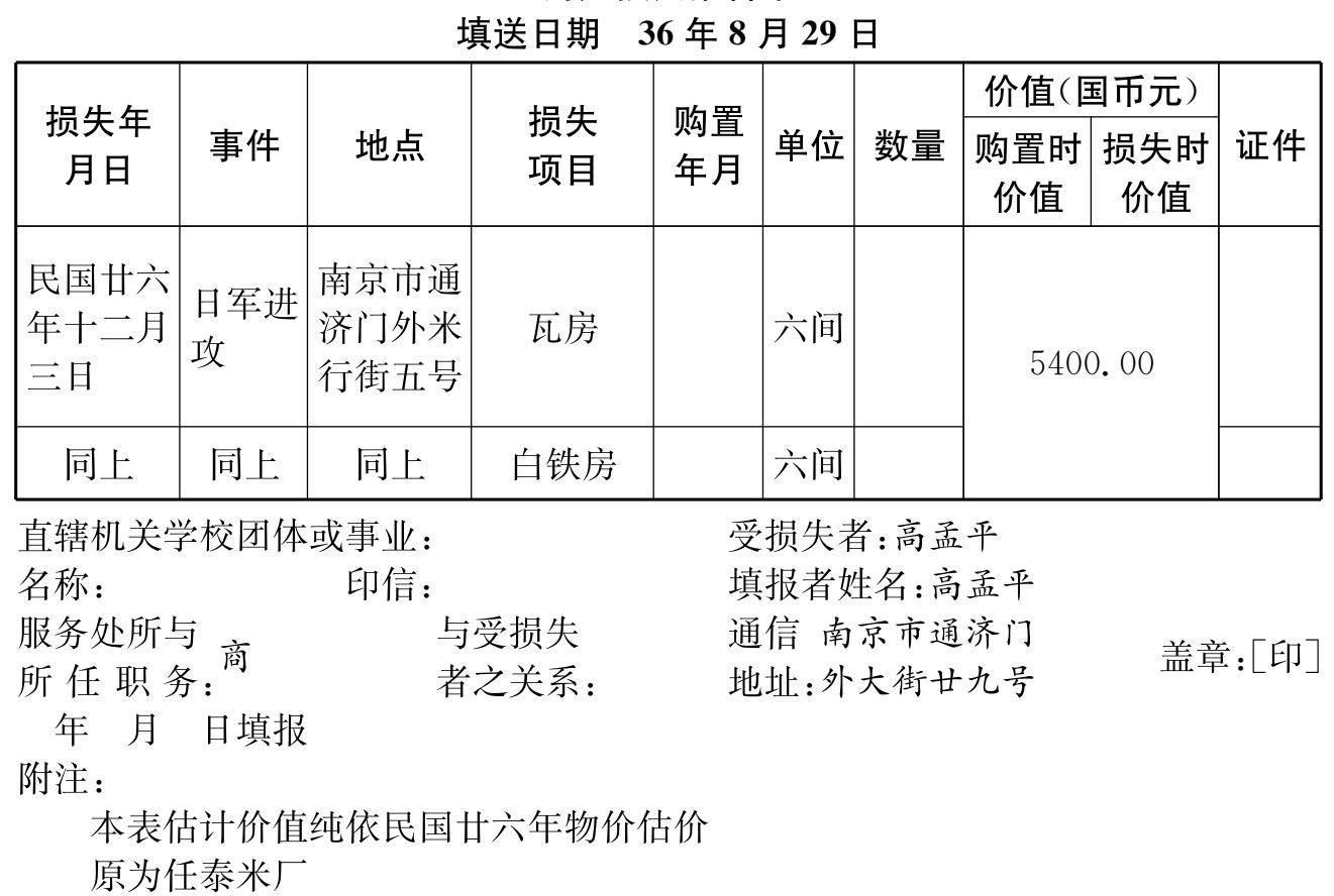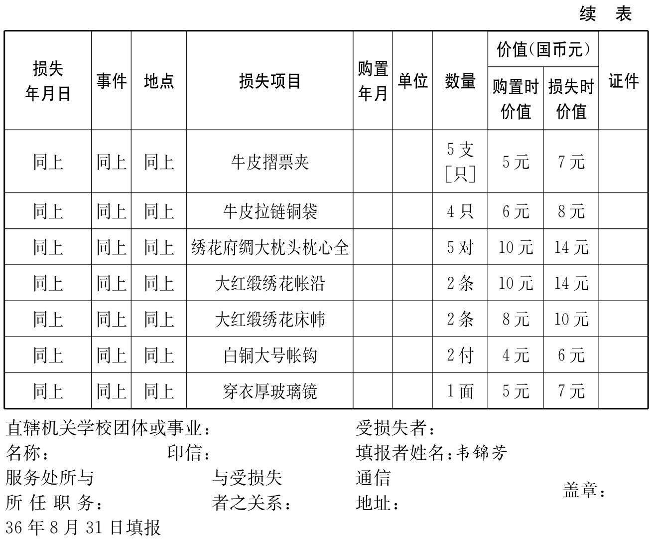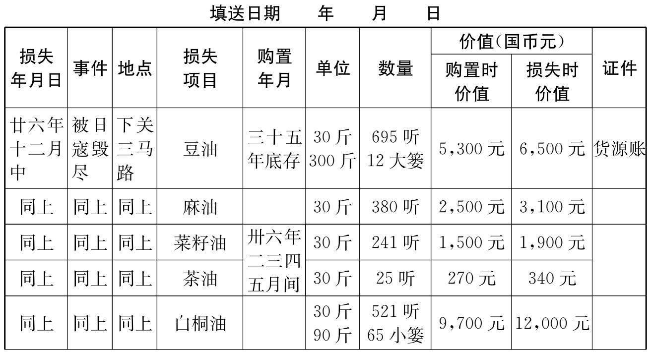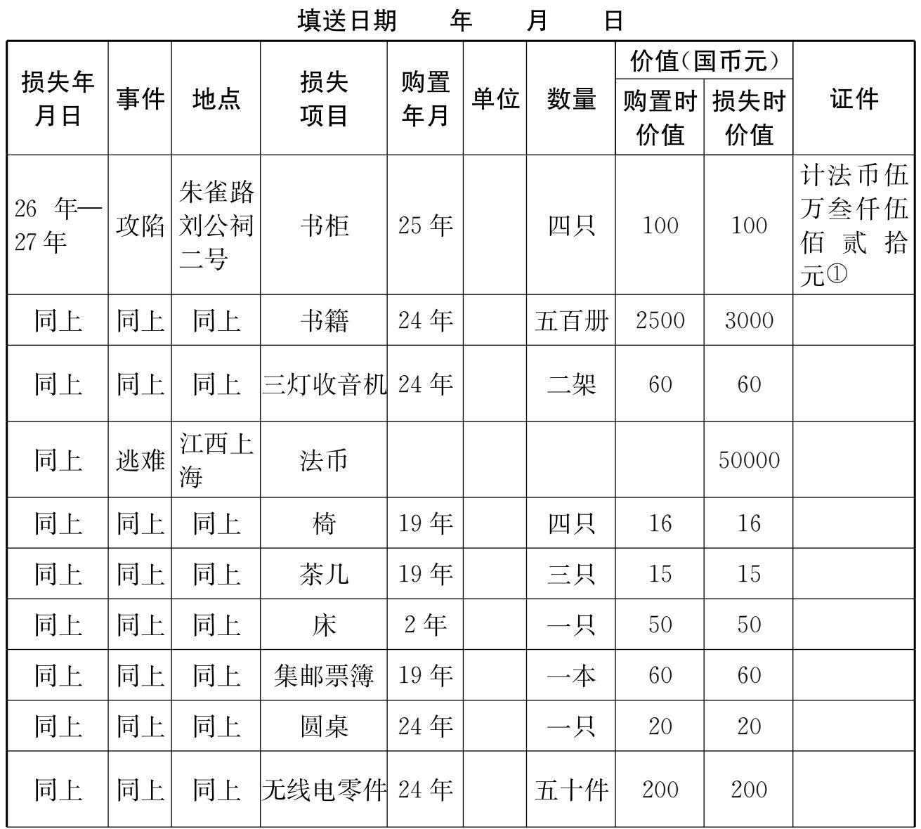 ② 本格及其上面几格填写位置可能有误,疑为“损失时价值”。原档如此。