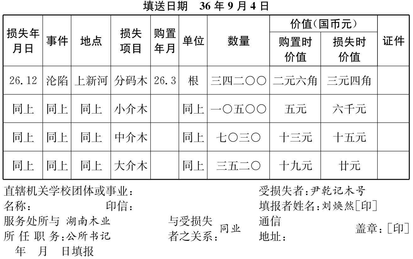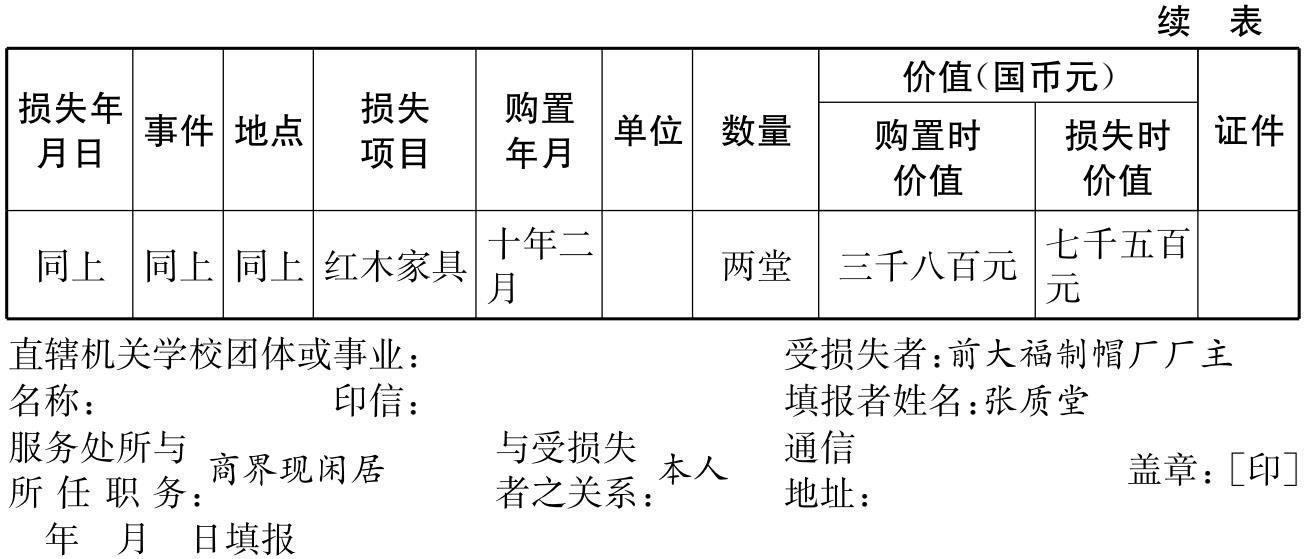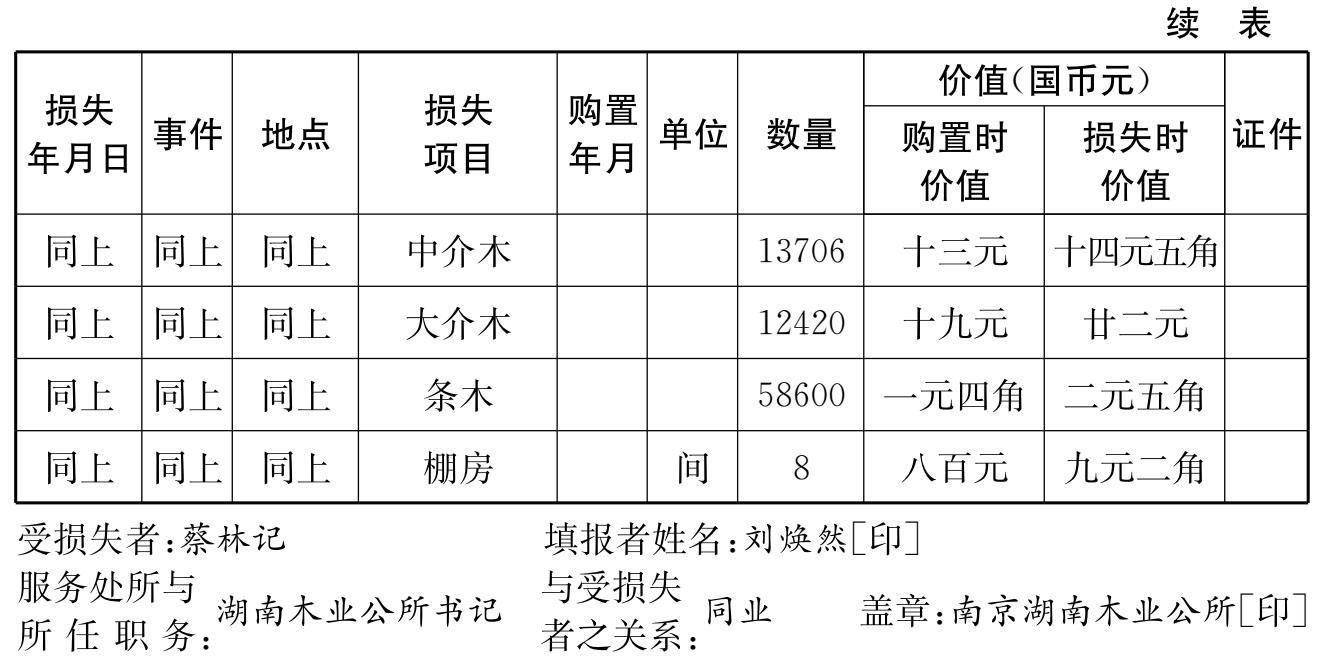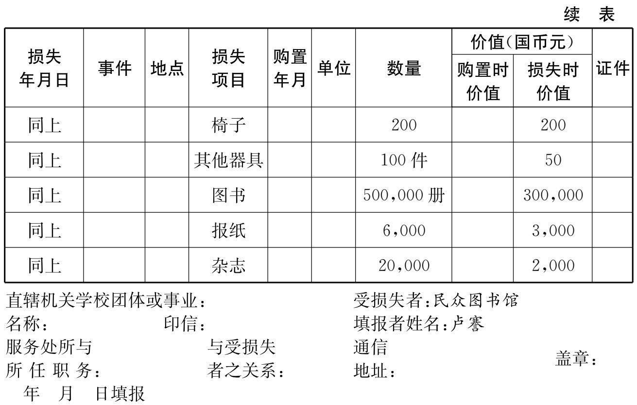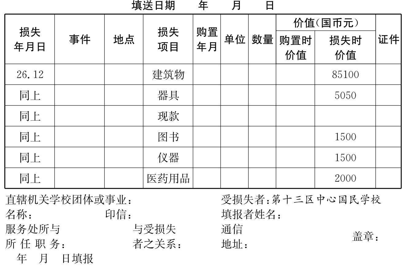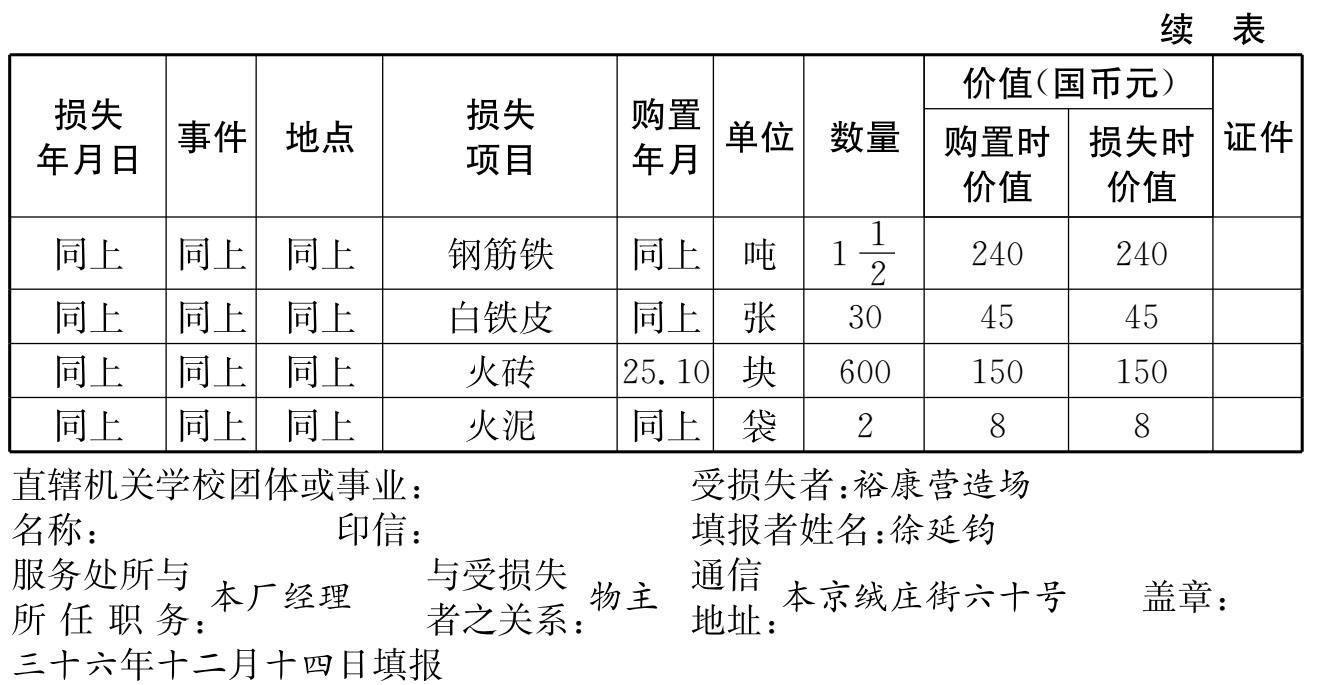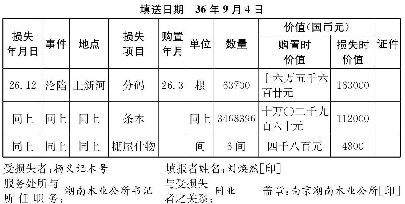 ② 本格及其上面几格填写位置可能有误,疑为“损失时价值”。原档如此。