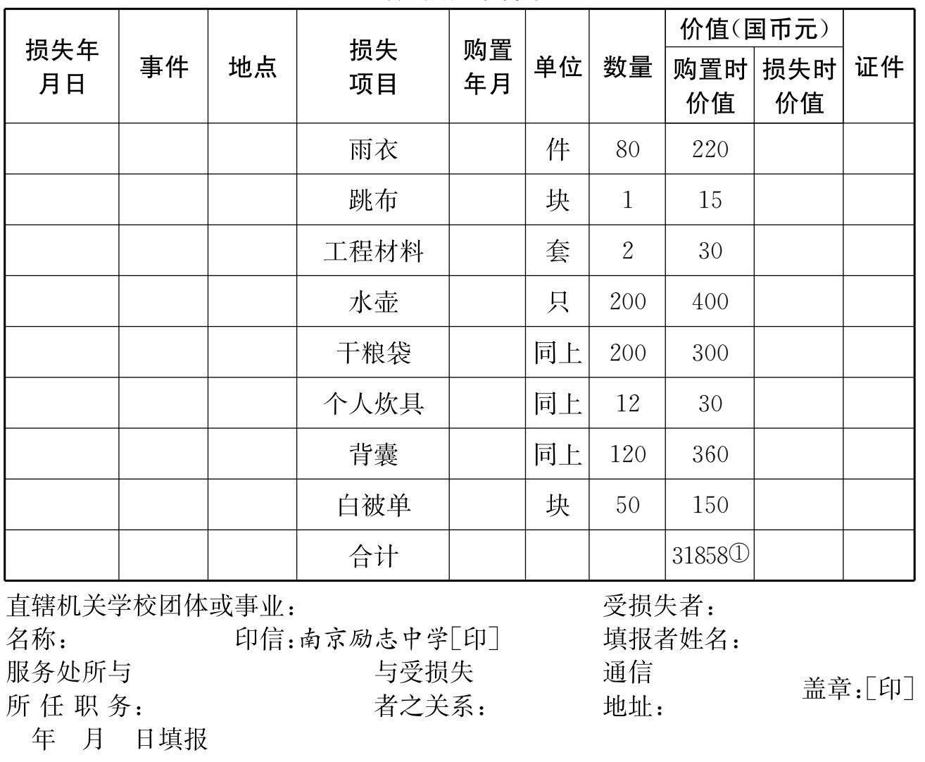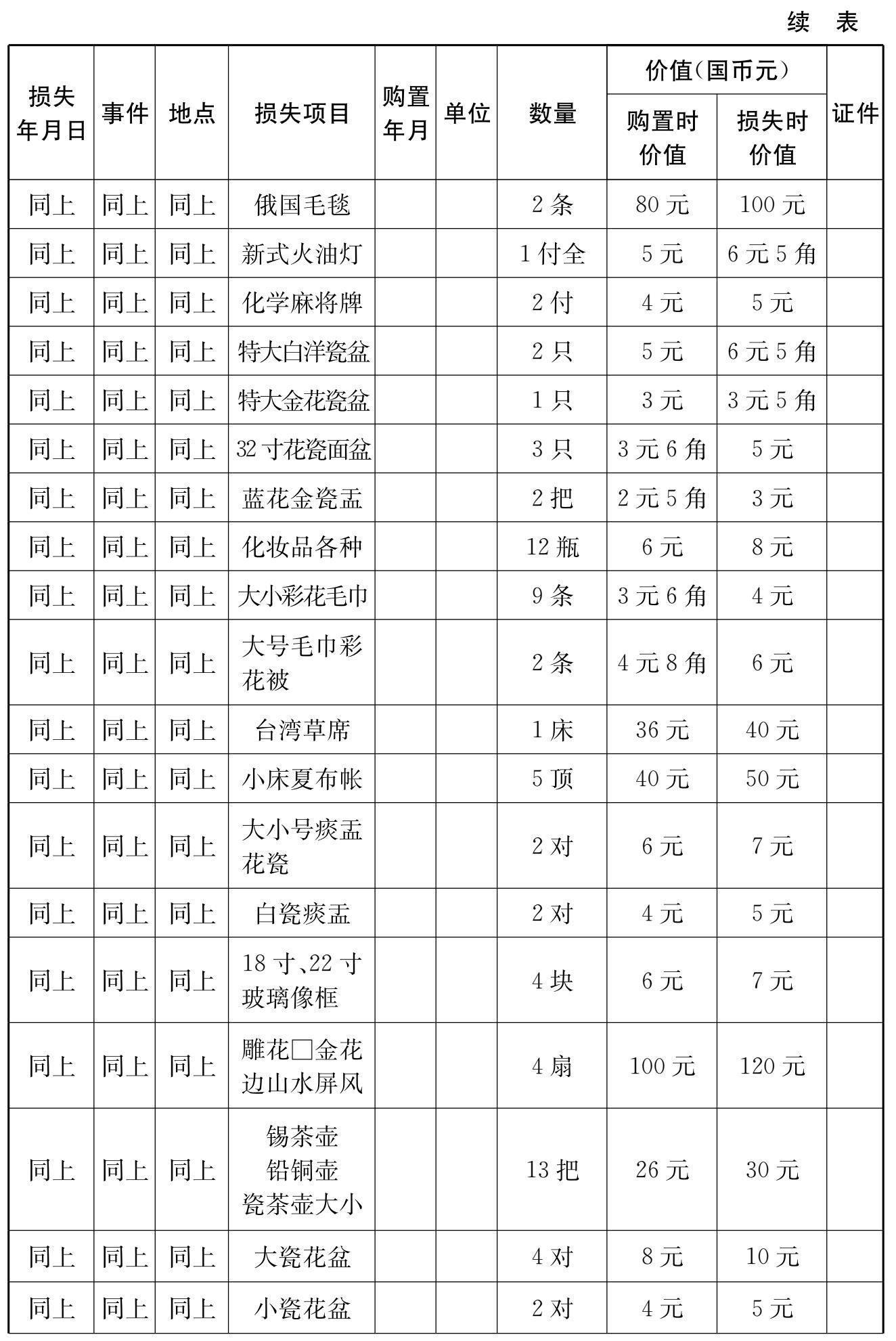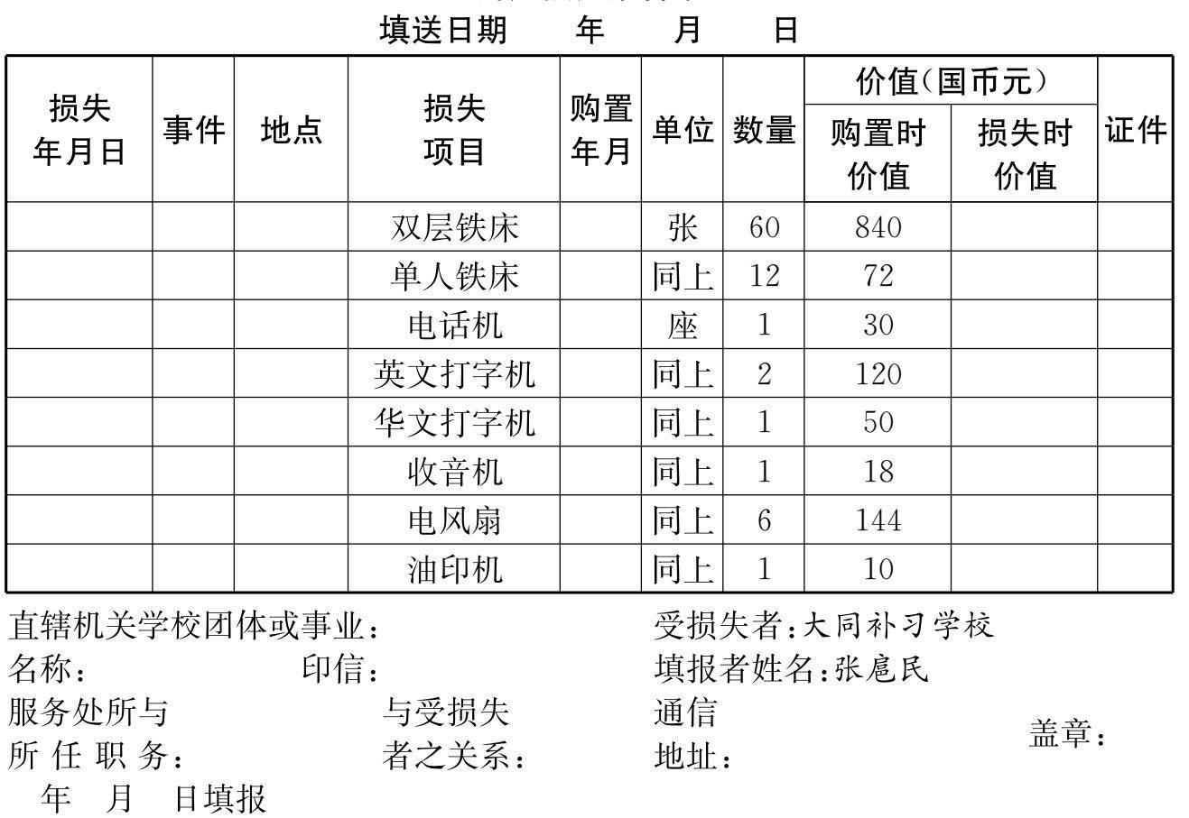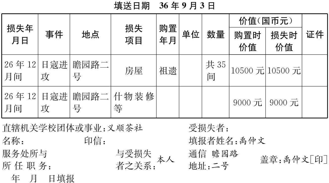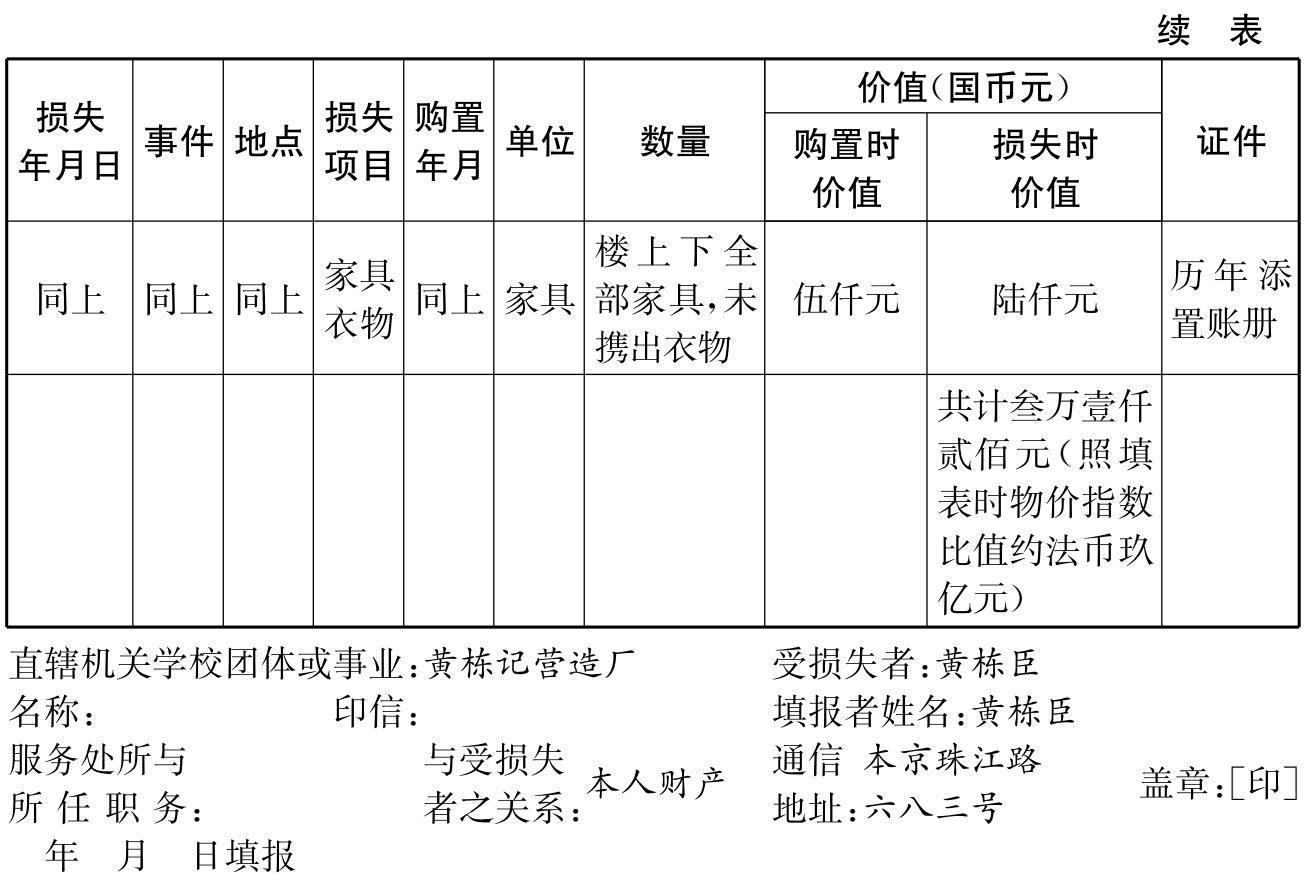 ② 本格及其上面几格填写位置可能有误,疑为“损失时价值”。原档如此。