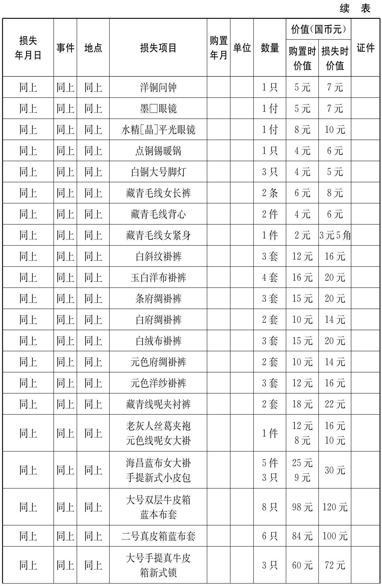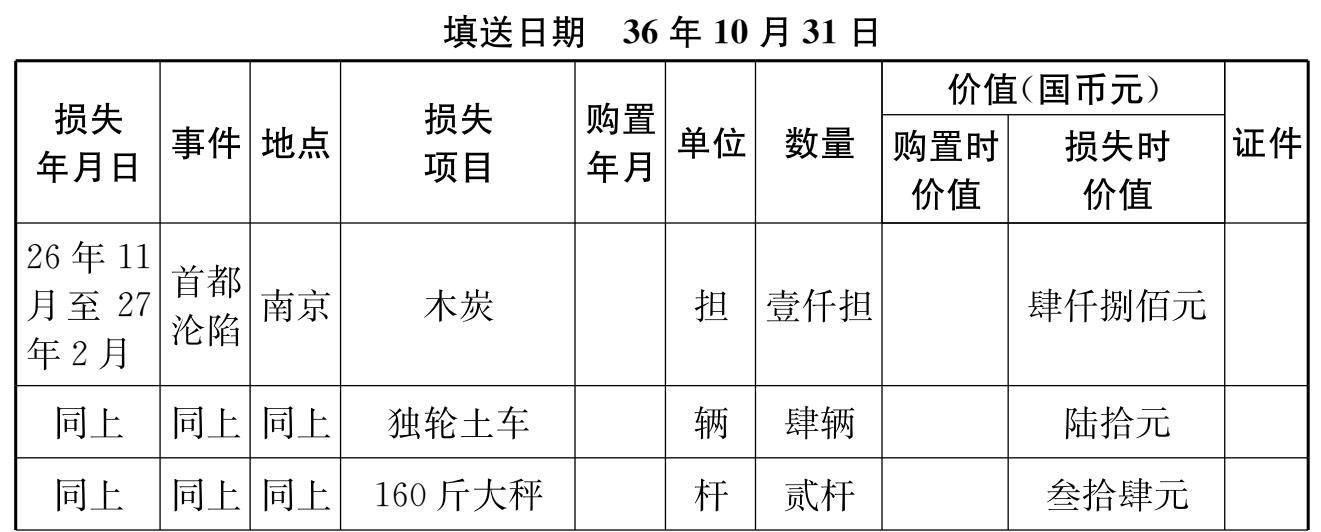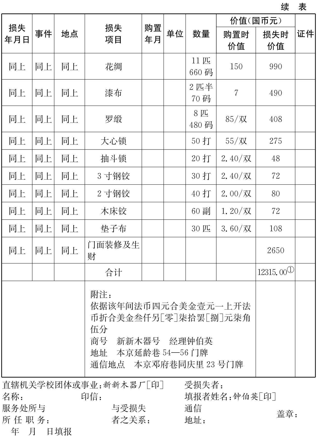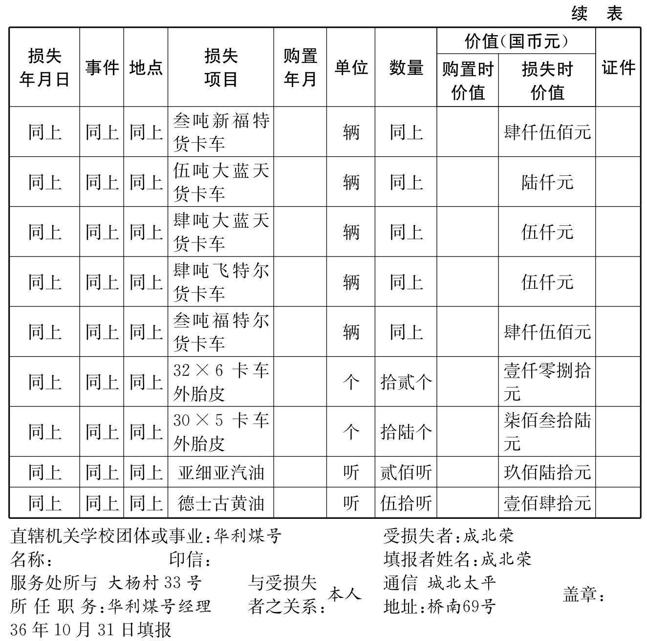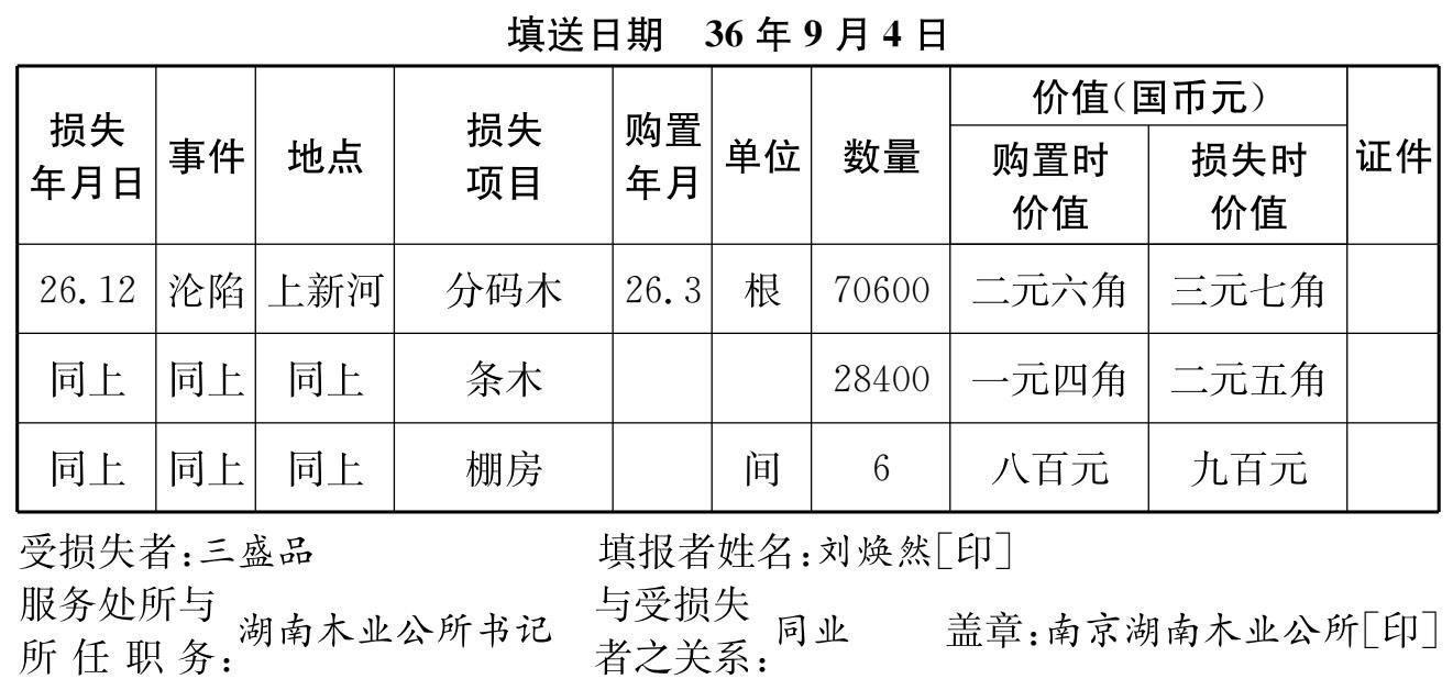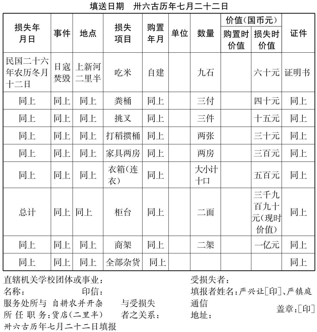 ② 本格及其上面几格填写位置可能有误,疑为“损失时价值”。原档如此。