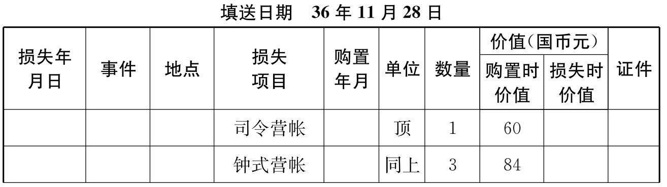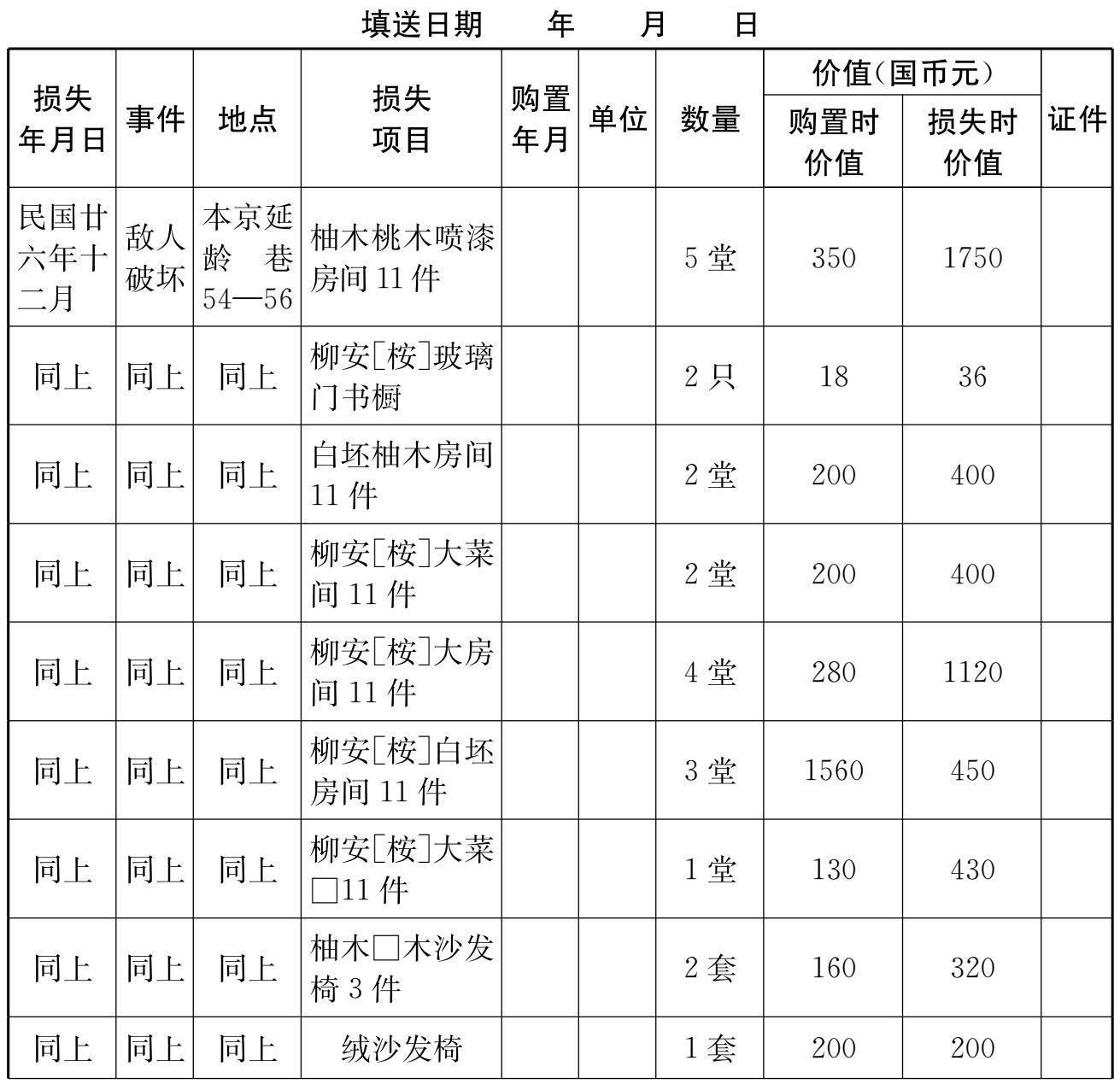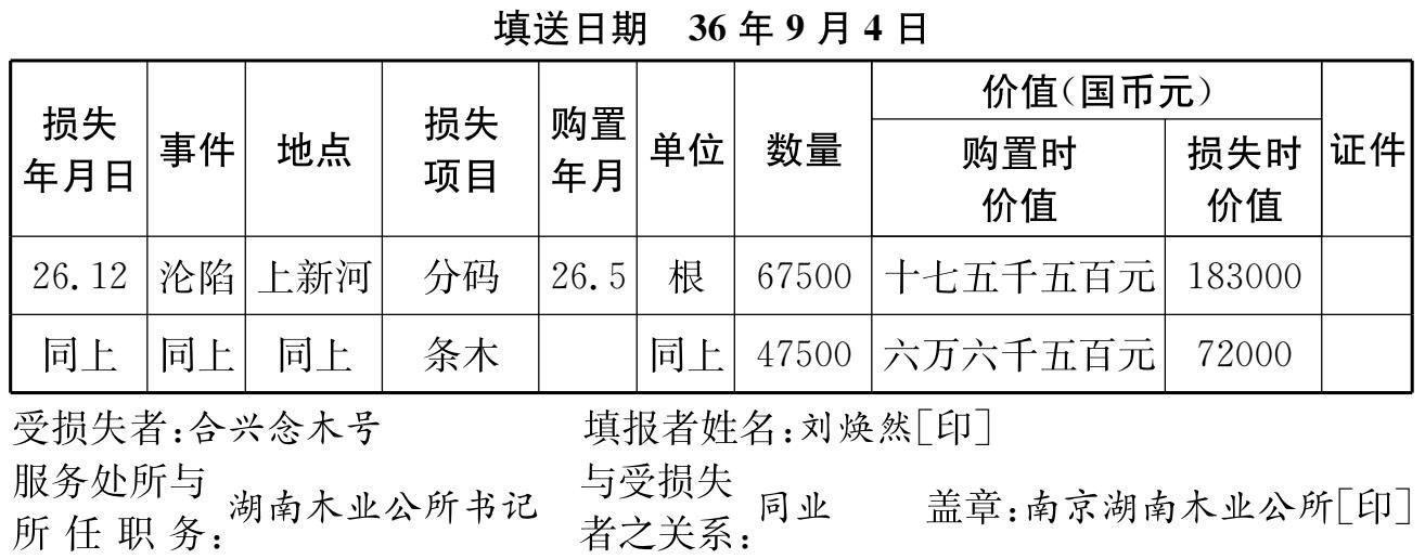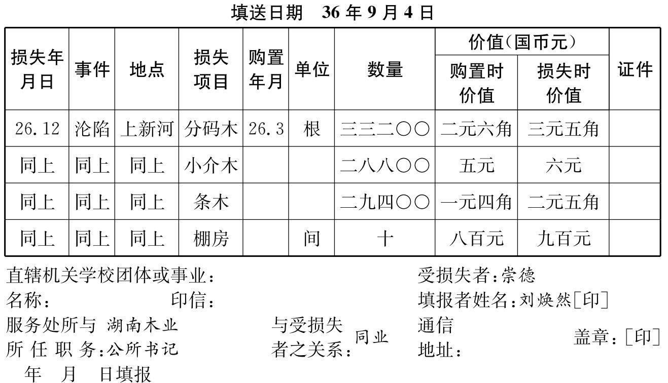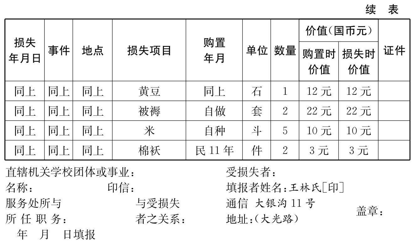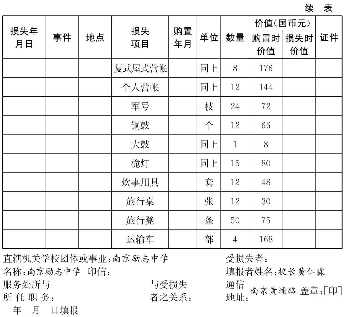 ② 本格及其上面几格填写位置可能有误,疑为“损失时价值”。原档如此。