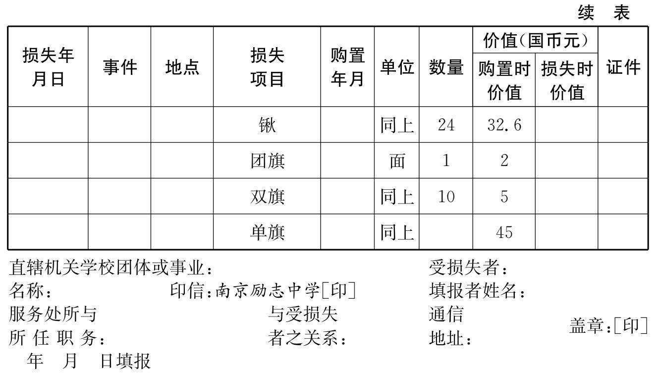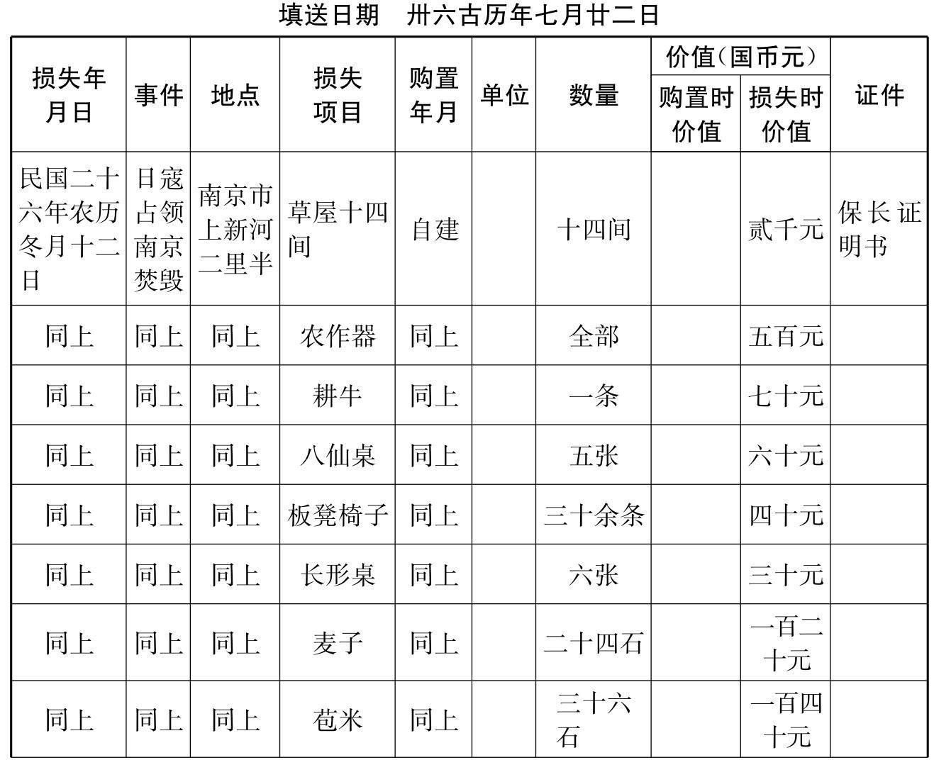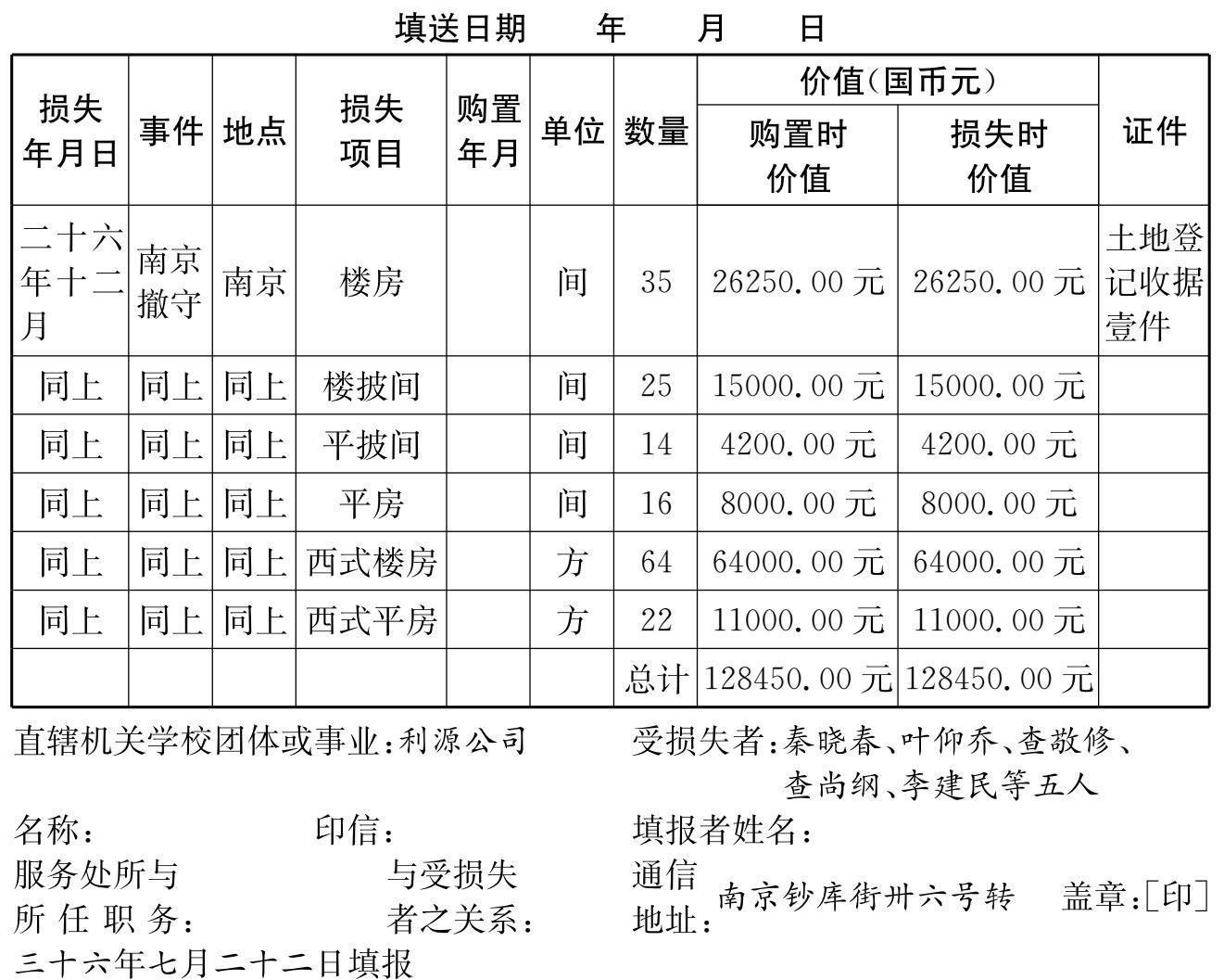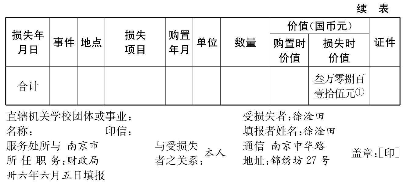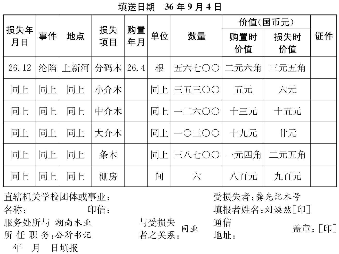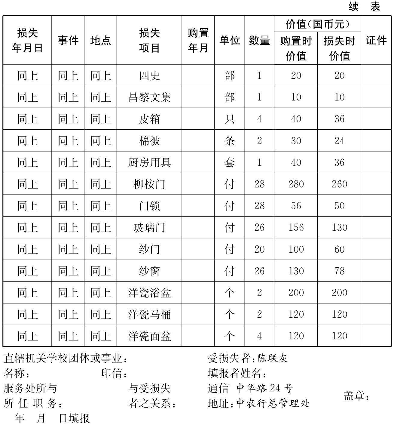 ② 本格及其上面几格填写位置可能有误,疑为“损失时价值”。原档如此。