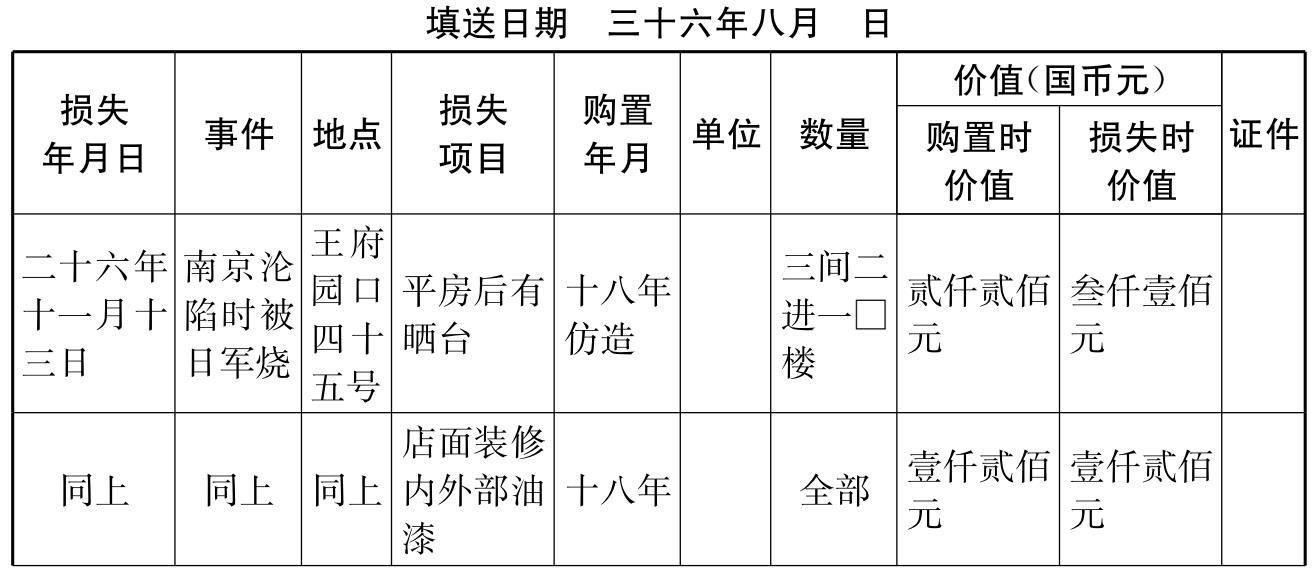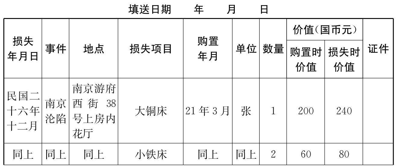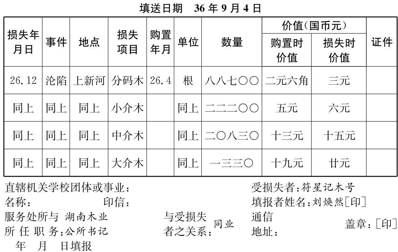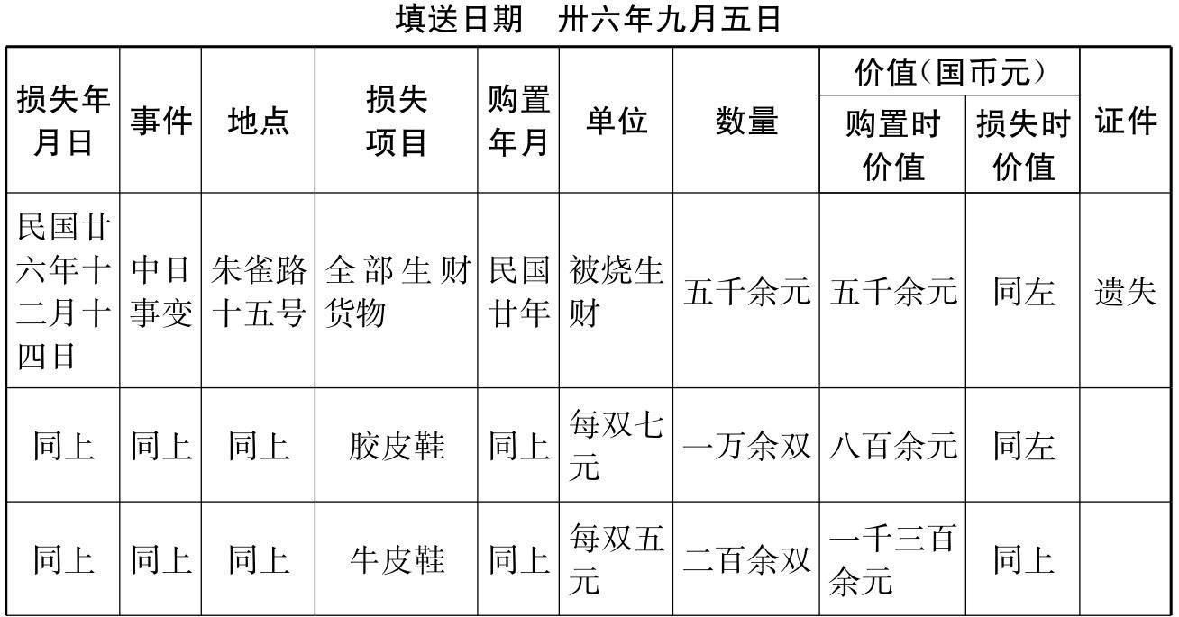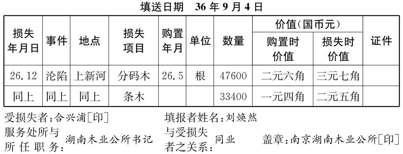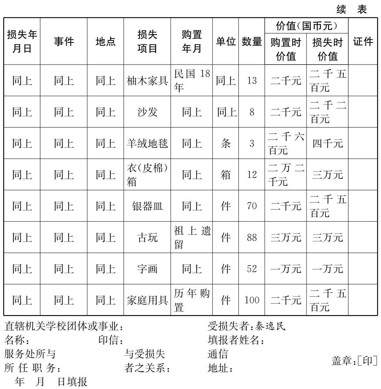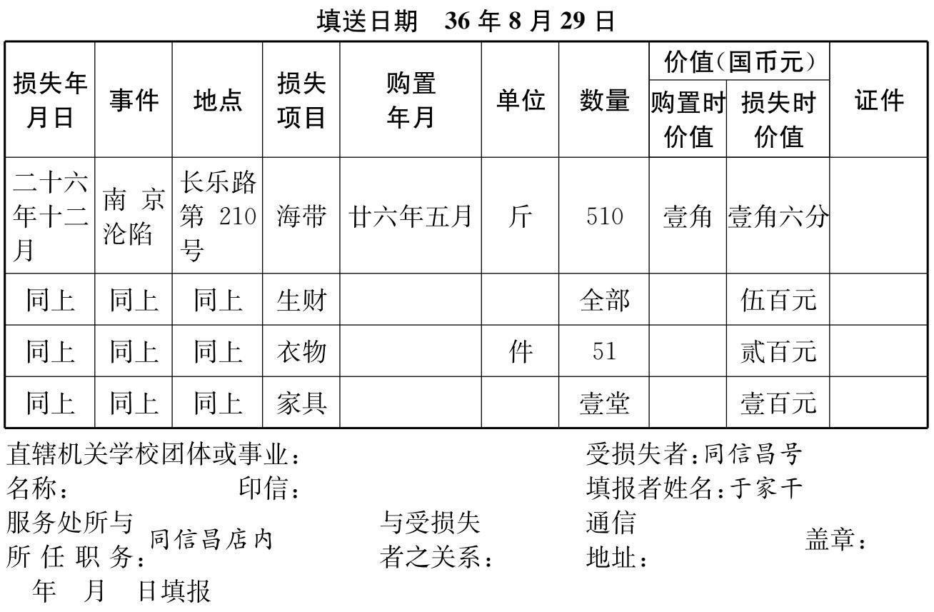 ② 本格及其上面几格填写位置可能有误,疑为“损失时价值”。原档如此。