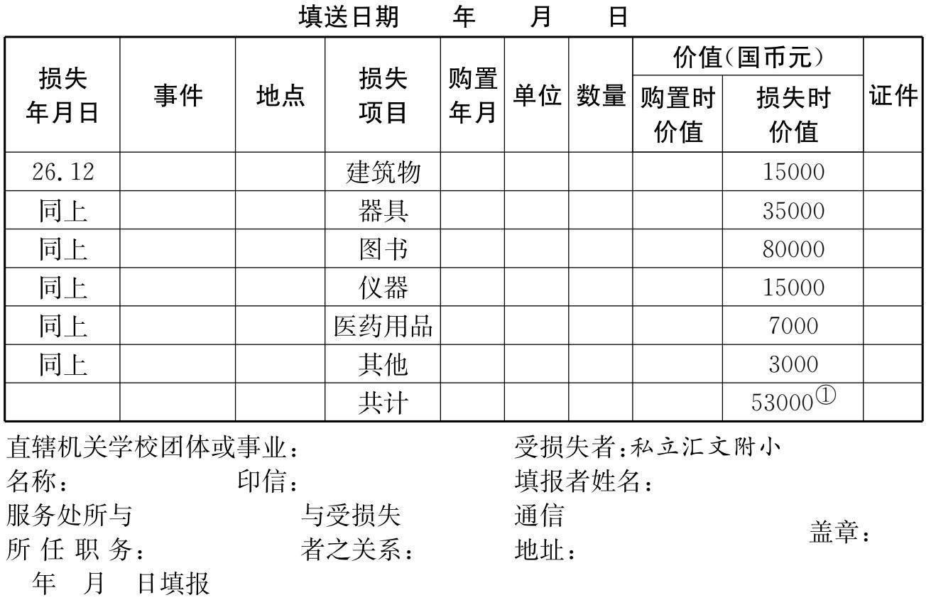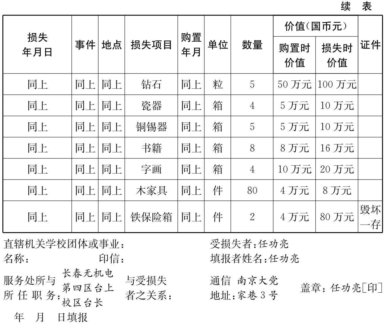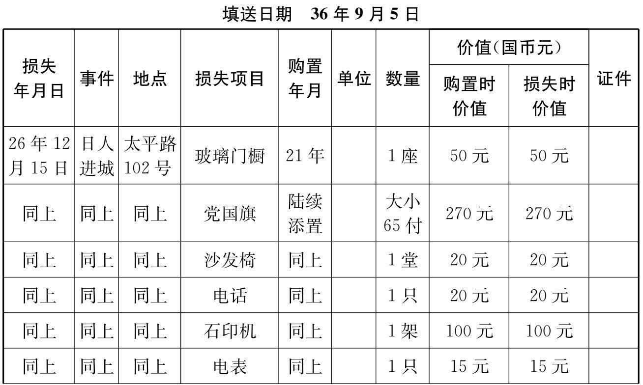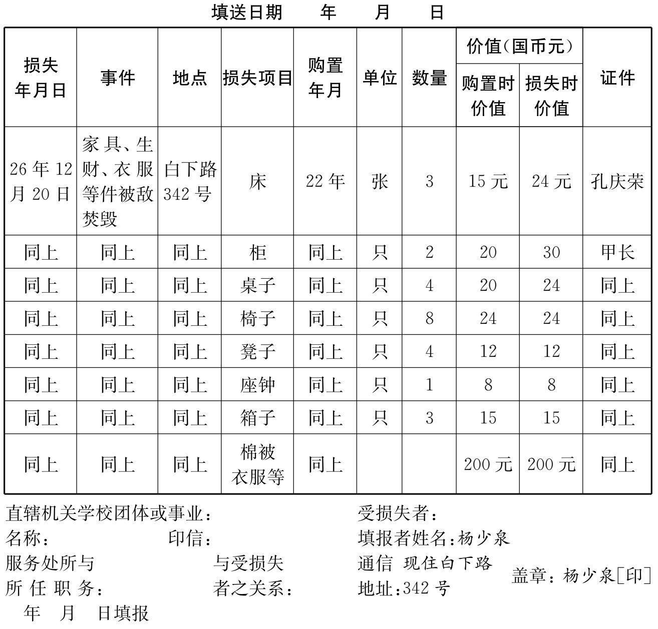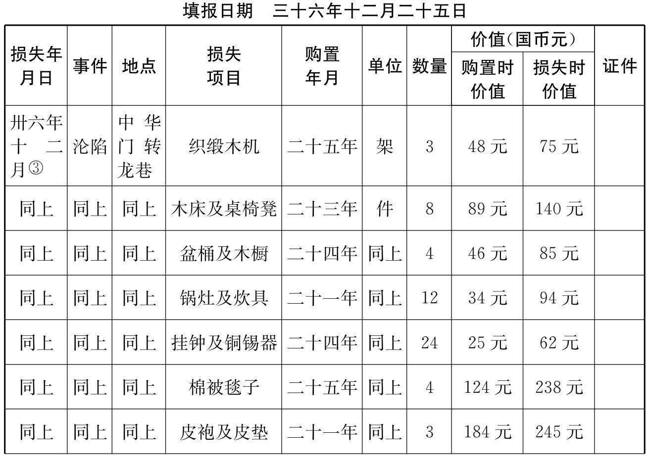 ② 本格及其上面几格填写位置可能有误,疑为“损失时价值”。原档如此。