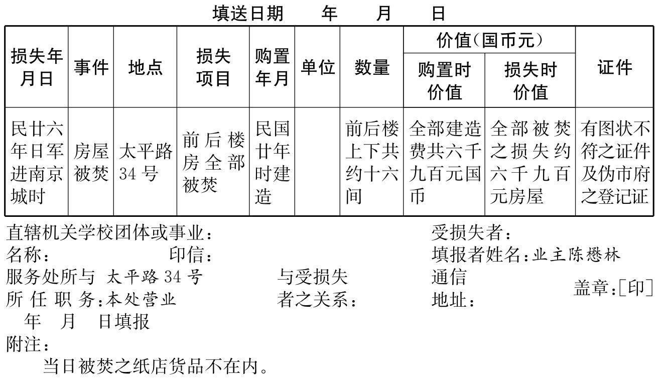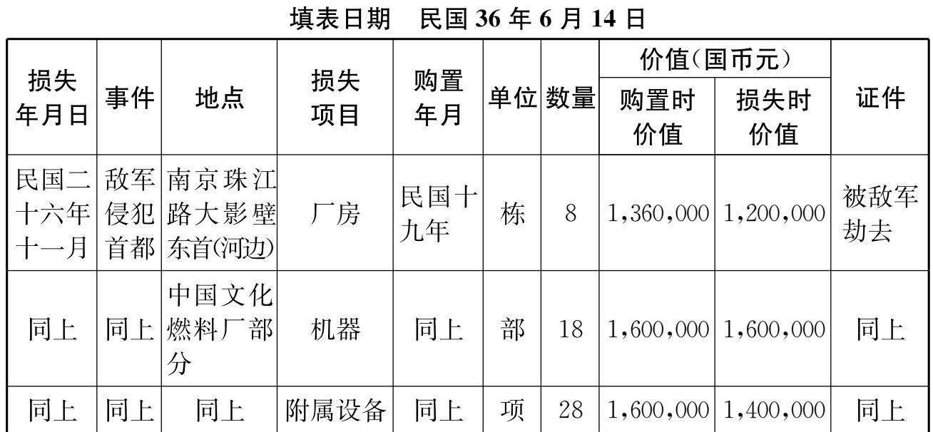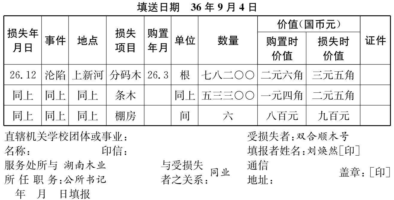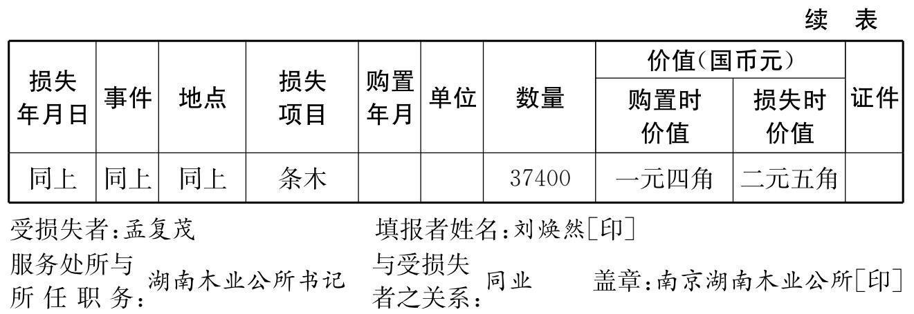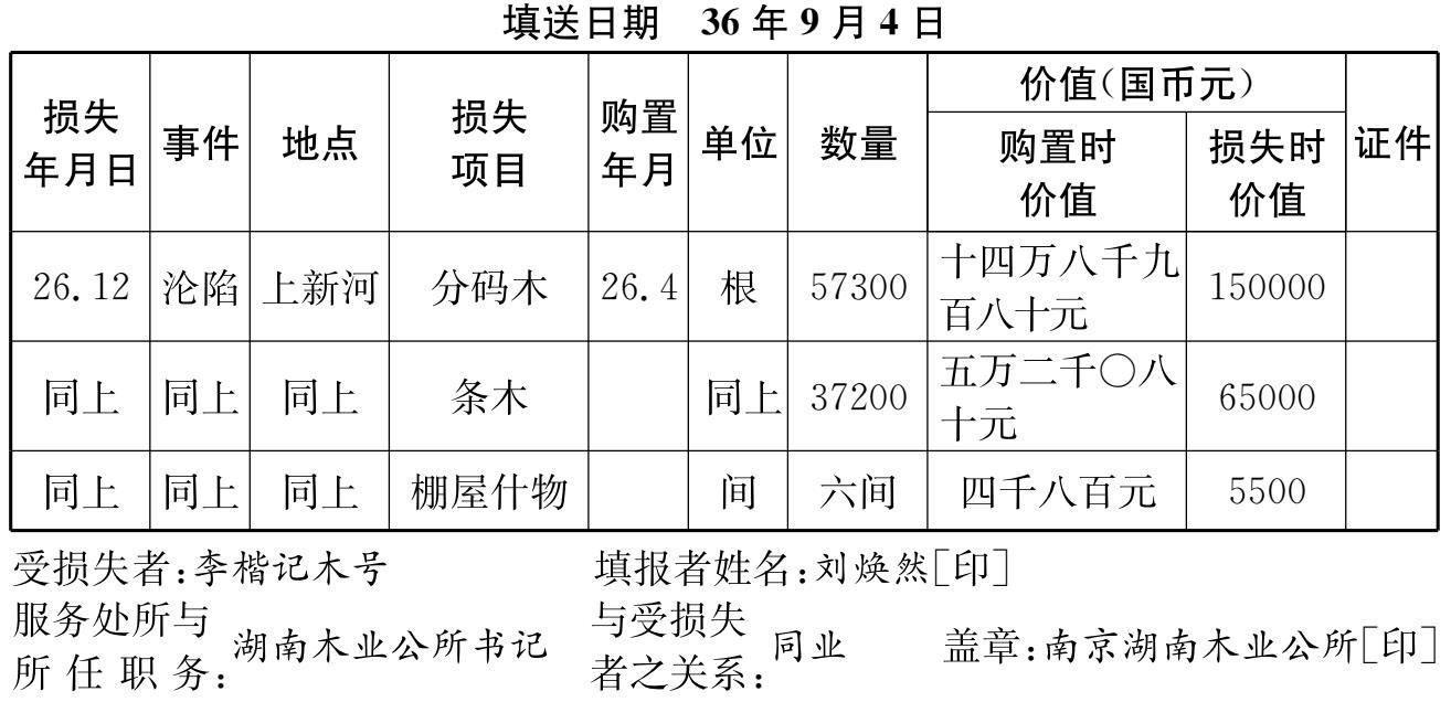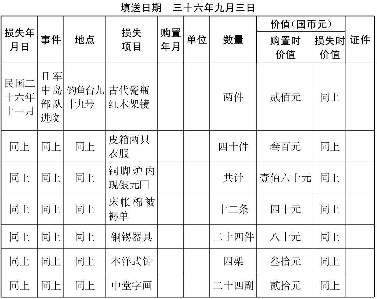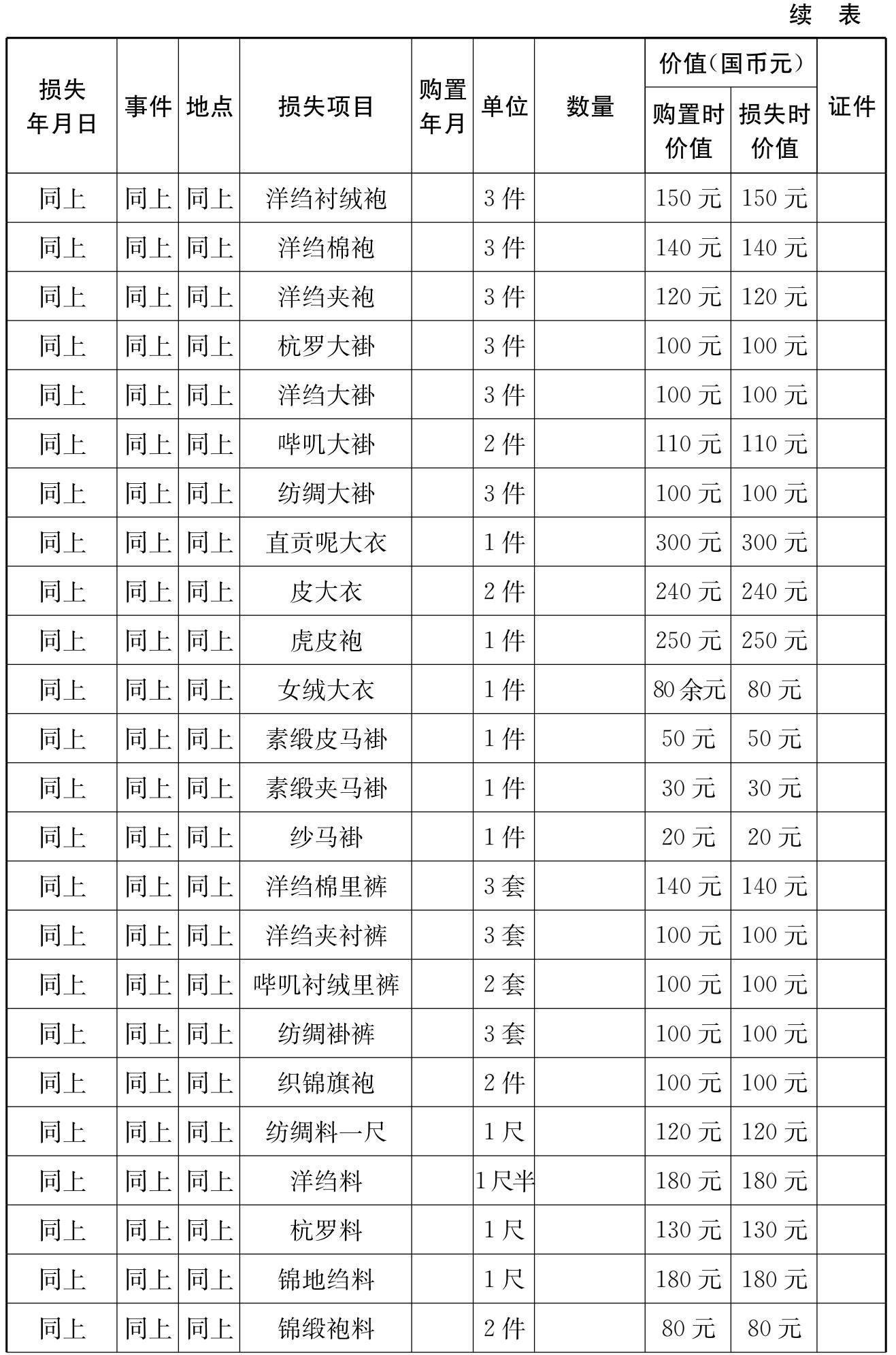 ② 本格及其上面几格填写位置可能有误,疑为“损失时价值”。原档如此。
