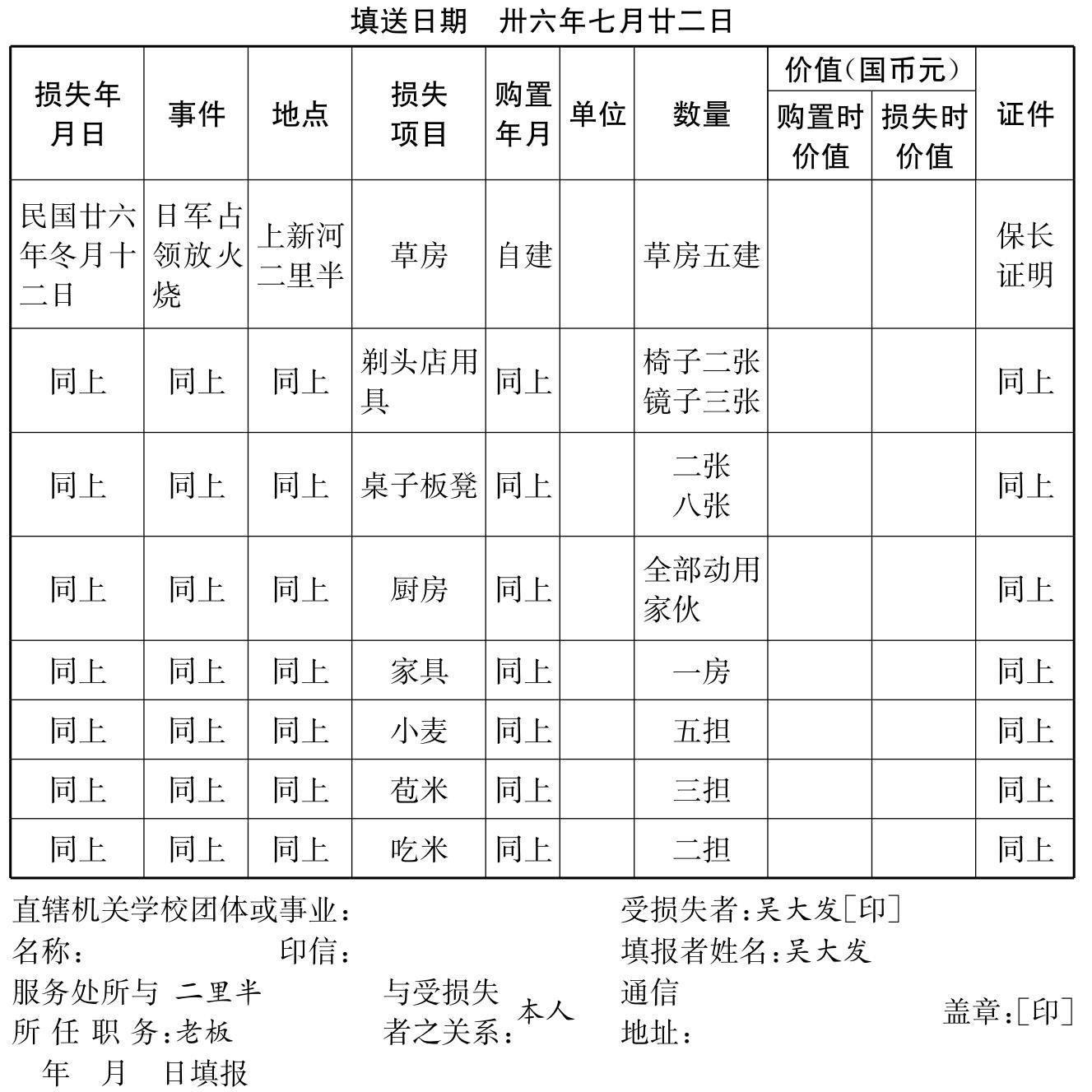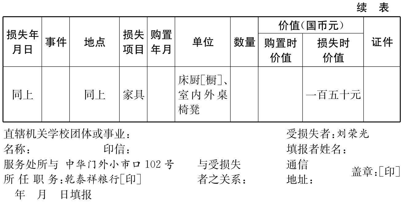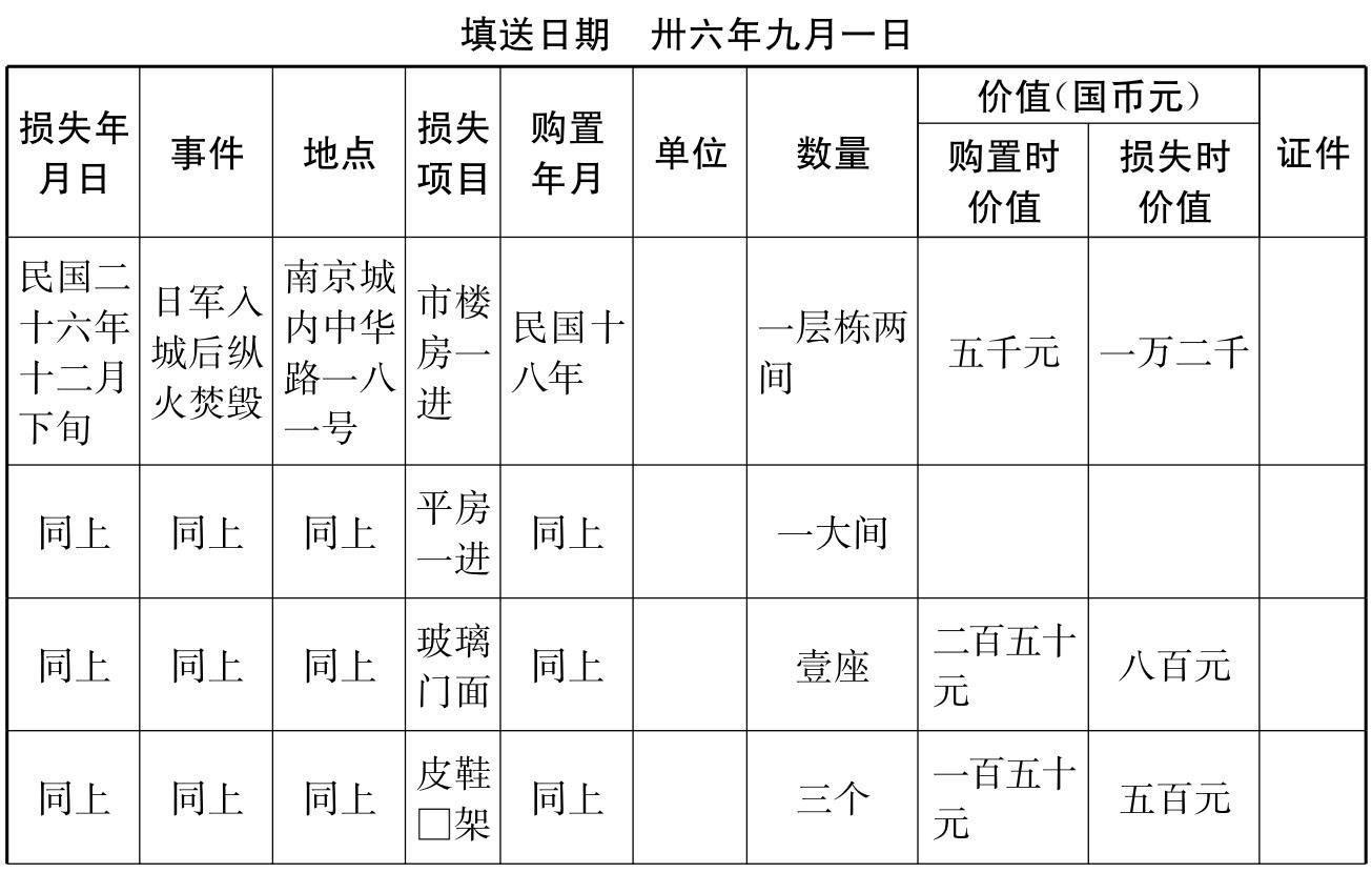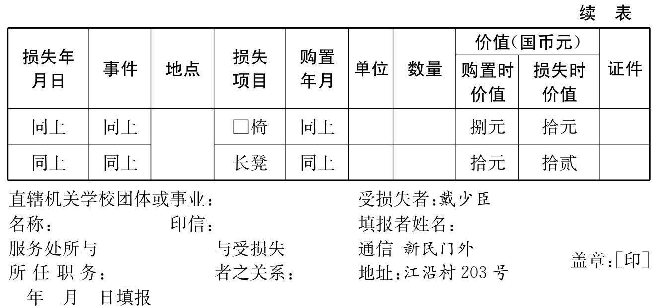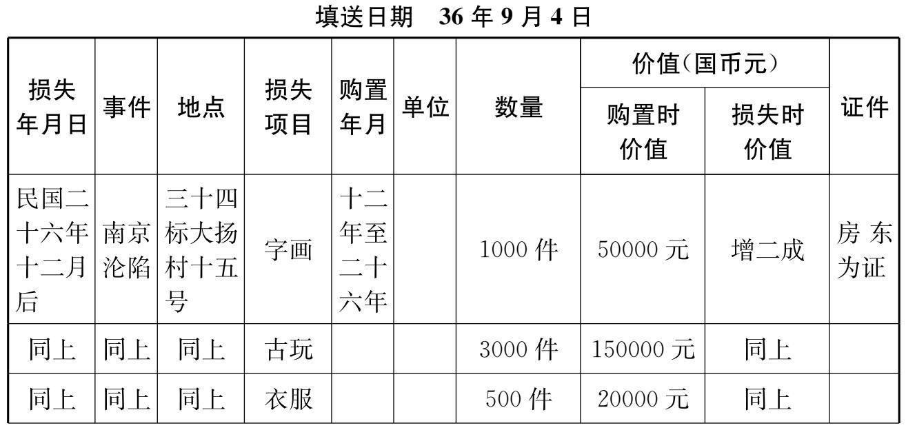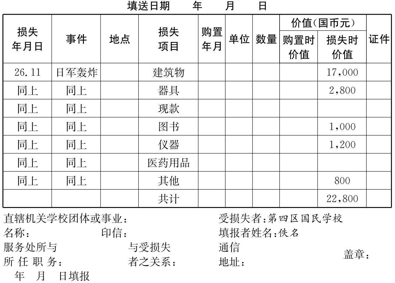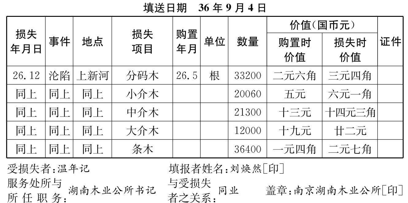 ② 本格及其上面几格填写位置可能有误,疑为“损失时价值”。原档如此。