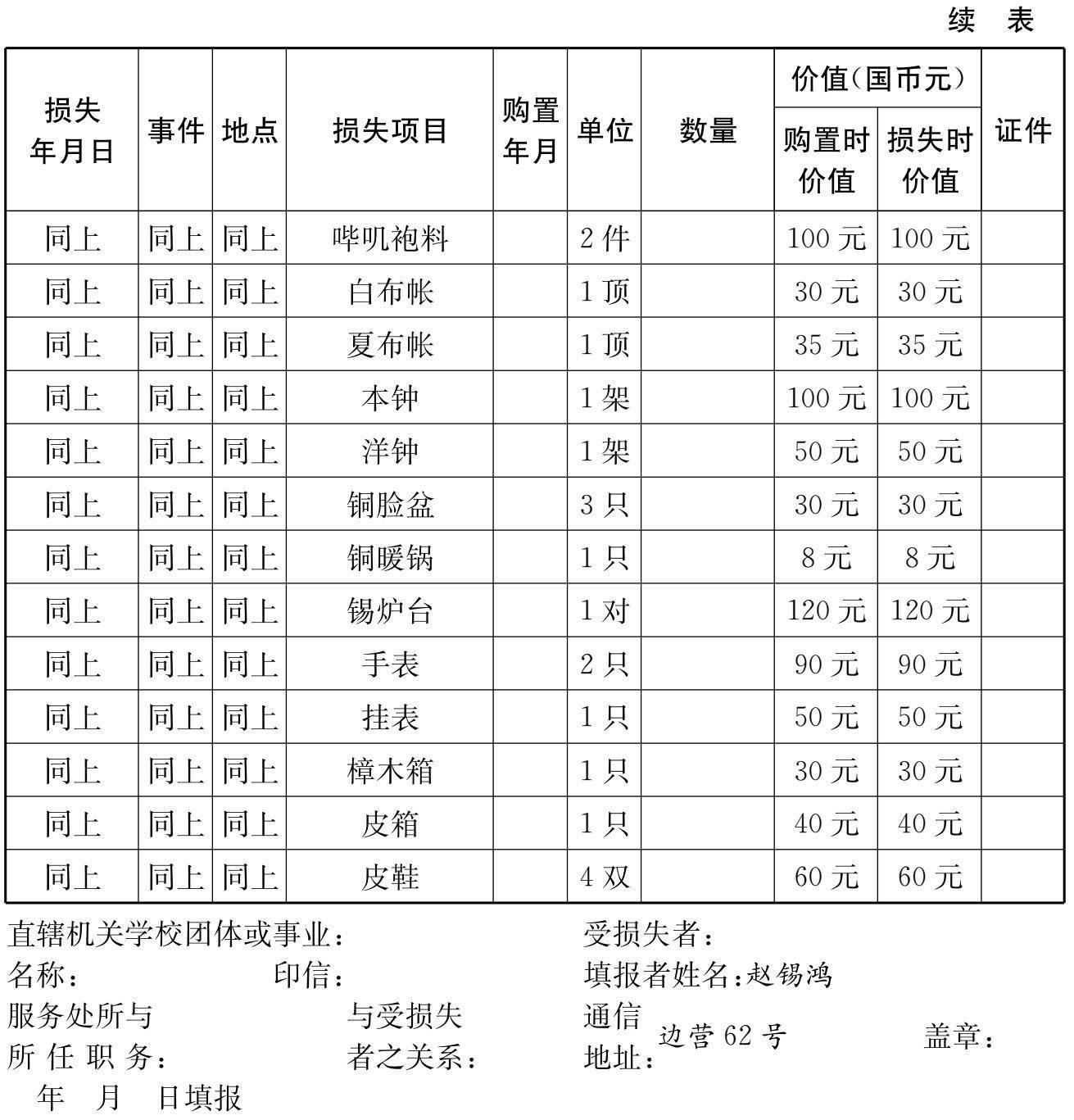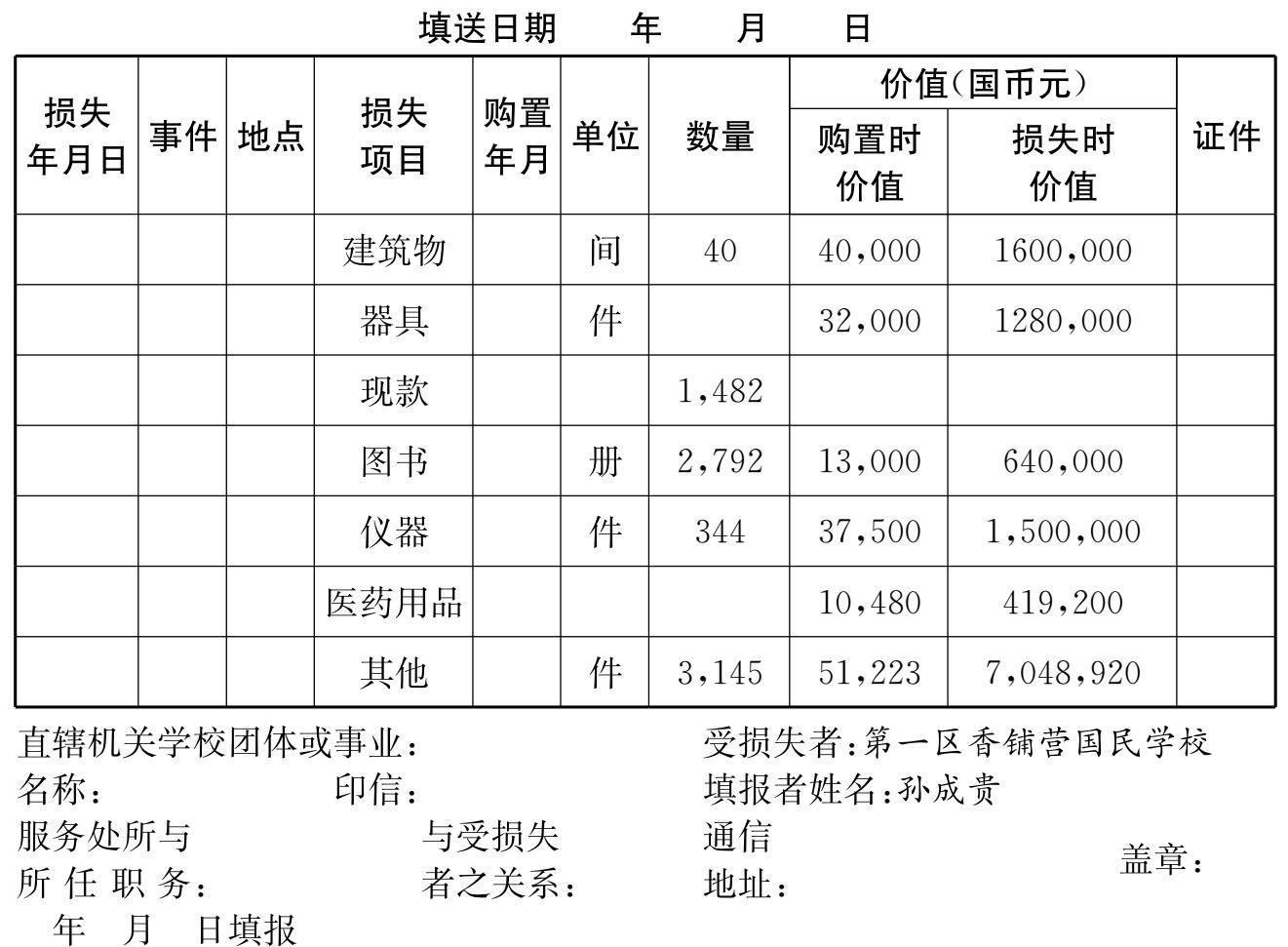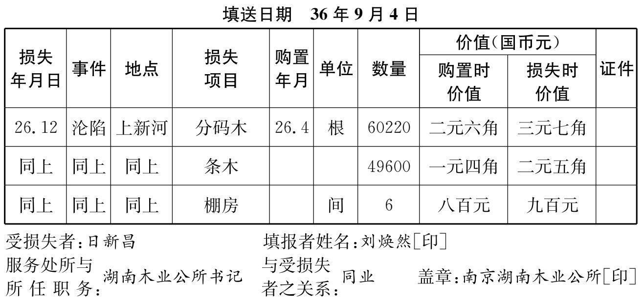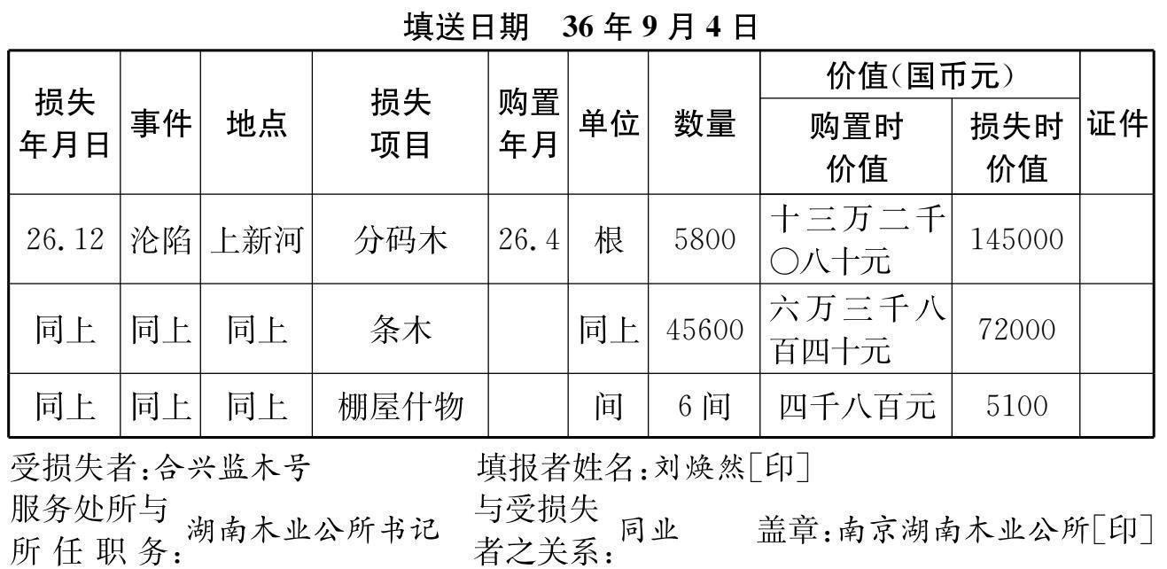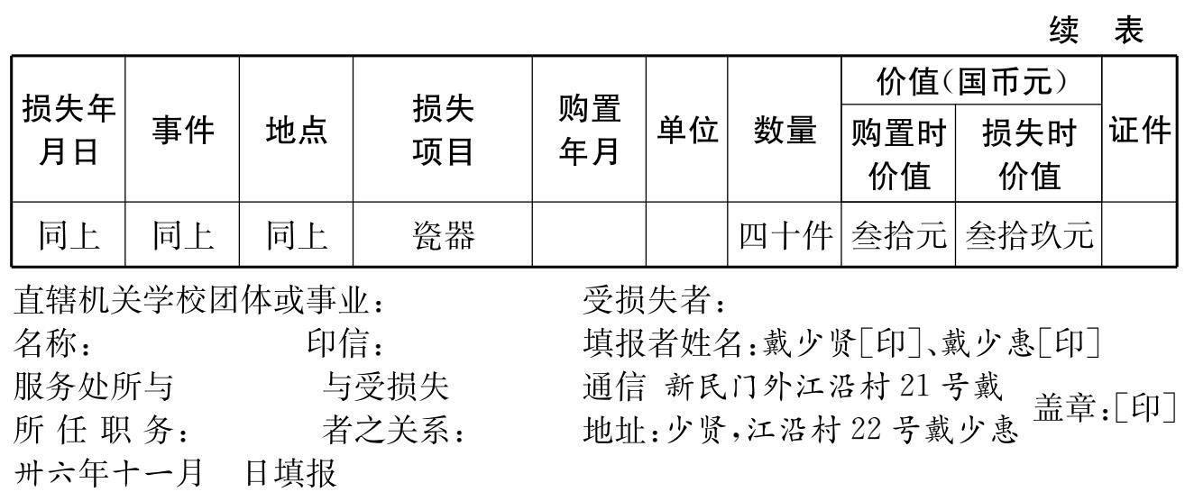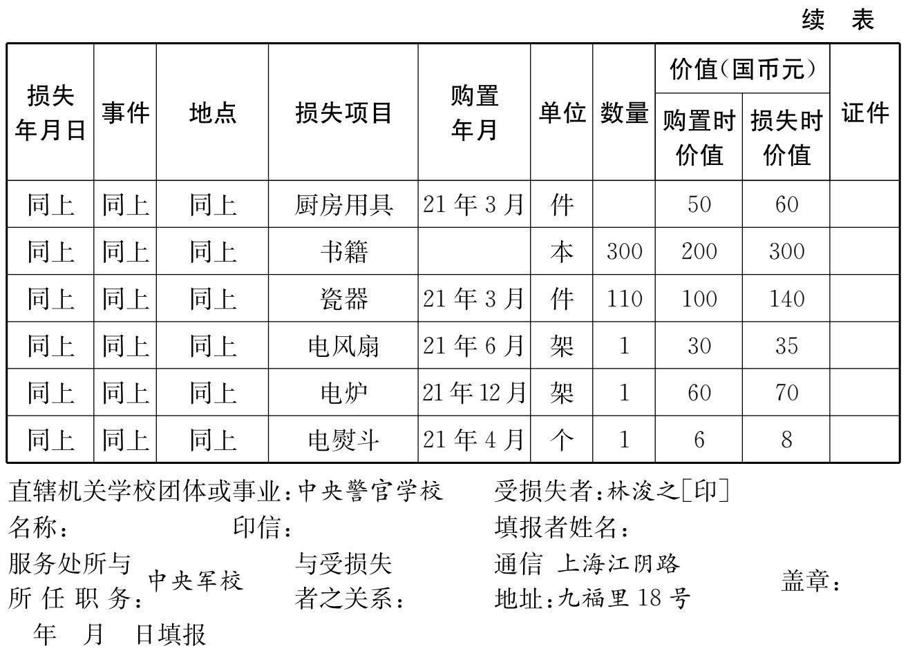 ② 本格及其上面几格填写位置可能有误,疑为“损失时价值”。原档如此。