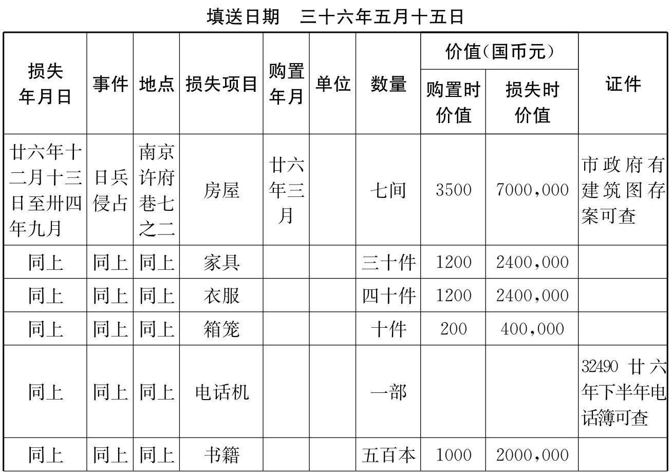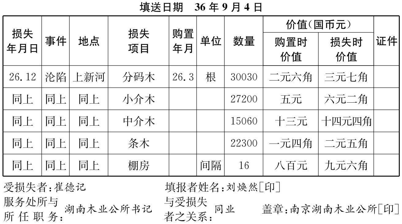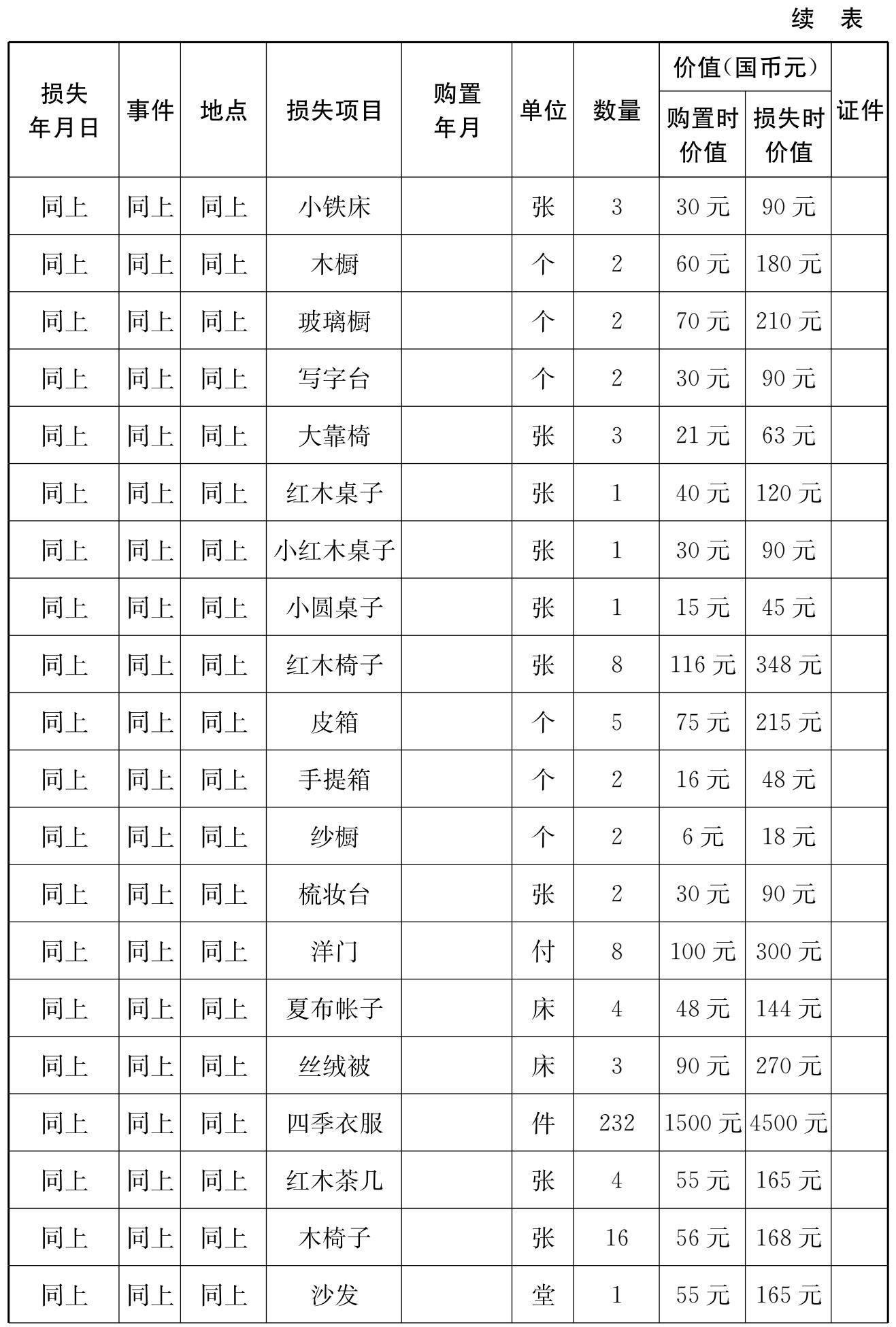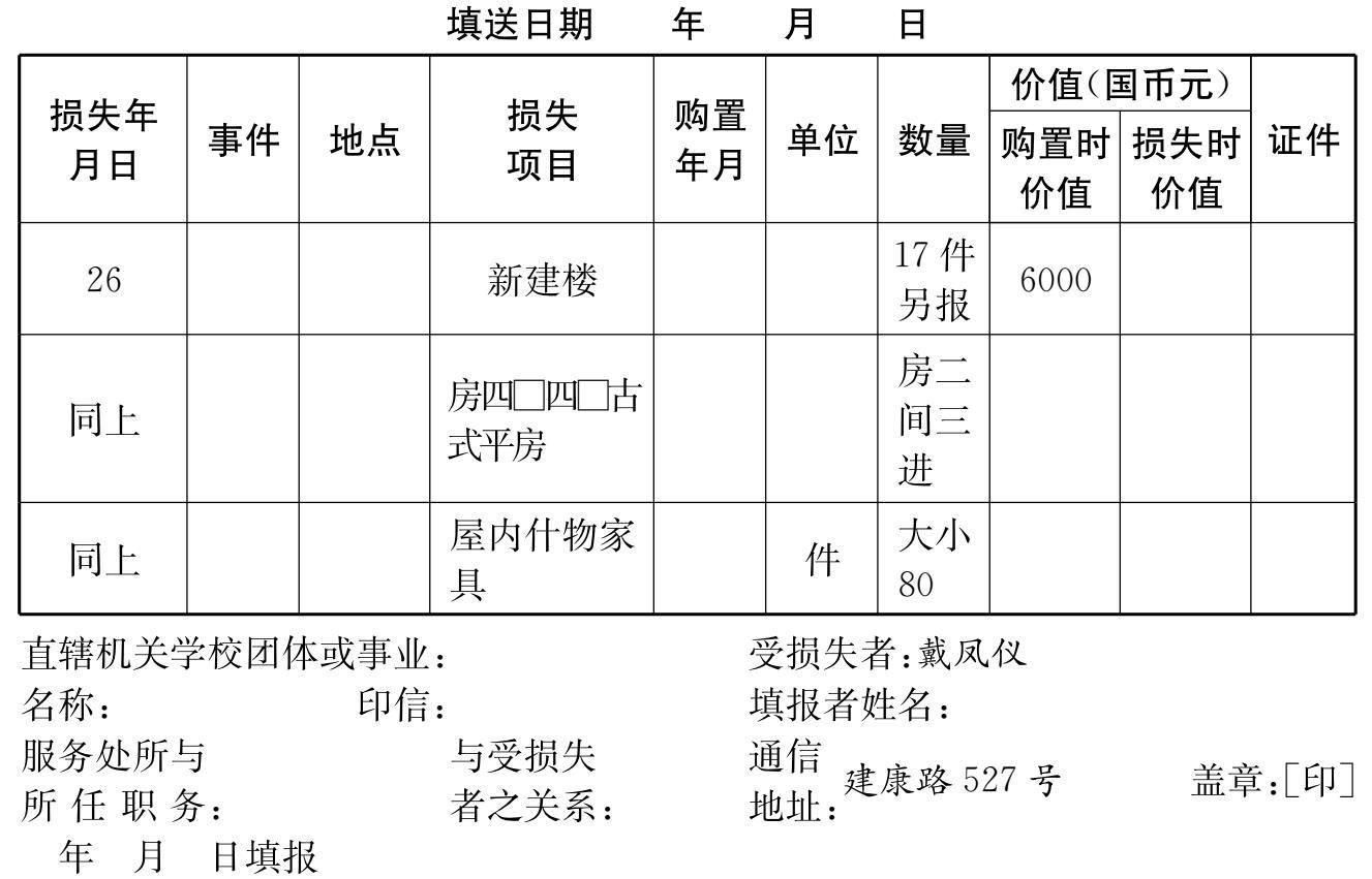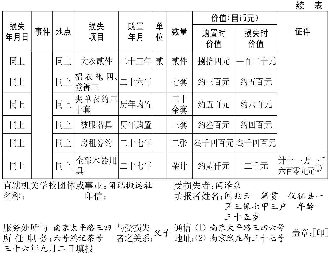 ② 本格及其上面几格填写位置可能有误,疑为“损失时价值”。原档如此。