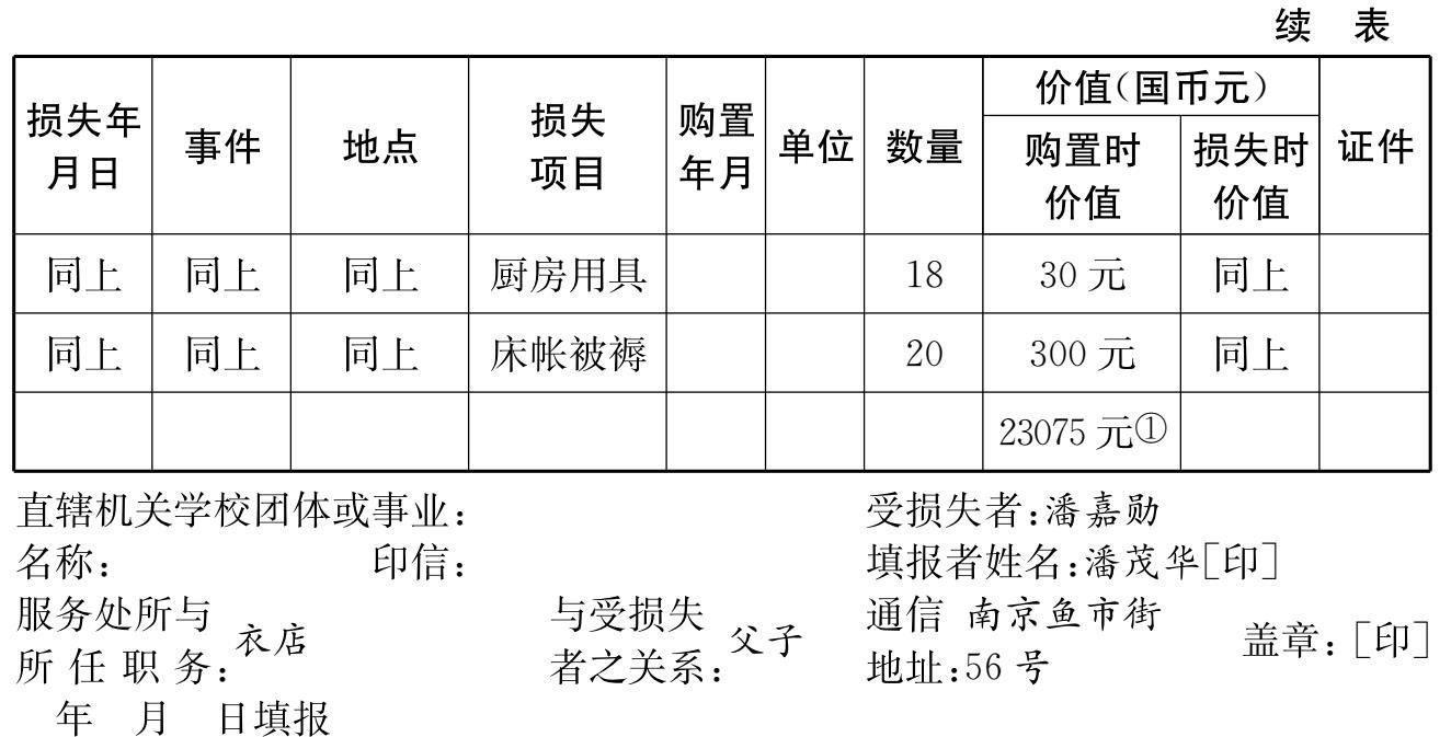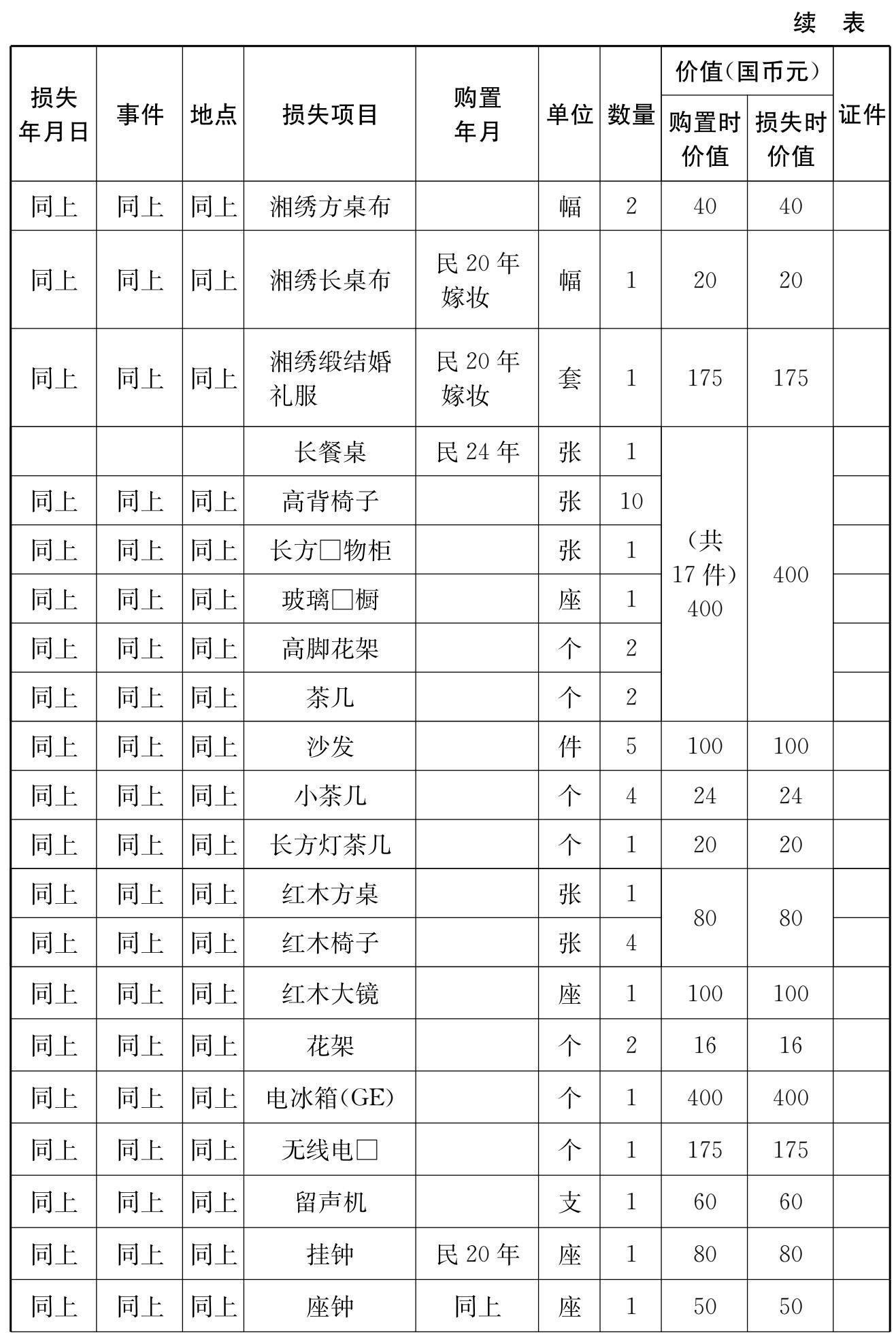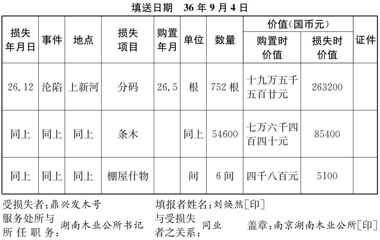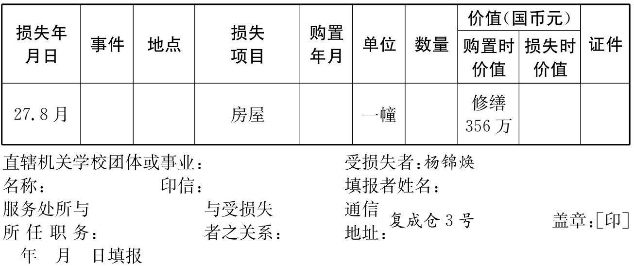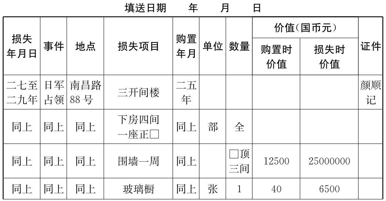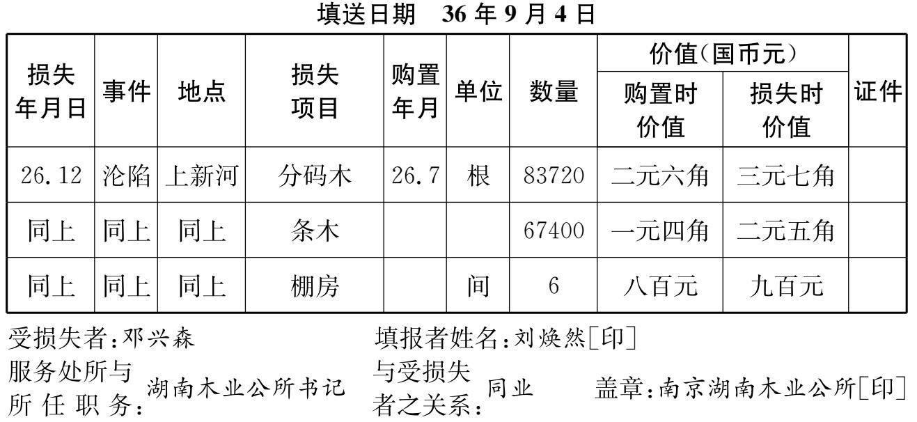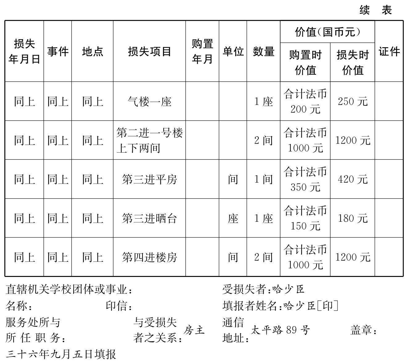 ② 本格及其上面几格填写位置可能有误,疑为“损失时价值”。原档如此。