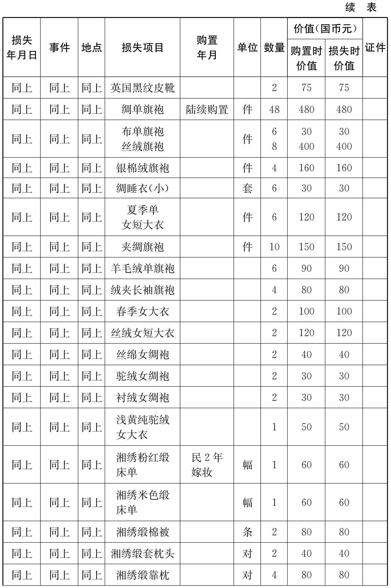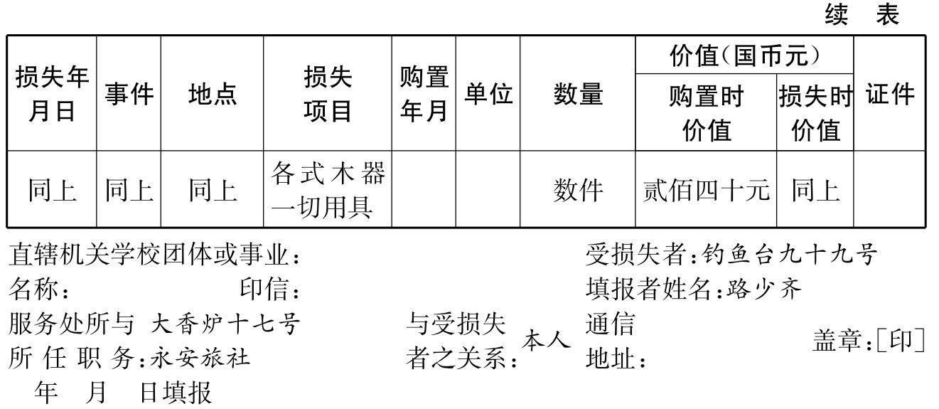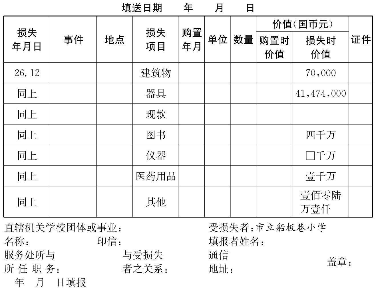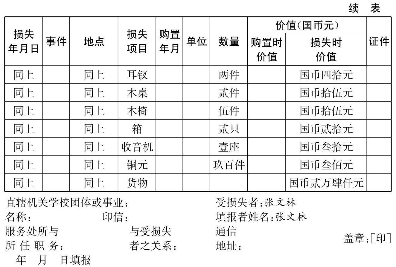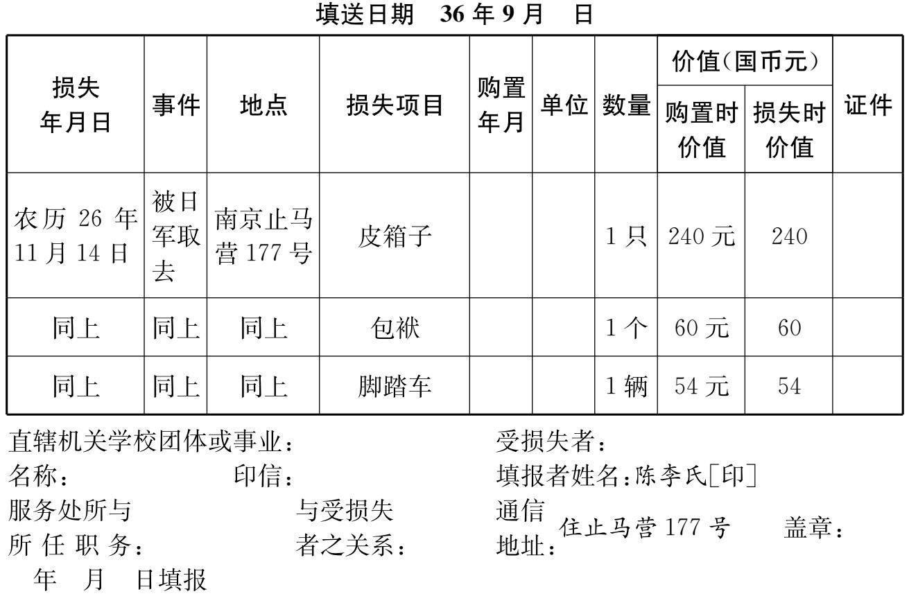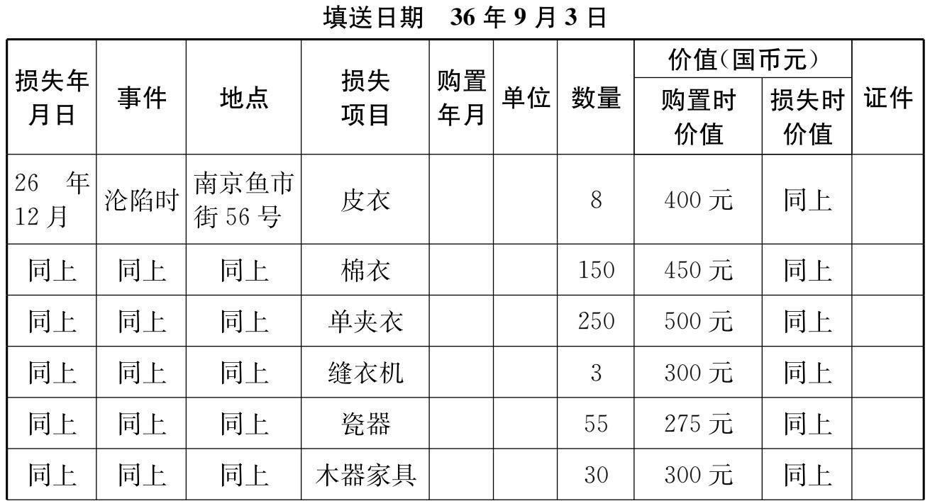 ② 本格及其上面几格填写位置可能有误,疑为“损失时价值”。原档如此。