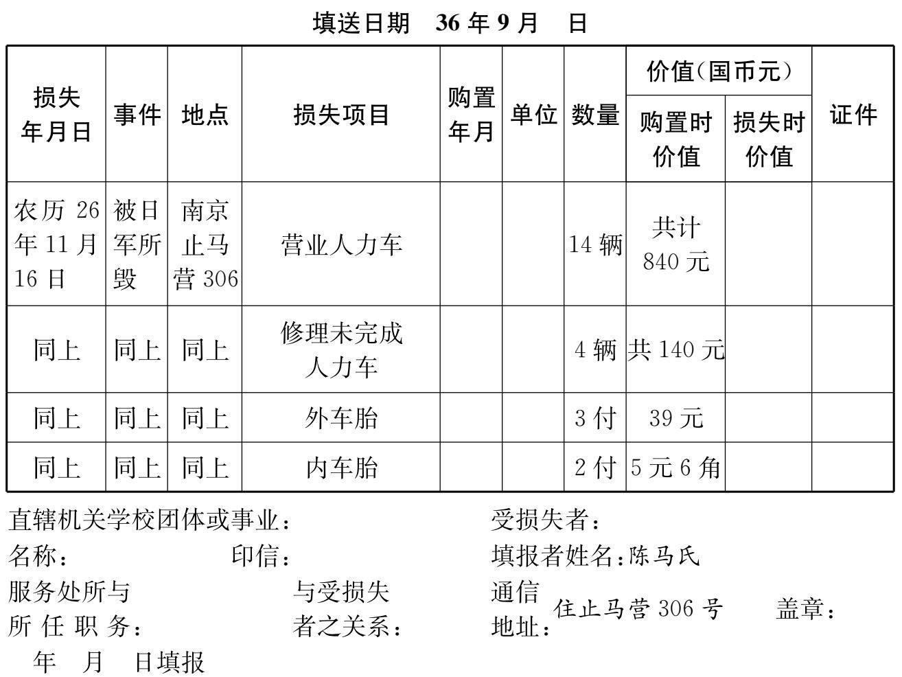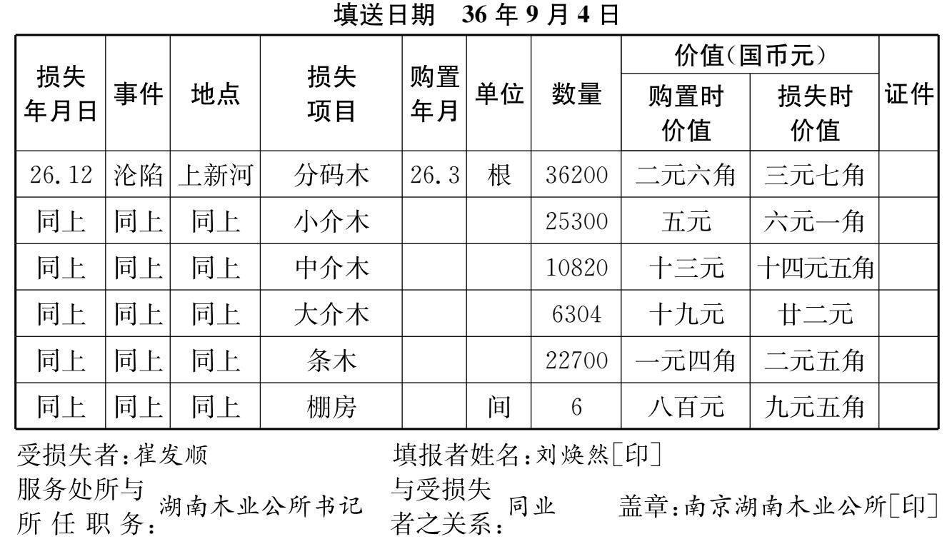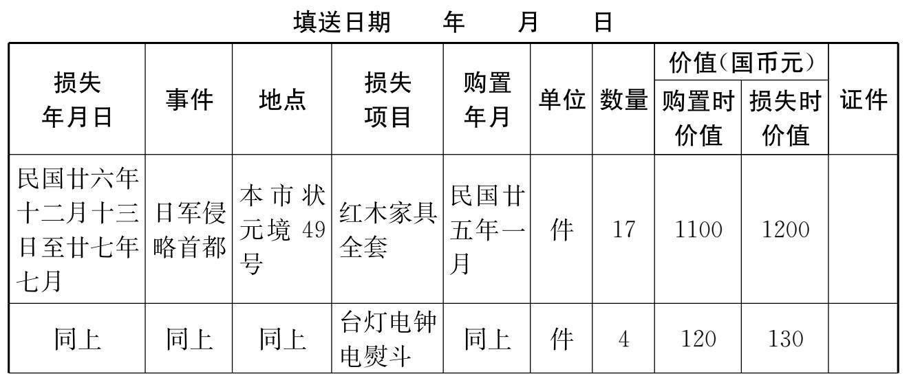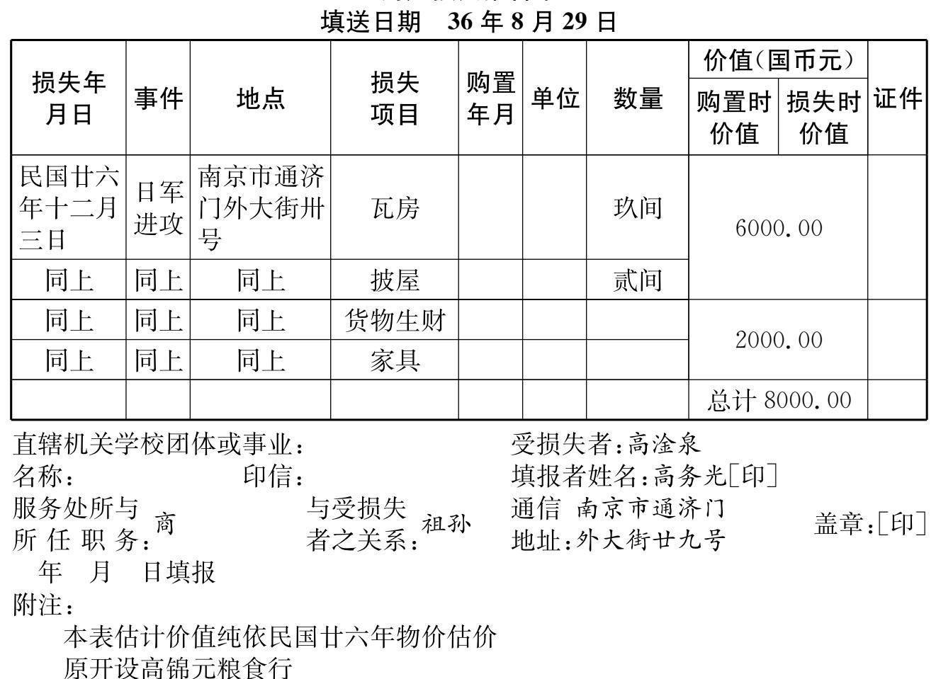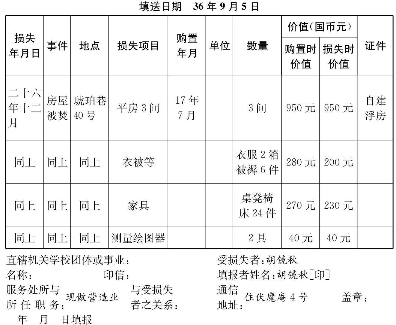 ② 本格及其上面几格填写位置可能有误,疑为“损失时价值”。原档如此。