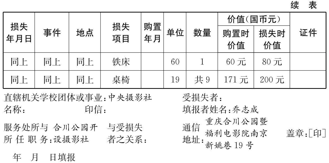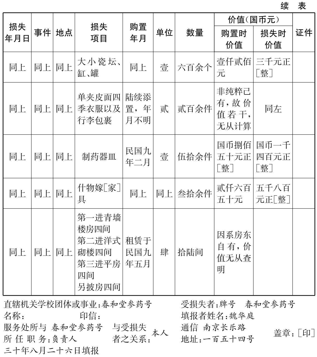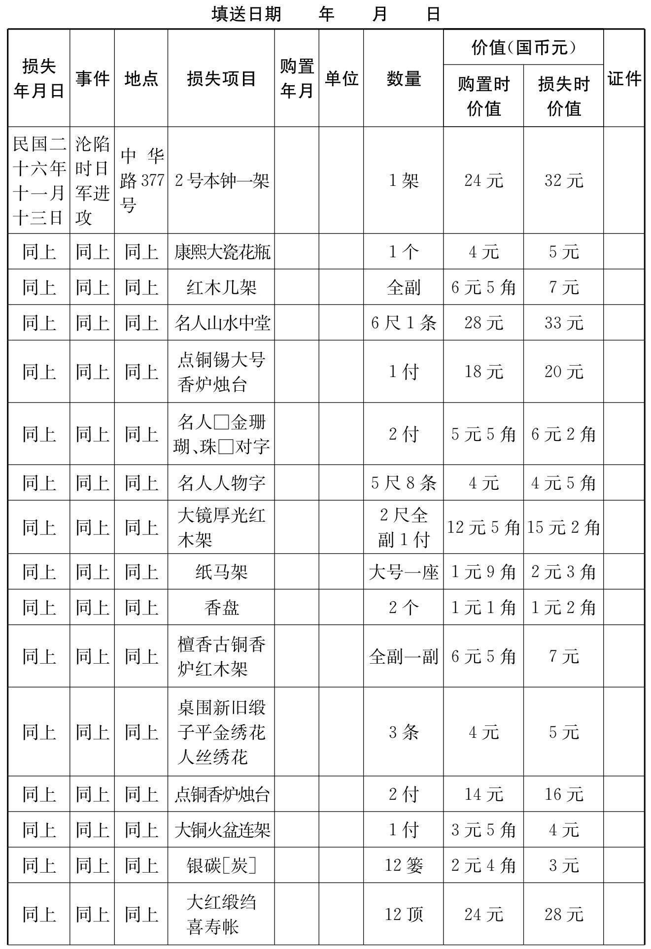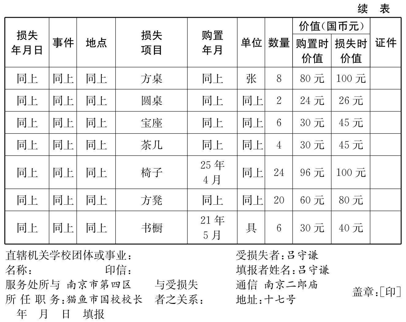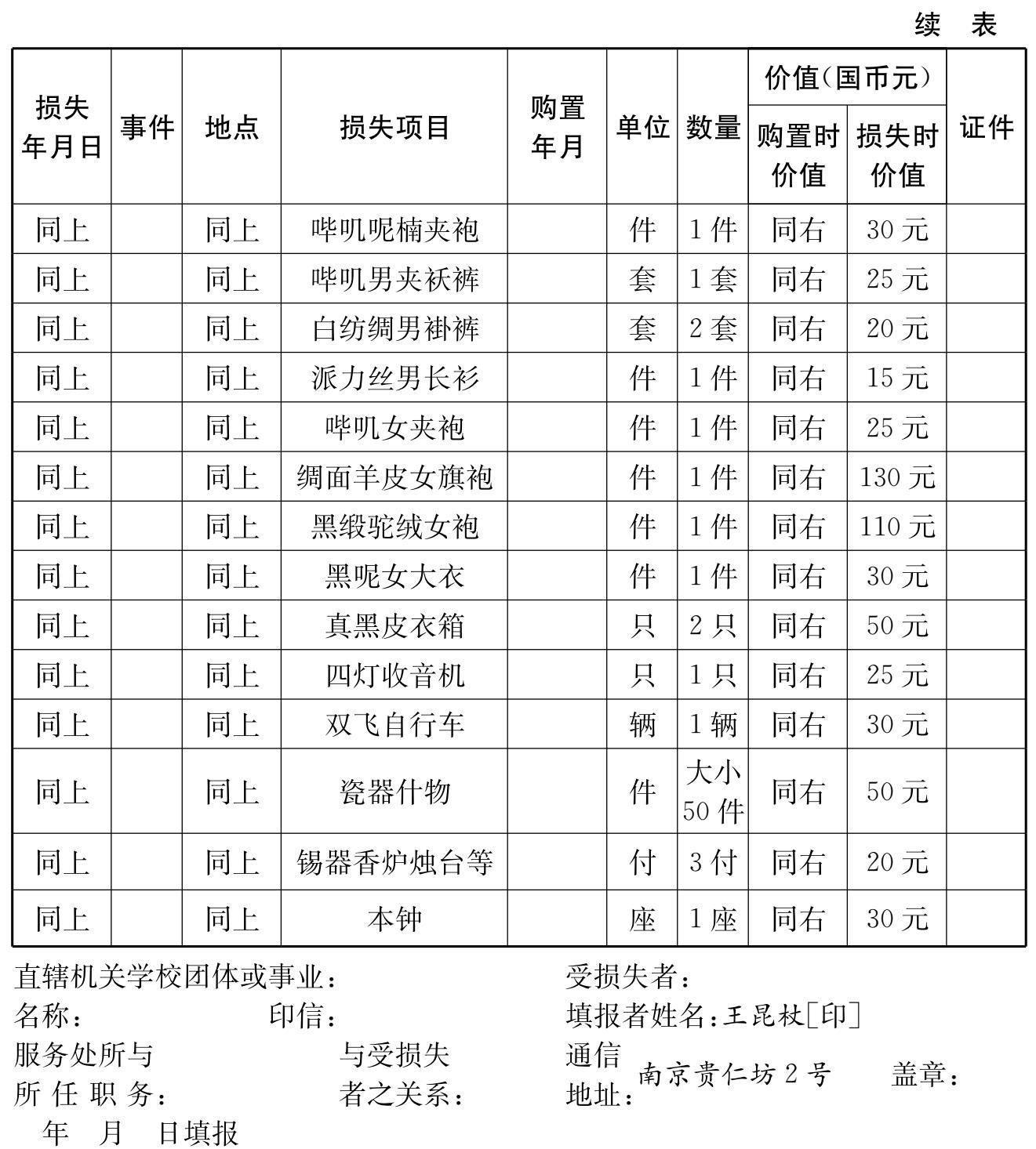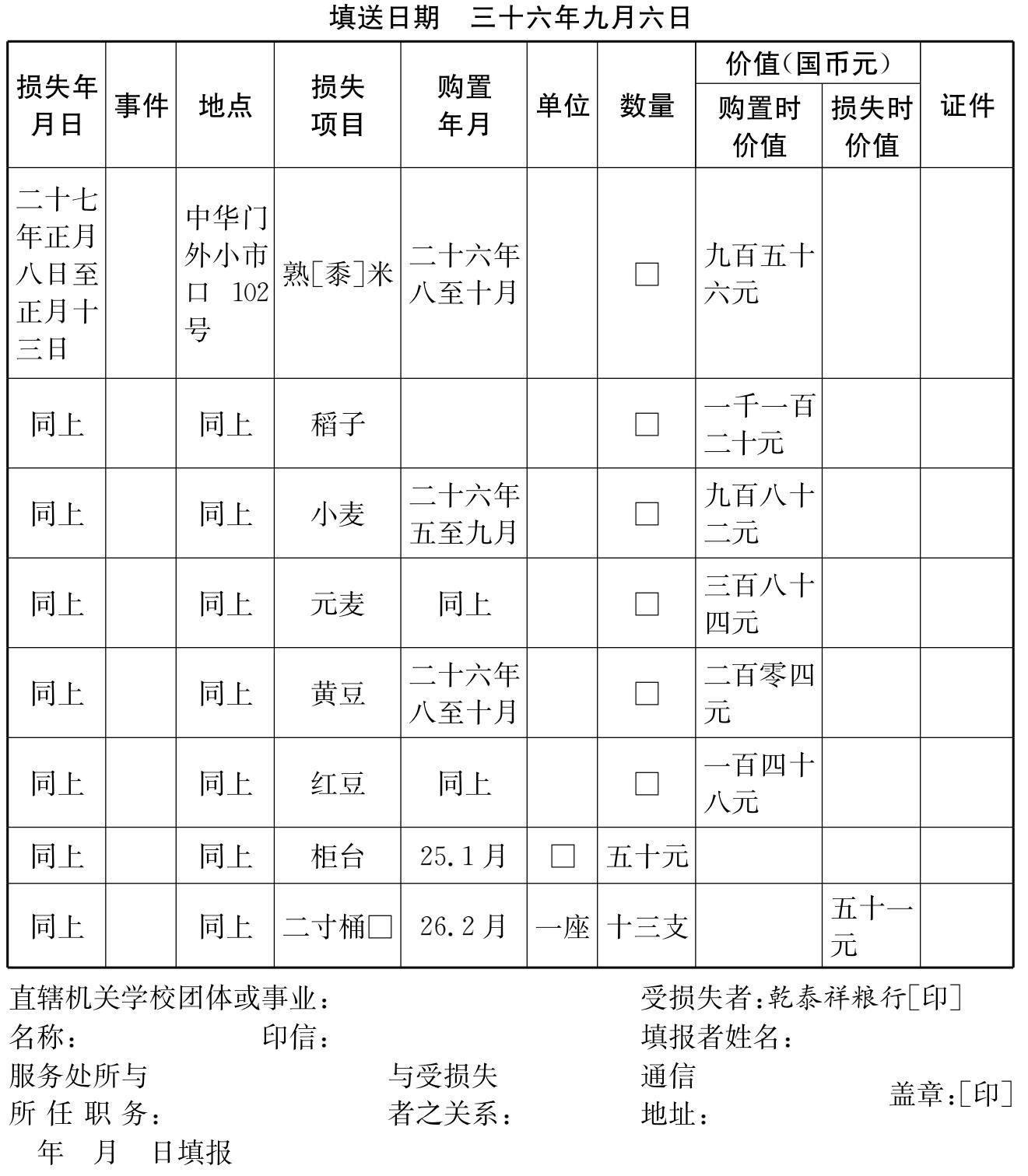 ② 本格及其上面几格填写位置可能有误,疑为“损失时价值”。原档如此。
