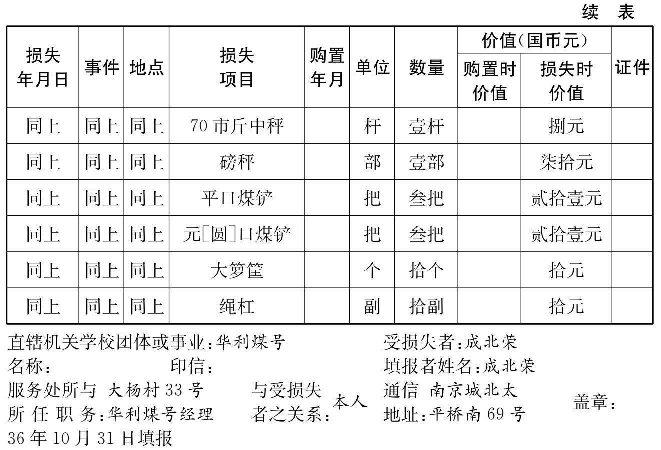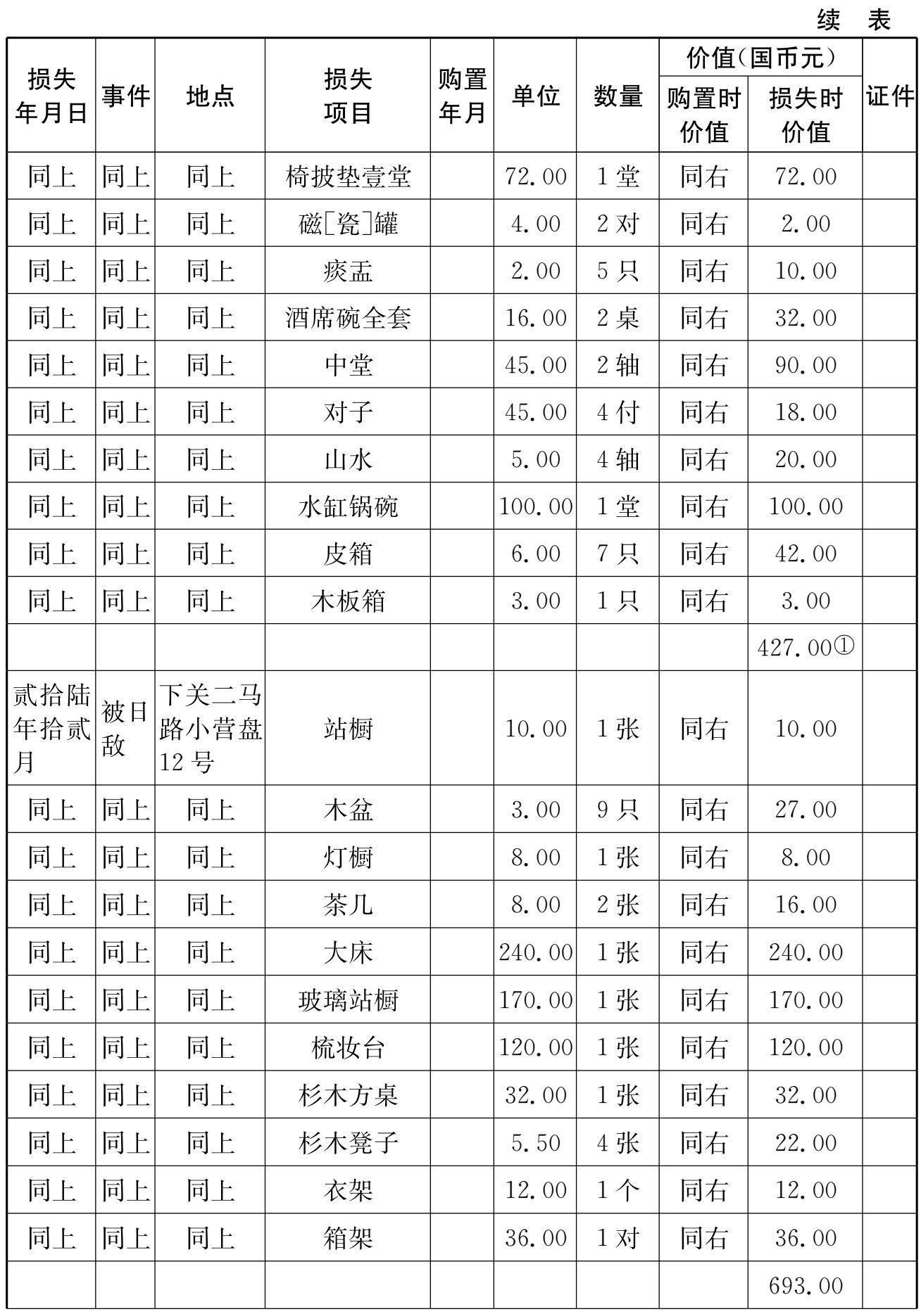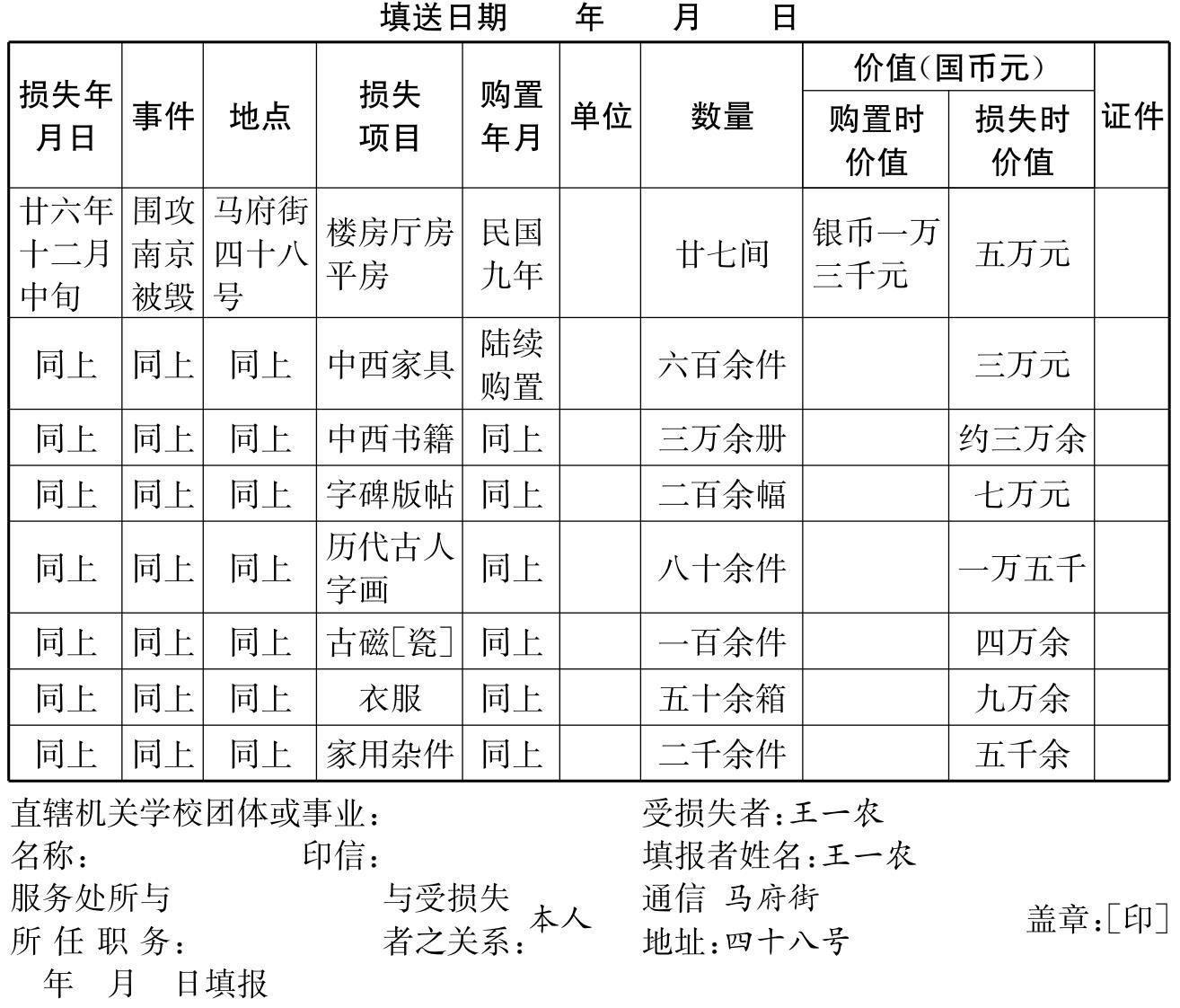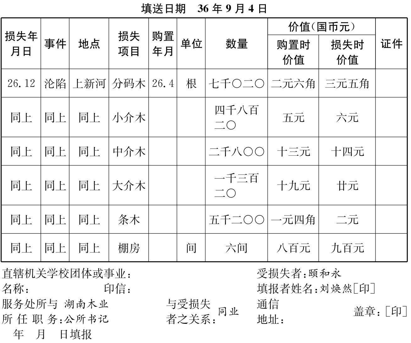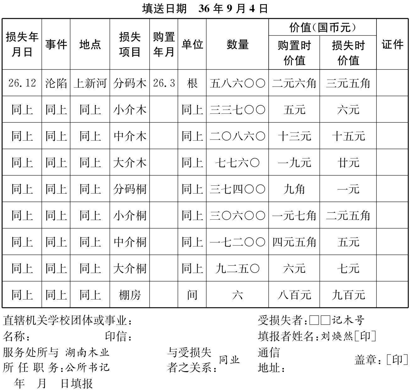 ② 本格及其上面几格填写位置可能有误,疑为“损失时价值”。原档如此。