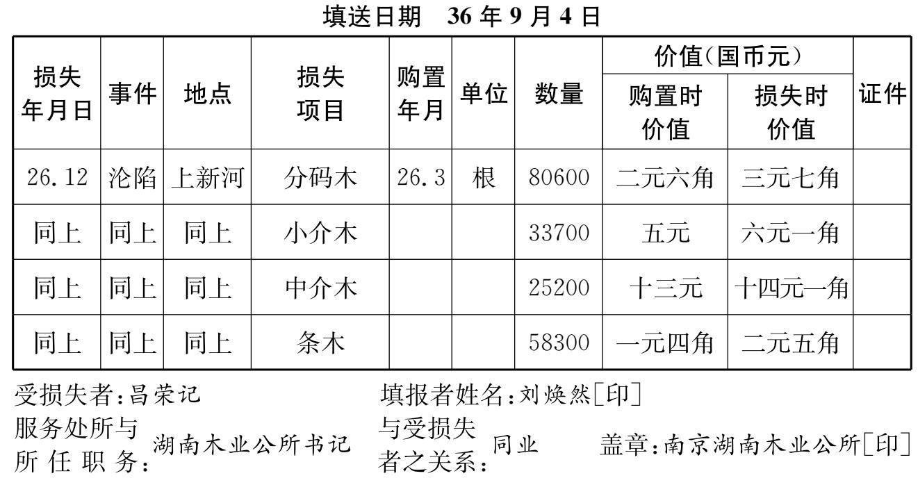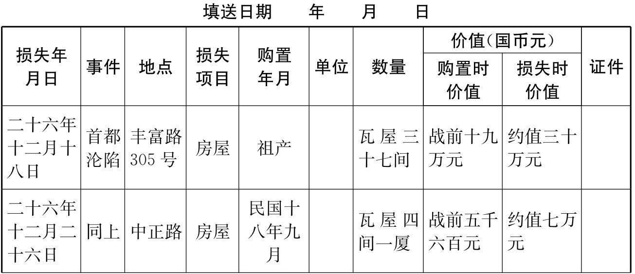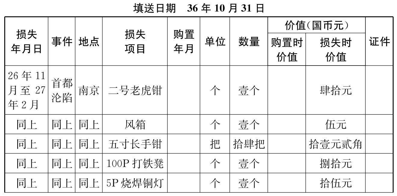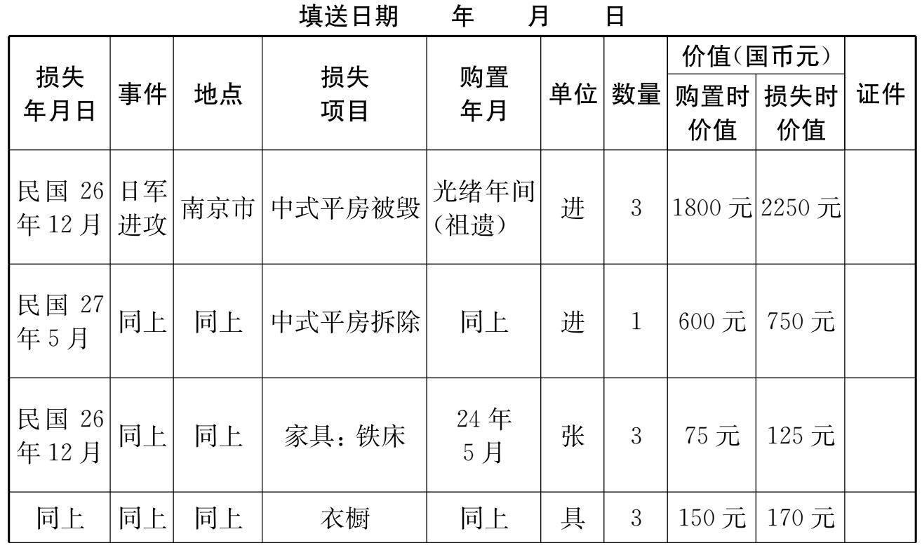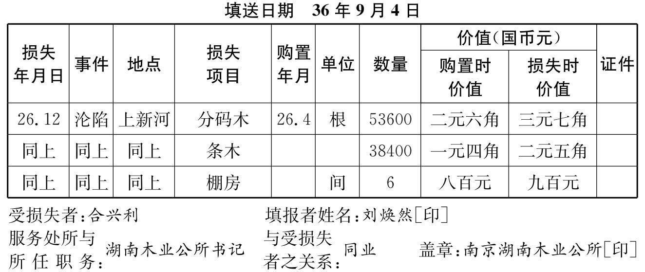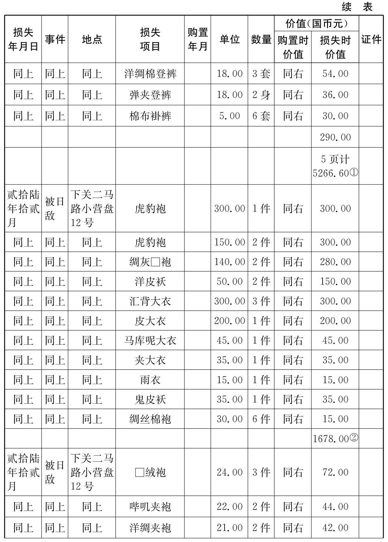 ② 本格及其上面几格填写位置可能有误,疑为“损失时价值”。原档如此。