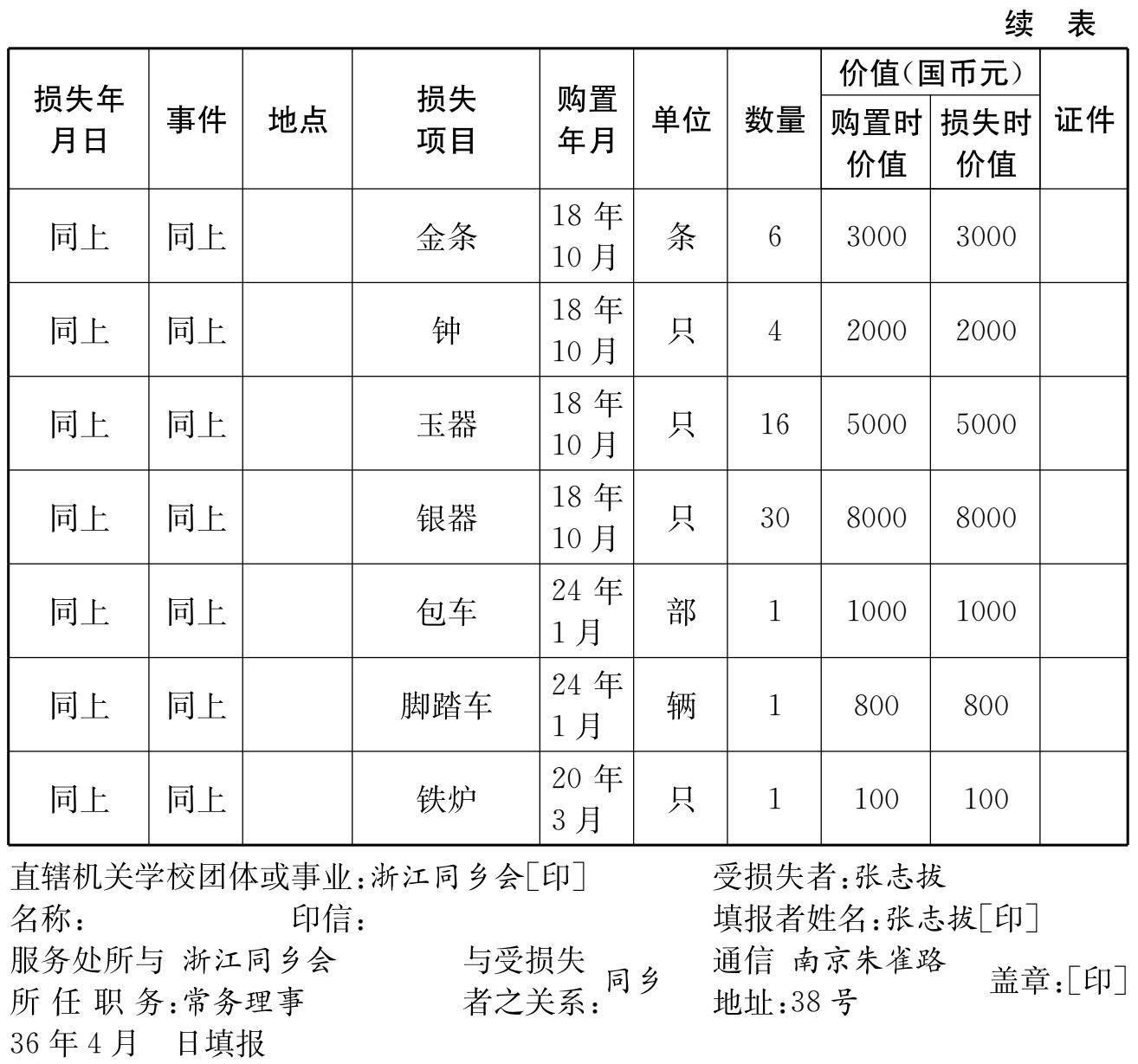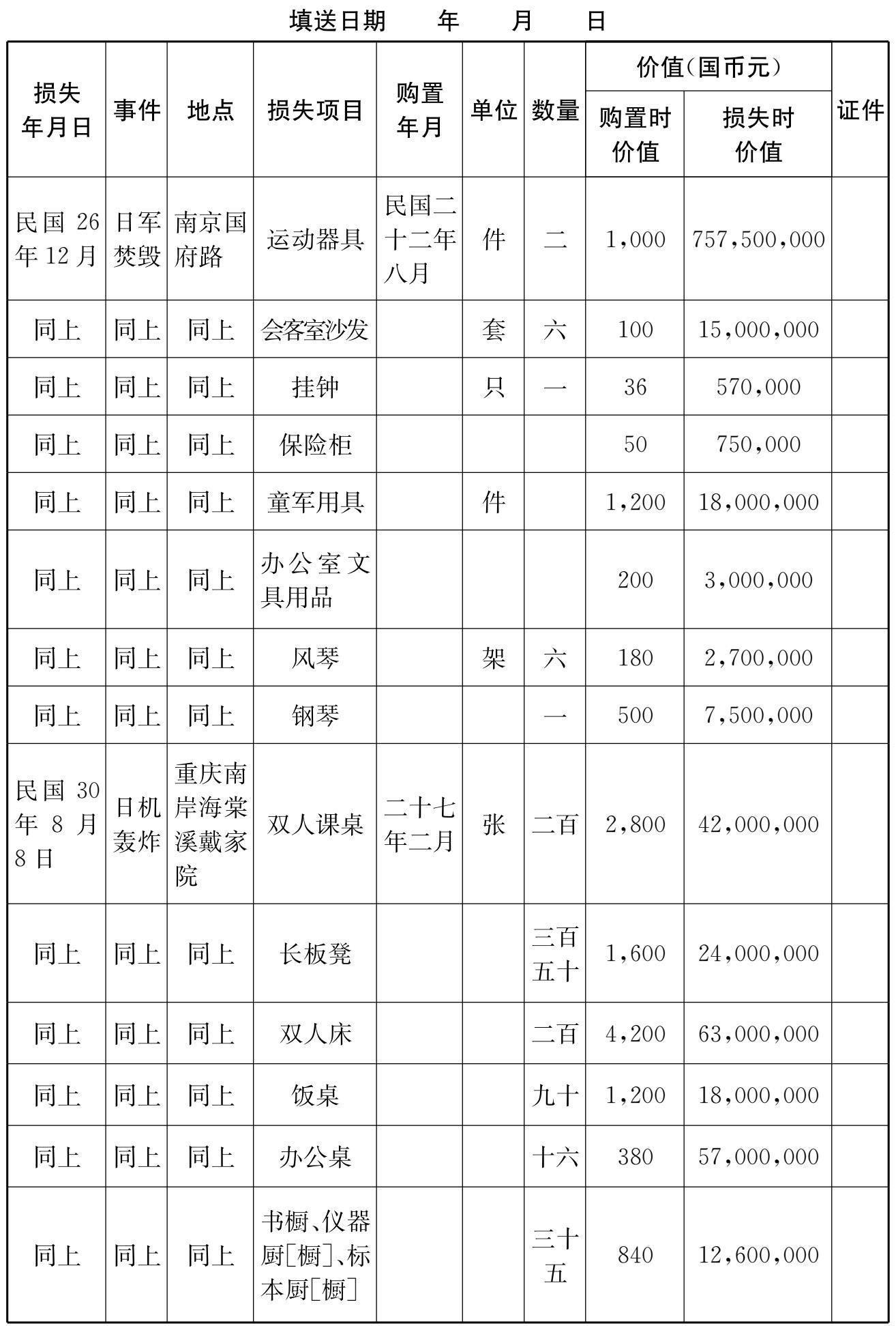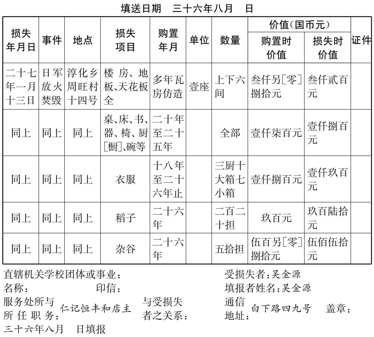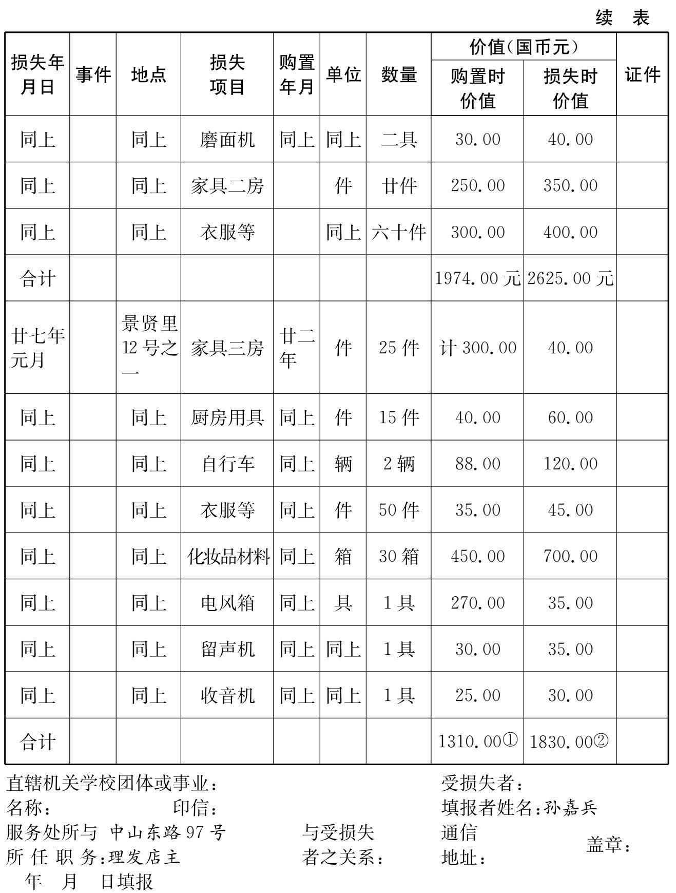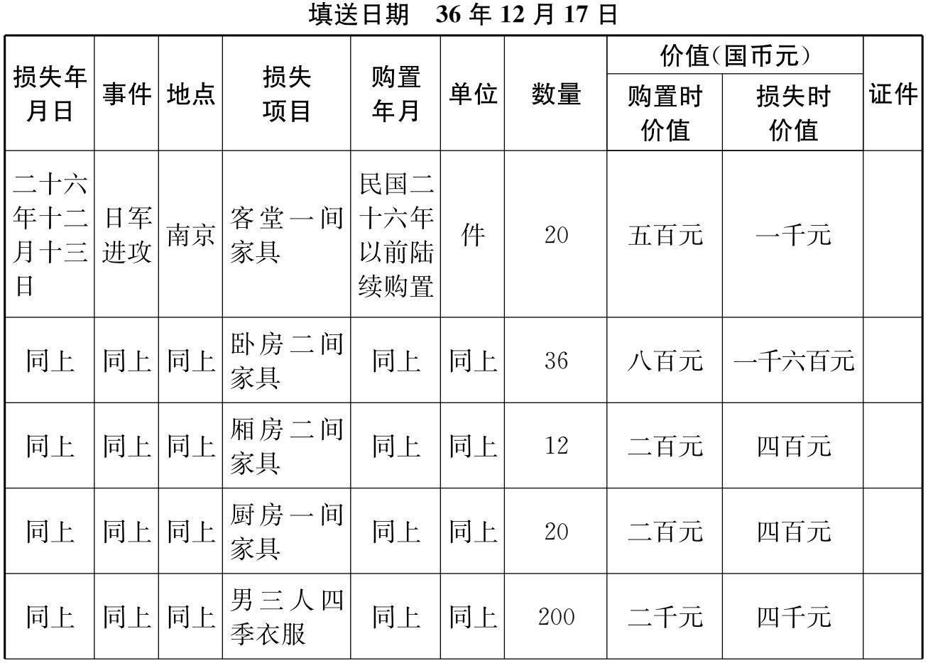 ② 本格及其上面几格填写位置可能有误,疑为“损失时价值”。原档如此。
