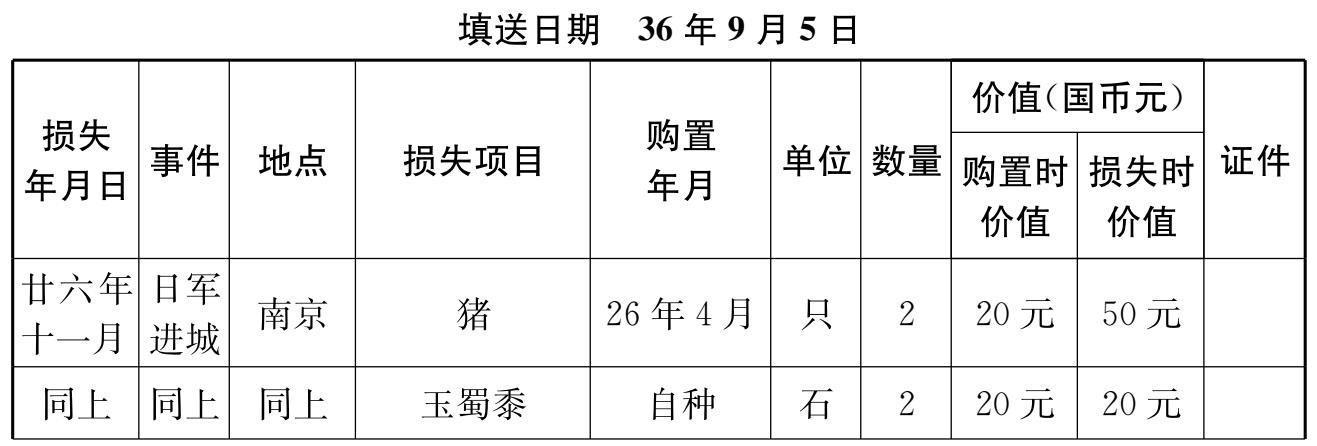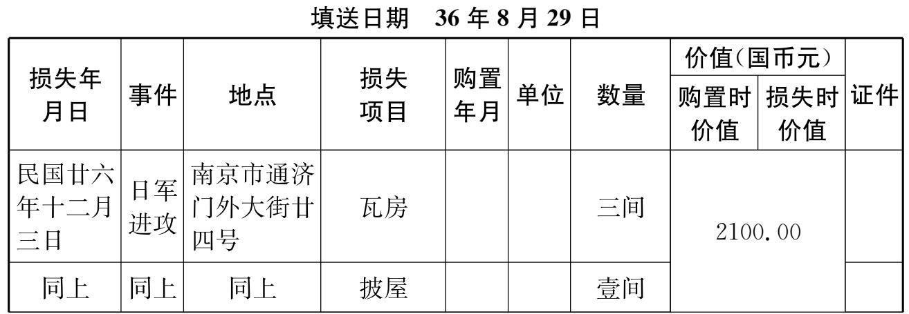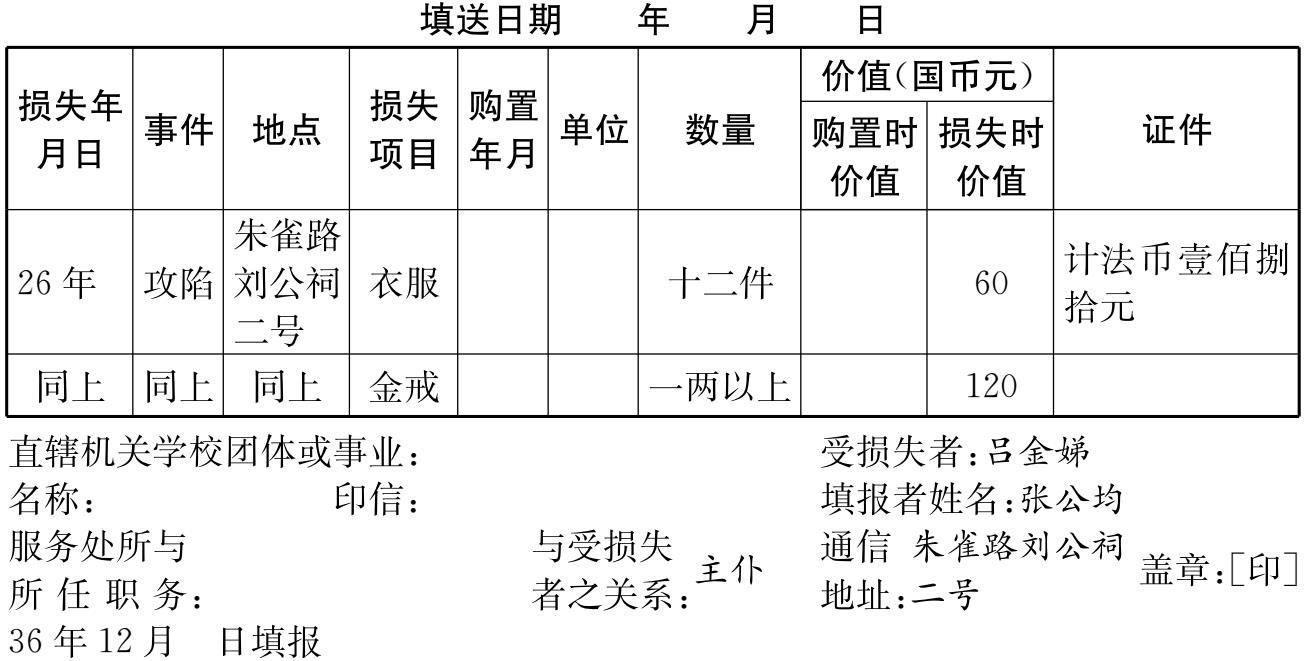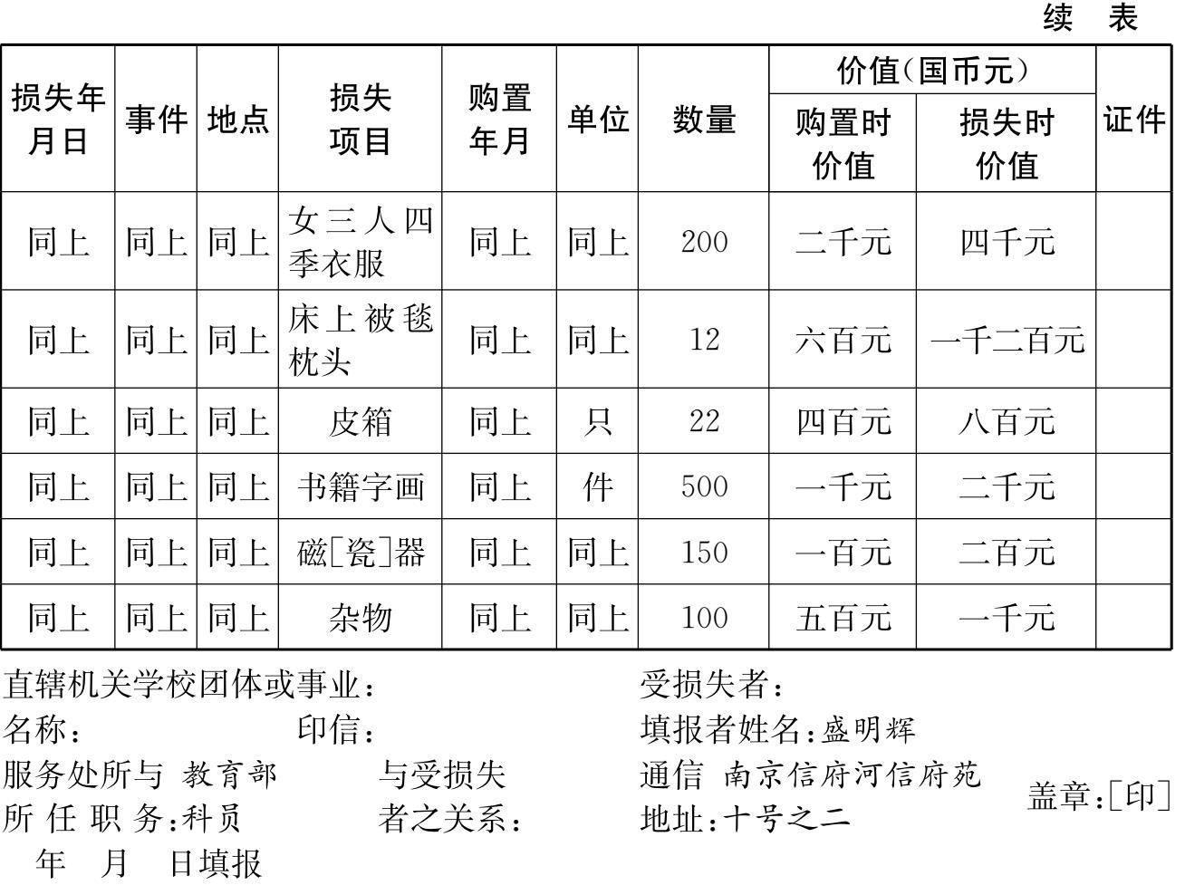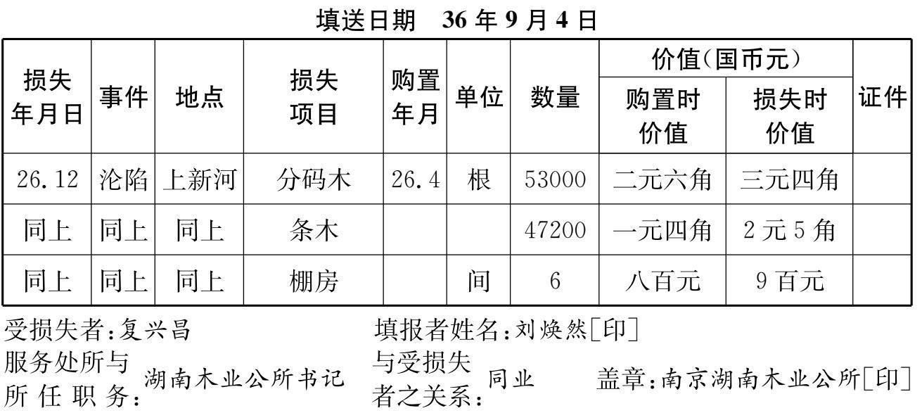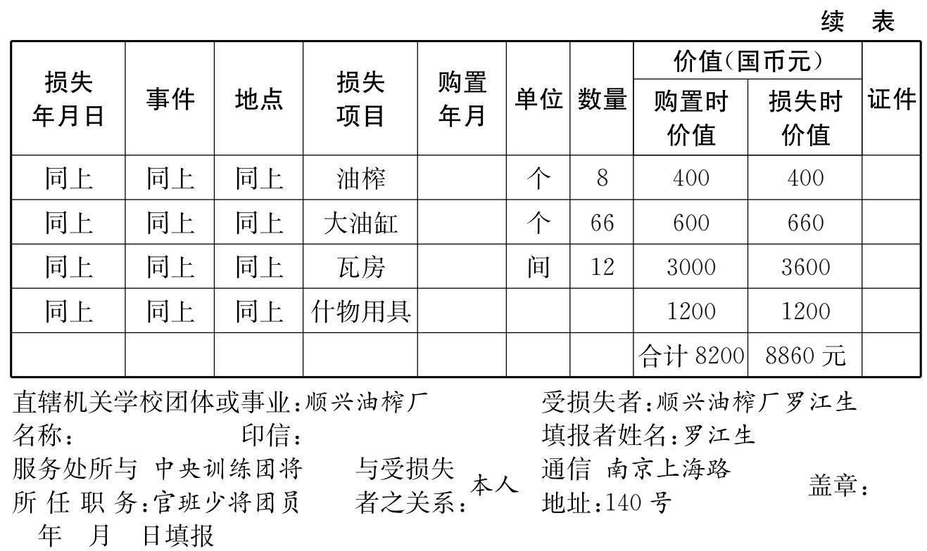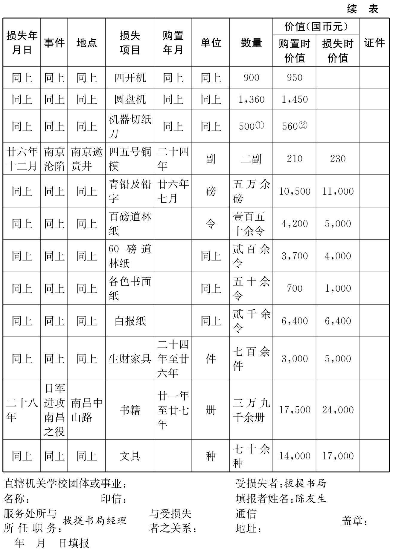 ② 本格及其上面几格填写位置可能有误,疑为“损失时价值”。原档如此。