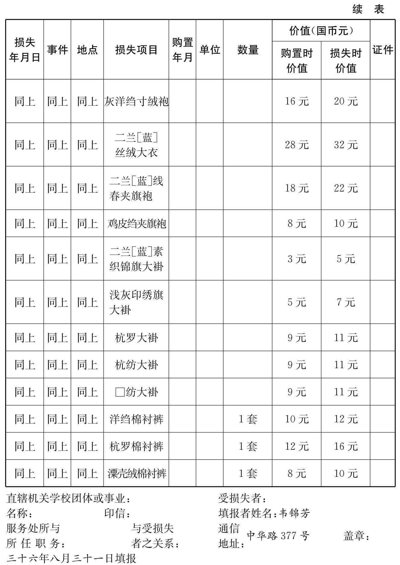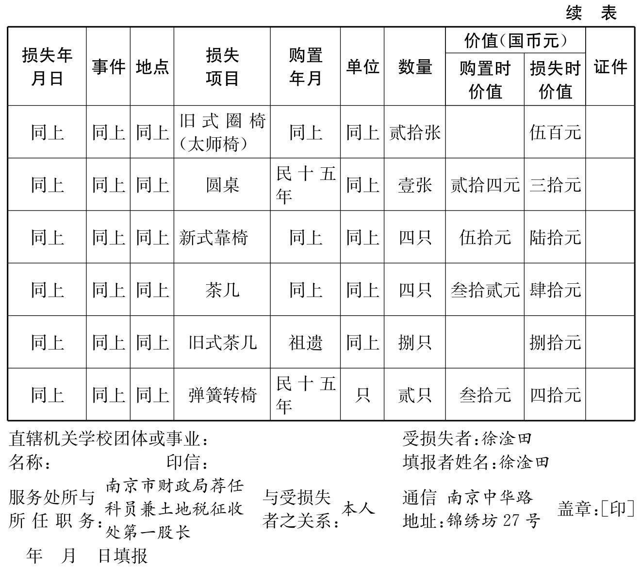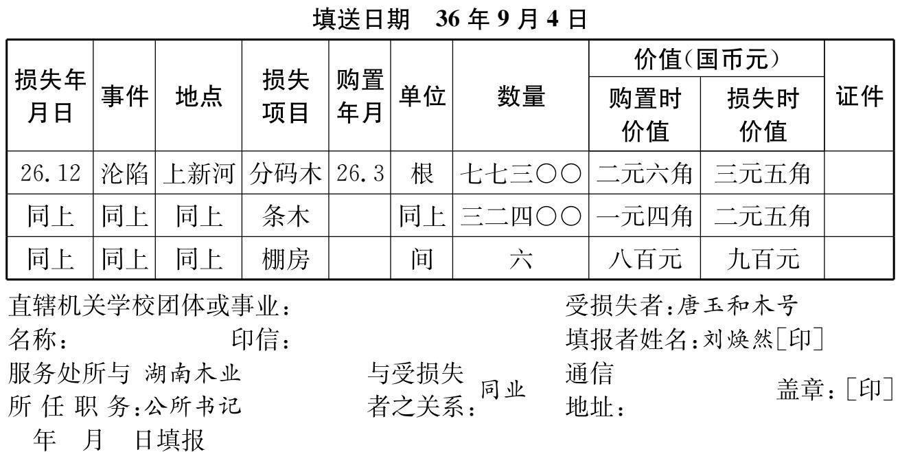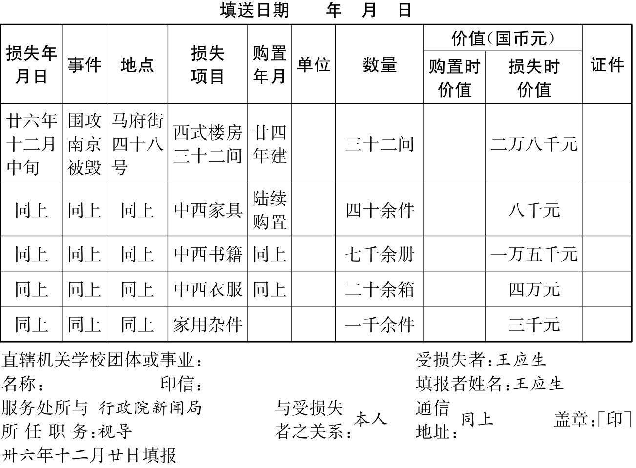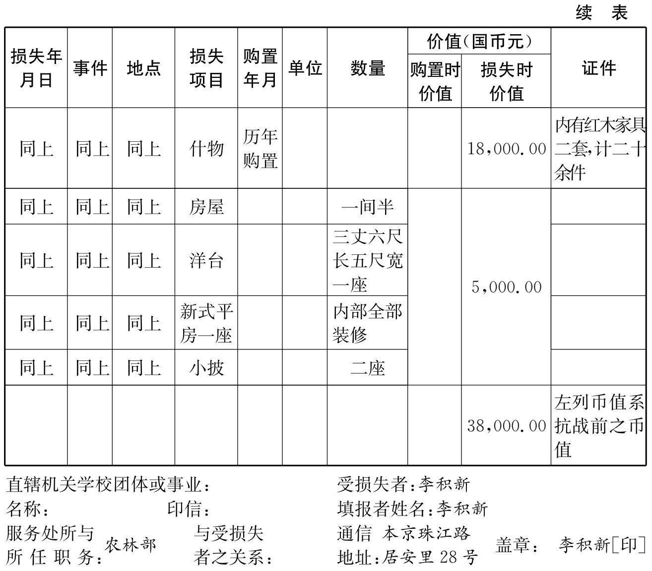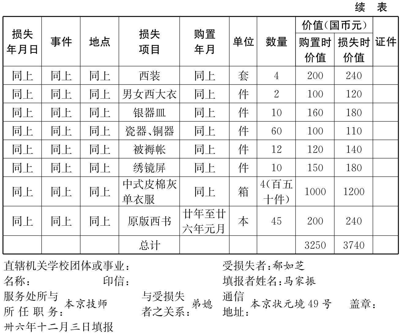 ② 本格及其上面几格填写位置可能有误,疑为“损失时价值”。原档如此。