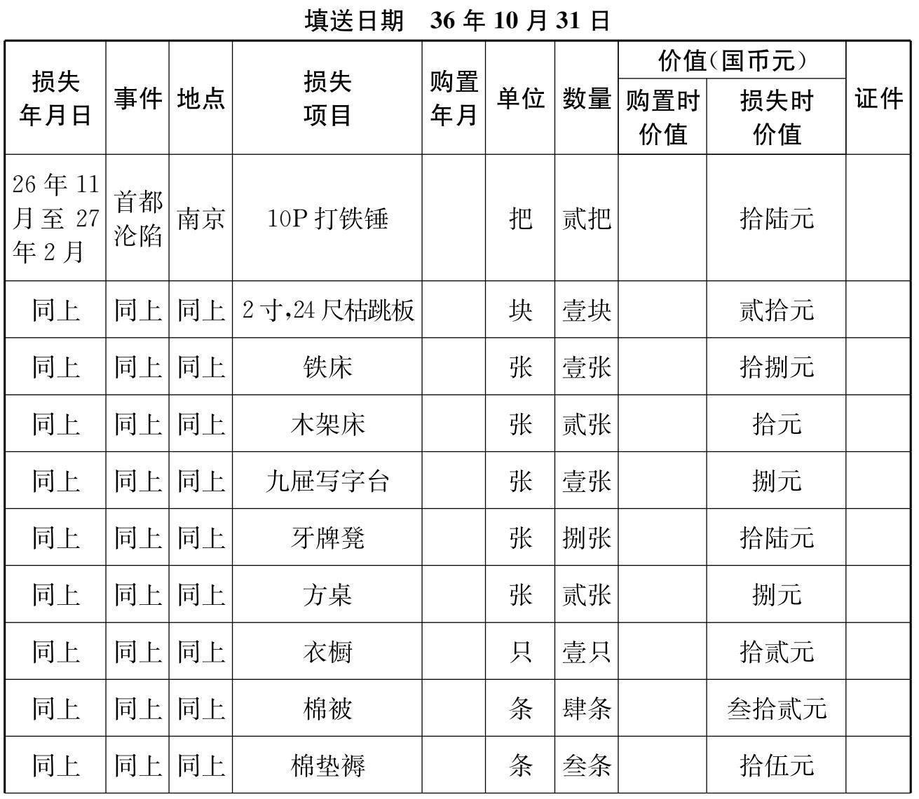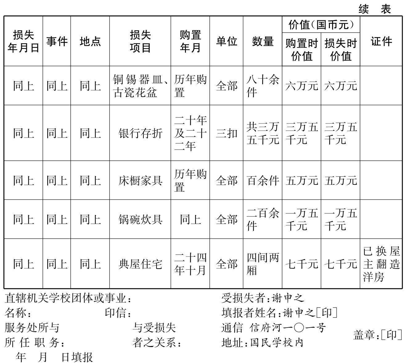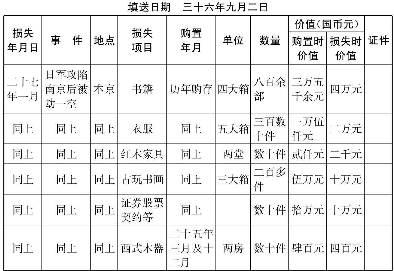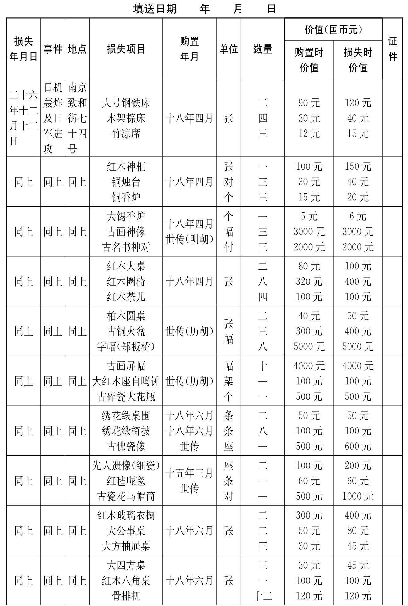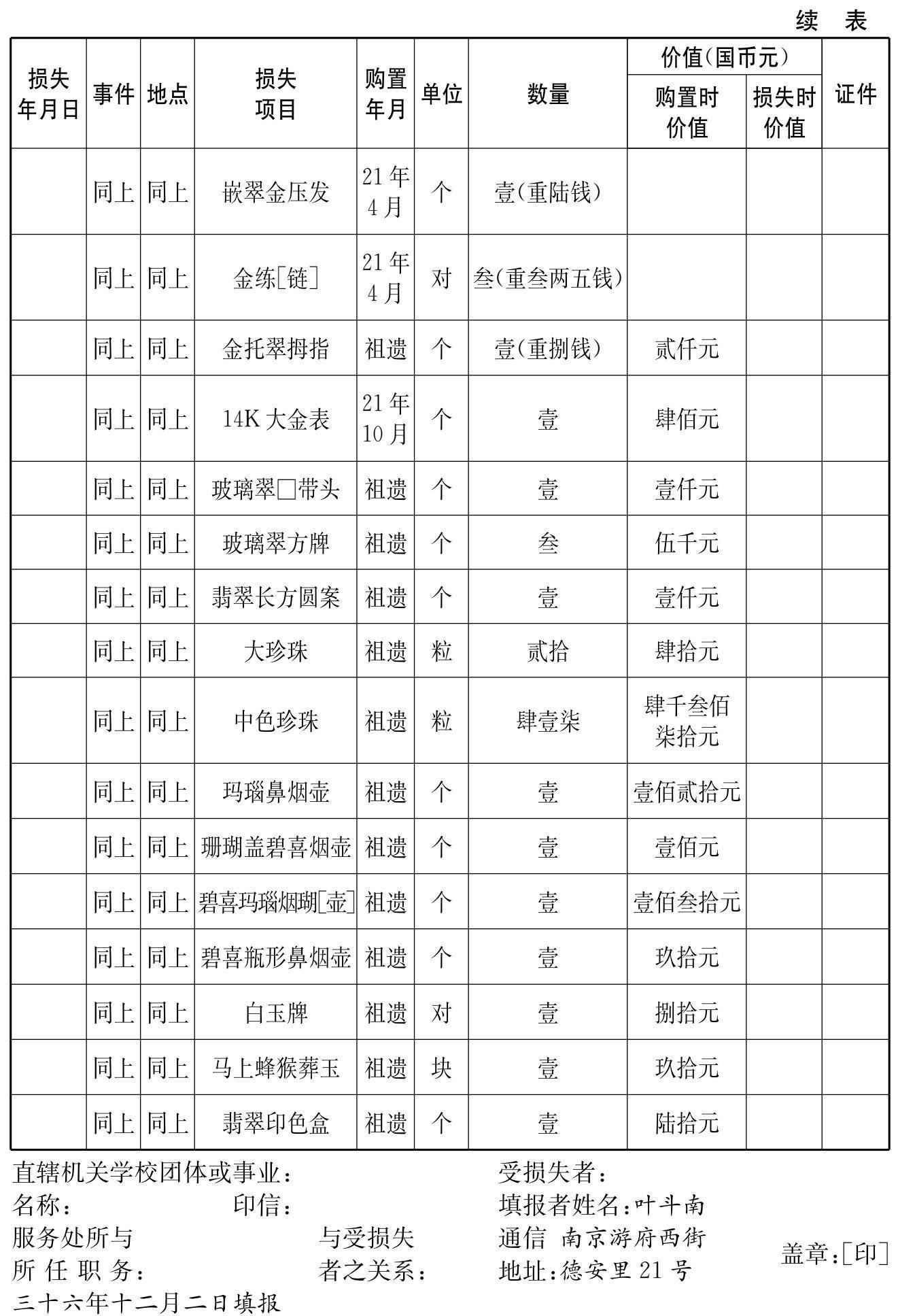 ② 本格及其上面几格填写位置可能有误,疑为“损失时价值”。原档如此。