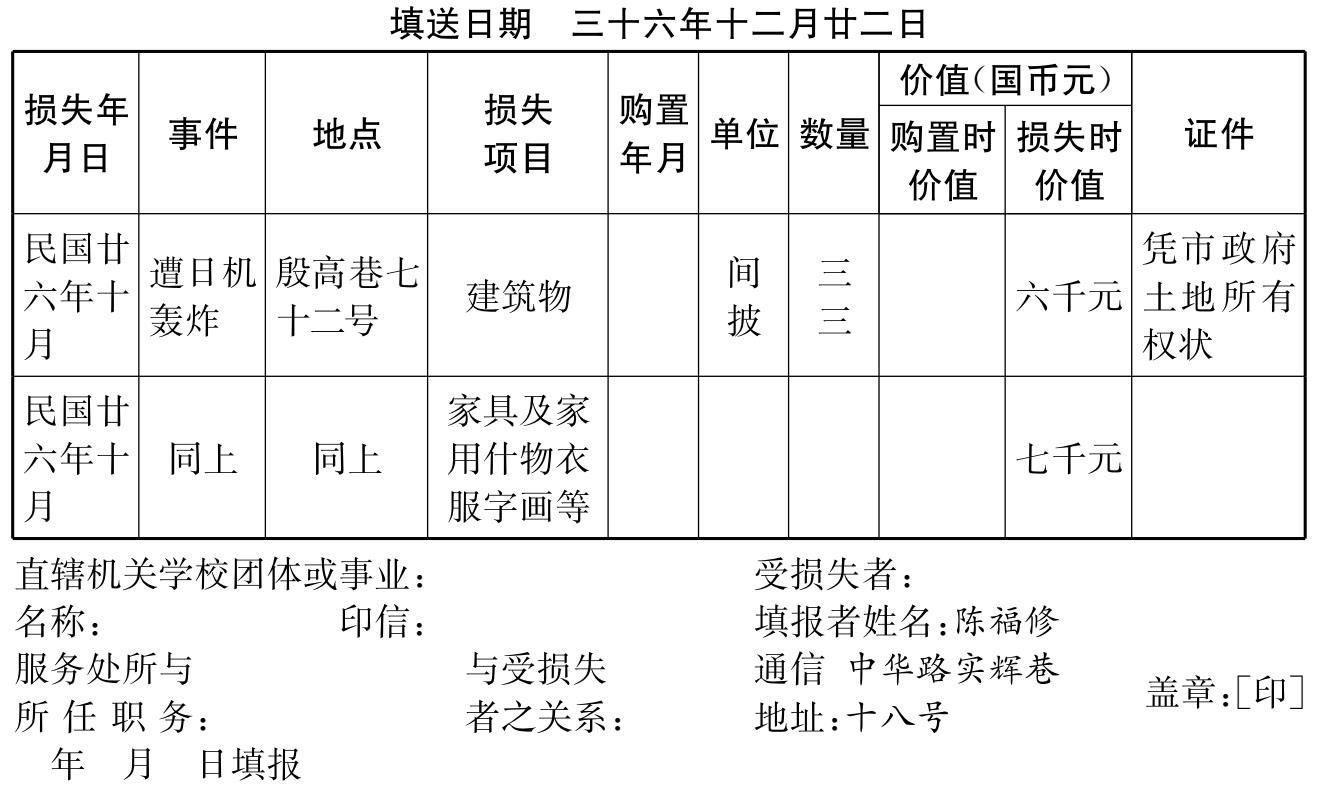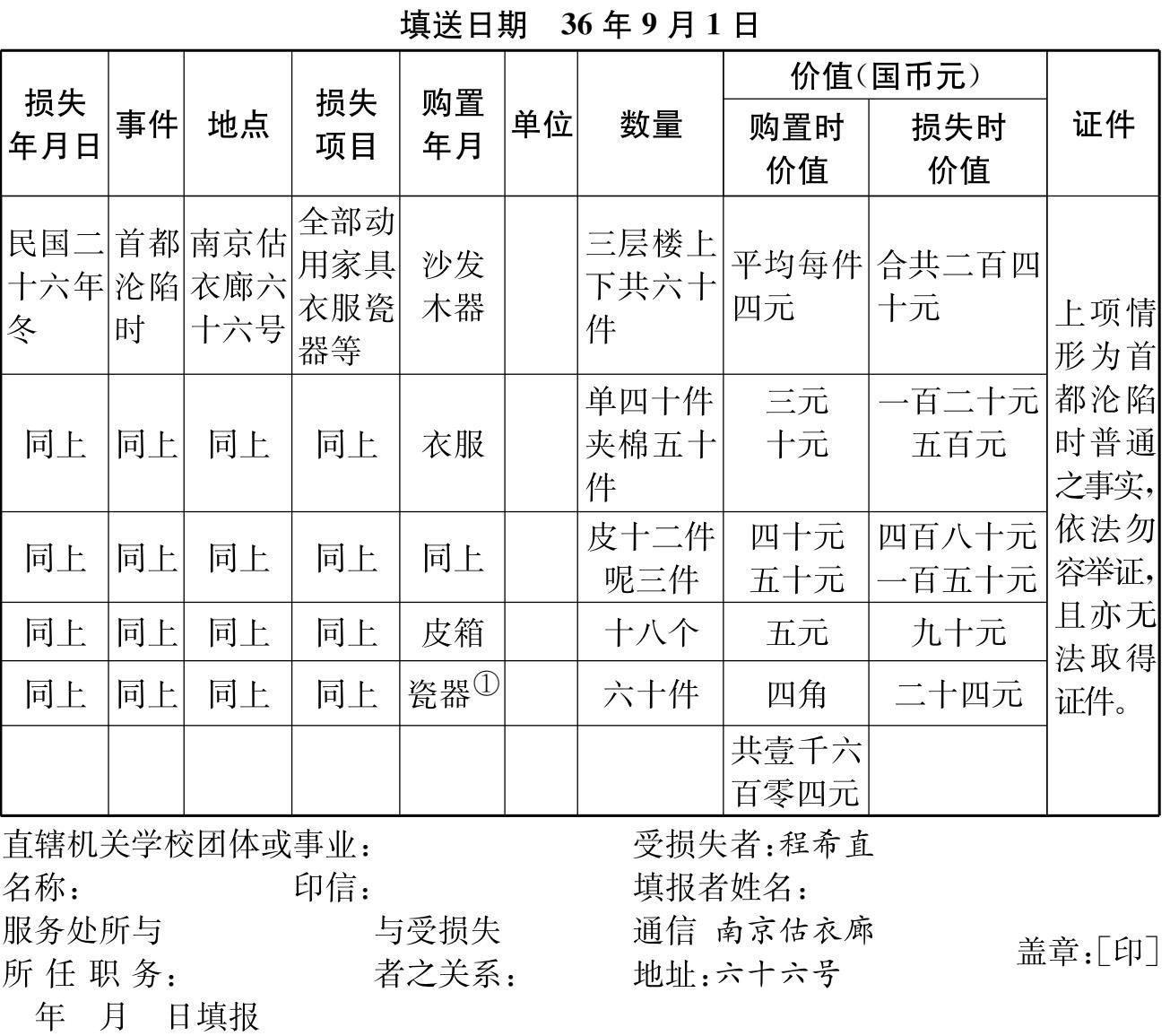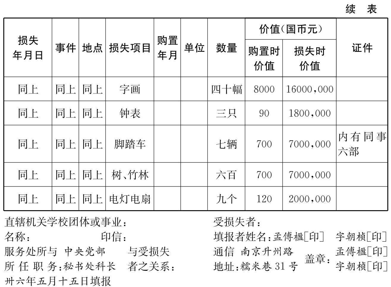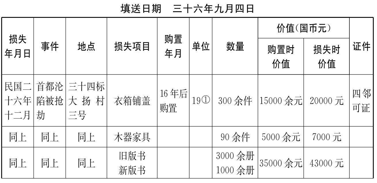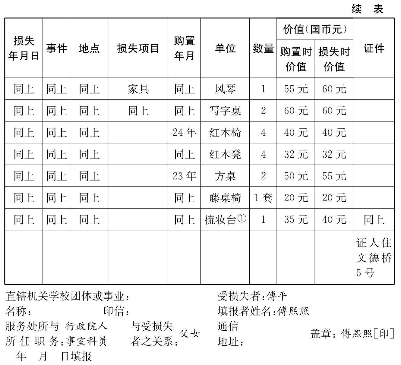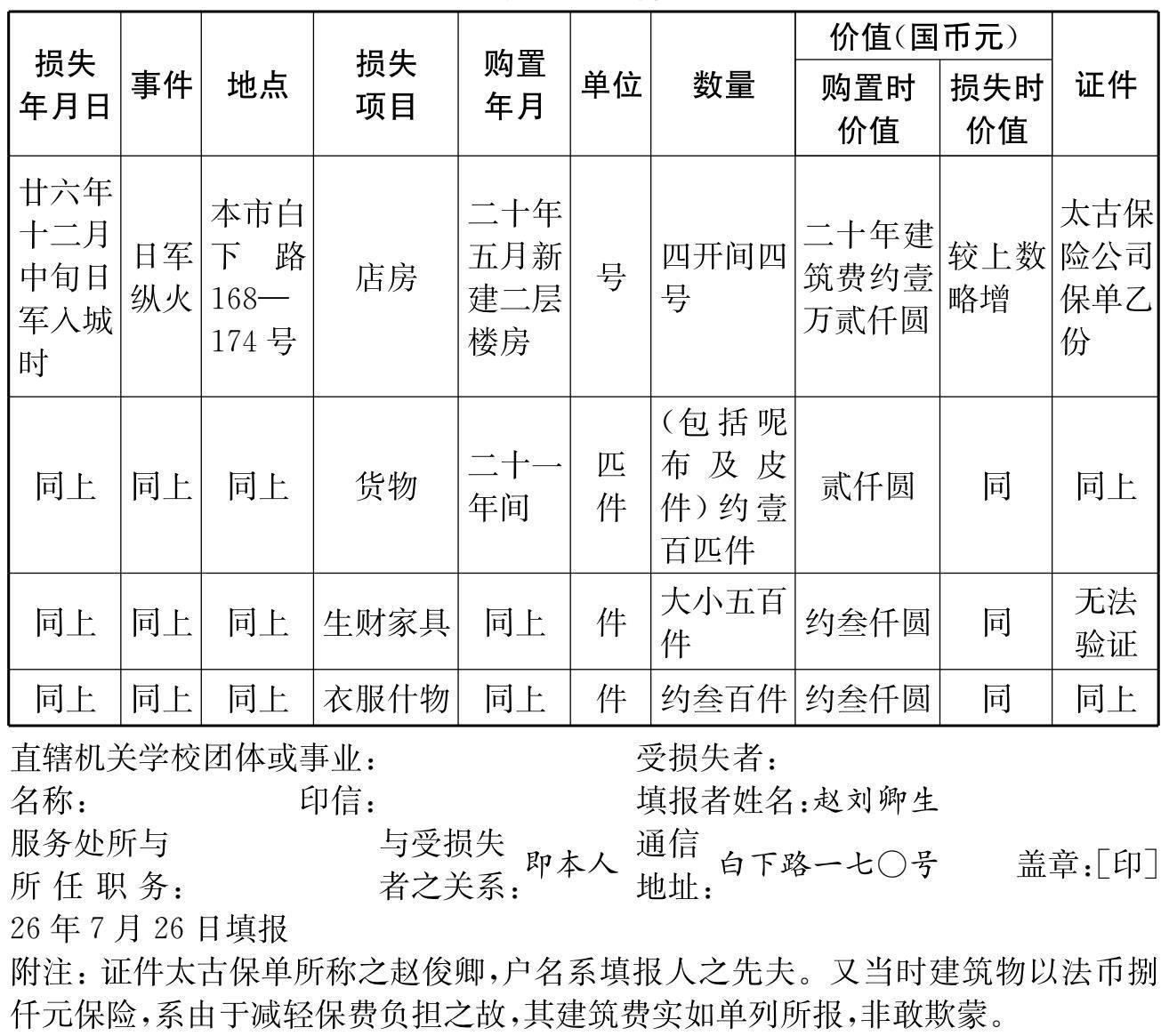 ② 本格及其上面几格填写位置可能有误,疑为“损失时价值”。原档如此。