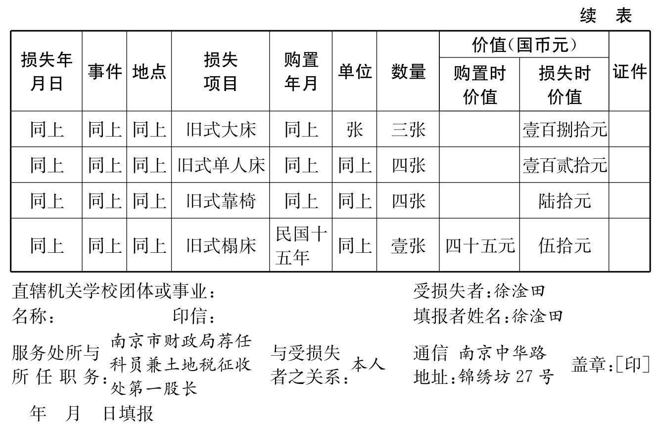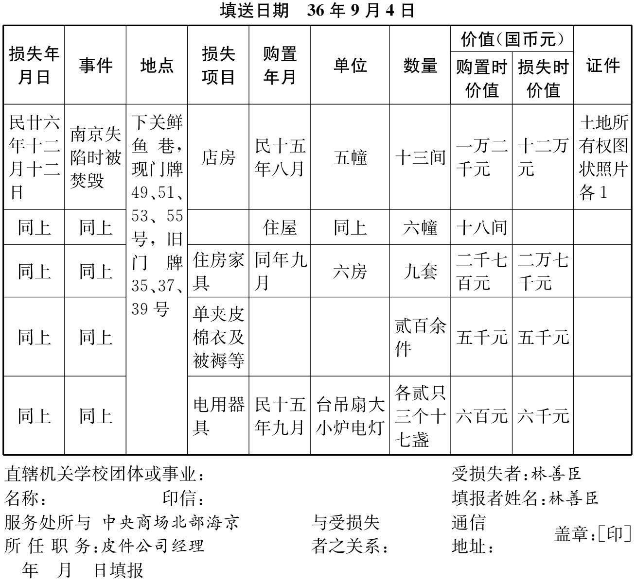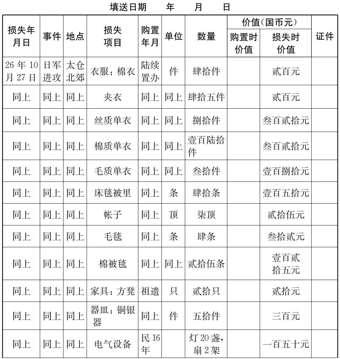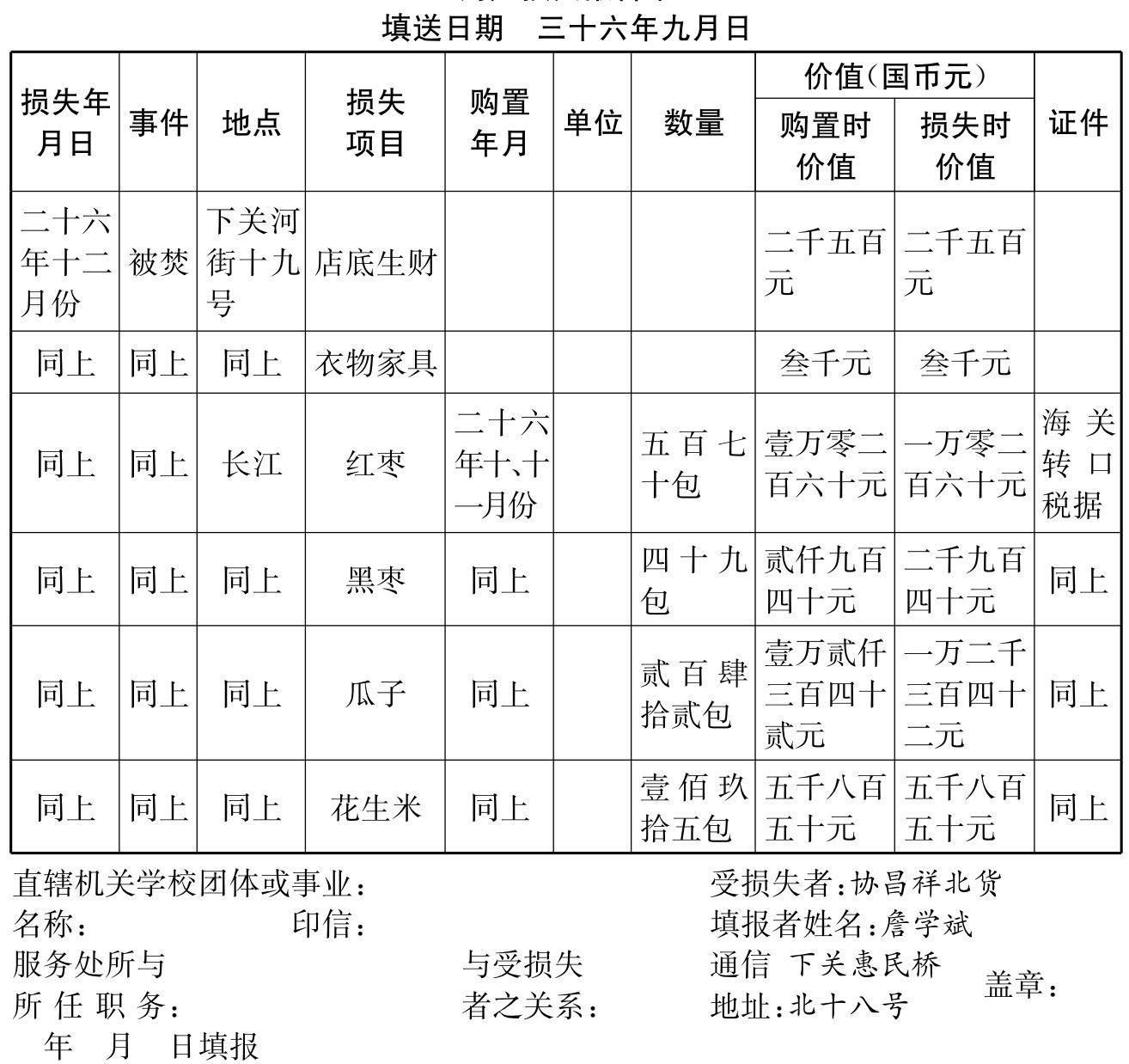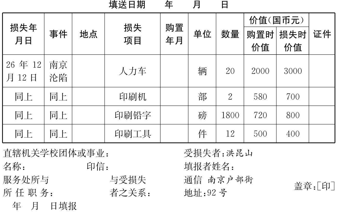 ② 本格及其上面几格填写位置可能有误,疑为“损失时价值”。原档如此。