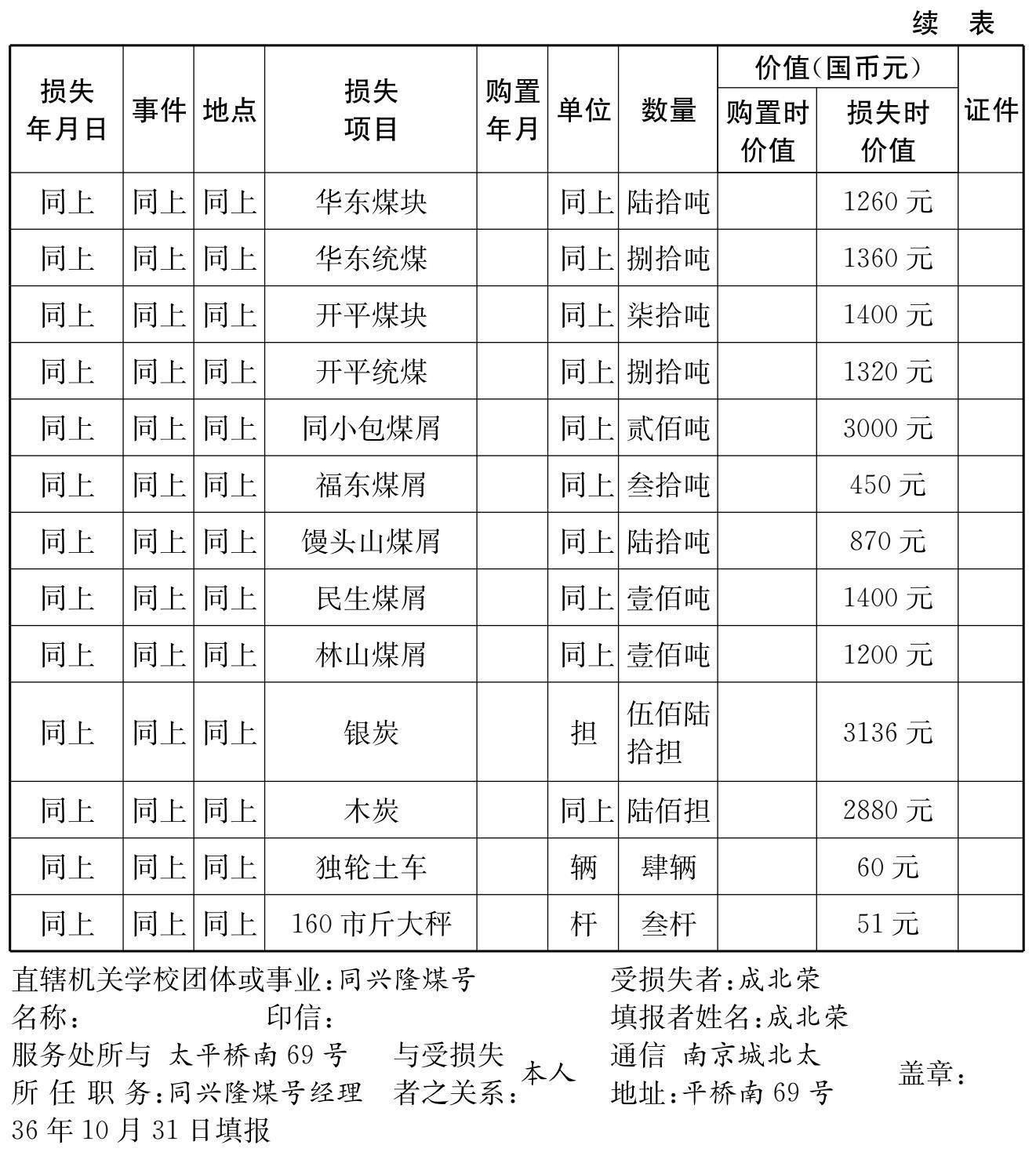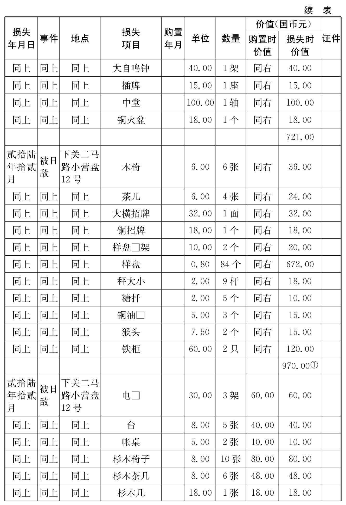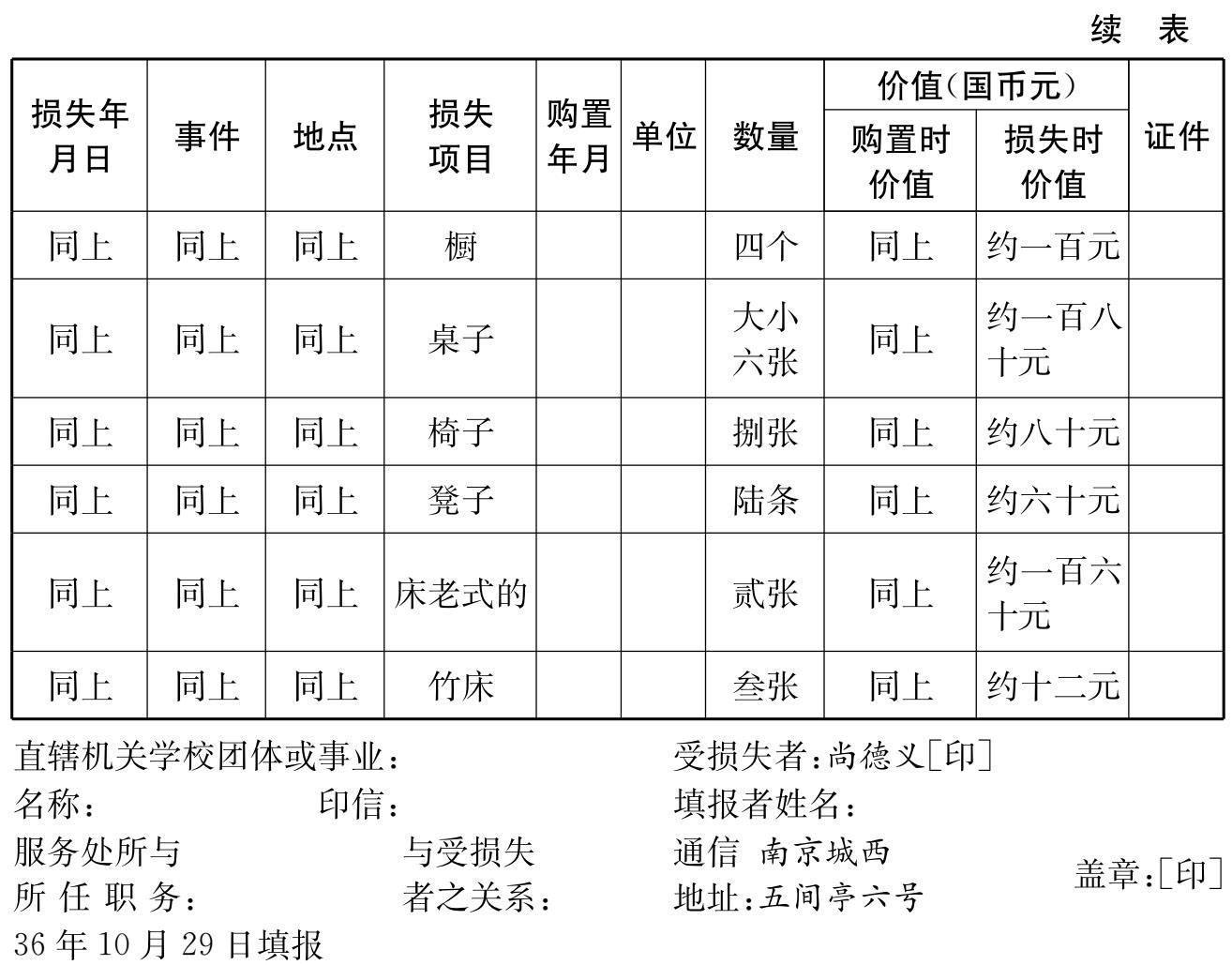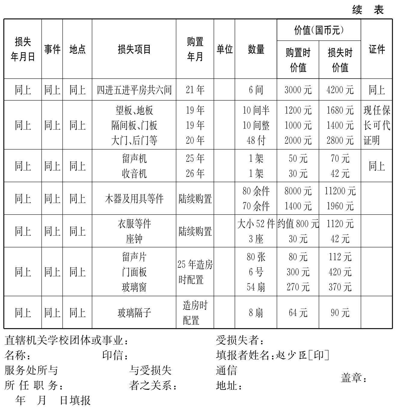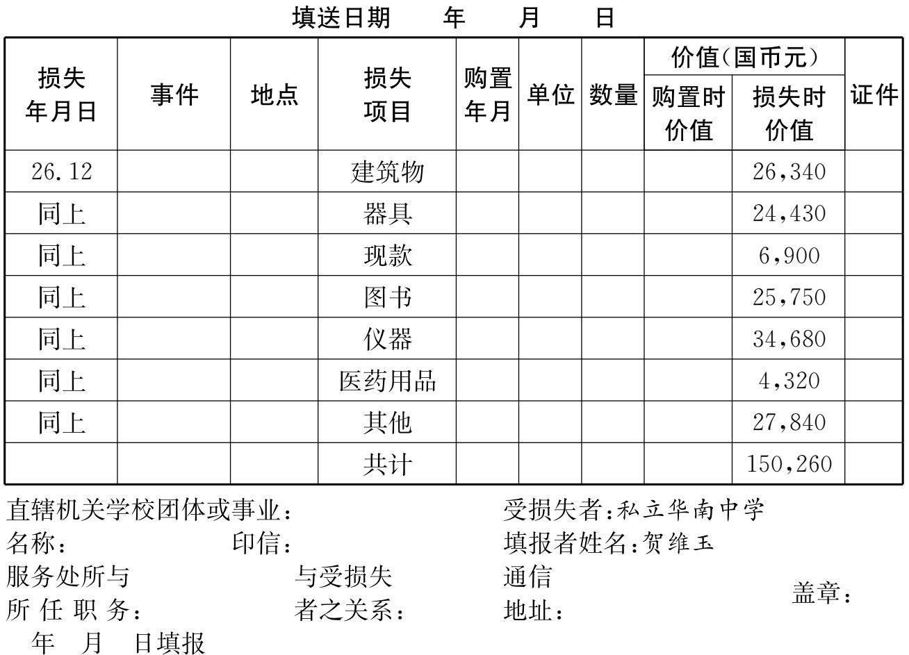 ② 本格及其上面几格填写位置可能有误,疑为“损失时价值”。原档如此。