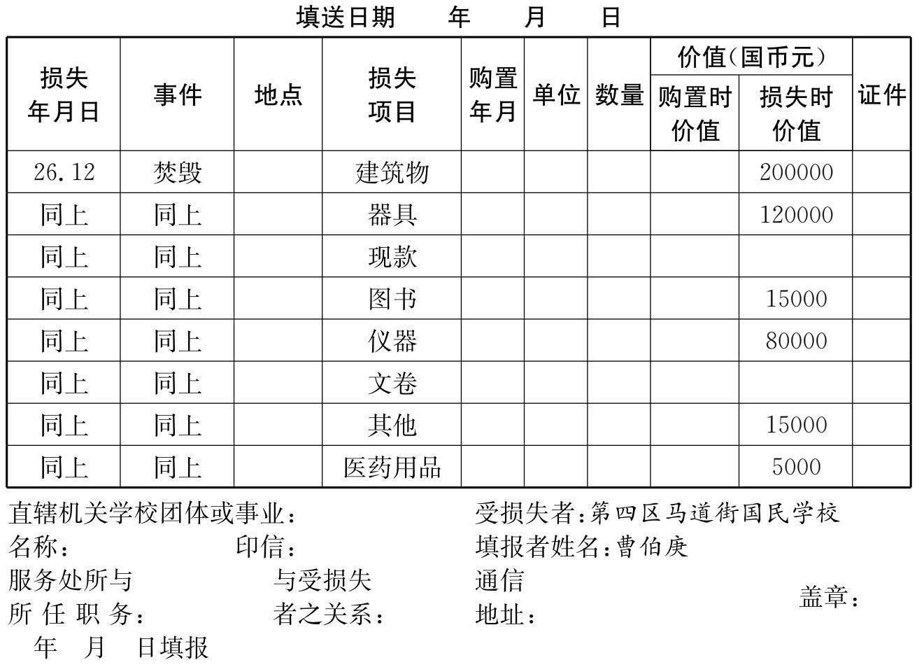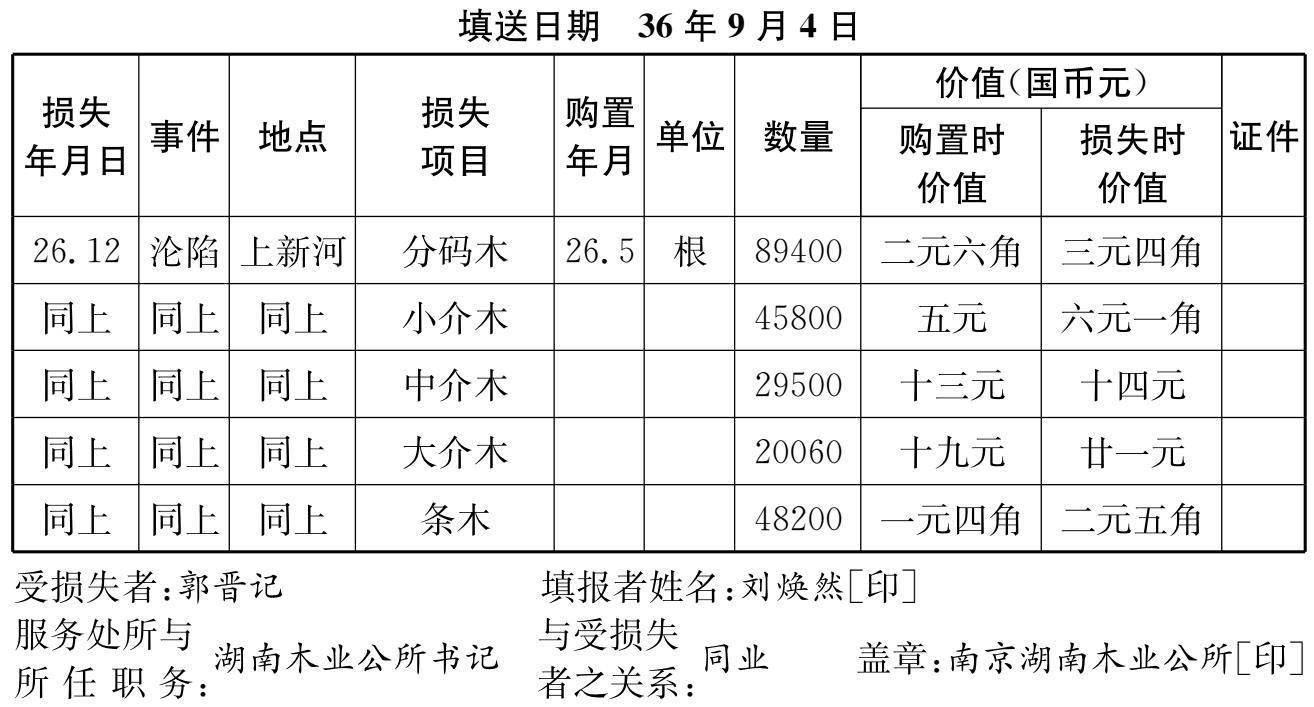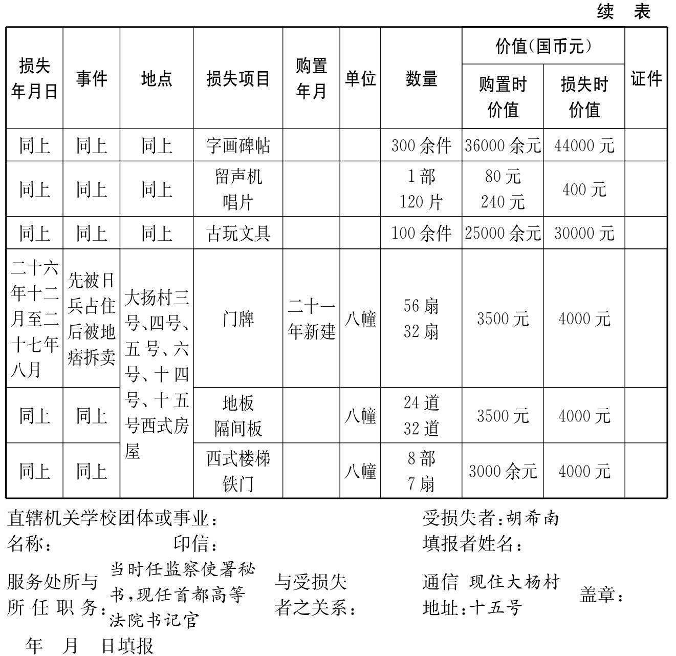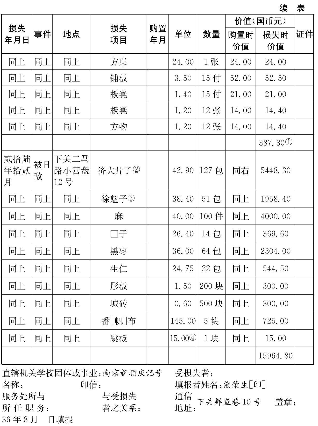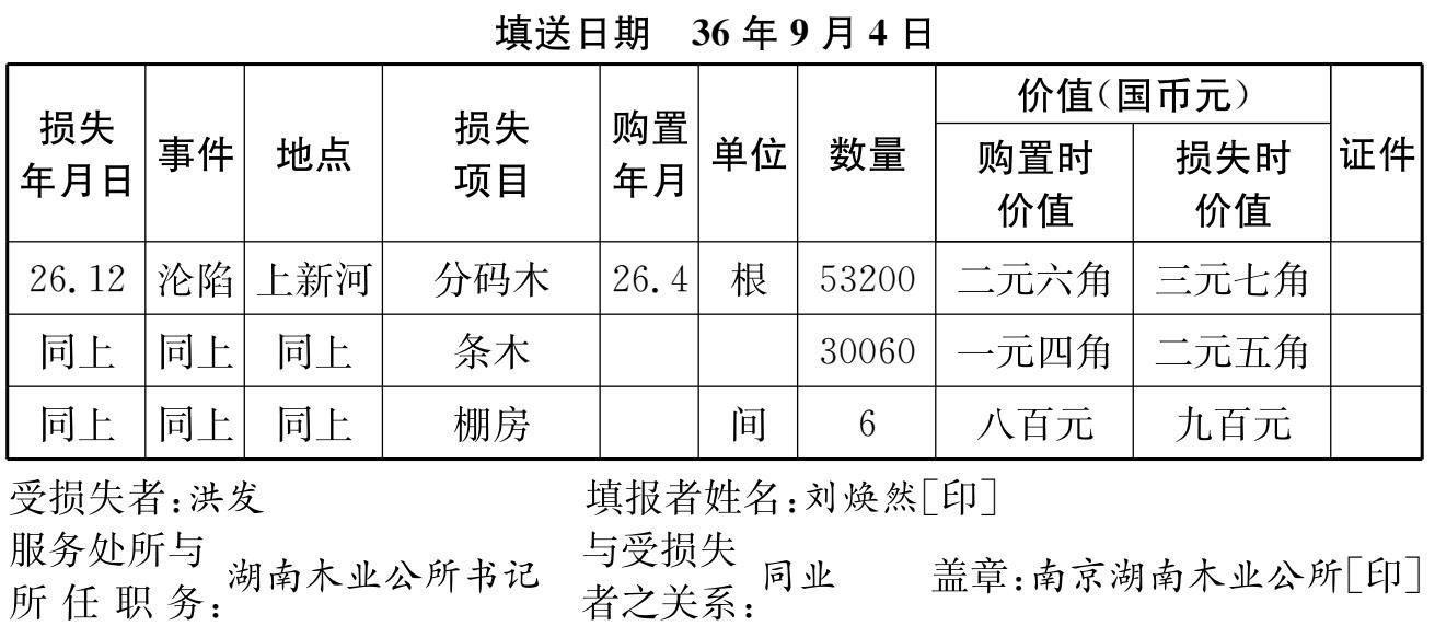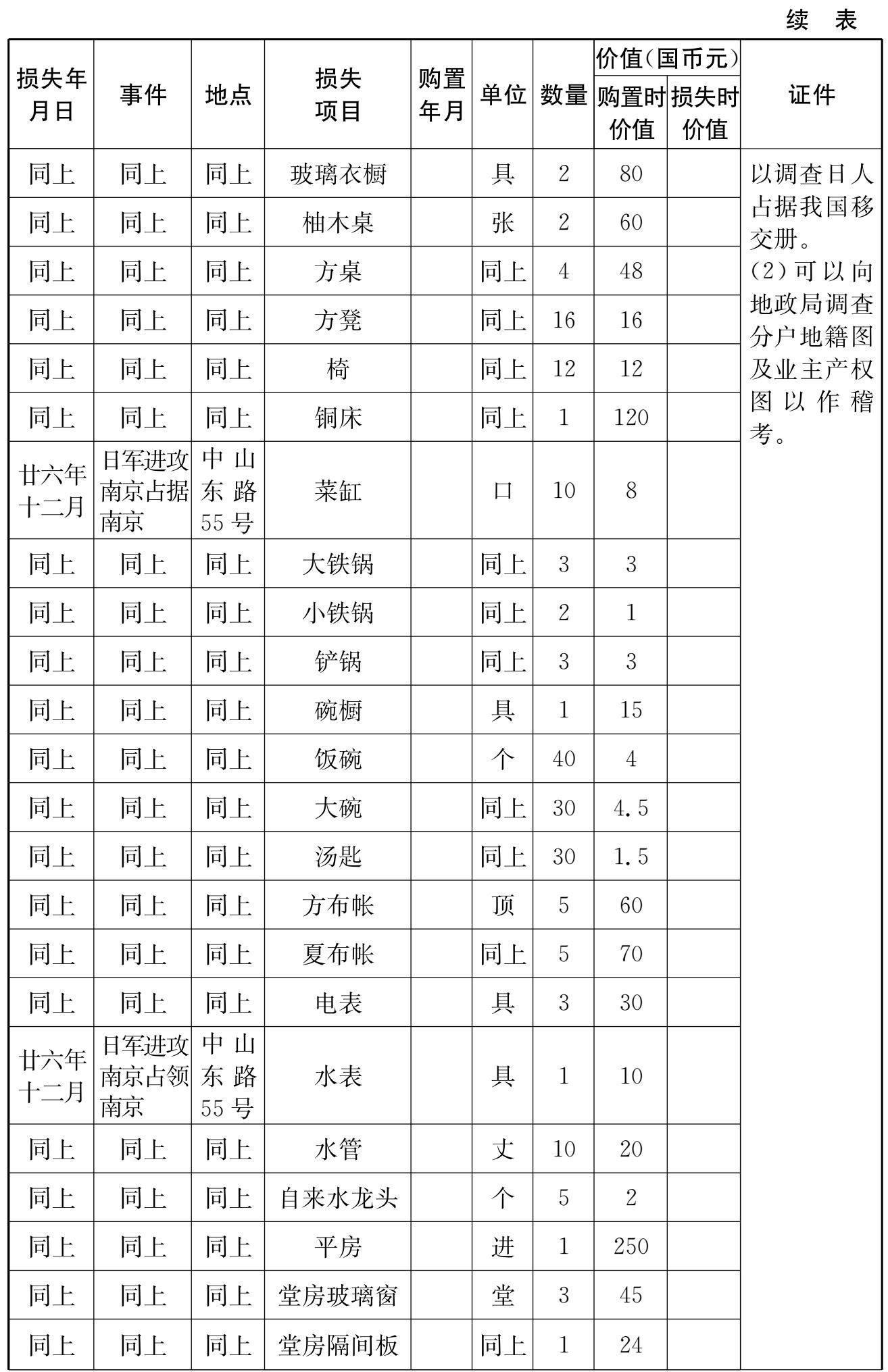 ② 本格及其上面几格填写位置可能有误,疑为“损失时价值”。原档如此。