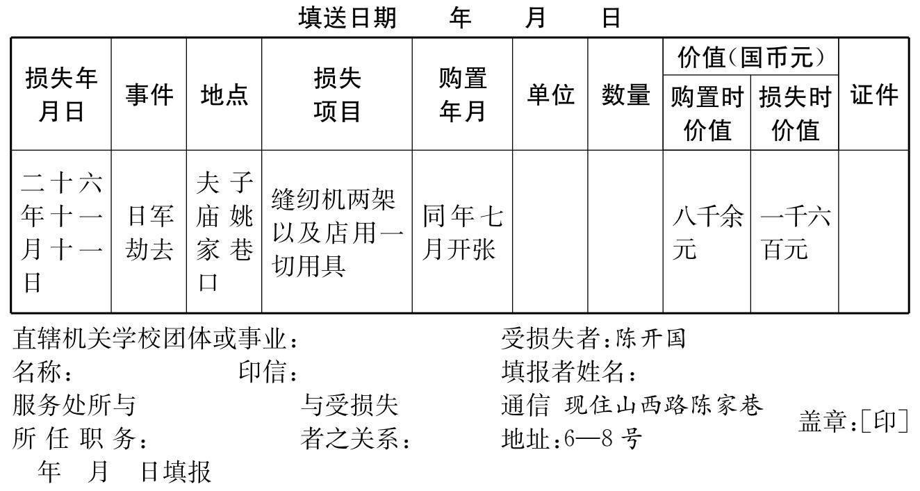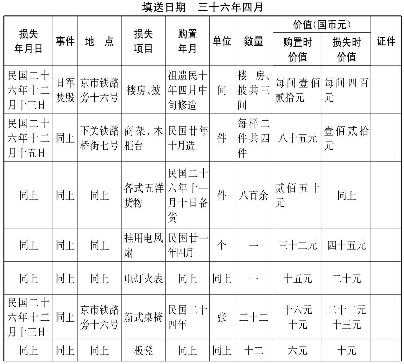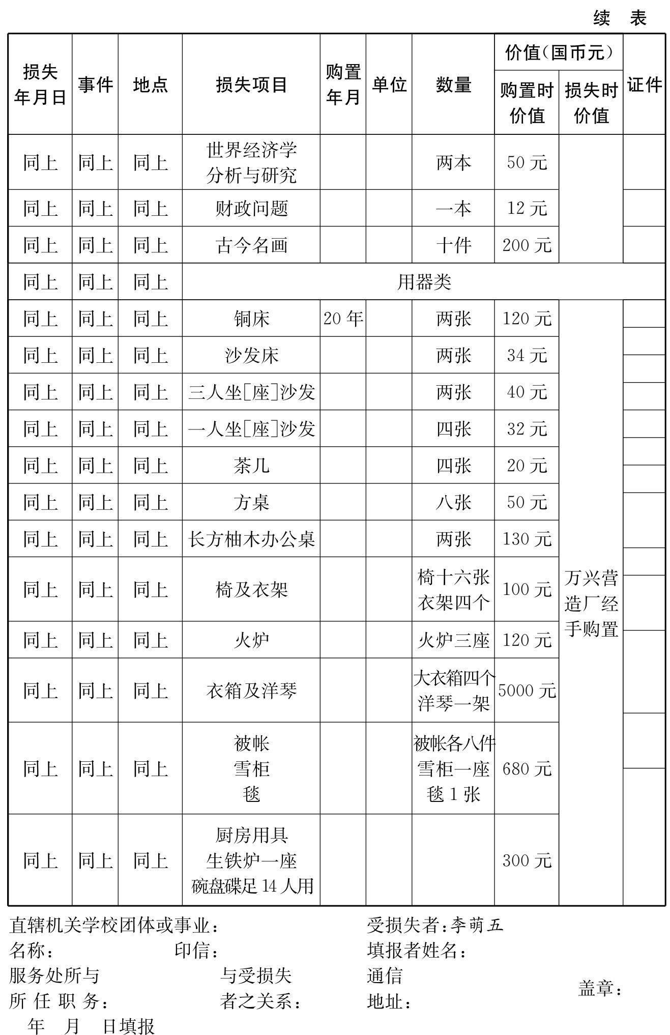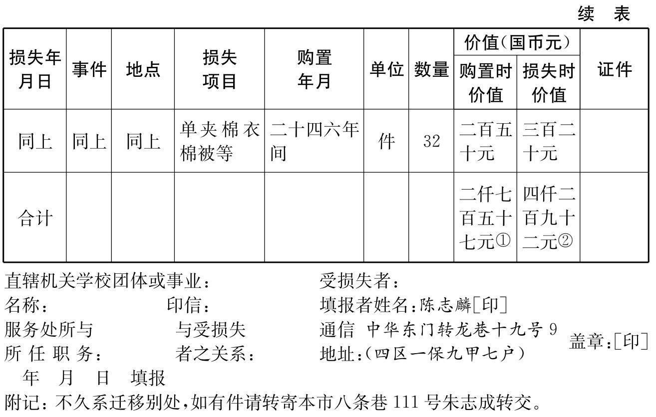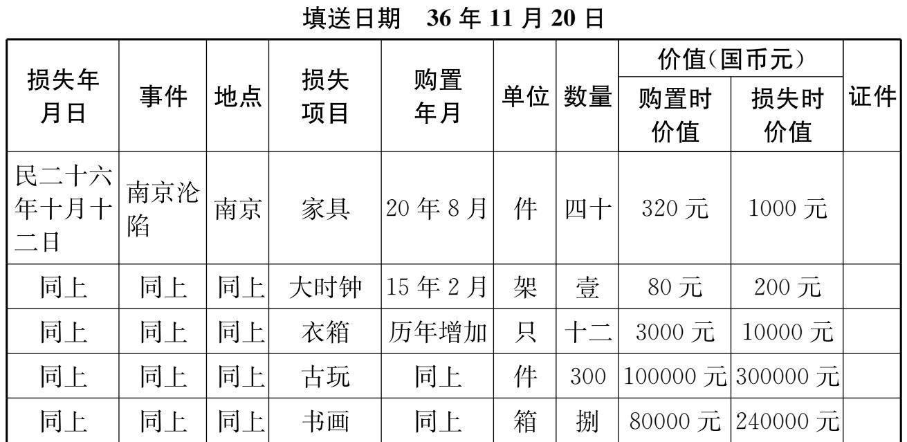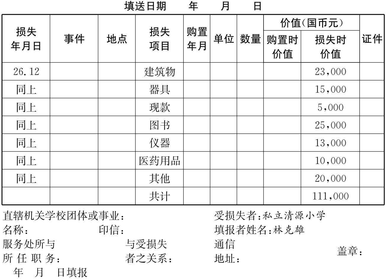② 本格及其上面几格填写位置可能有误,疑为“损失时价值”。原档如此。