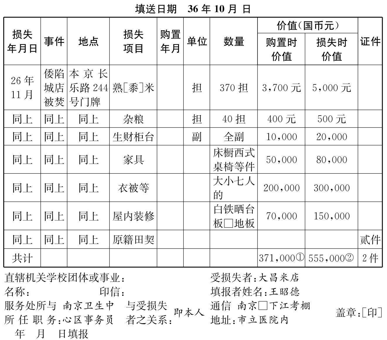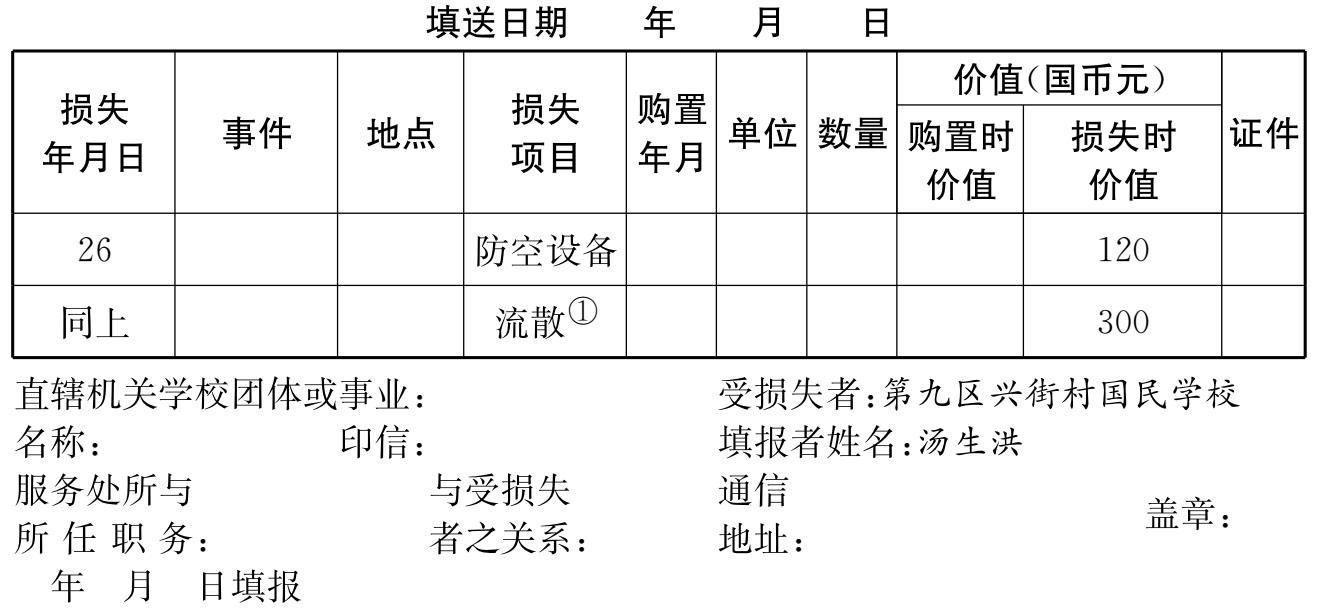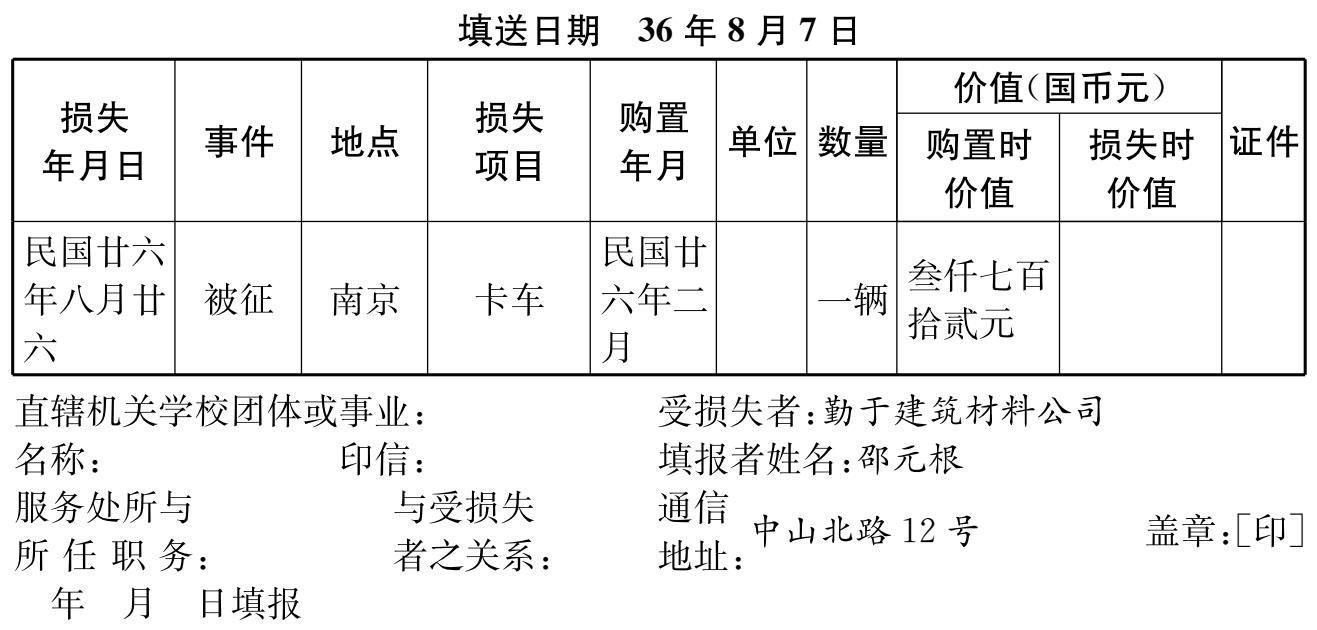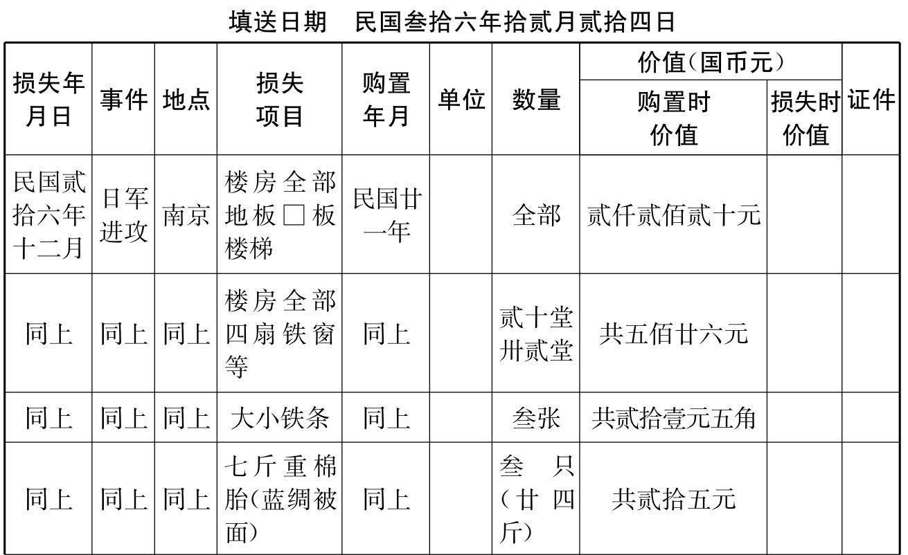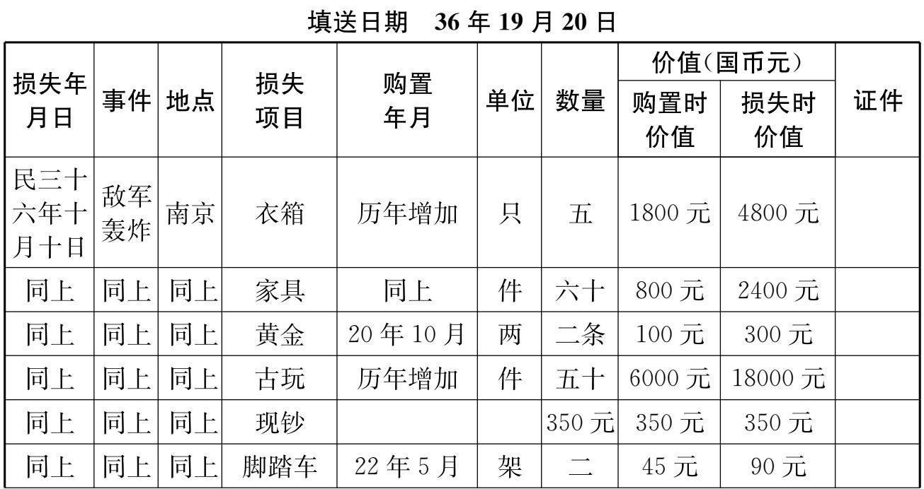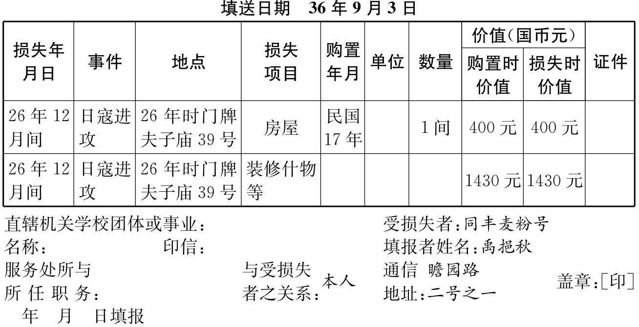 ② 本格及其上面几格填写位置可能有误,疑为“损失时价值”。原档如此。