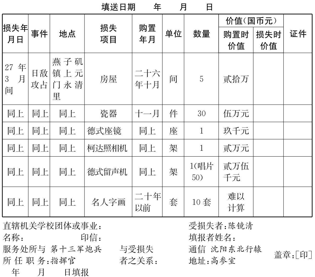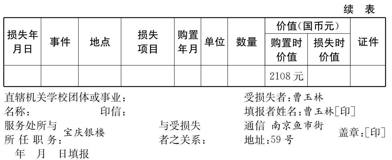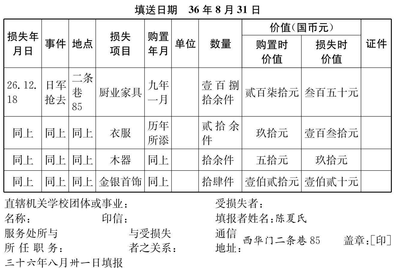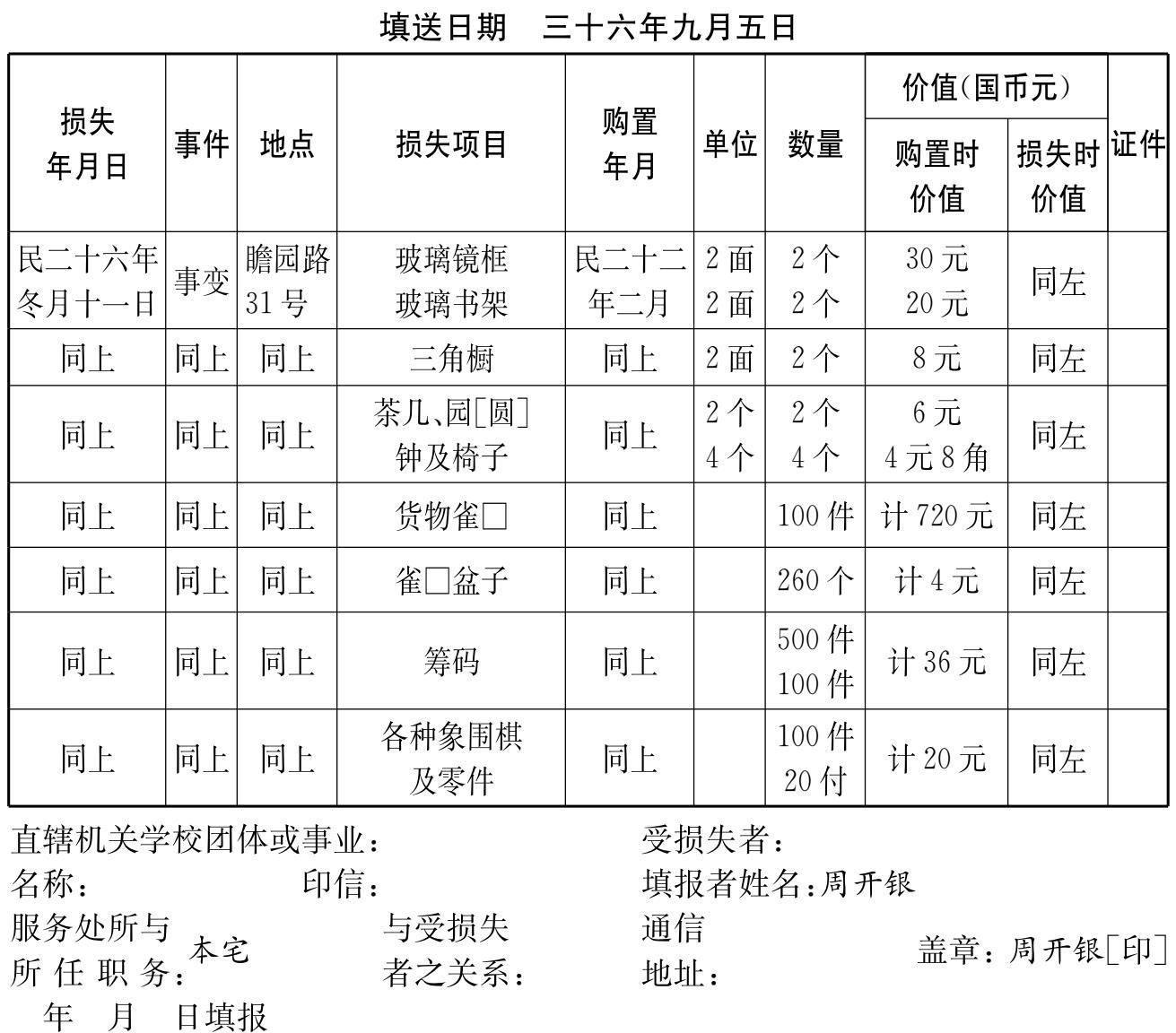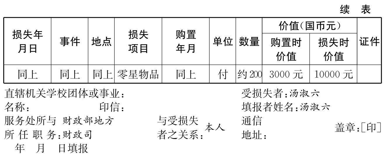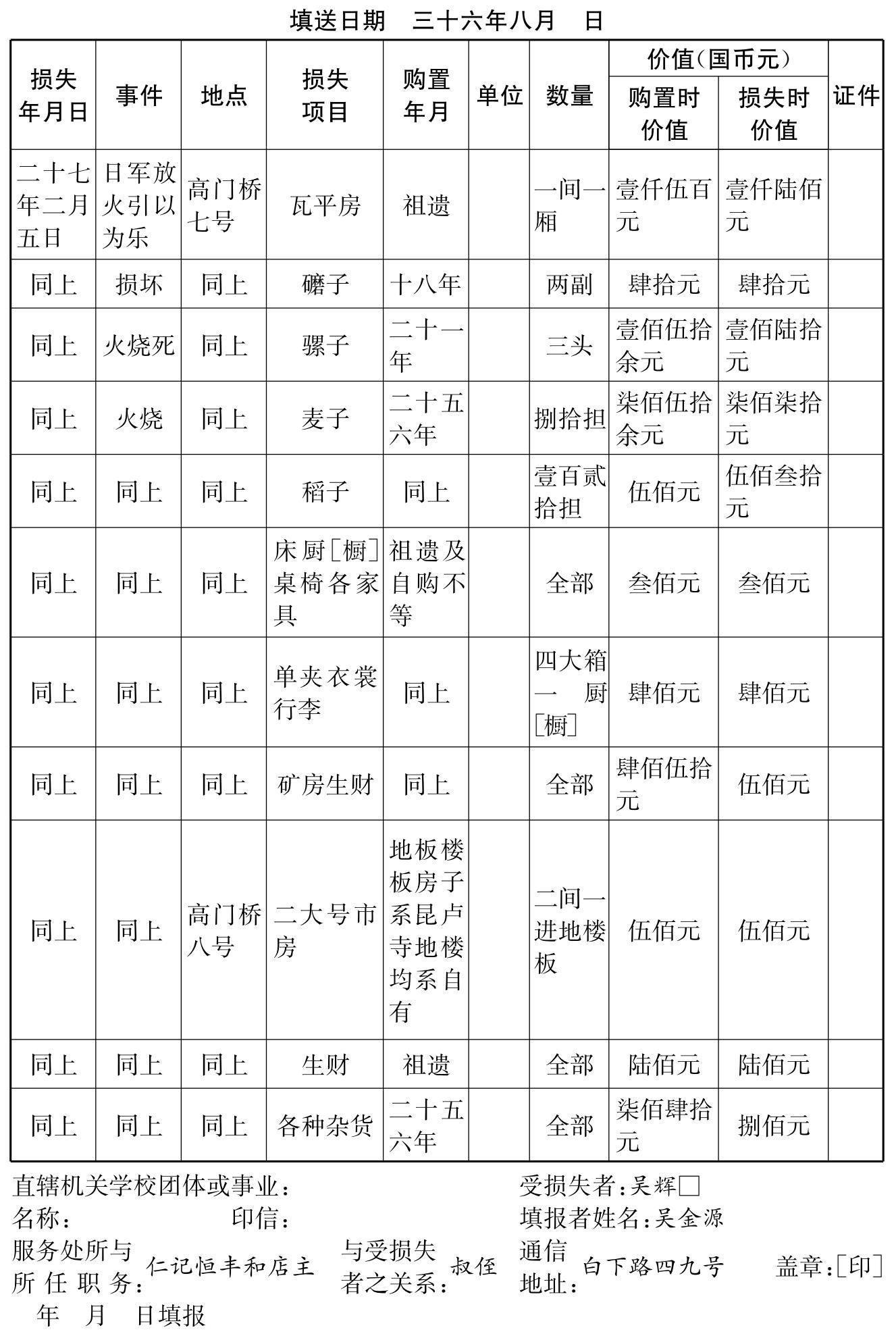 ② 本格及其上面几格填写位置可能有误,疑为“损失时价值”。原档如此。