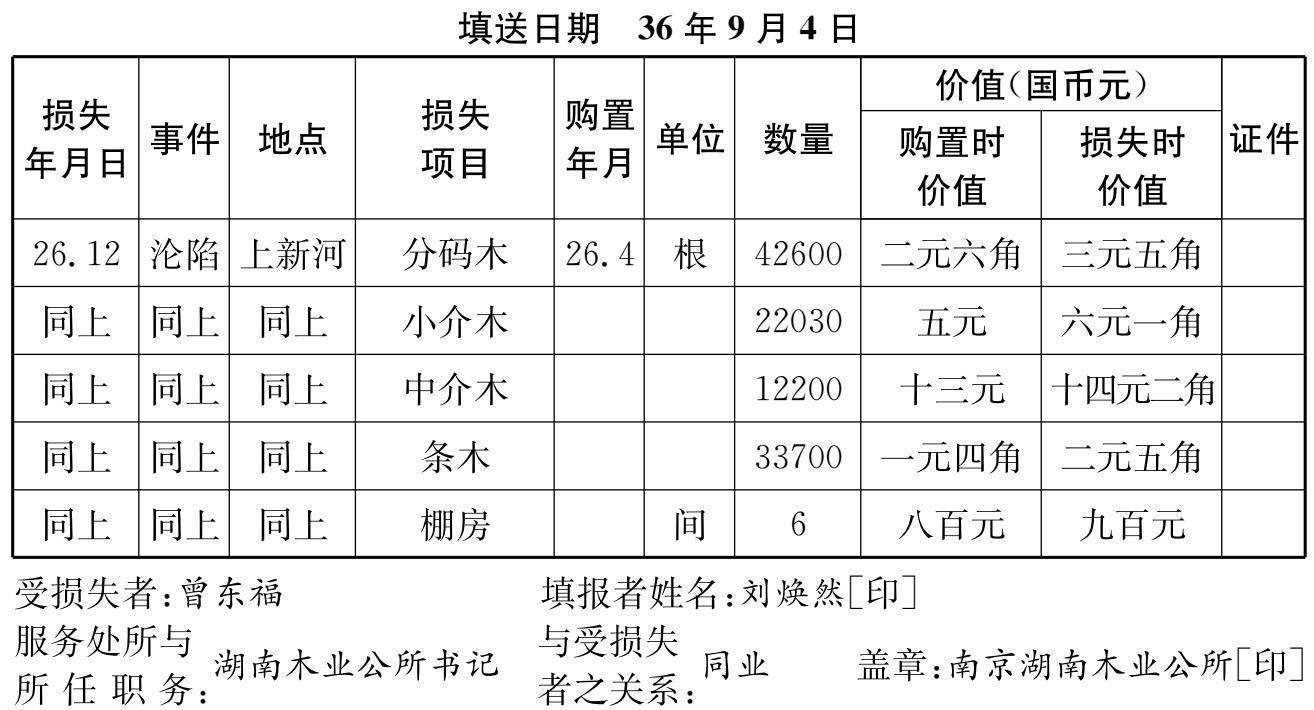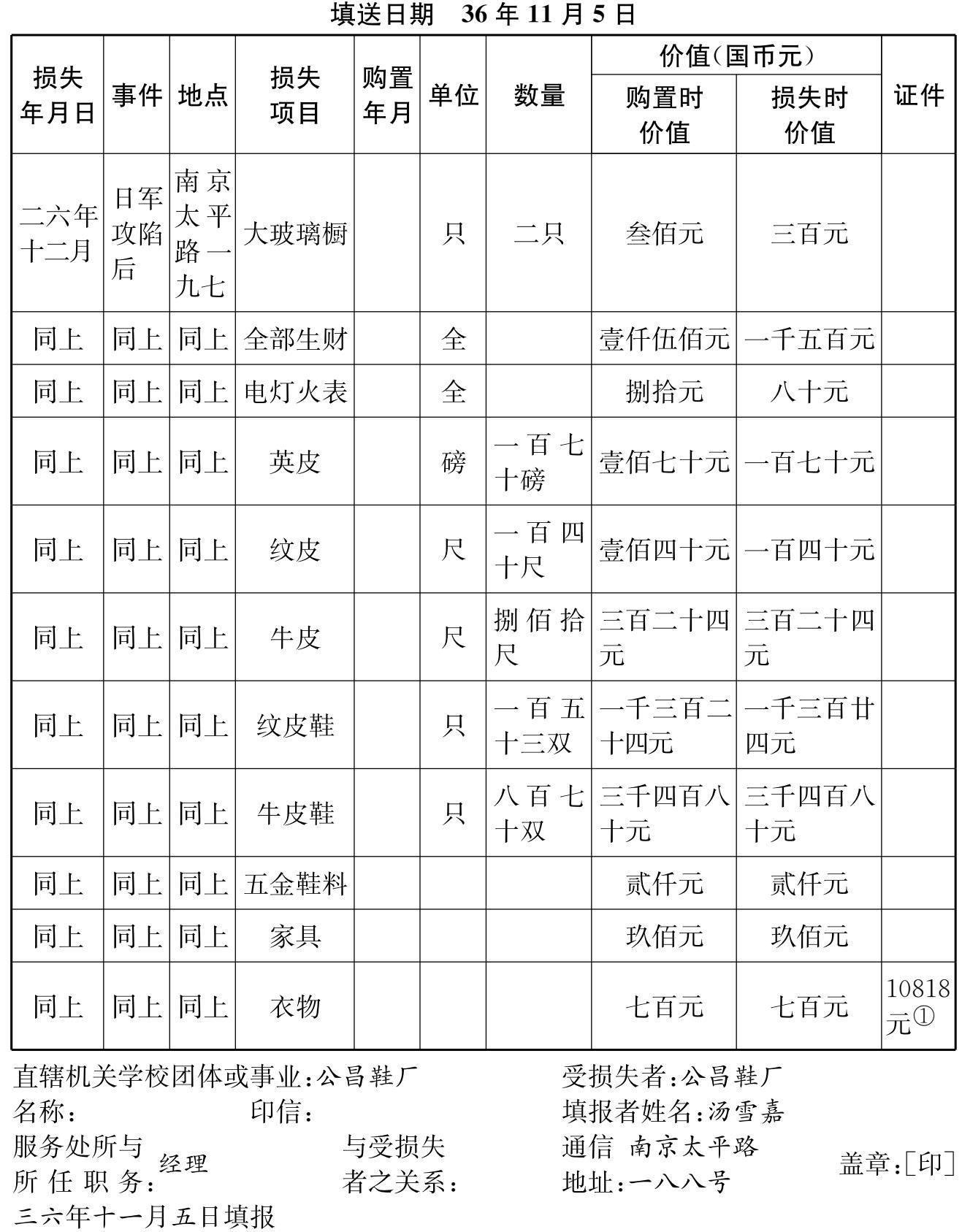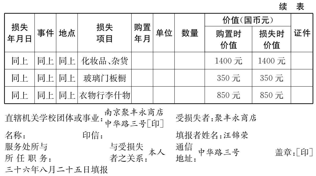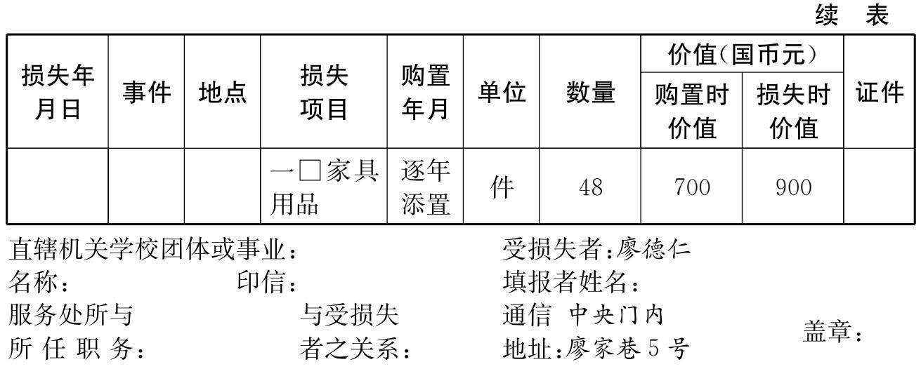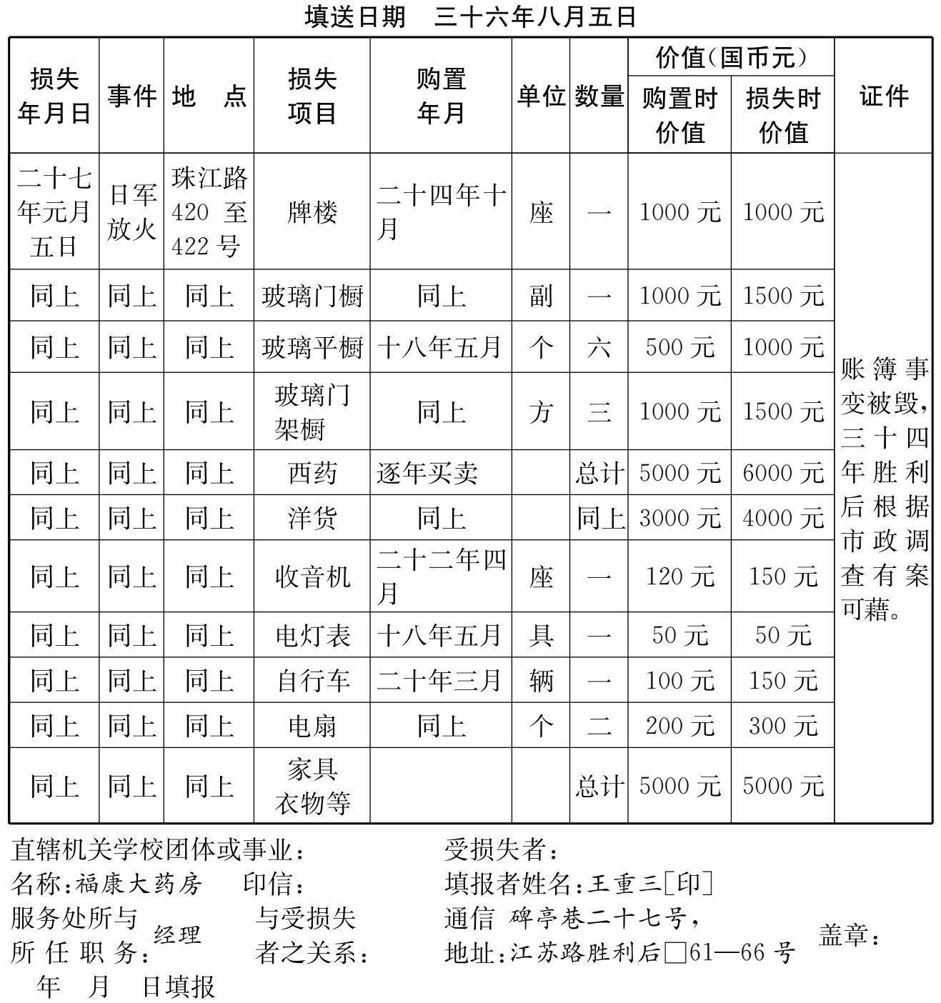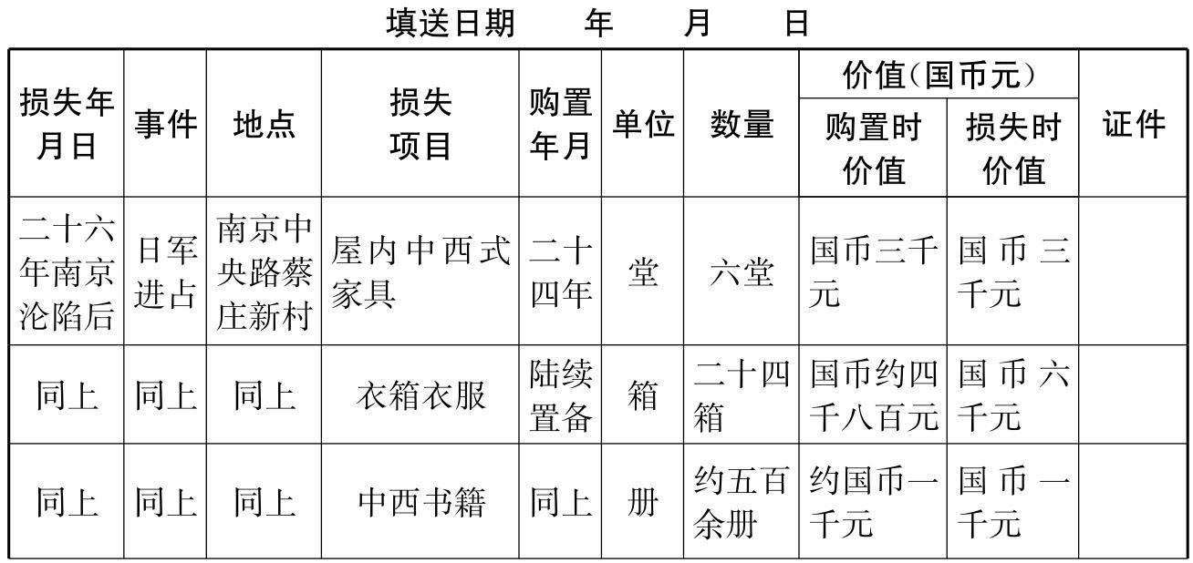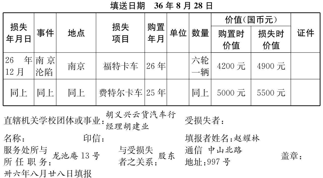 ② 本格及其上面几格填写位置可能有误,疑为“损失时价值”。原档如此。