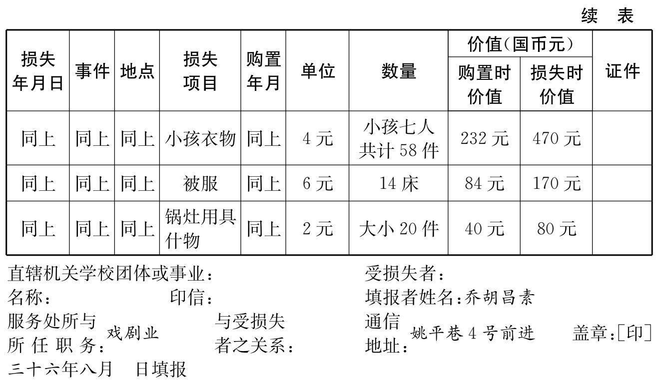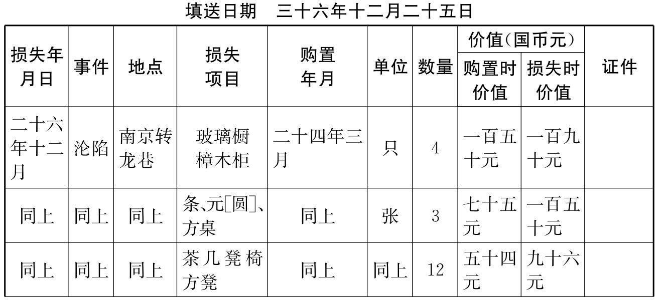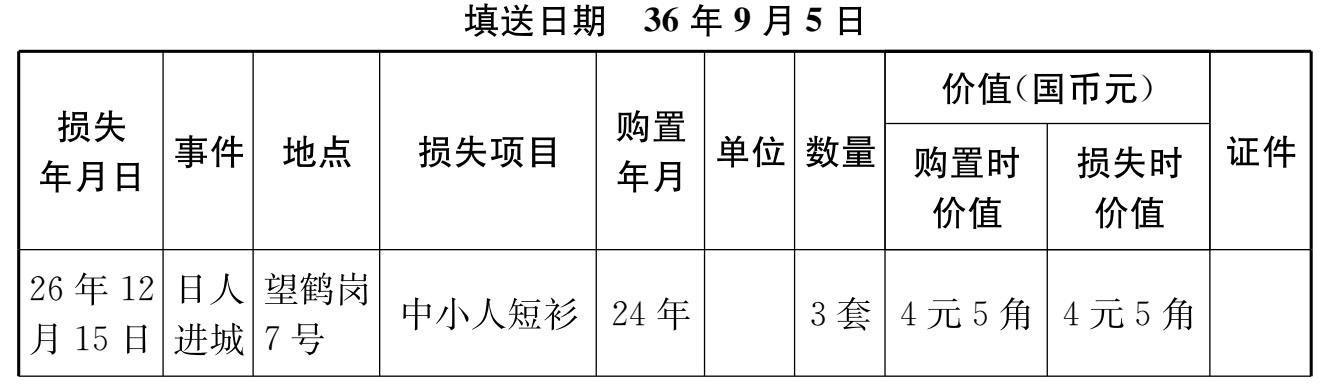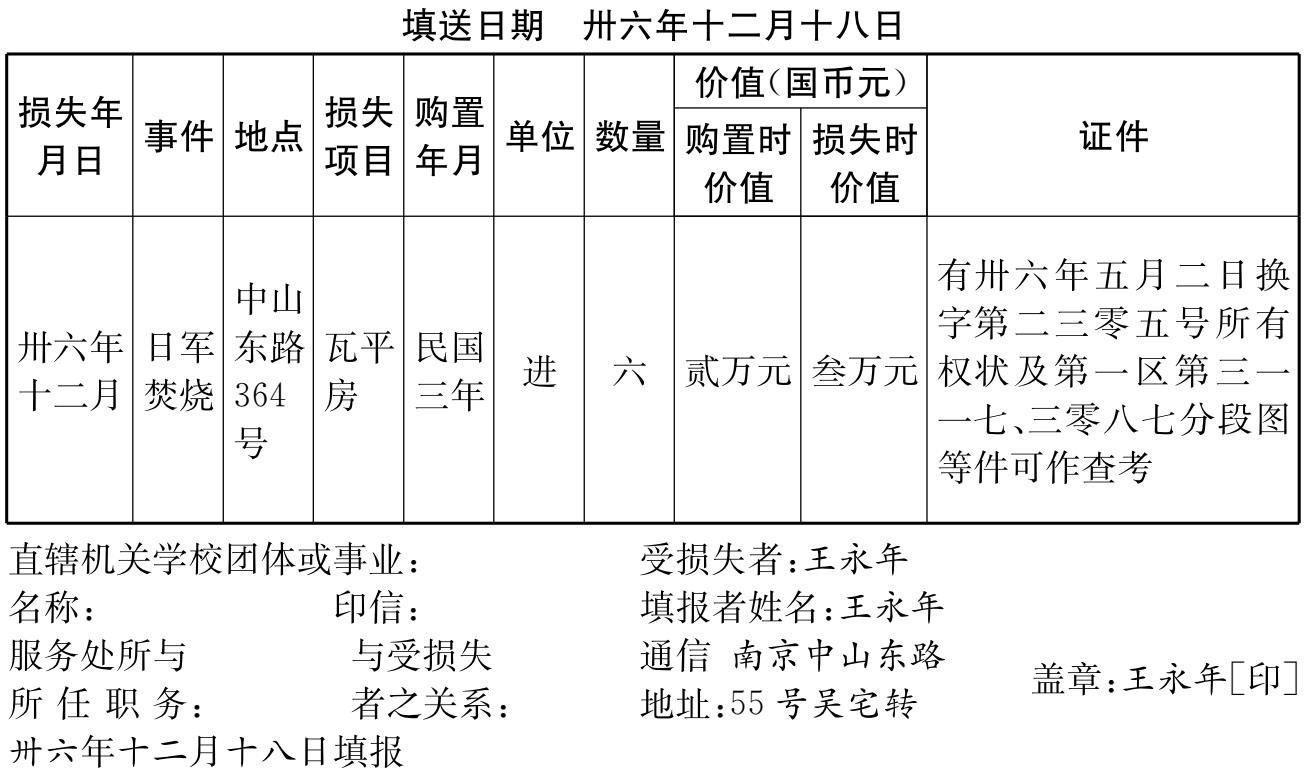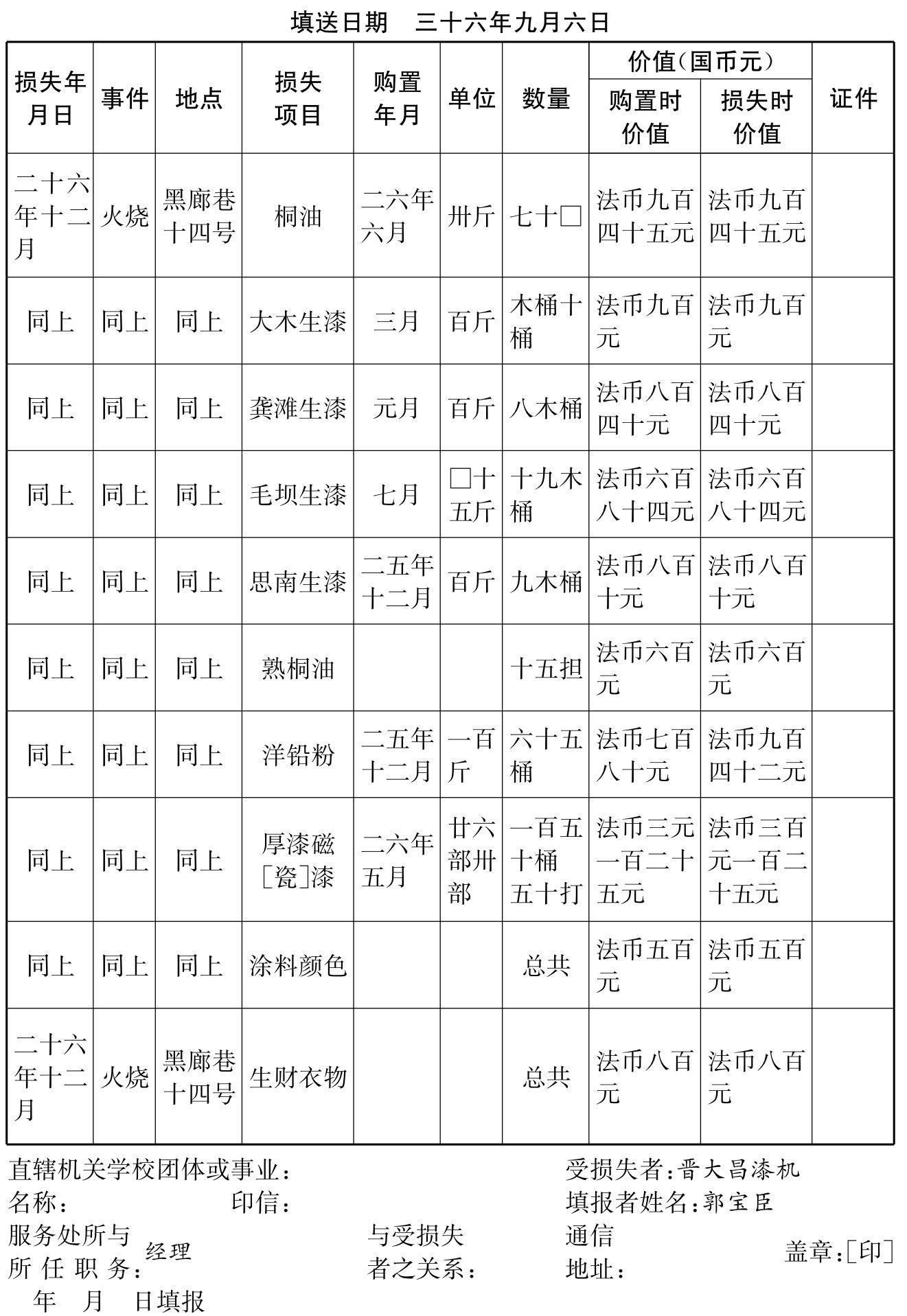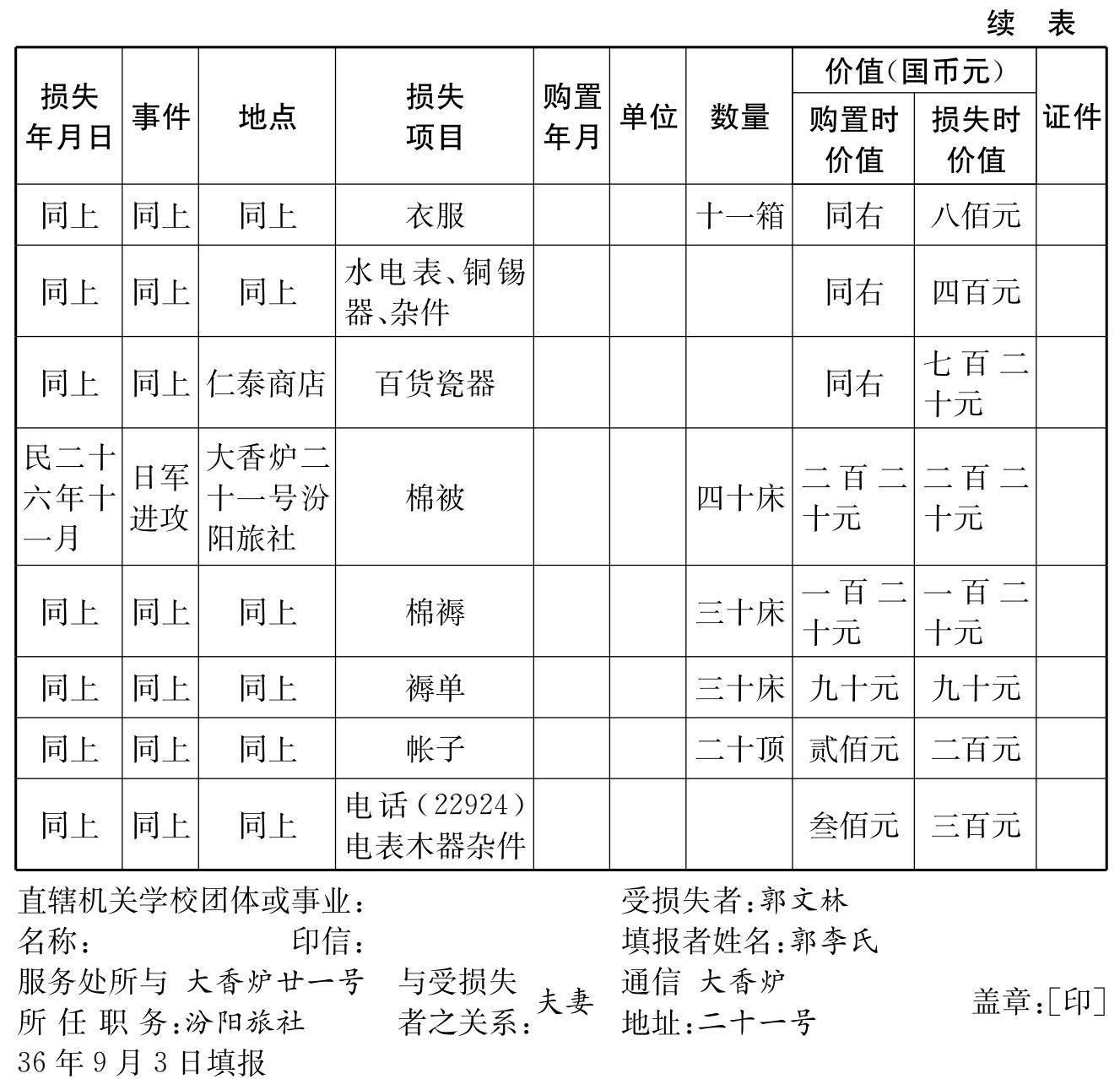 ② 本格及其上面几格填写位置可能有误,疑为“损失时价值”。原档如此。