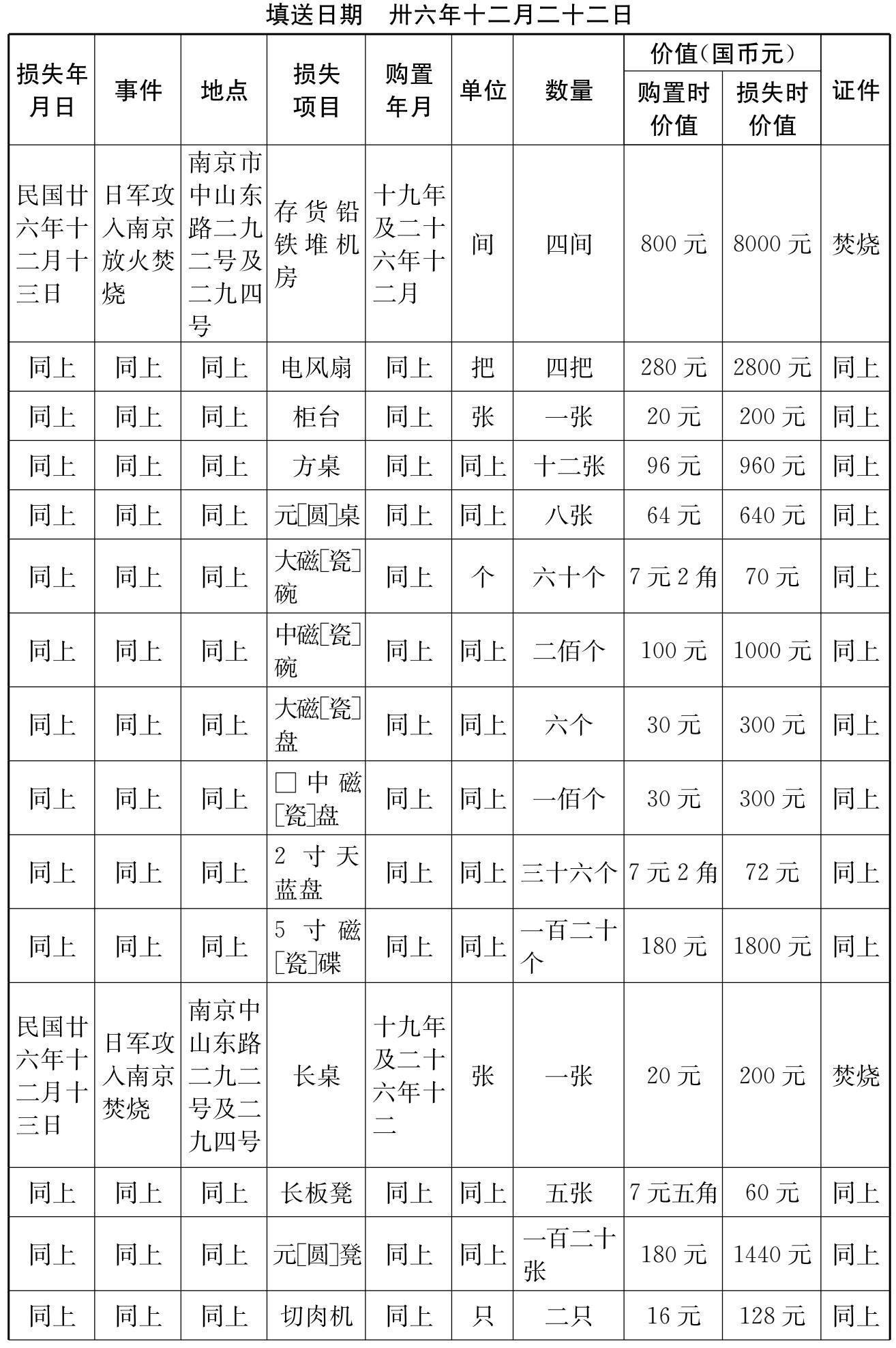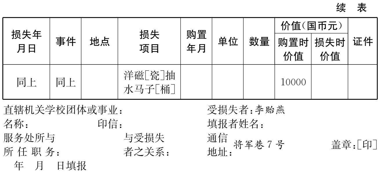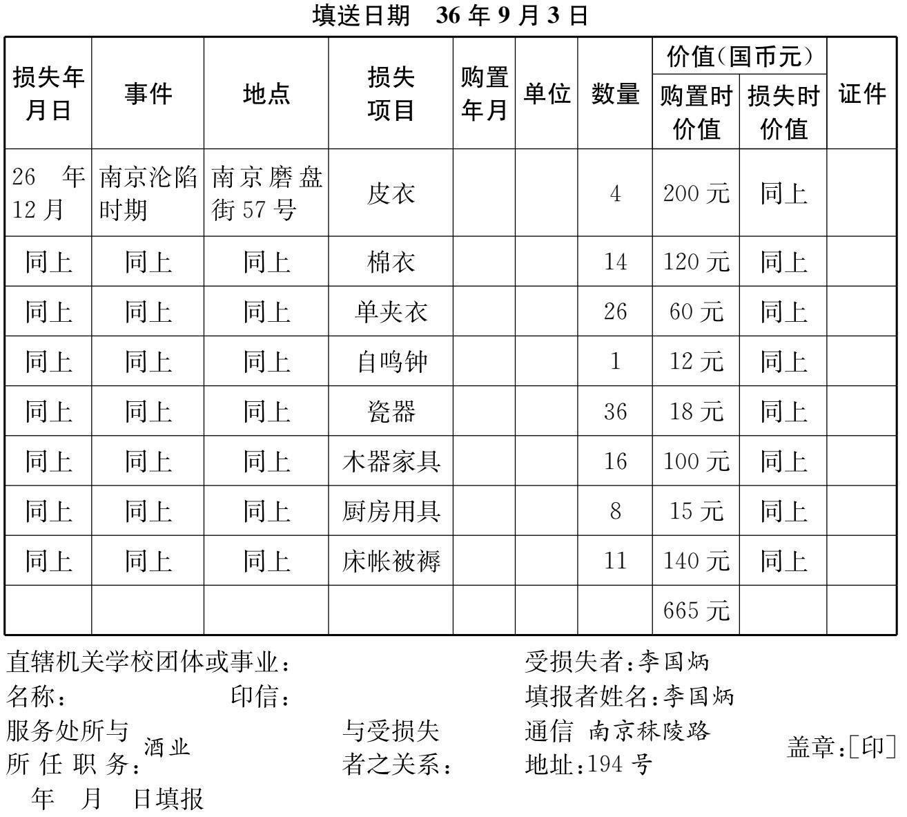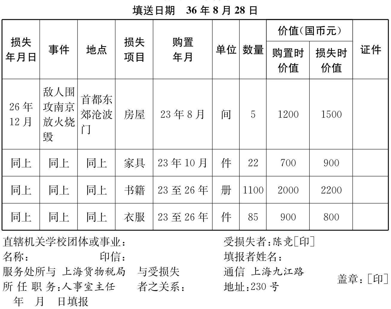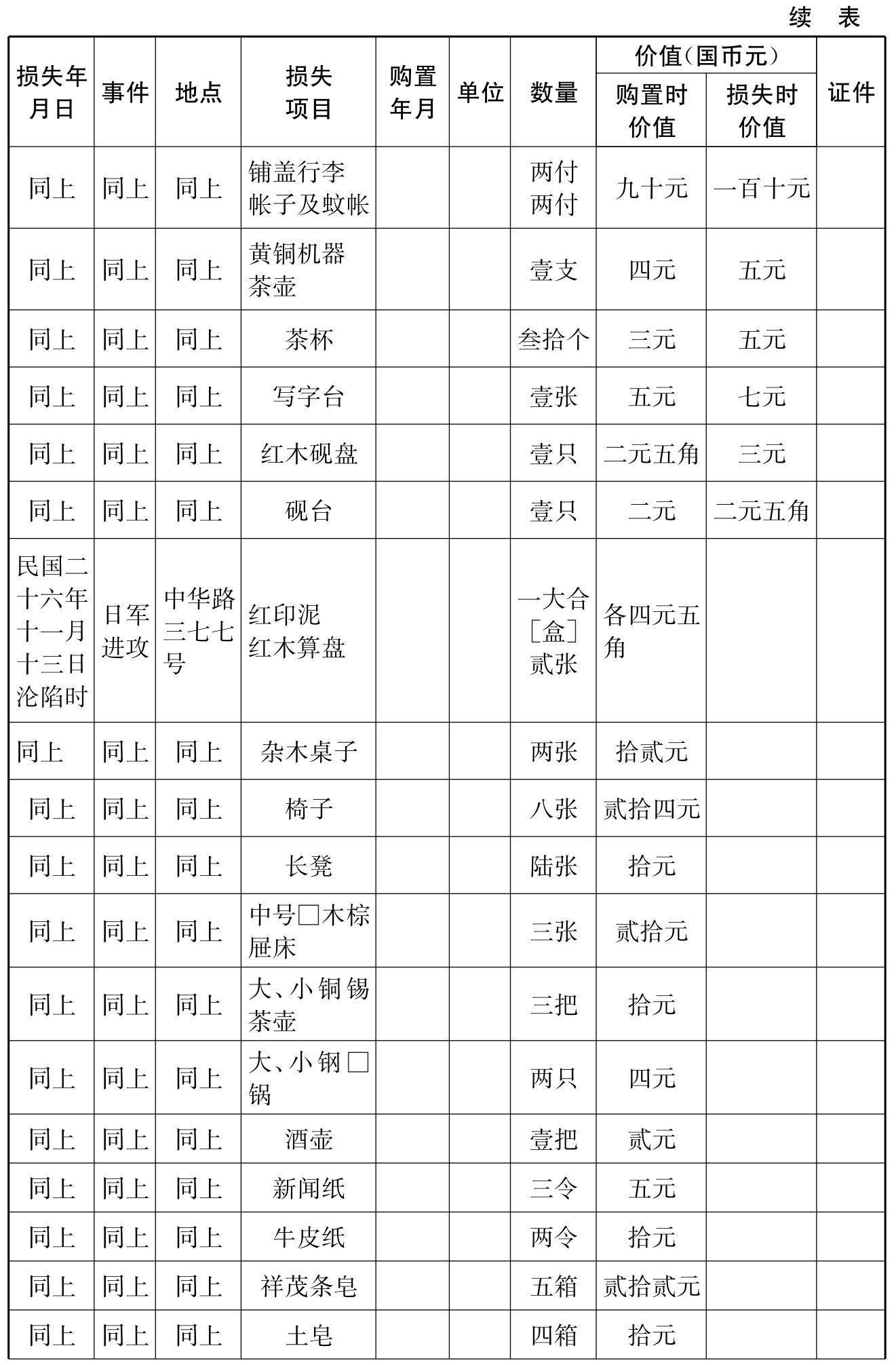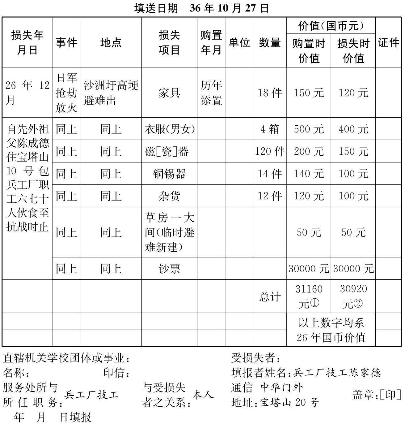② 本格及其上面几格填写位置可能有误,疑为“损失时价值”。原档如此。
