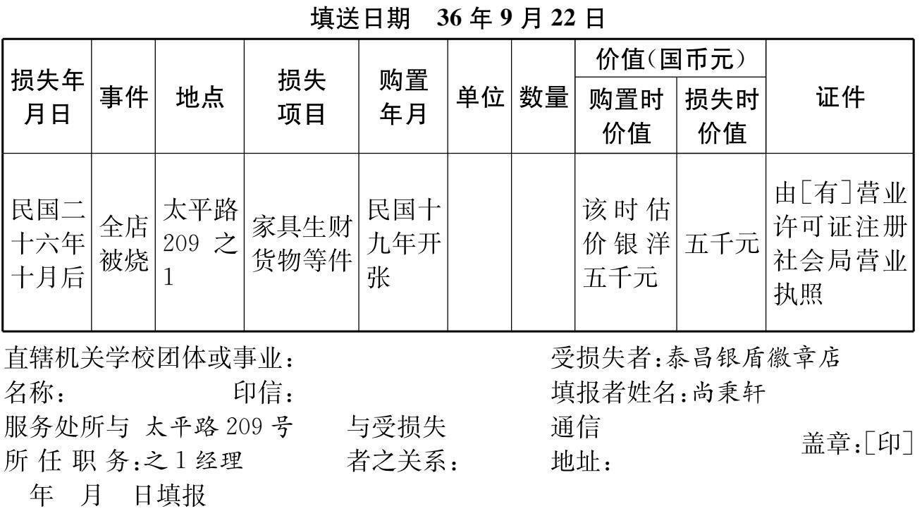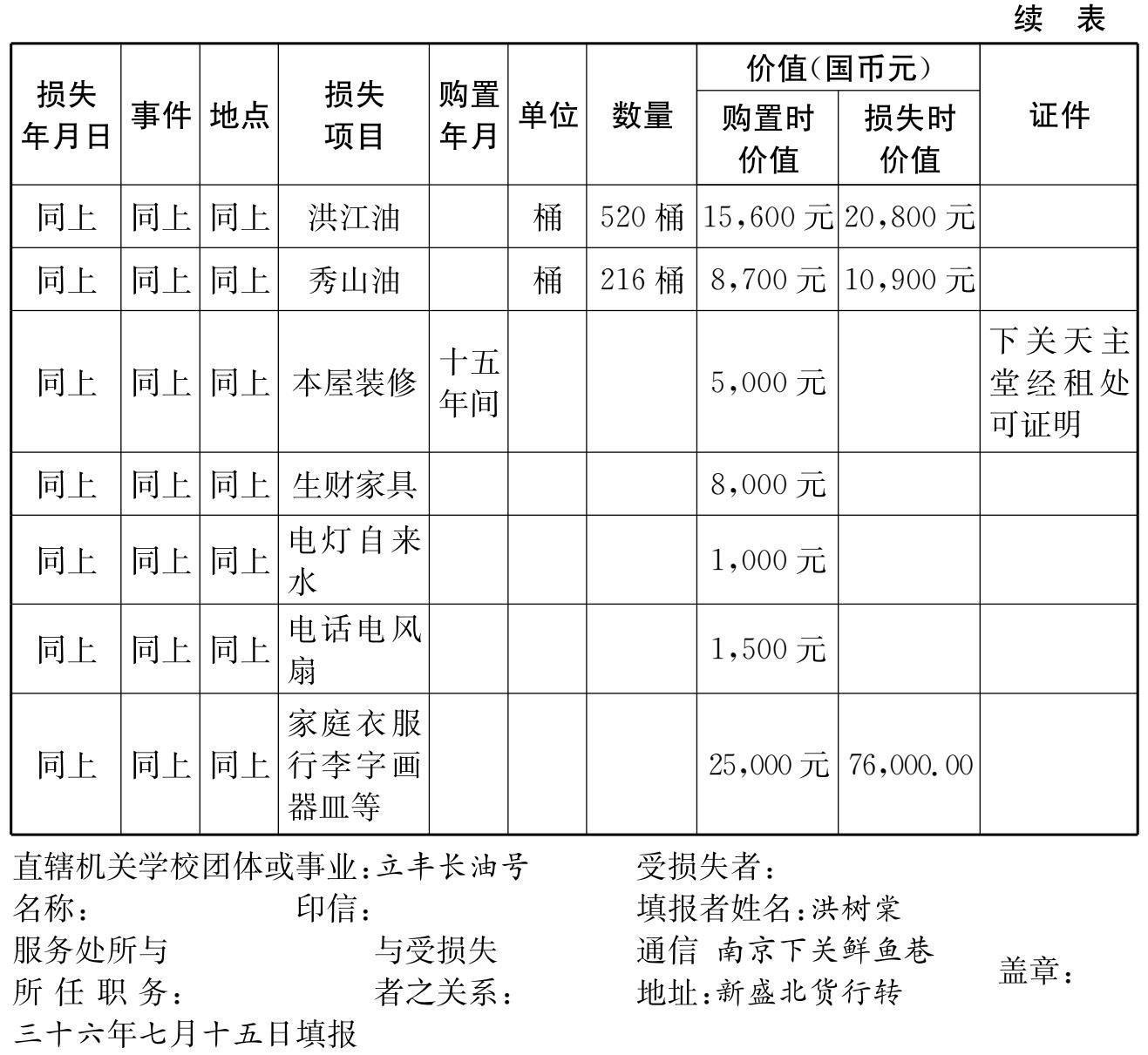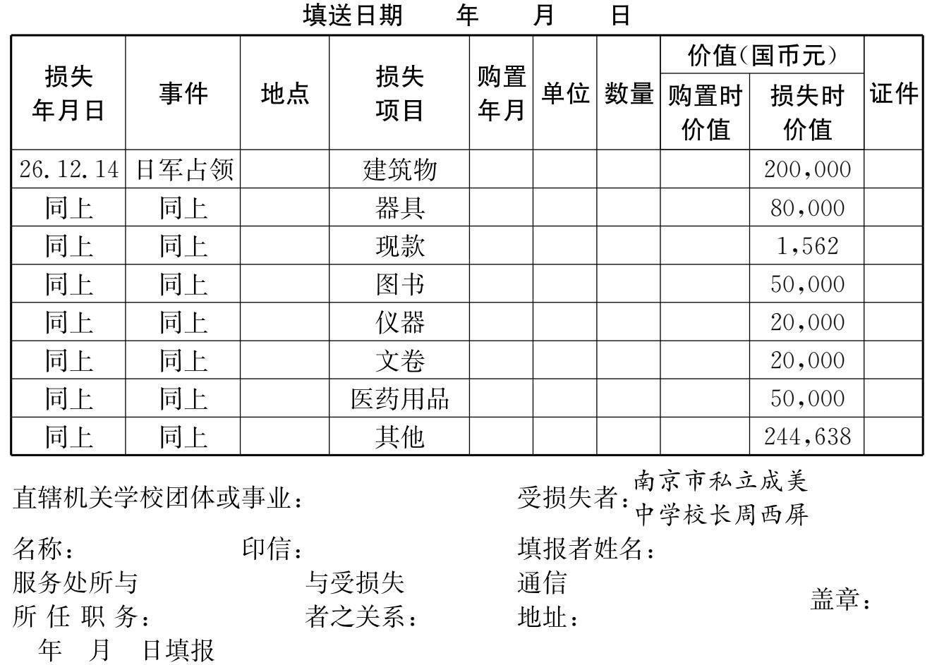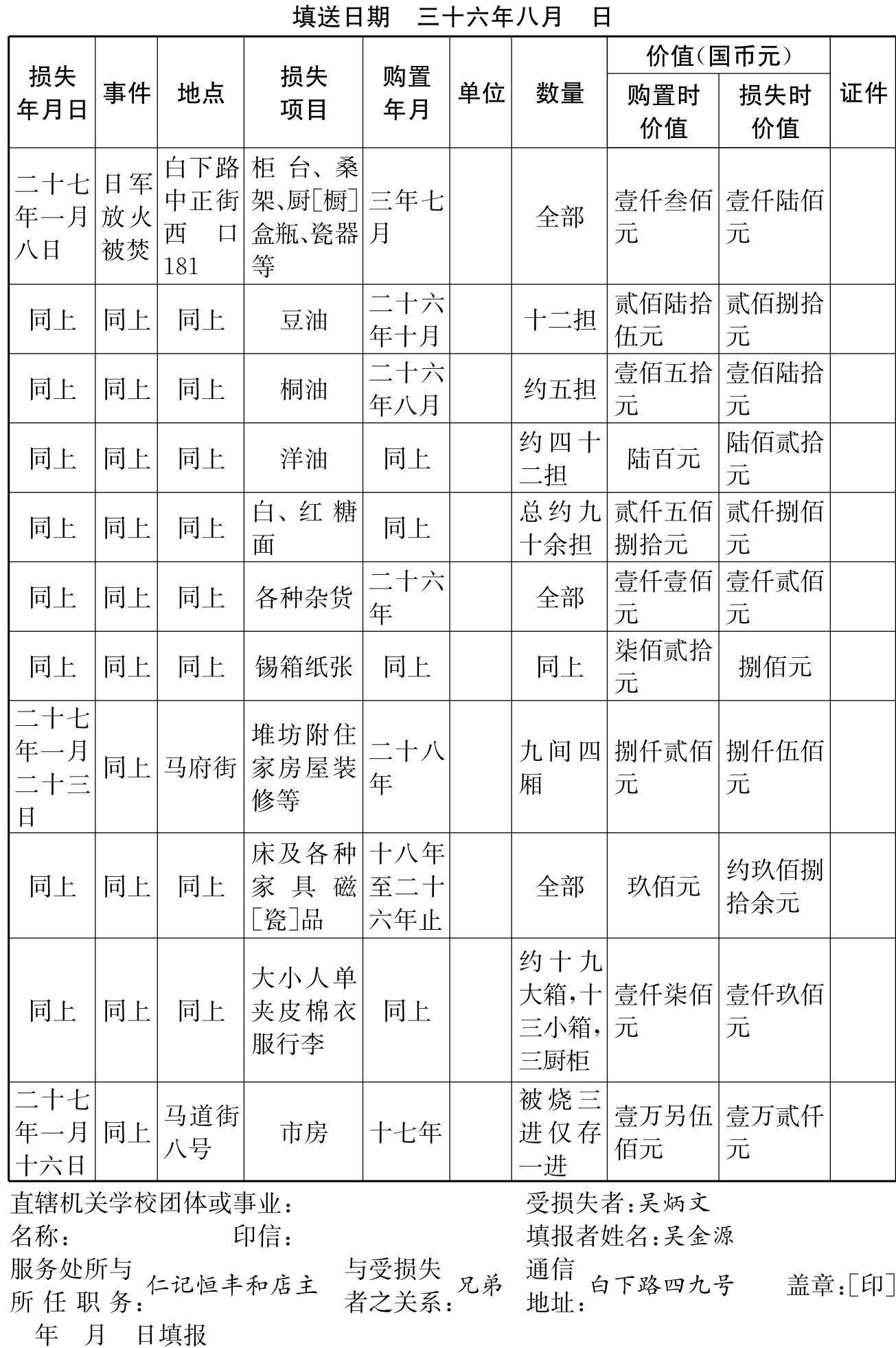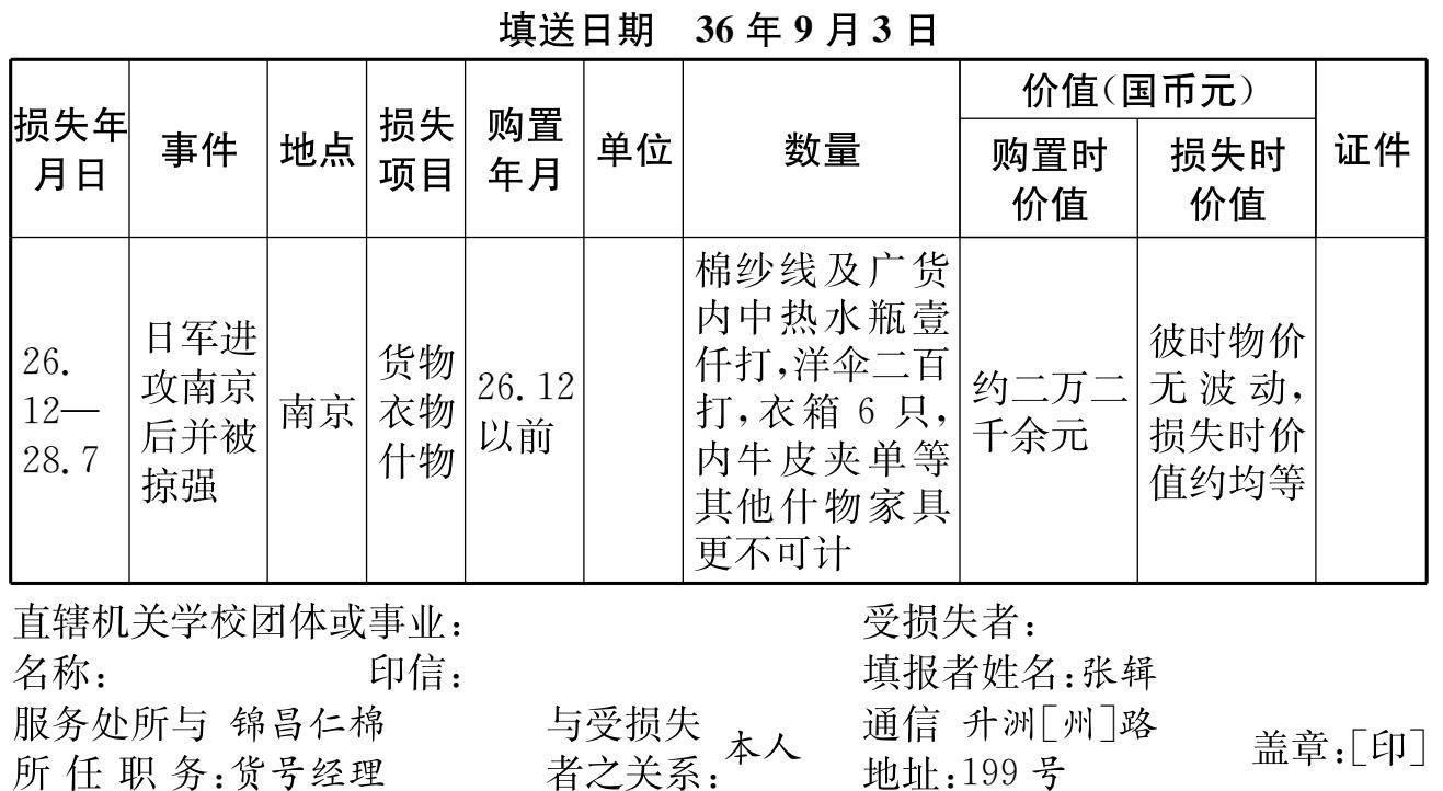 ② 本格及其上面几格填写位置可能有误,疑为“损失时价值”。原档如此。