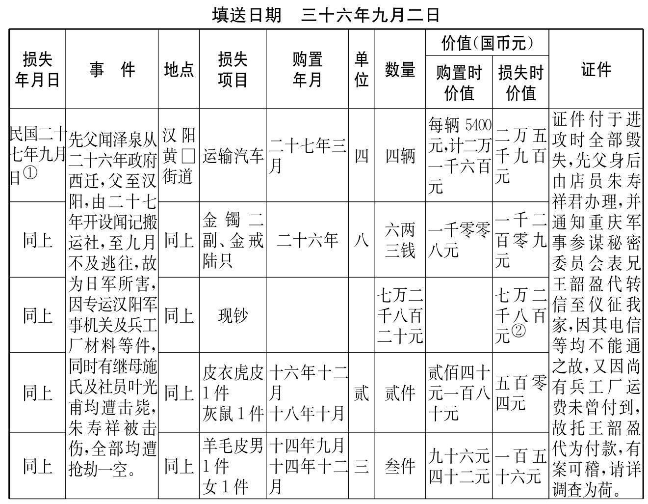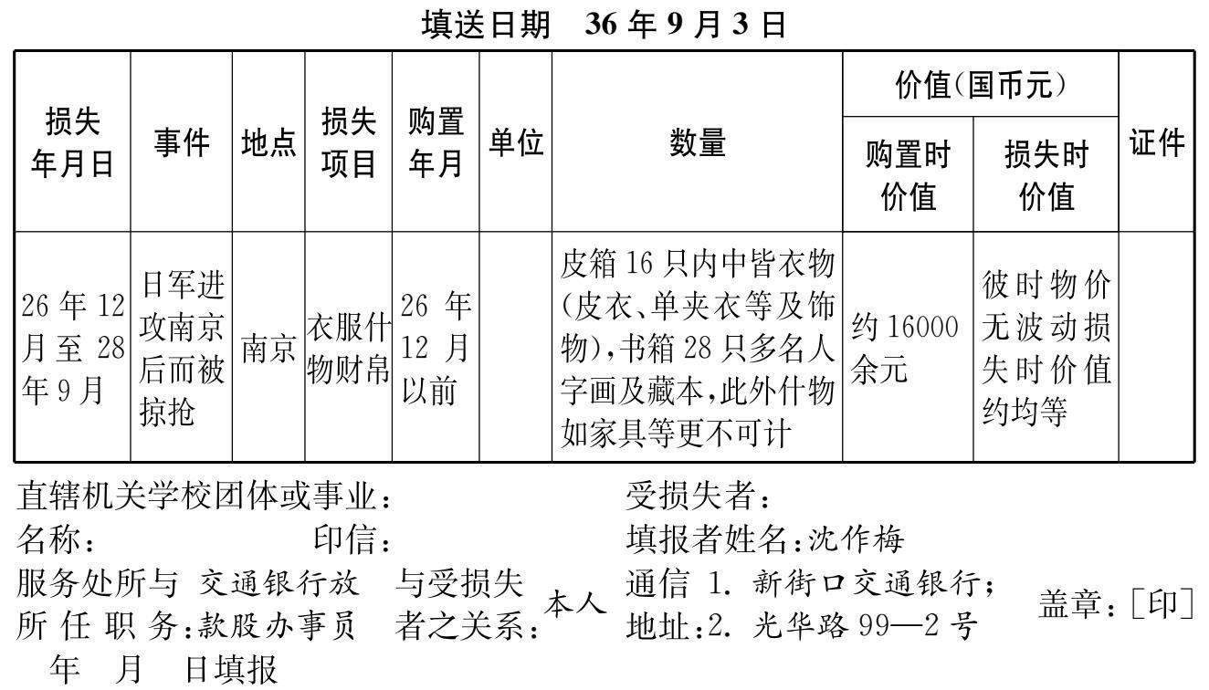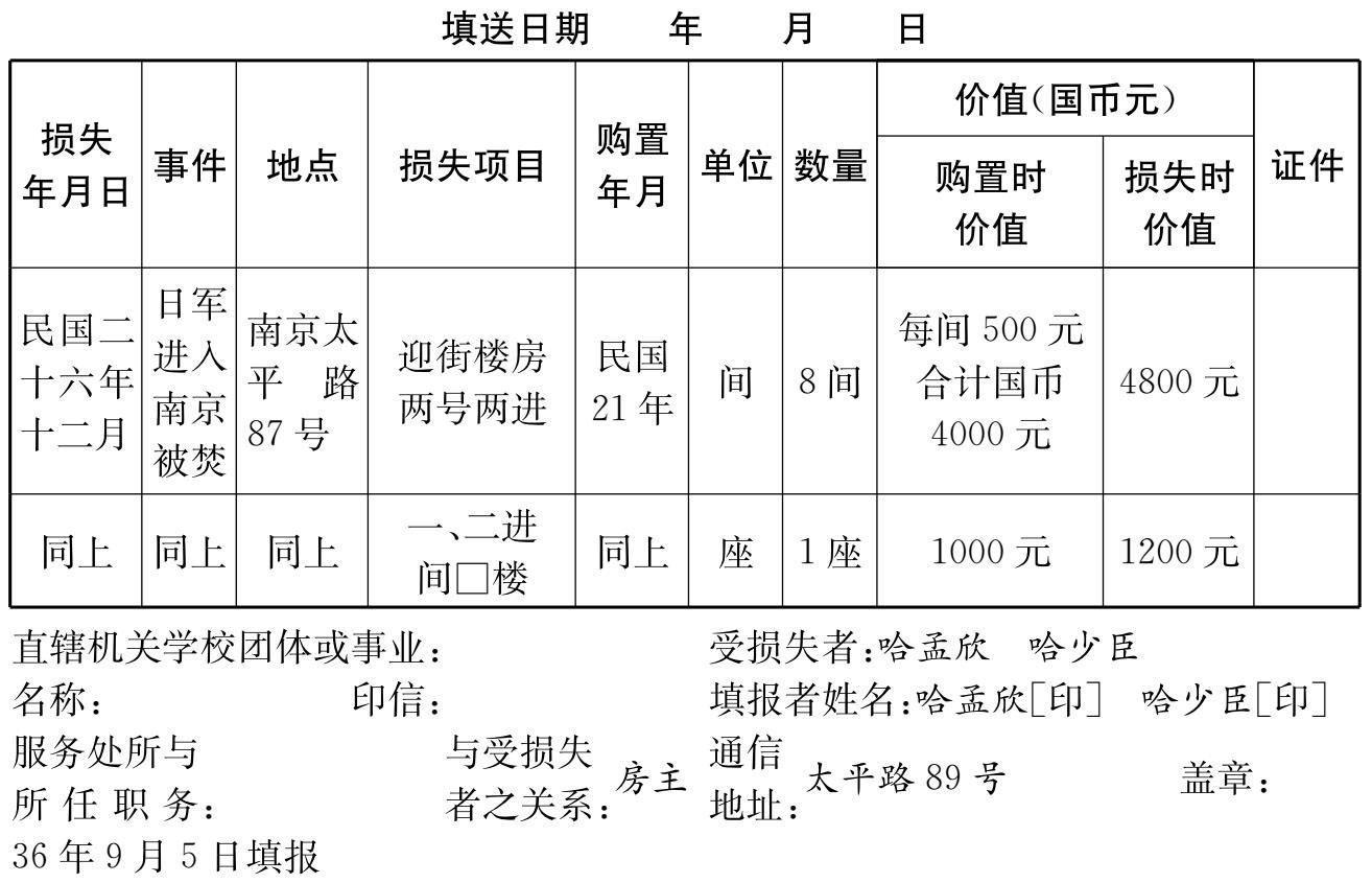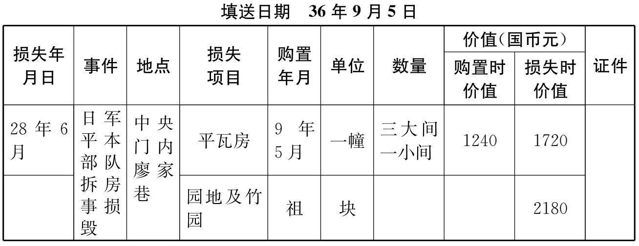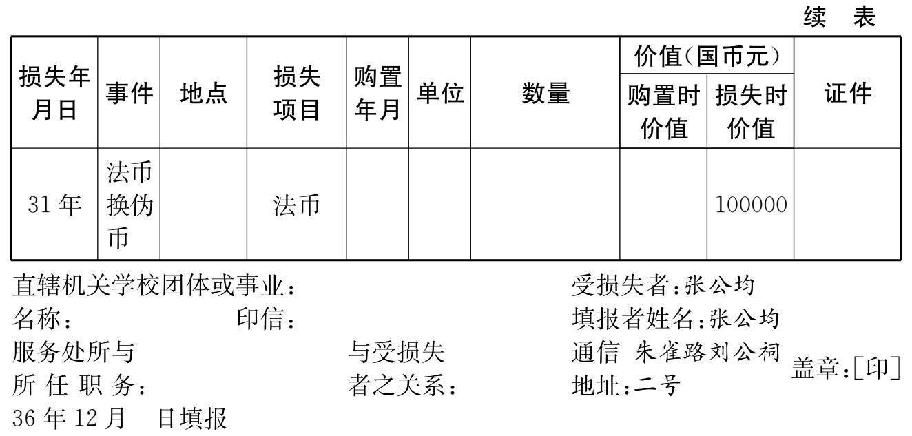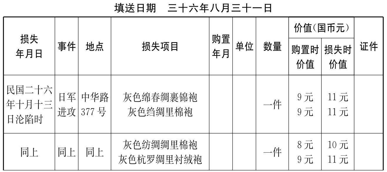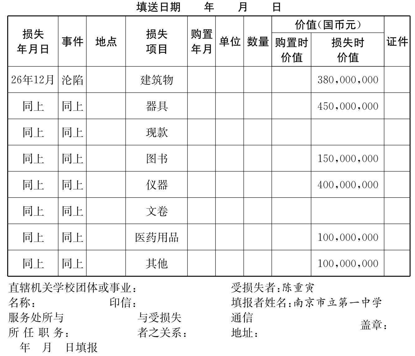 ② 本格及其上面几格填写位置可能有误,疑为“损失时价值”。原档如此。
