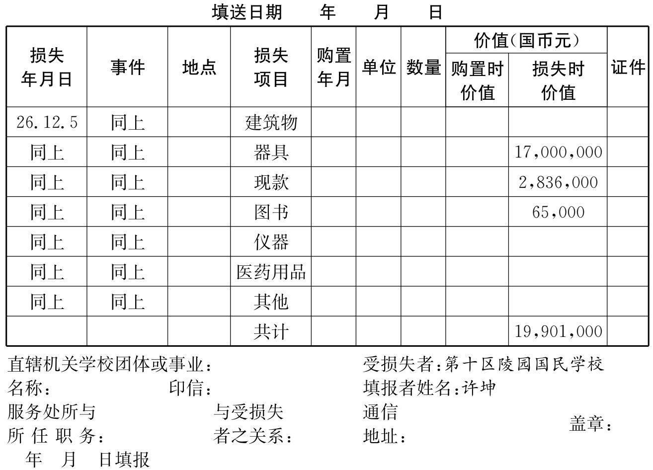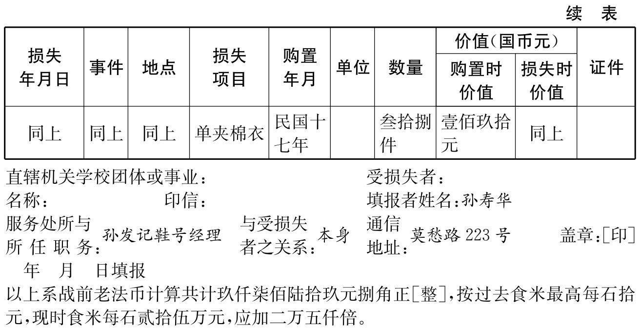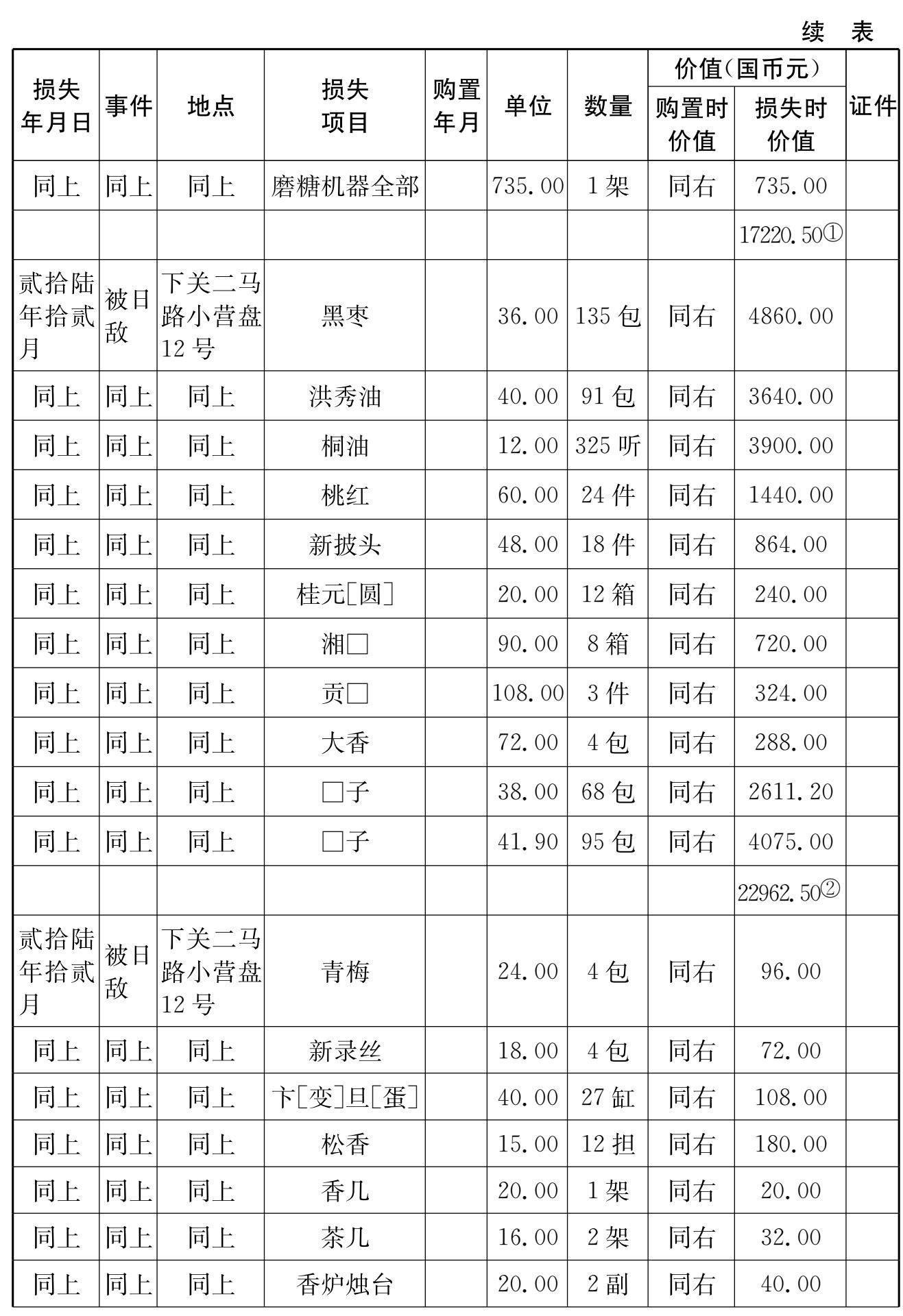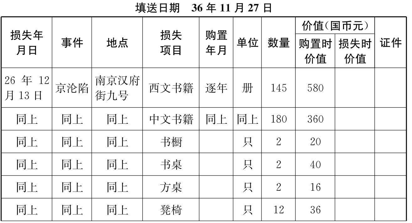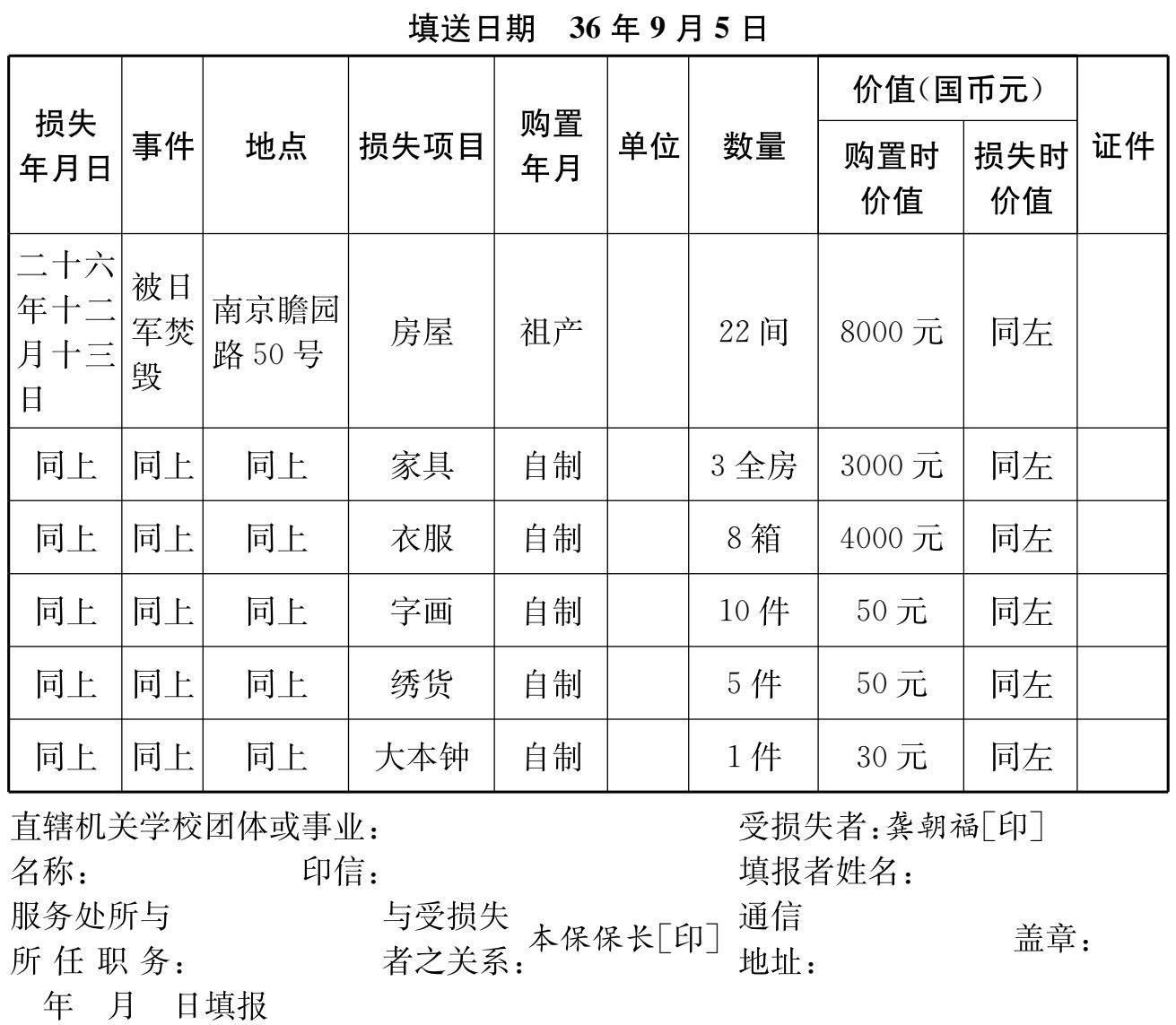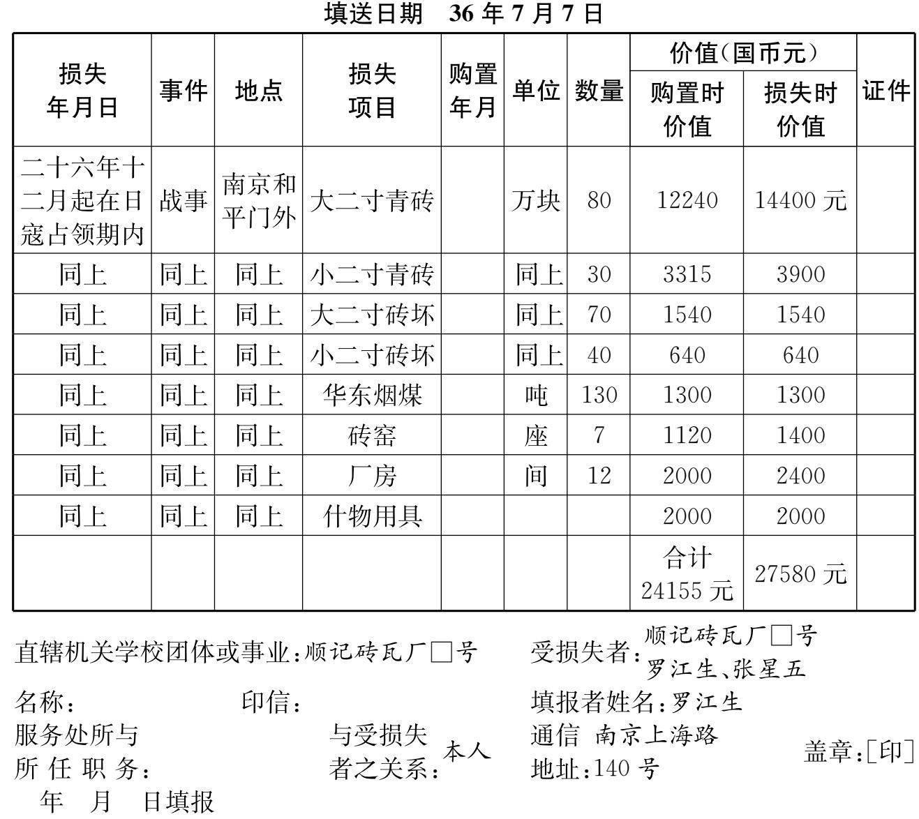 ② 本格及其上面几格填写位置可能有误,疑为“损失时价值”。原档如此。