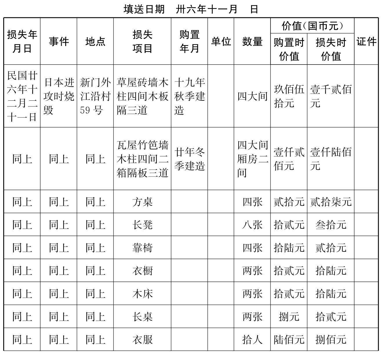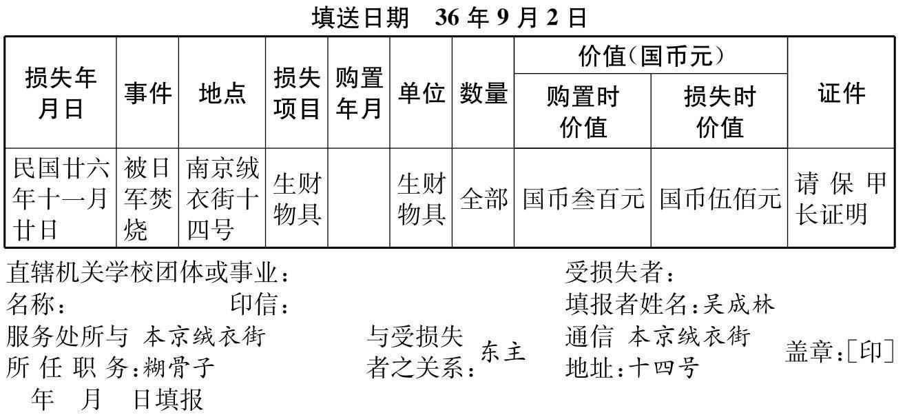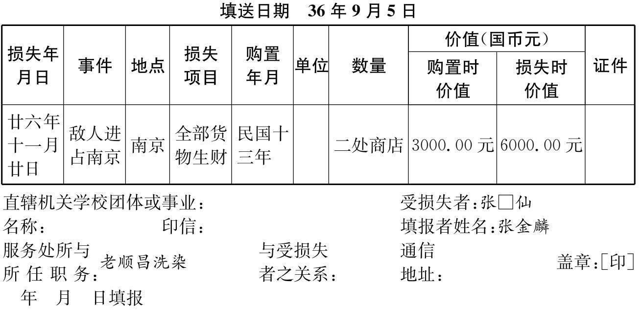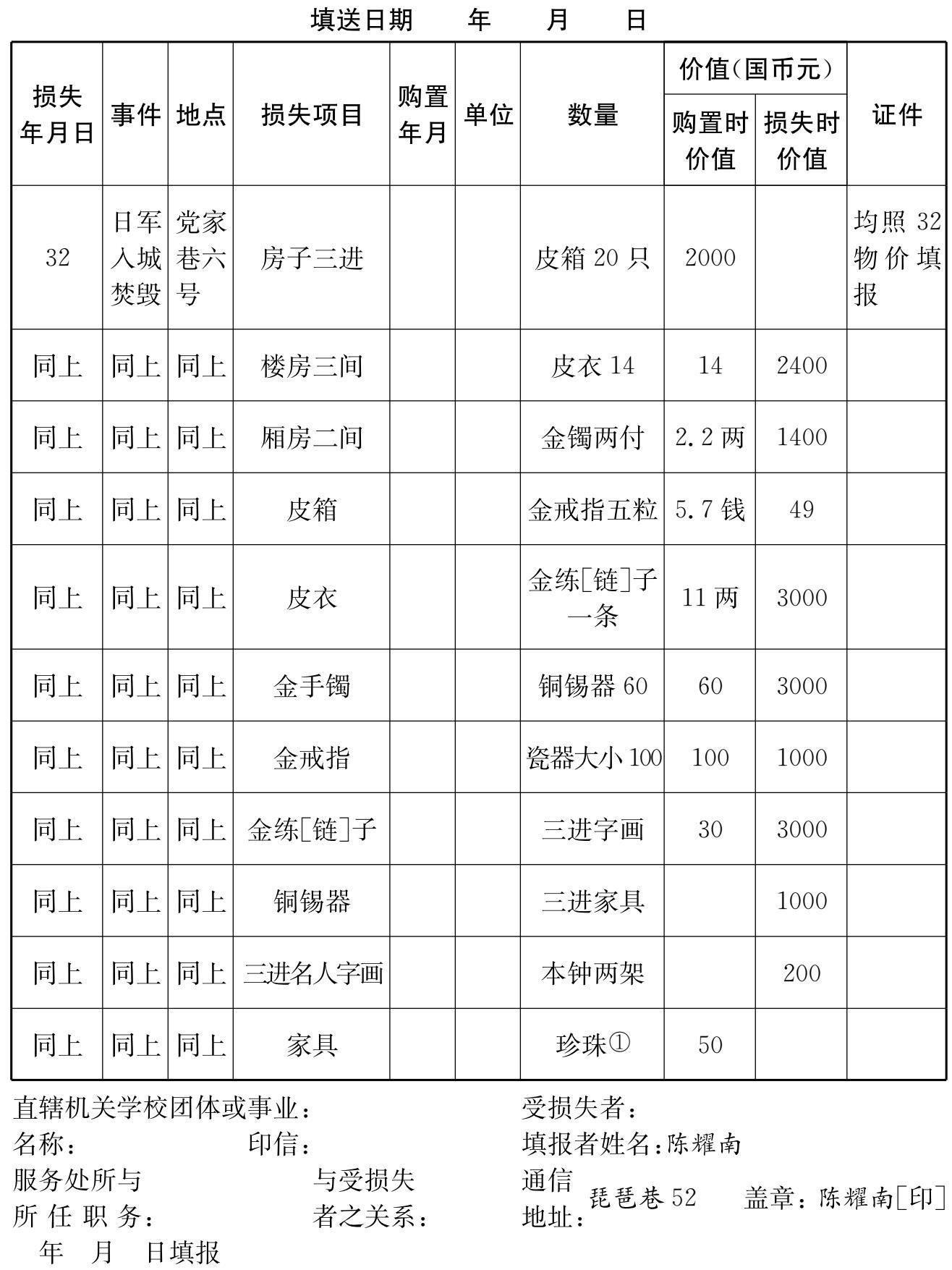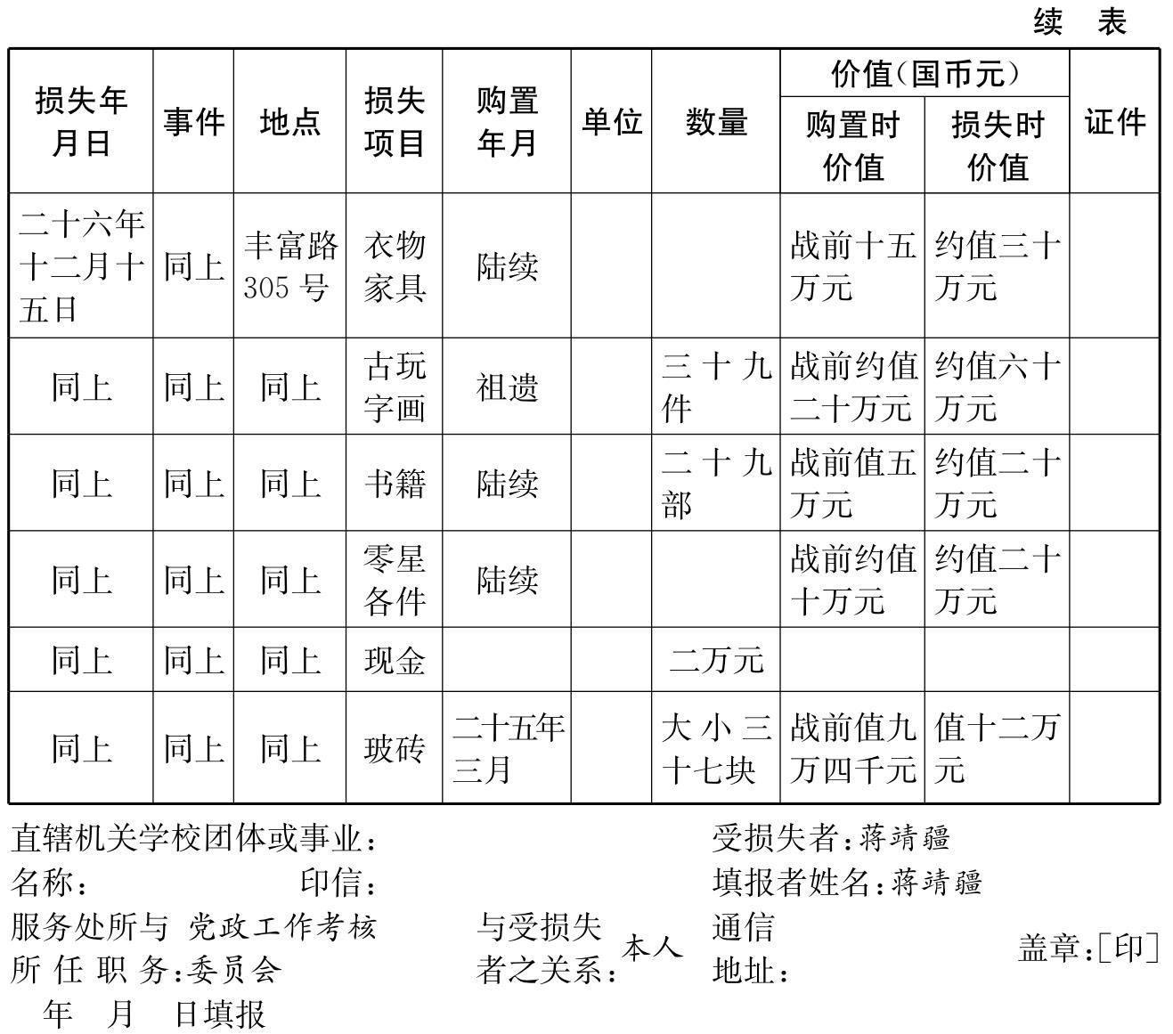 ② 本格及其上面几格填写位置可能有误,疑为“损失时价值”。原档如此。
