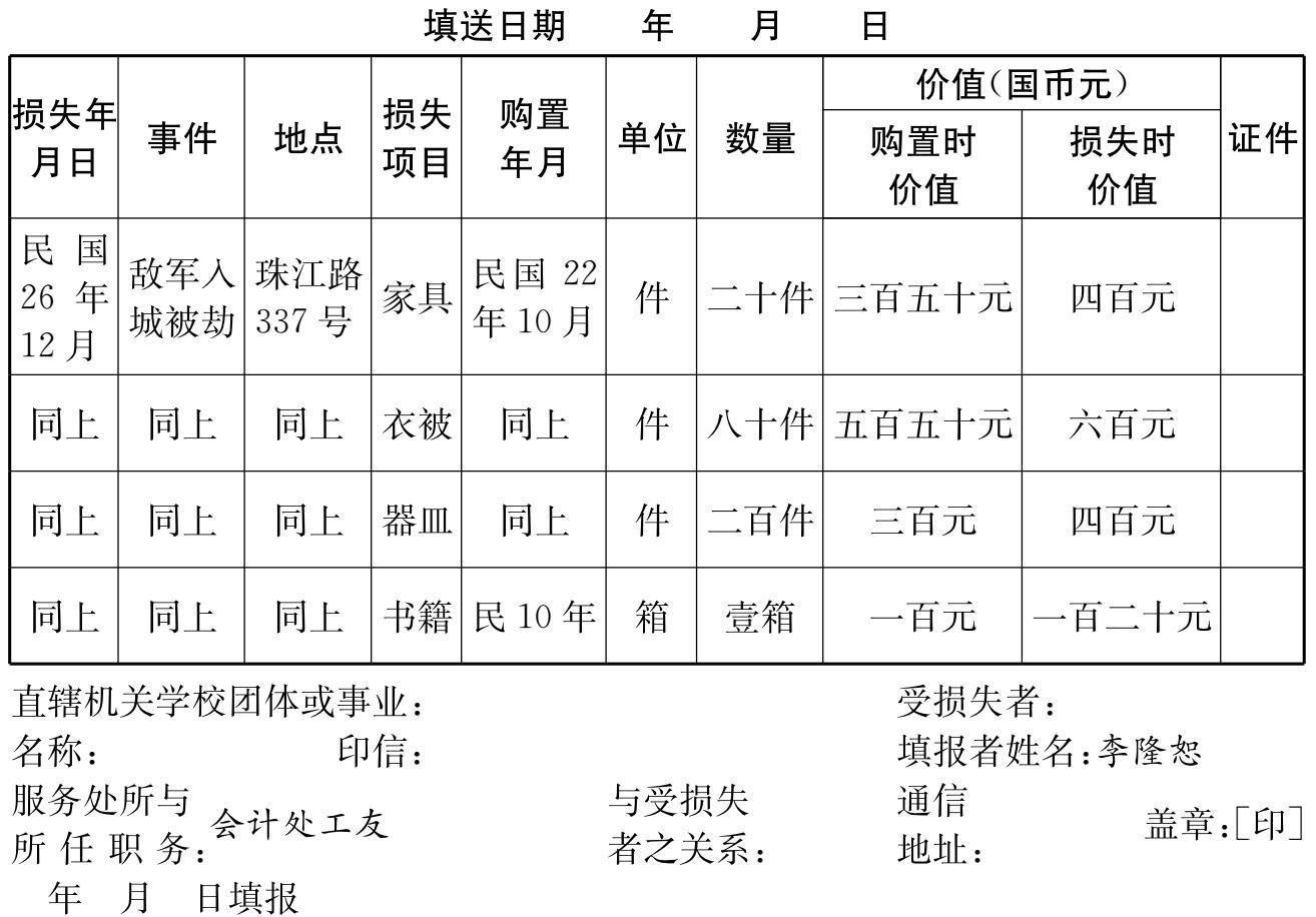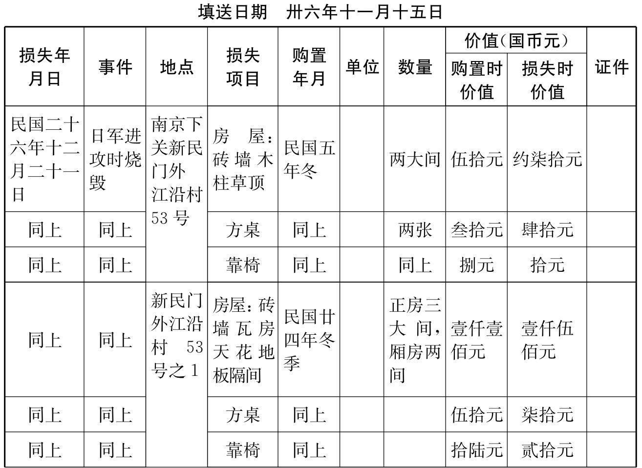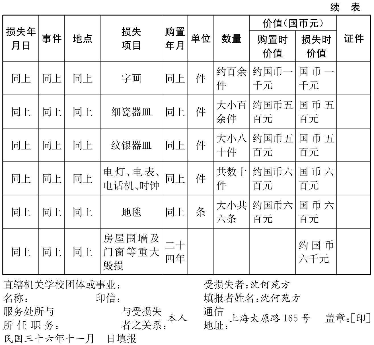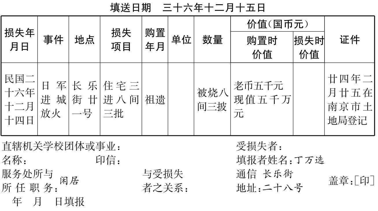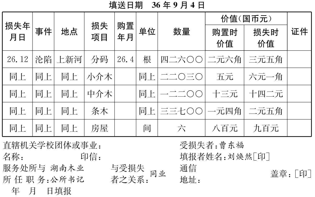 ② 本格及其上面几格填写位置可能有误,疑为“损失时价值”。原档如此。