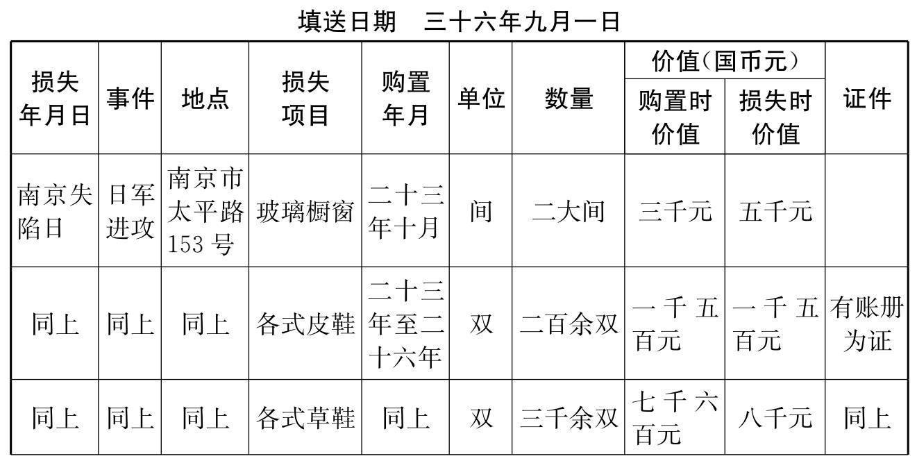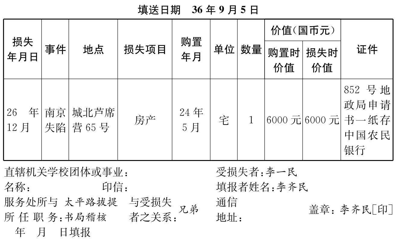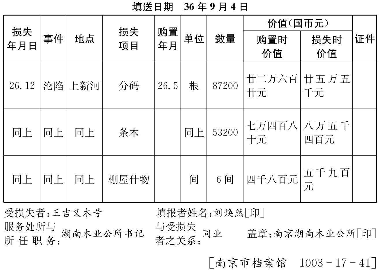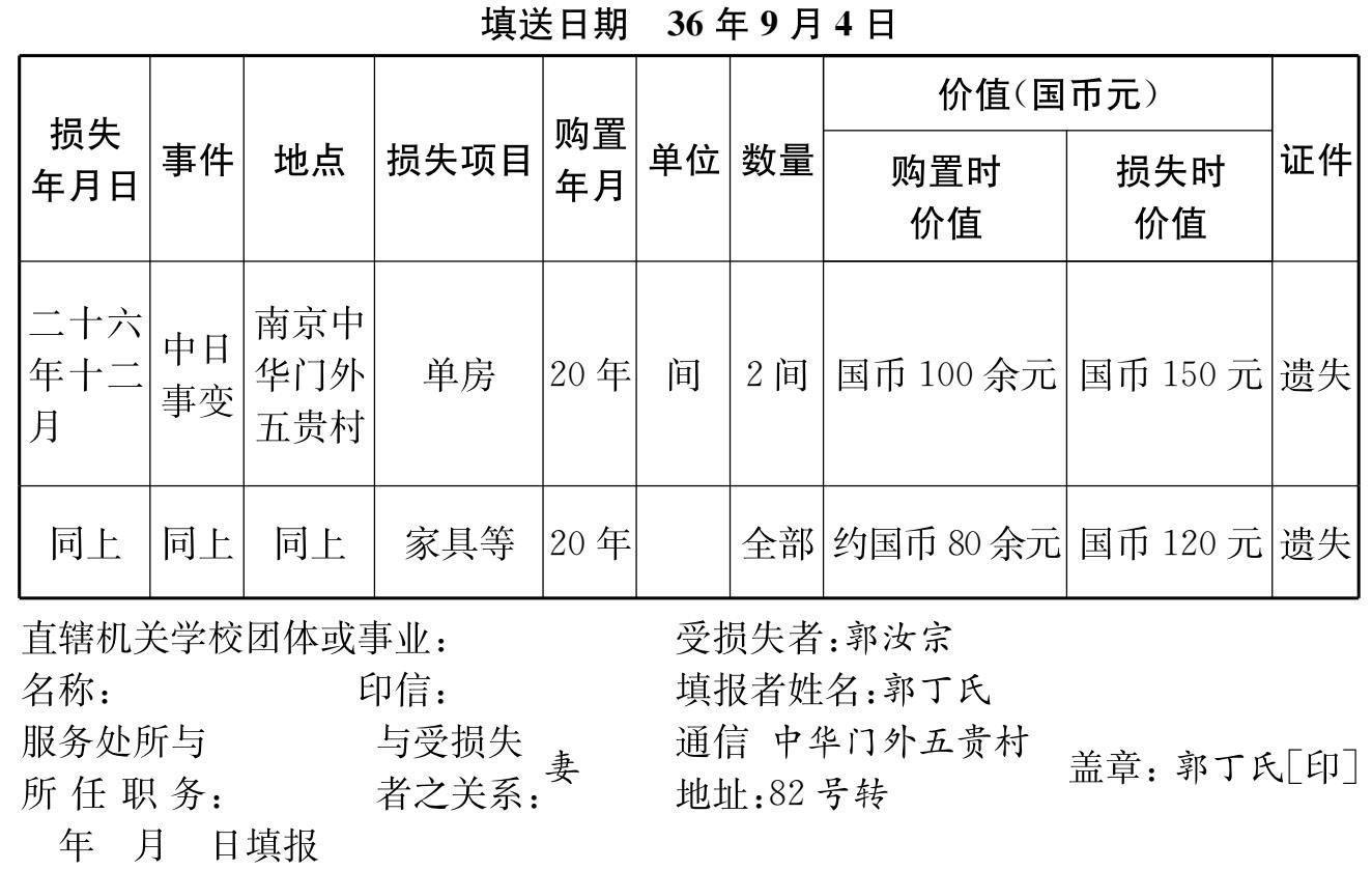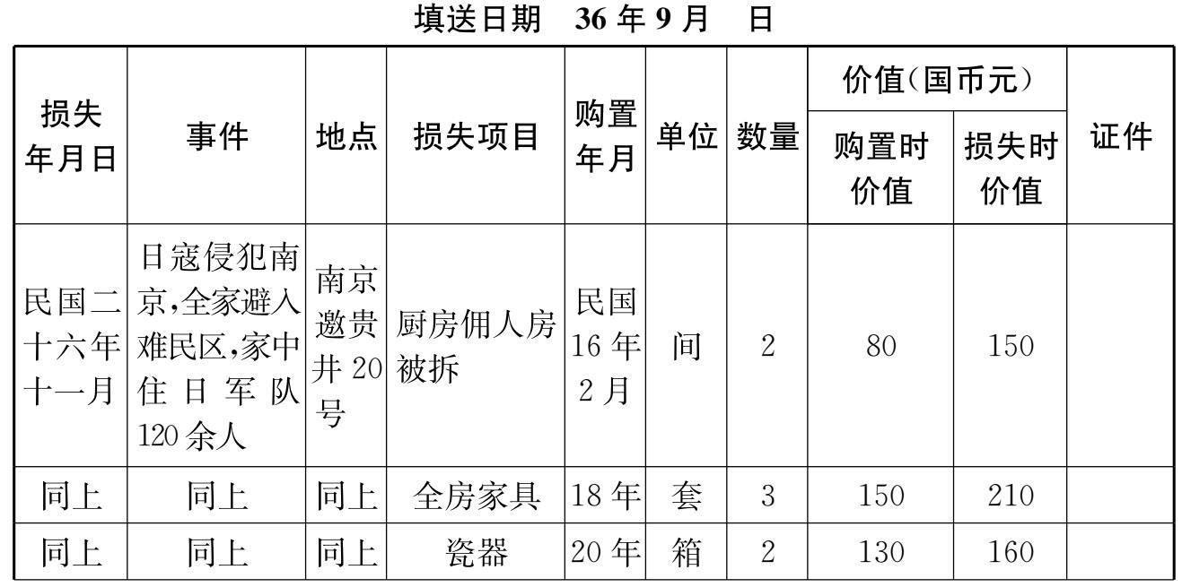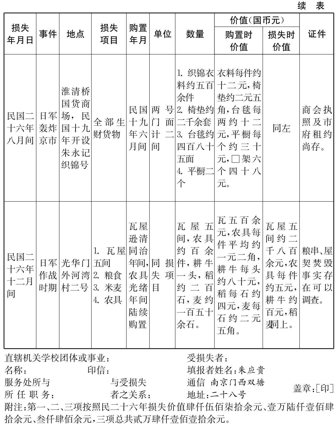 ② 本格及其上面几格填写位置可能有误,疑为“损失时价值”。原档如此。