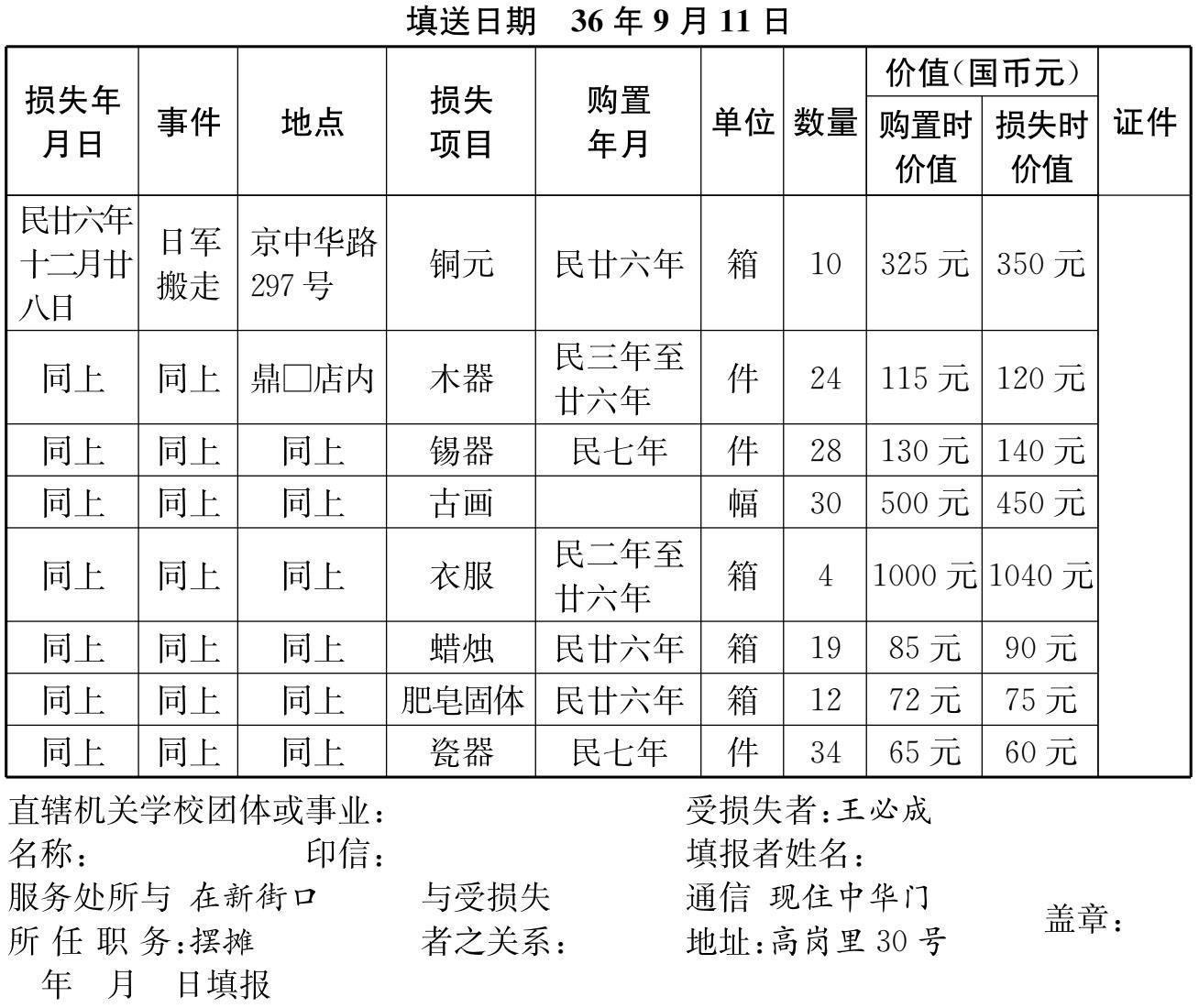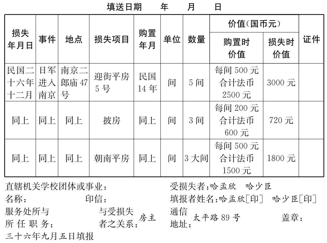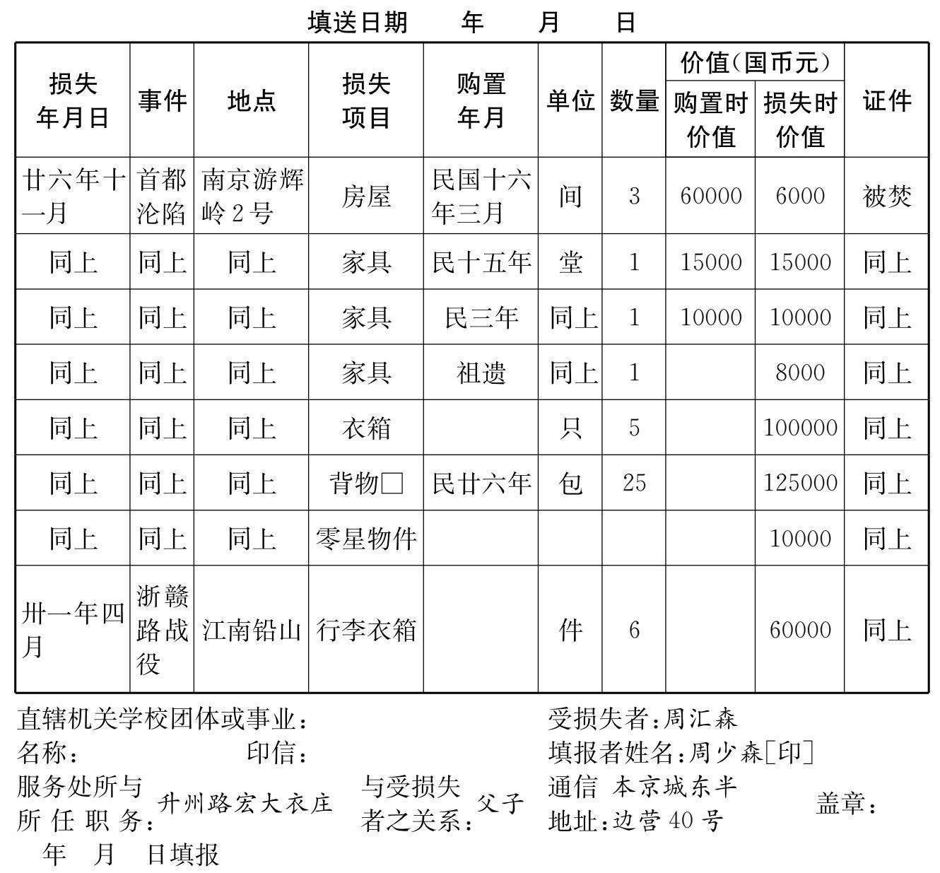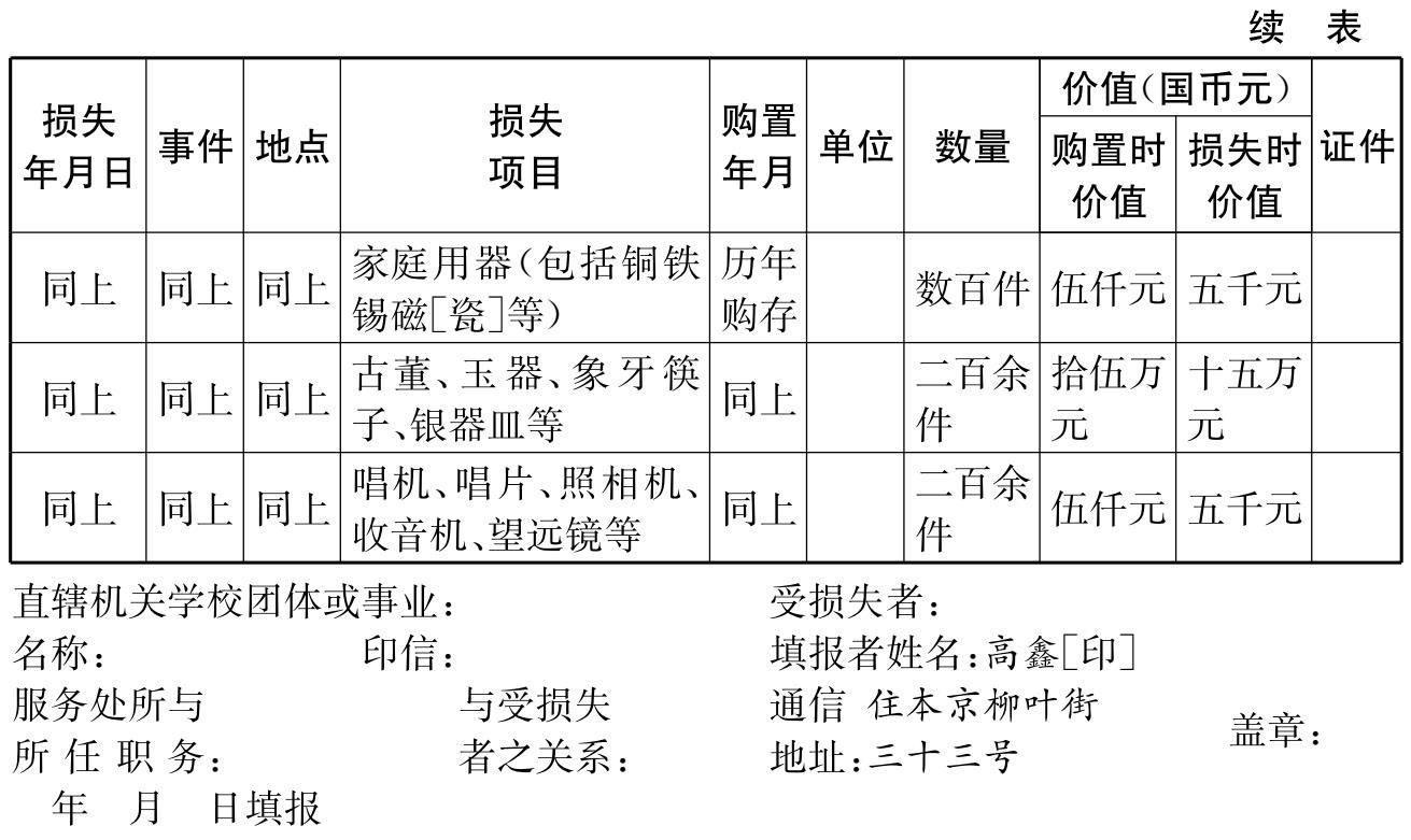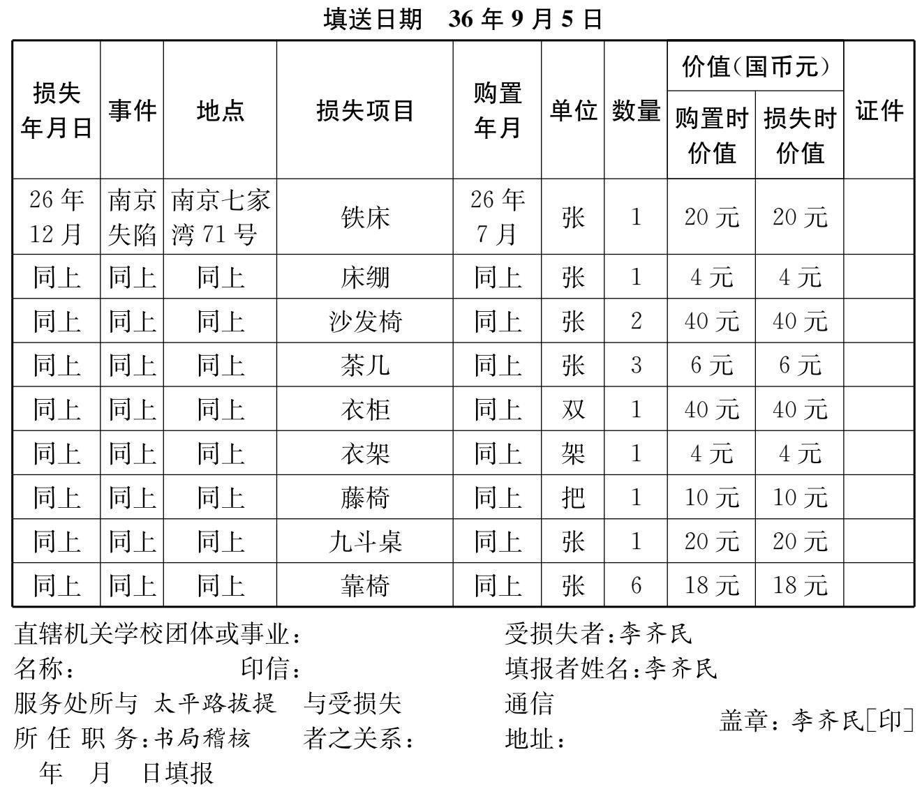 ② 本格及其上面几格填写位置可能有误,疑为“损失时价值”。原档如此。