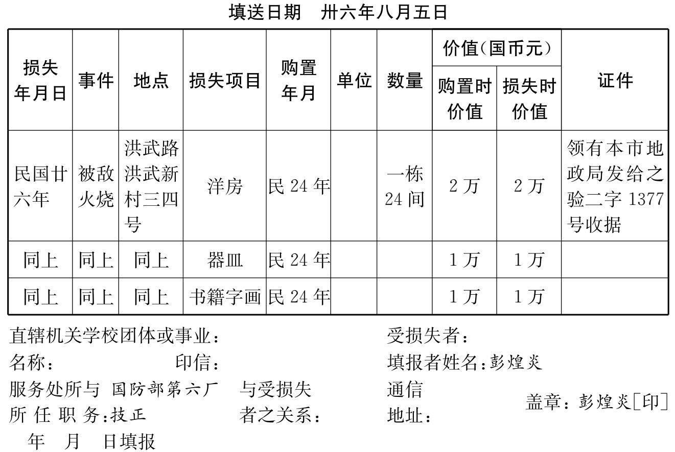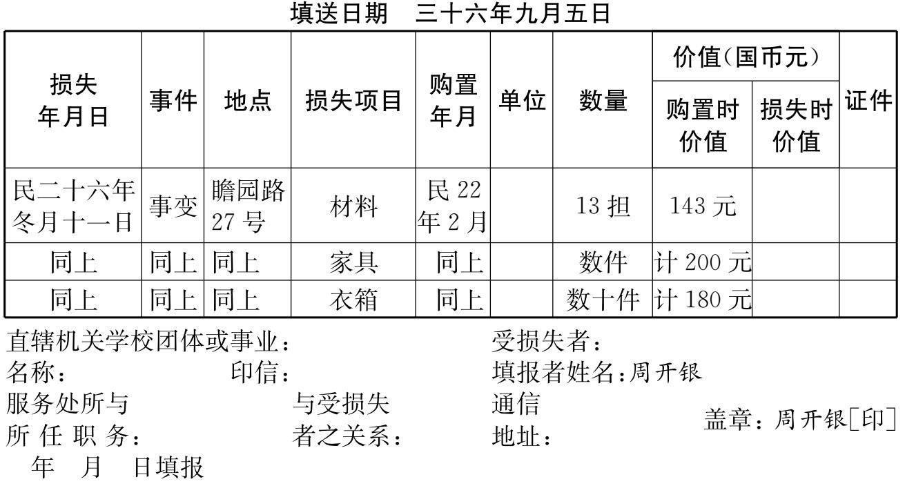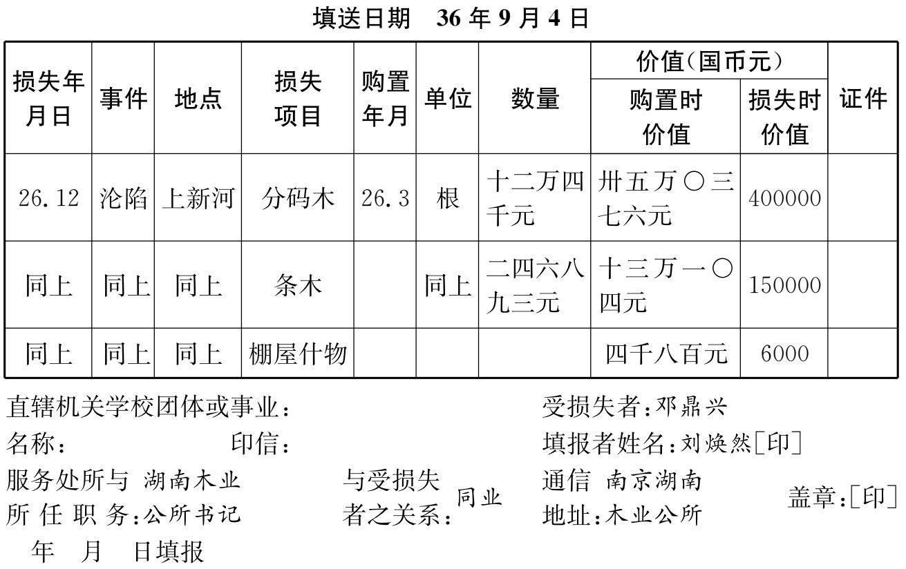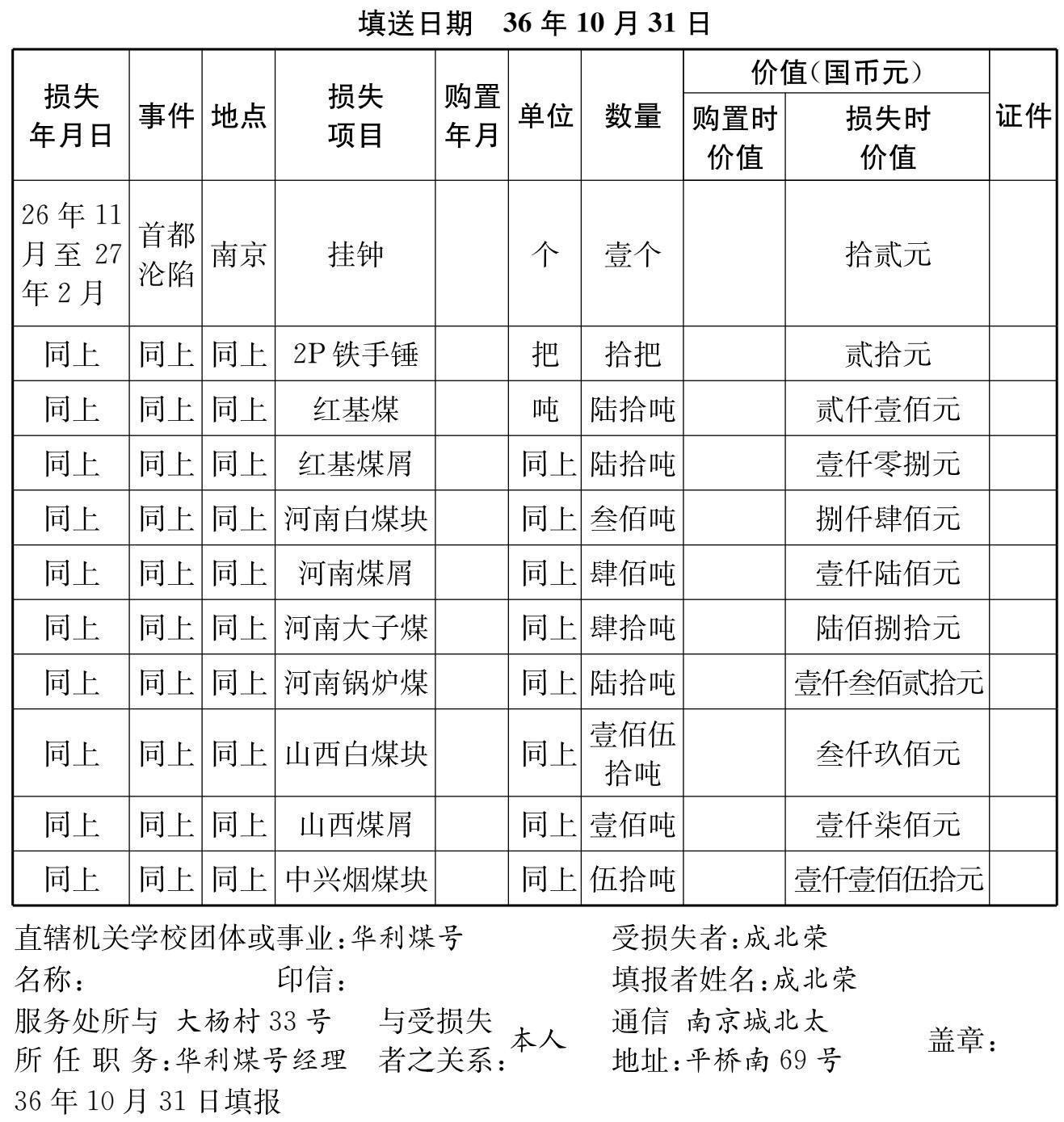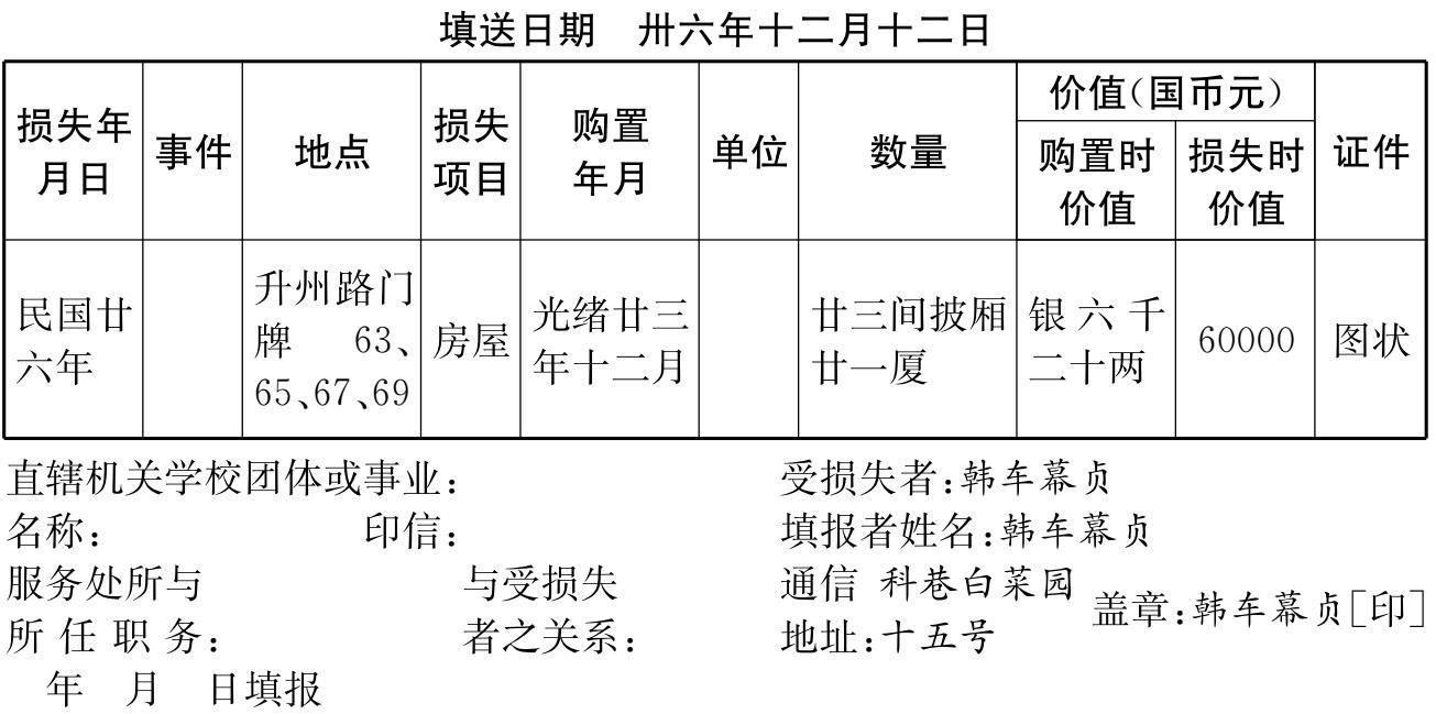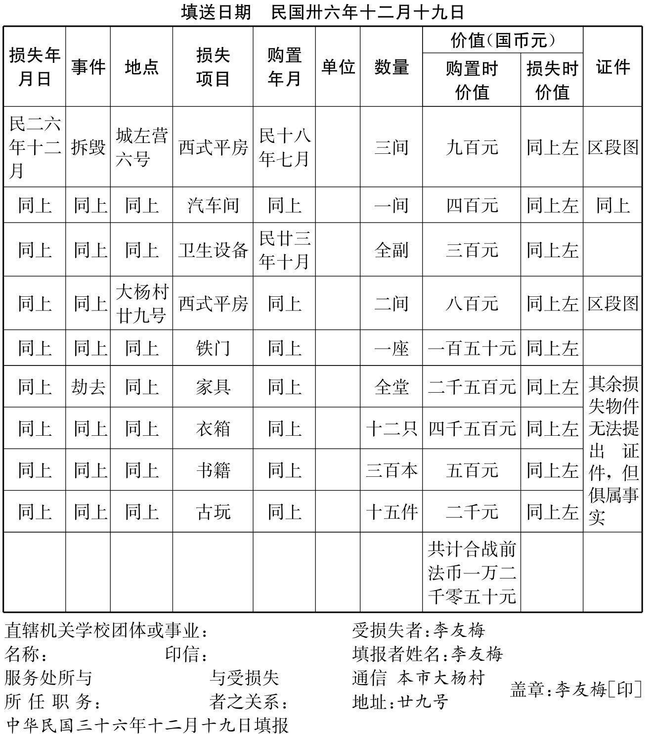 ② 本格及其上面几格填写位置可能有误,疑为“损失时价值”。原档如此。